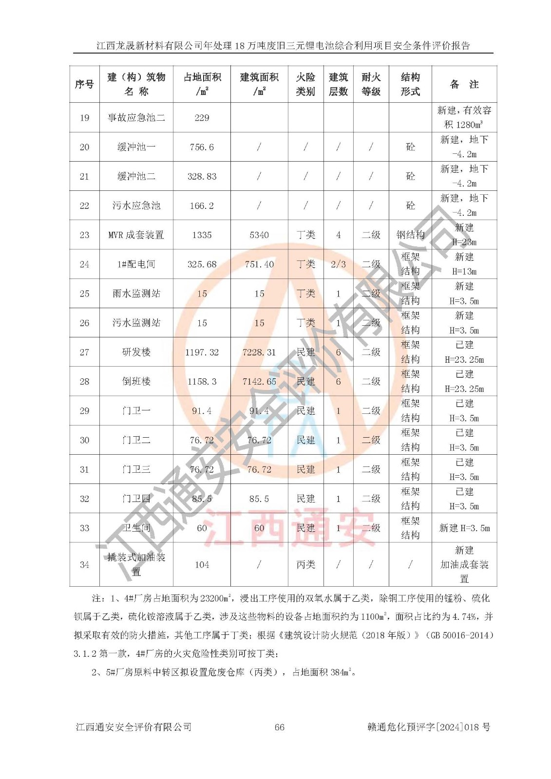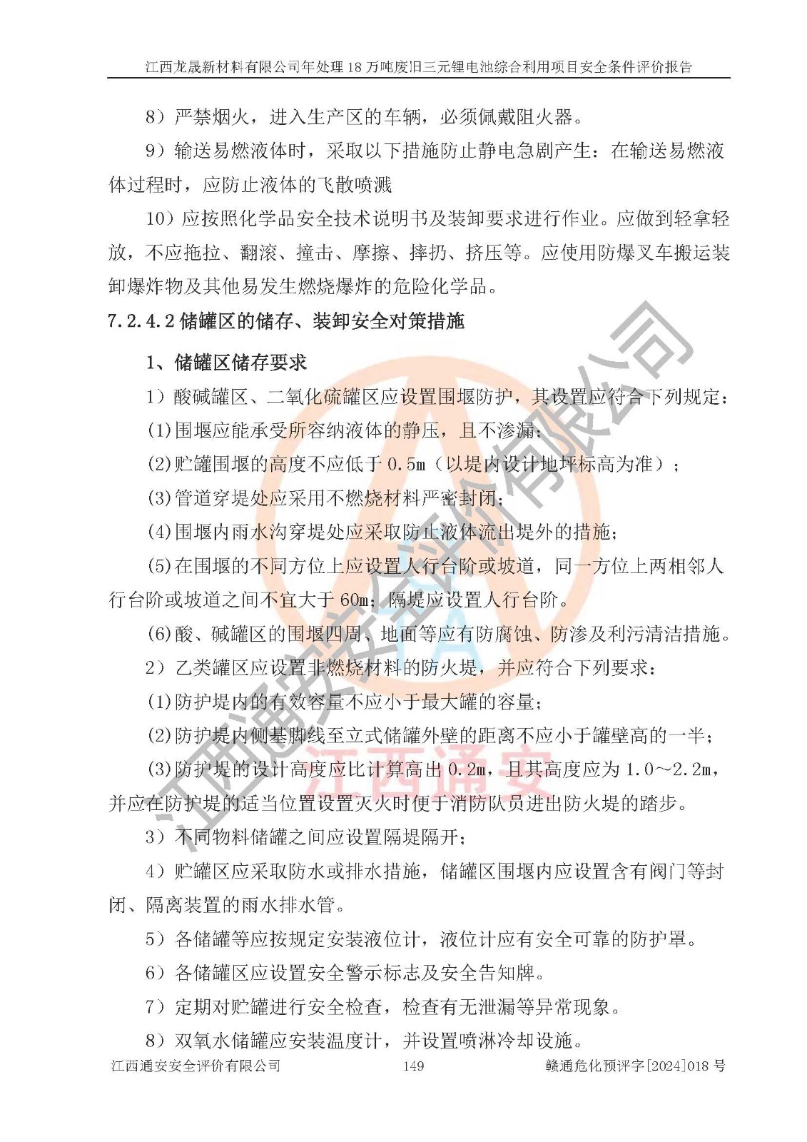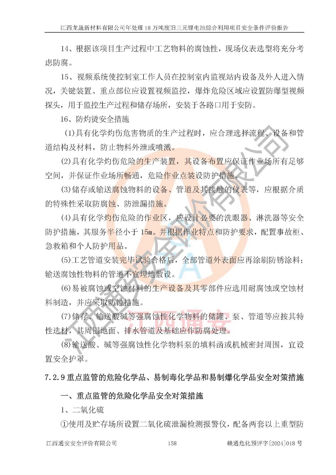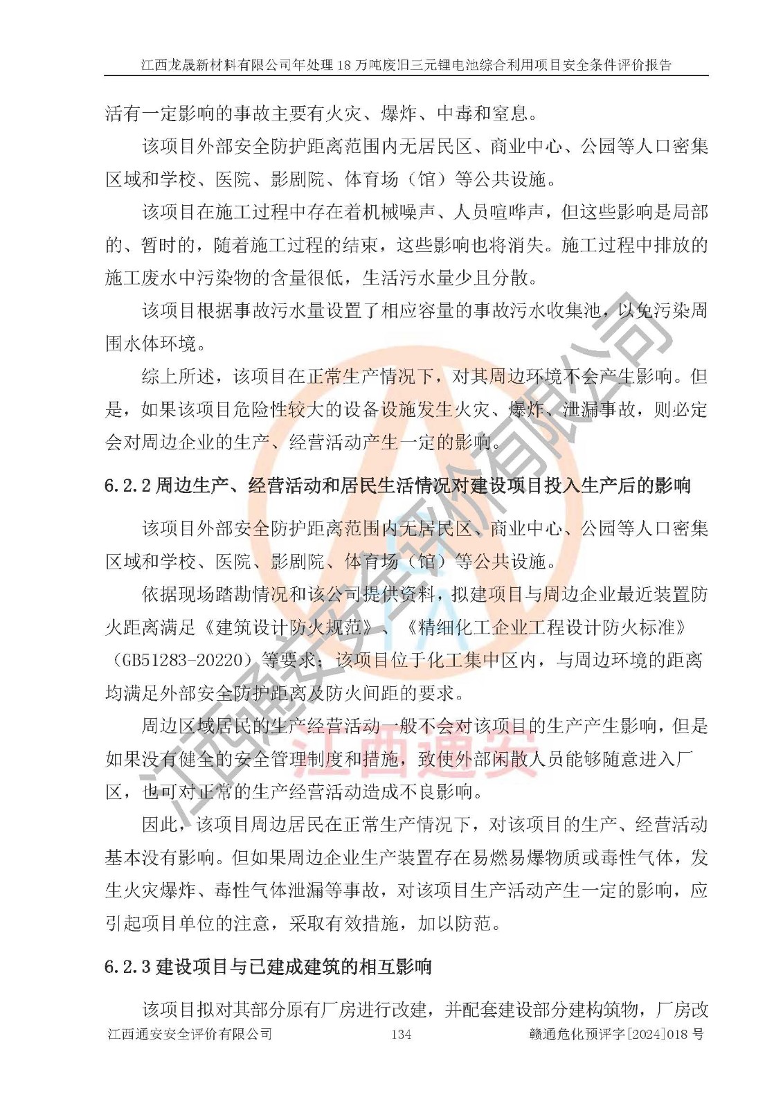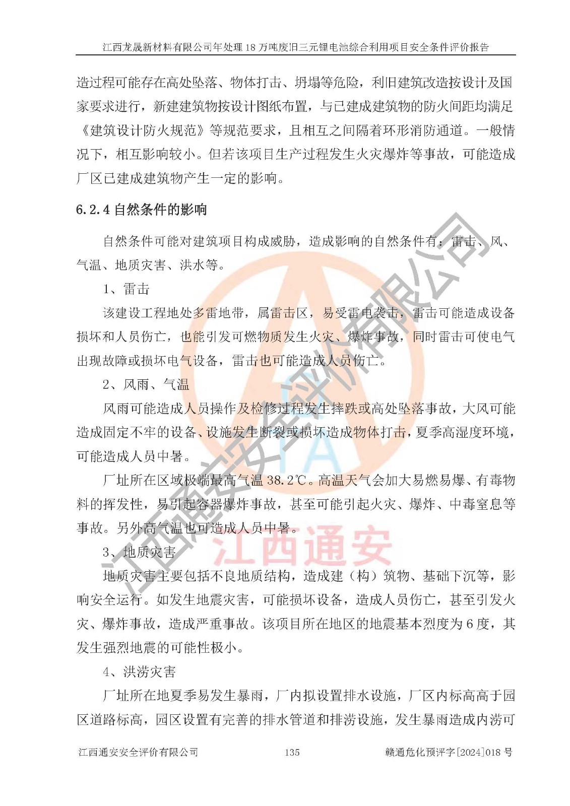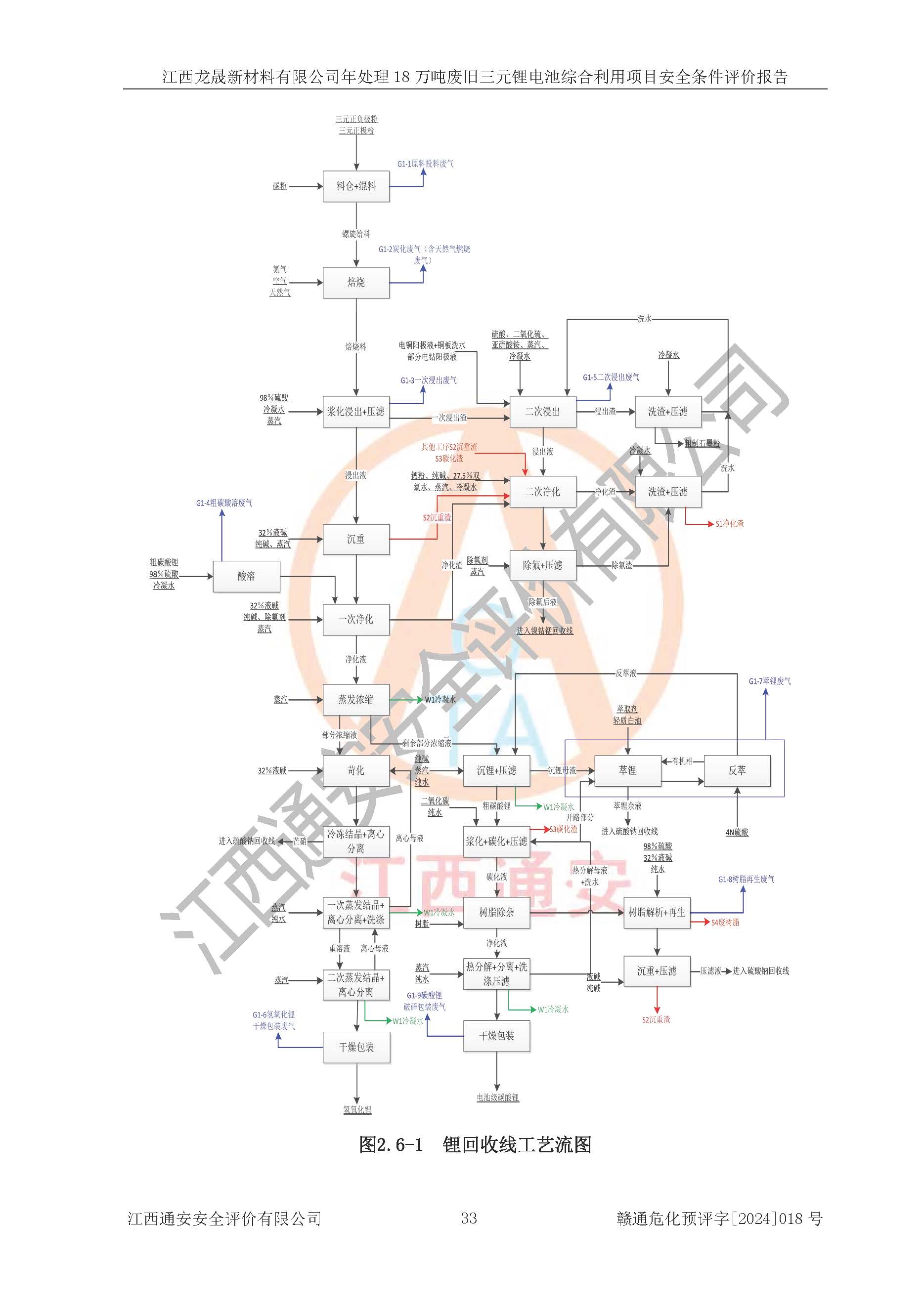 评价结论 | 江西龙晟新材料有限公司年处理18万吨废旧三元锂电池综合利用项目在以后的初步设计、施工图设计和建设施工、安装调试及生产运行中,如能严格执行**有关安全生产的法律法规、规章、标准、规范,认真落实项目可行性研究报告提出的安全对策措施,并合理采纳本报告中提出的安全对策措施及建议,真正做到安全设施与主体工程同时设计、同时施工、同时投入生产和使用,则工程潜在的危险、有害因素可得到**控制,风险在**控制和可接受范围内。 | |||