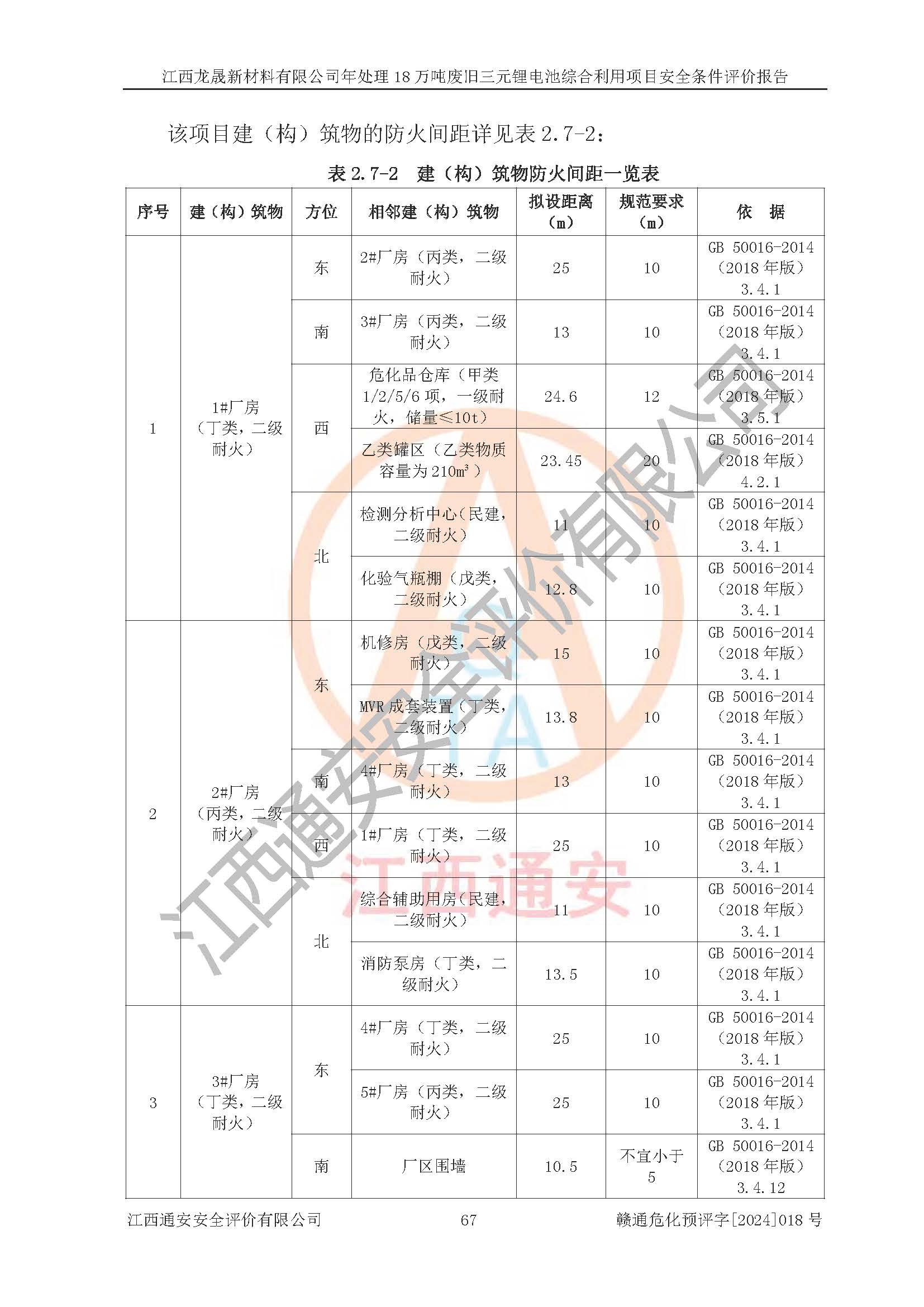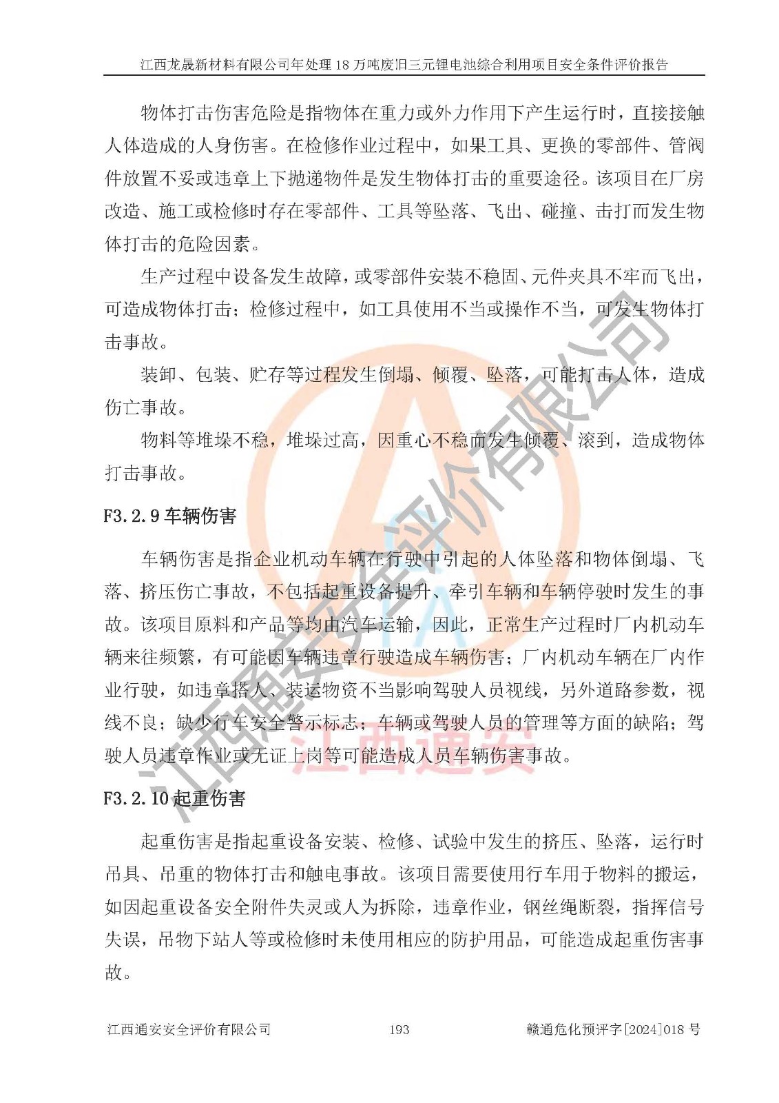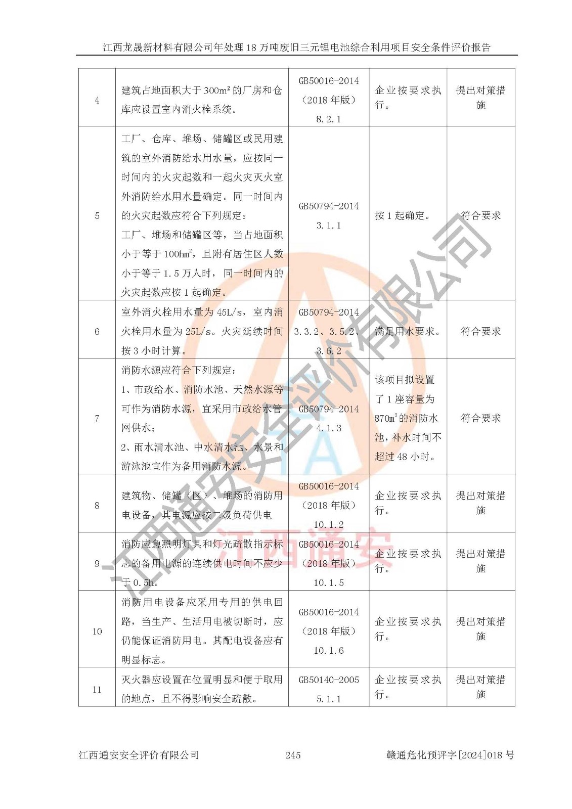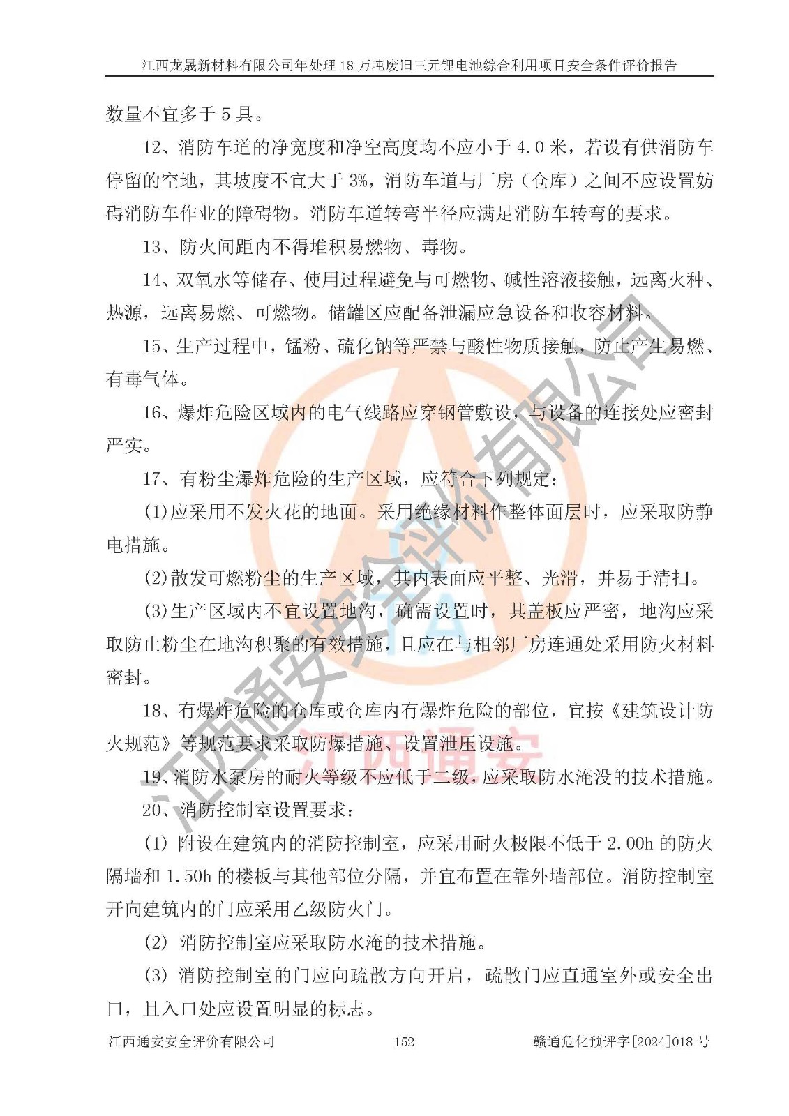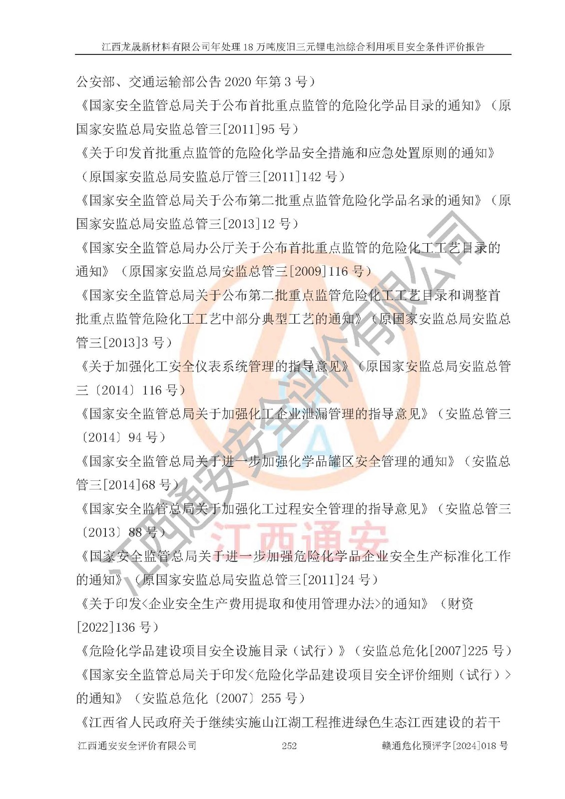 评价结论 | 江西龙晟新材料有限公司年处理18万吨废旧三元锂电池综合利用项目在以后的初步设计、施工图设计和建设施工、安装调试及生产运行中,如能严格执行**有关安全生产的法律法规、规章、标准、规范,认真落实项目可行性研究报告提出的安全对策措施,并合理采纳本报告中提出的安全对策措施及建议,真正做到安全设施与主体工程同时设计、同时施工、同时投入生产和使用,则工程潜在的危险、有害因素可得到**控制,风险在**控制和可接受范围内。 | |||