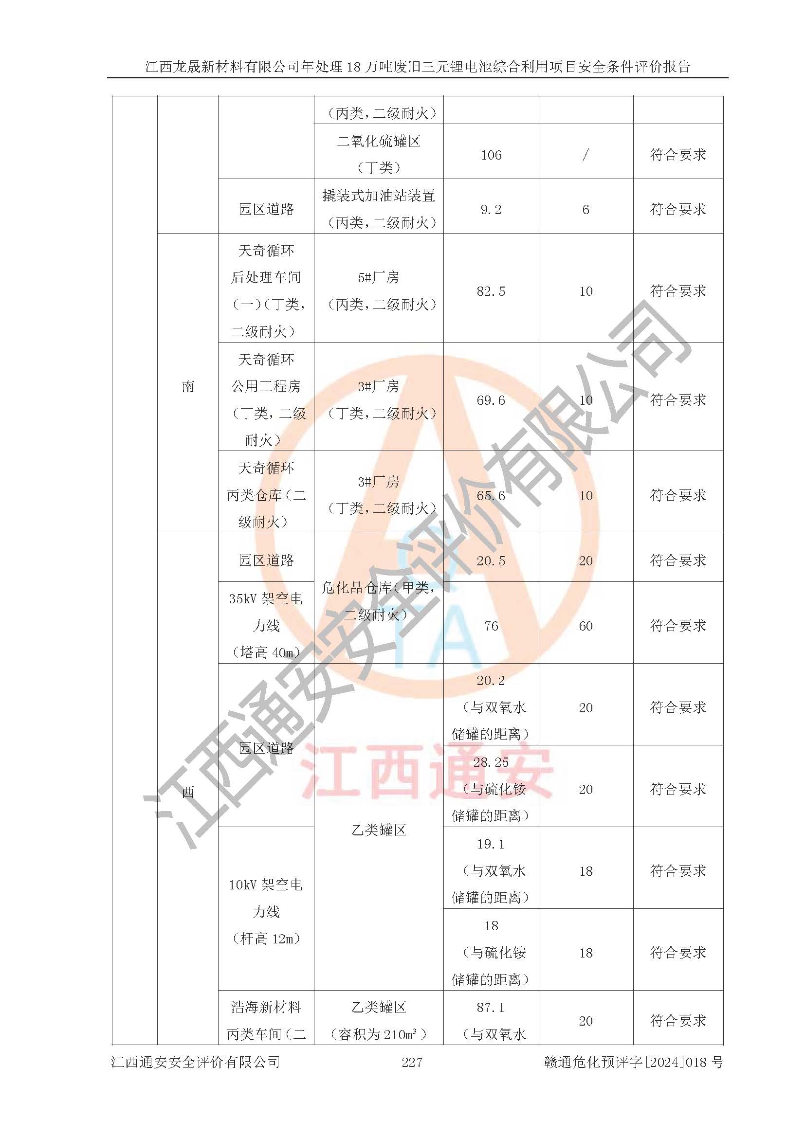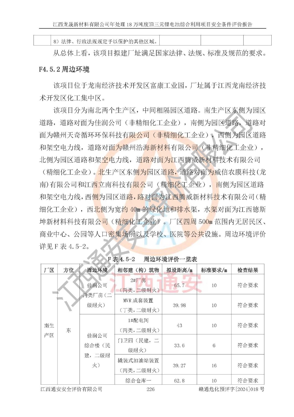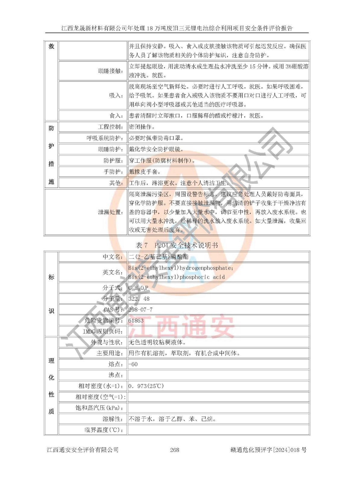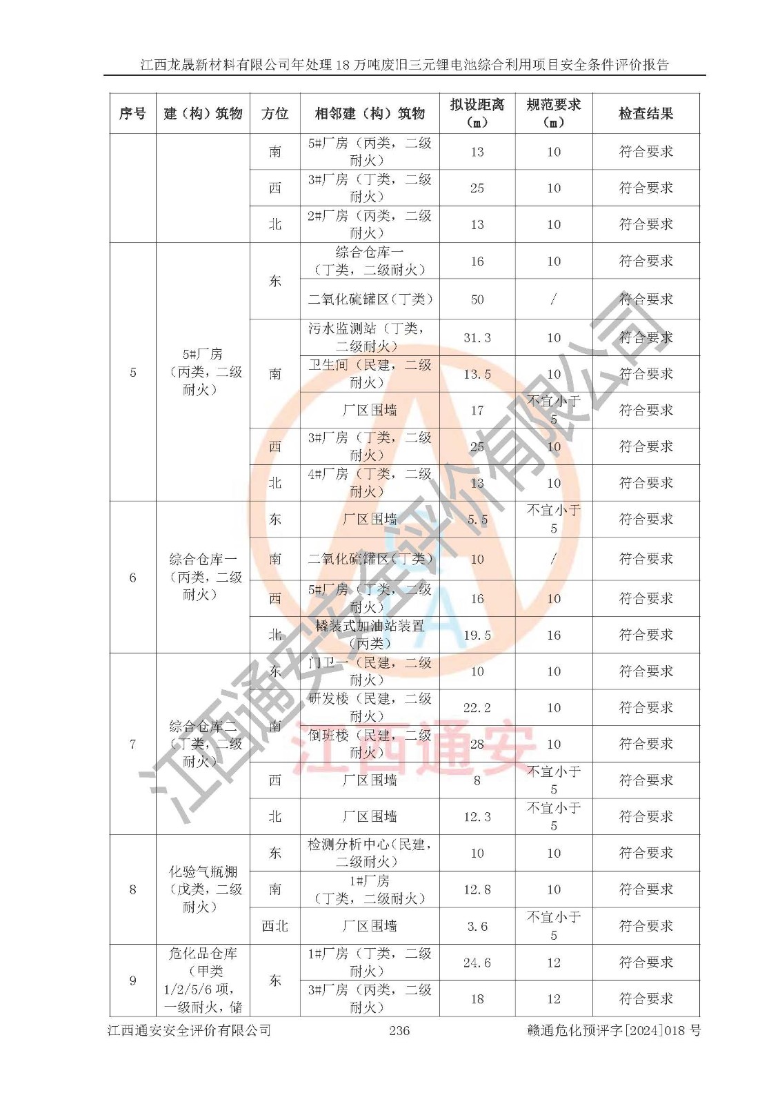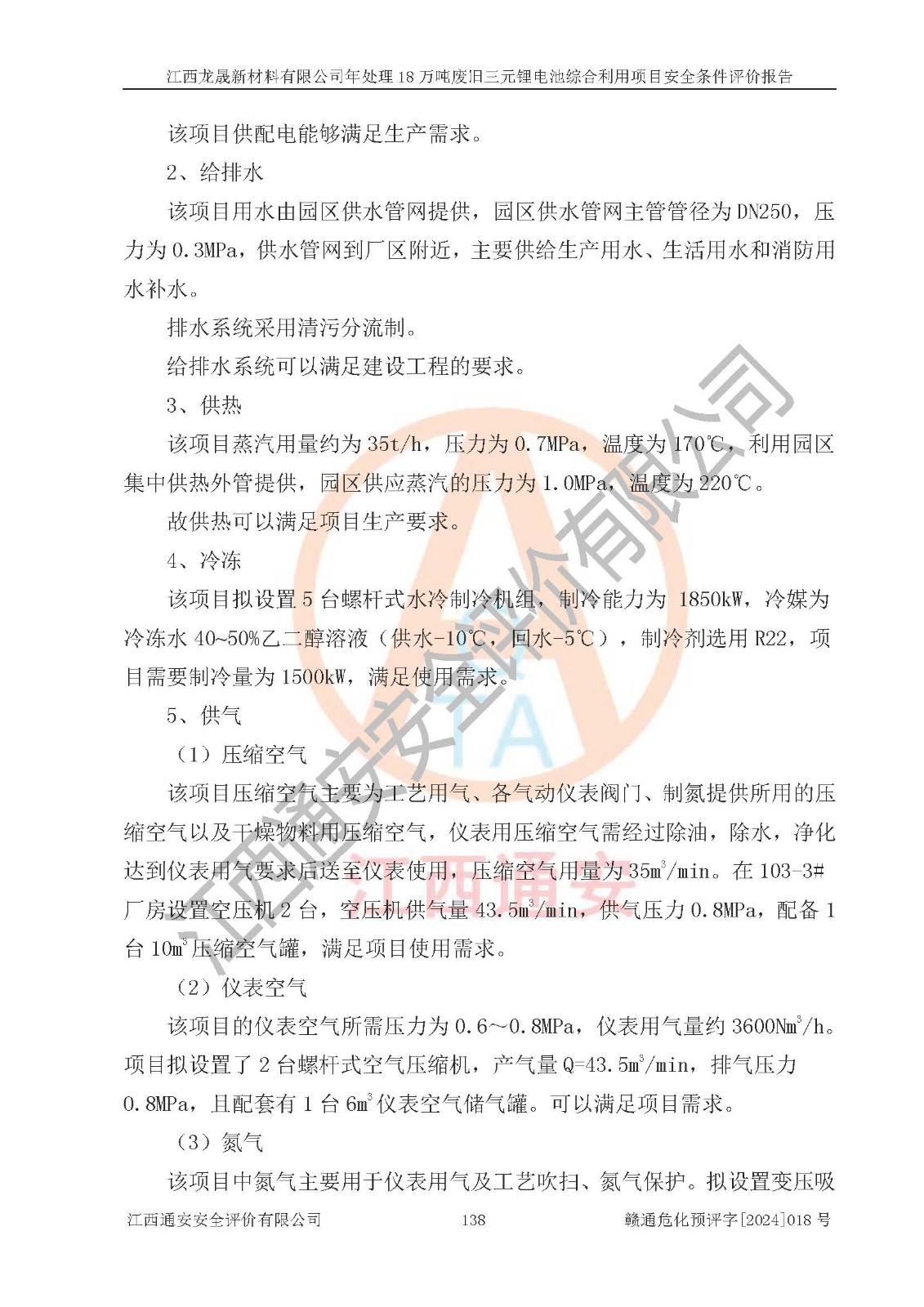 评价结论 | 江西龙晟新材料有限公司年处理18万吨废旧三元锂电池综合利用项目在以后的初步设计、施工图设计和建设施工、安装调试及生产运行中,如能严格执行**有关安全生产的法律法规、规章、标准、规范,认真落实项目可行性研究报告提出的安全对策措施,并合理采纳本报告中提出的安全对策措施及建议,真正做到安全设施与主体工程同时设计、同时施工、同时投入生产和使用,则工程潜在的危险、有害因素可得到**控制,风险在**控制和可接受范围内。 | |||