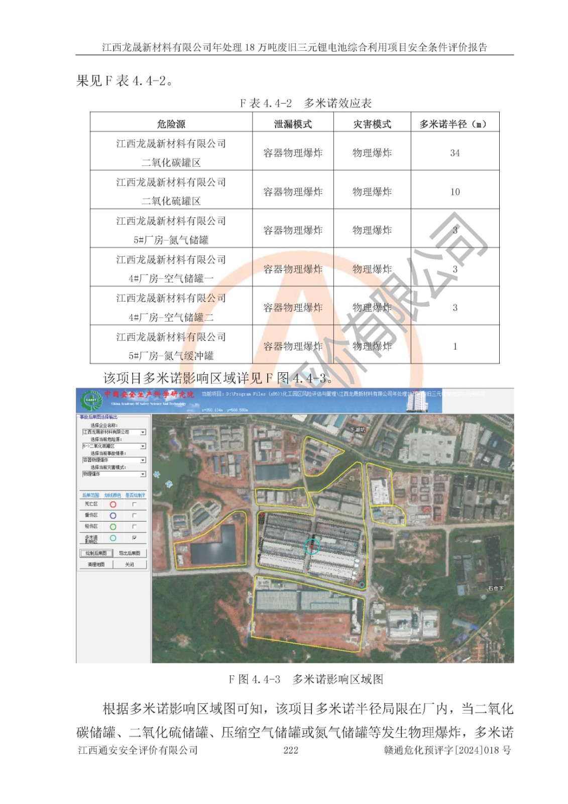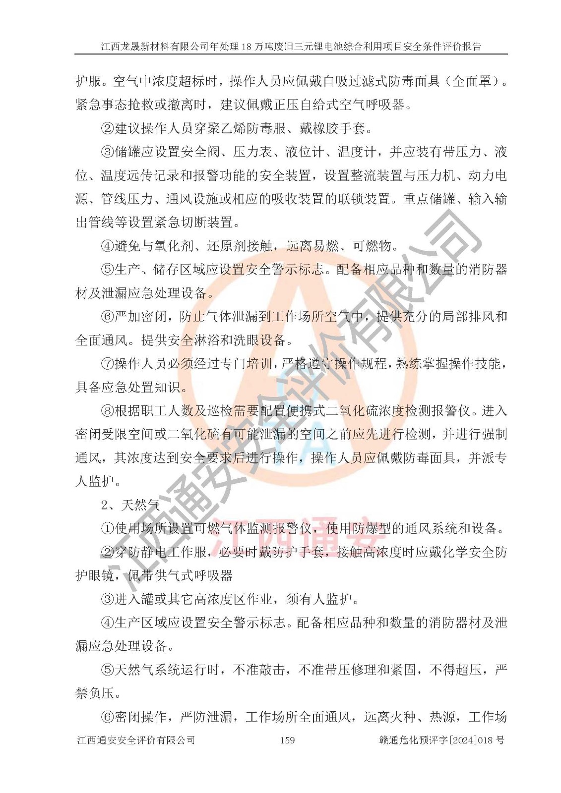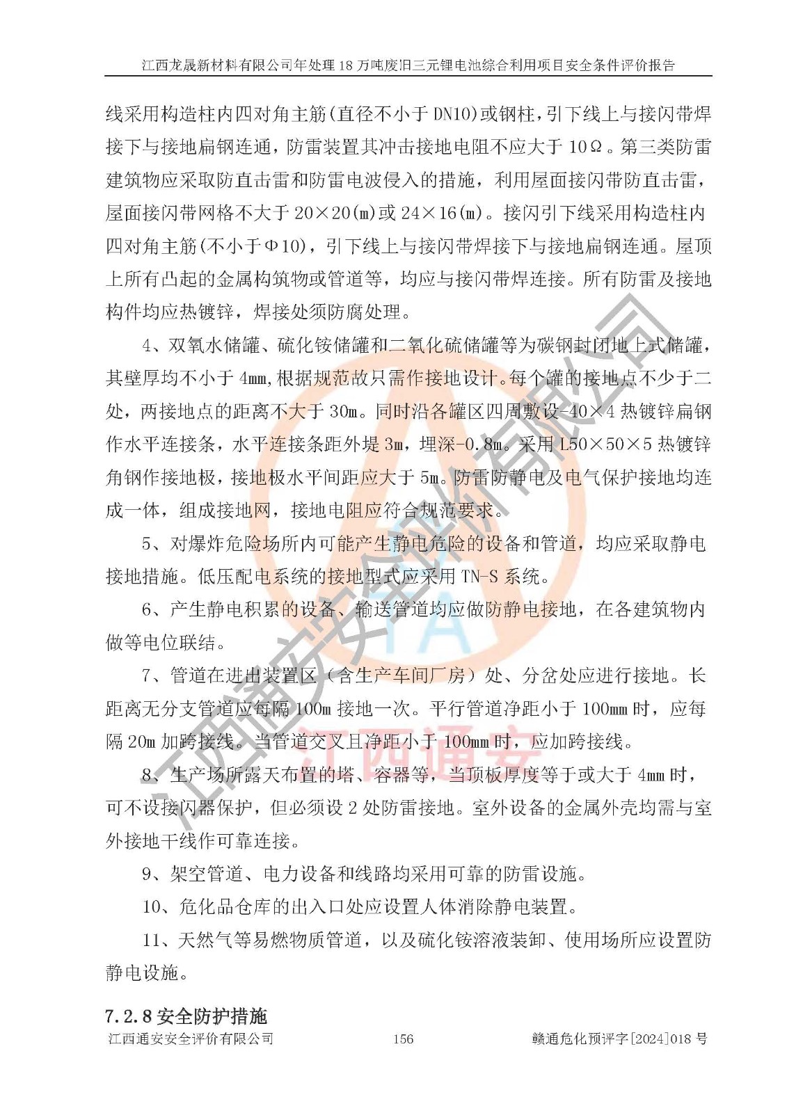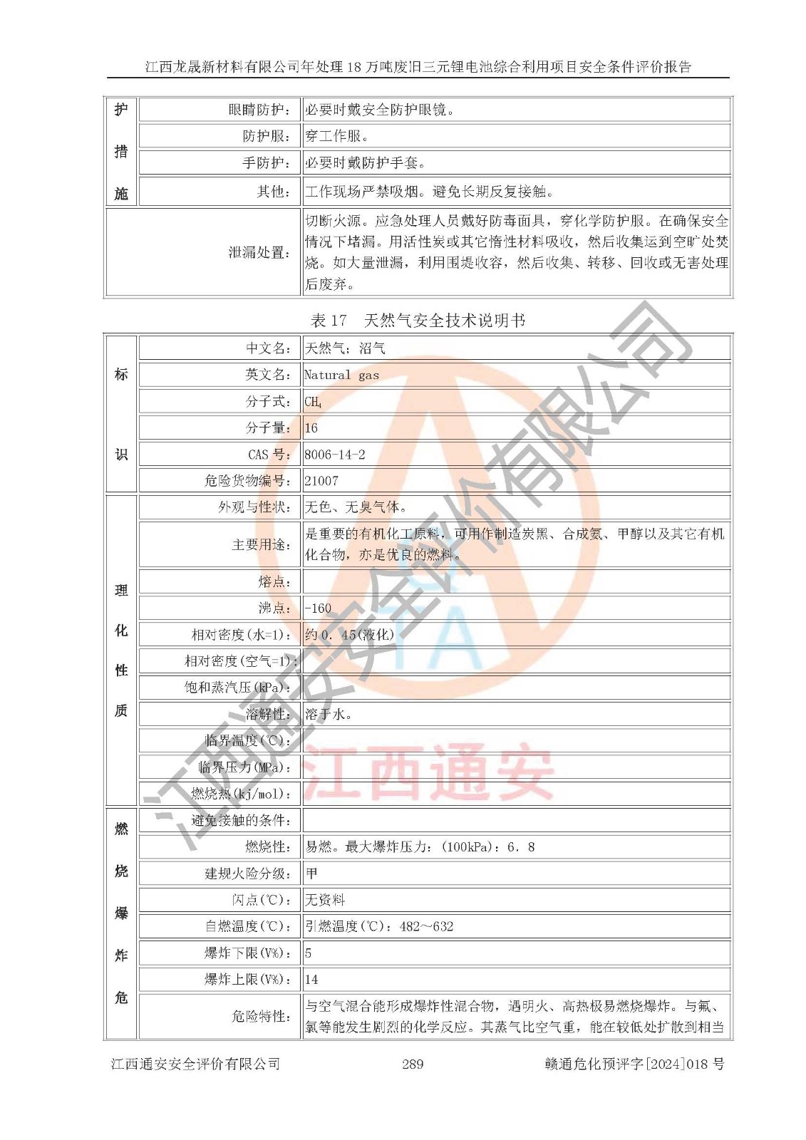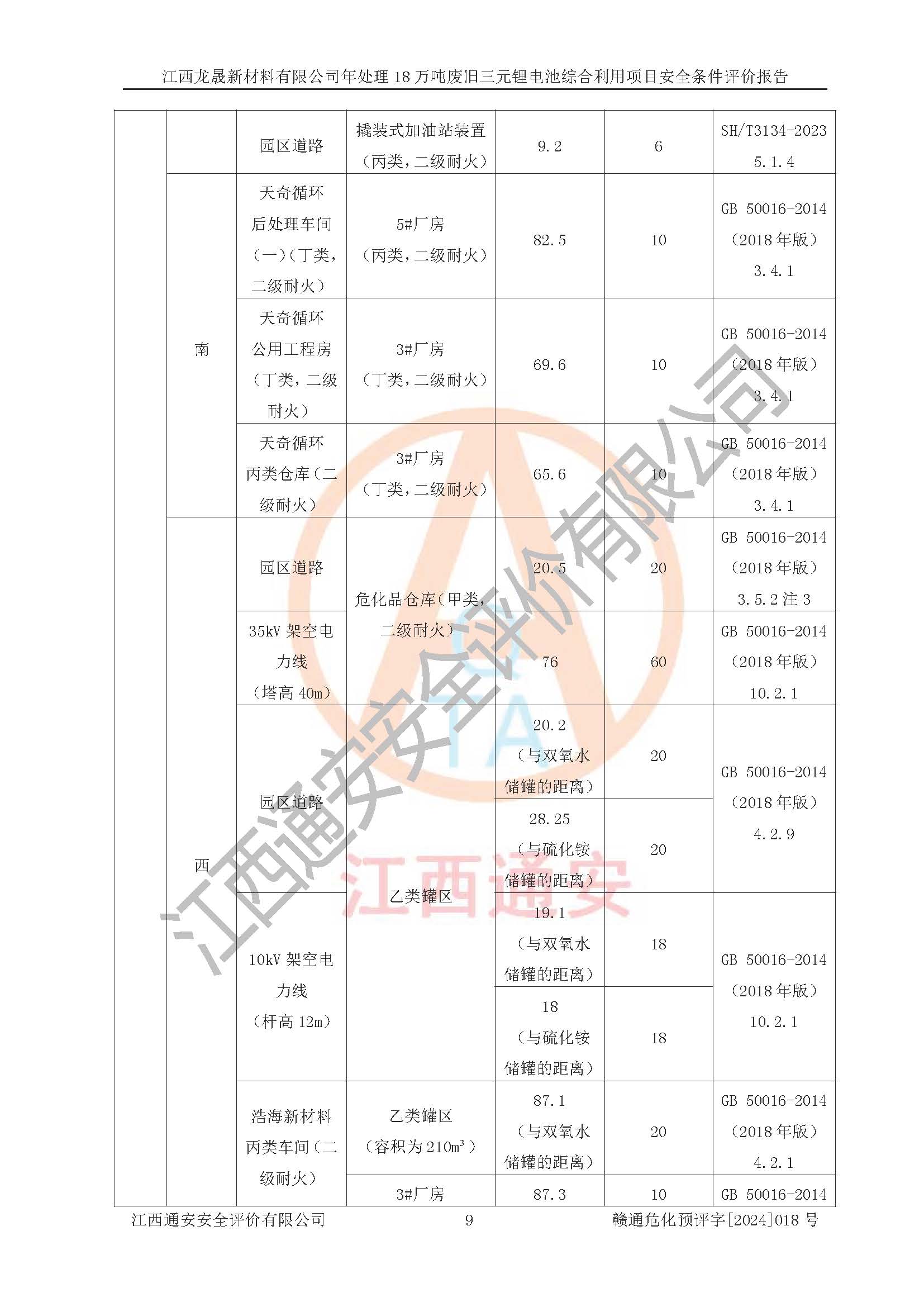 评价结论 | 江西龙晟新材料有限公司年处理18万吨废旧三元锂电池综合利用项目在以后的初步设计、施工图设计和建设施工、安装调试及生产运行中,如能严格执行**有关安全生产的法律法规、规章、标准、规范,认真落实项目可行性研究报告提出的安全对策措施,并合理采纳本报告中提出的安全对策措施及建议,真正做到安全设施与主体工程同时设计、同时施工、同时投入生产和使用,则工程潜在的危险、有害因素可得到**控制,风险在**控制和可接受范围内。 | |||
