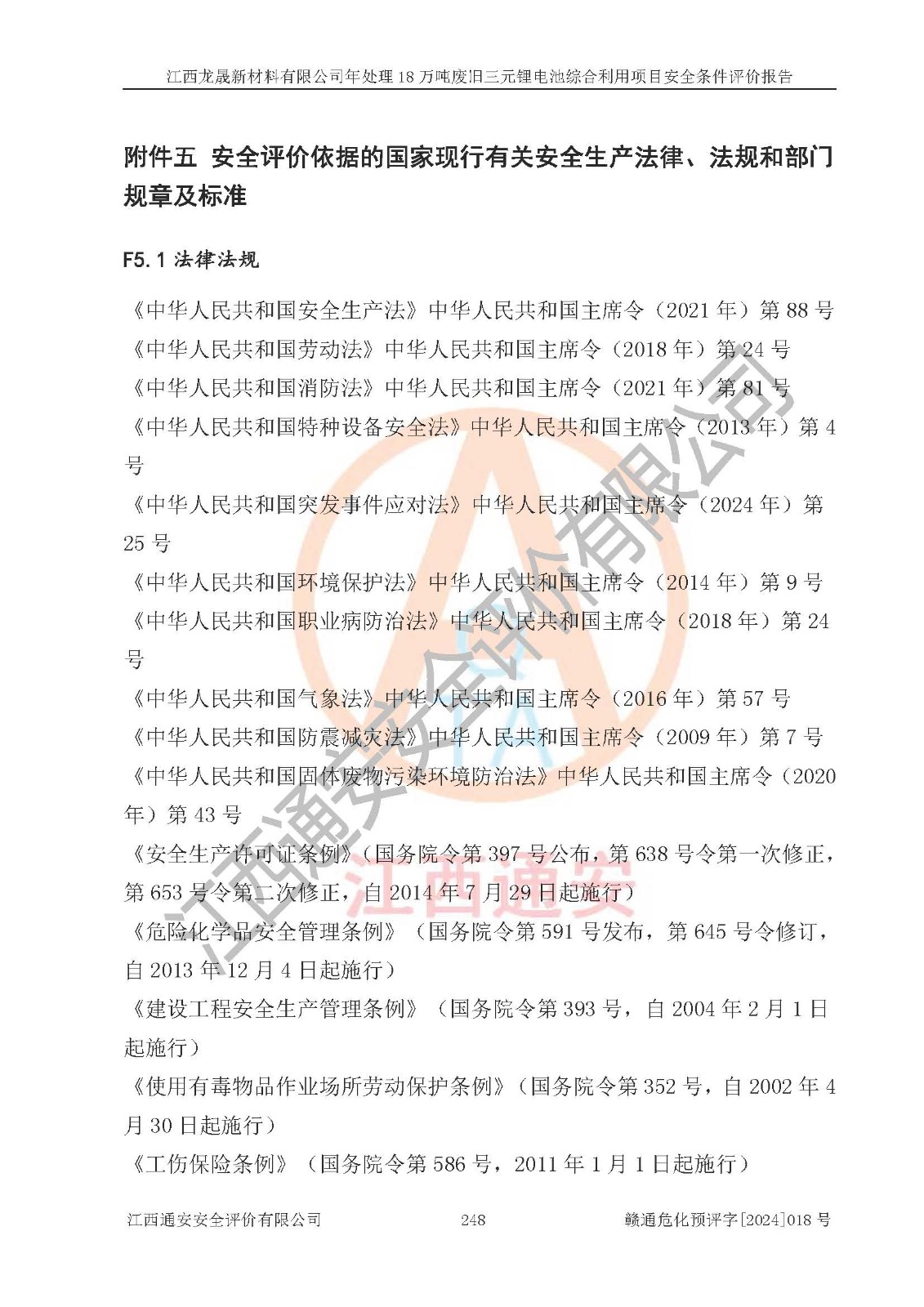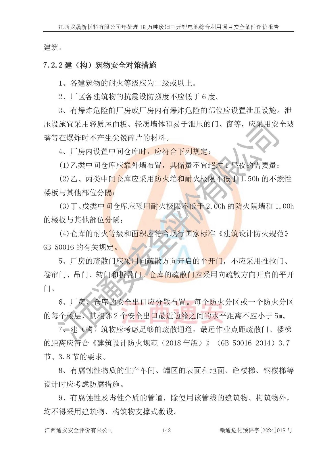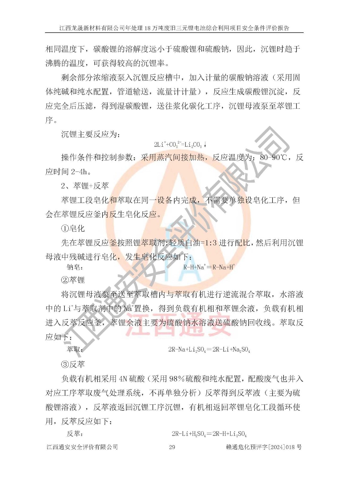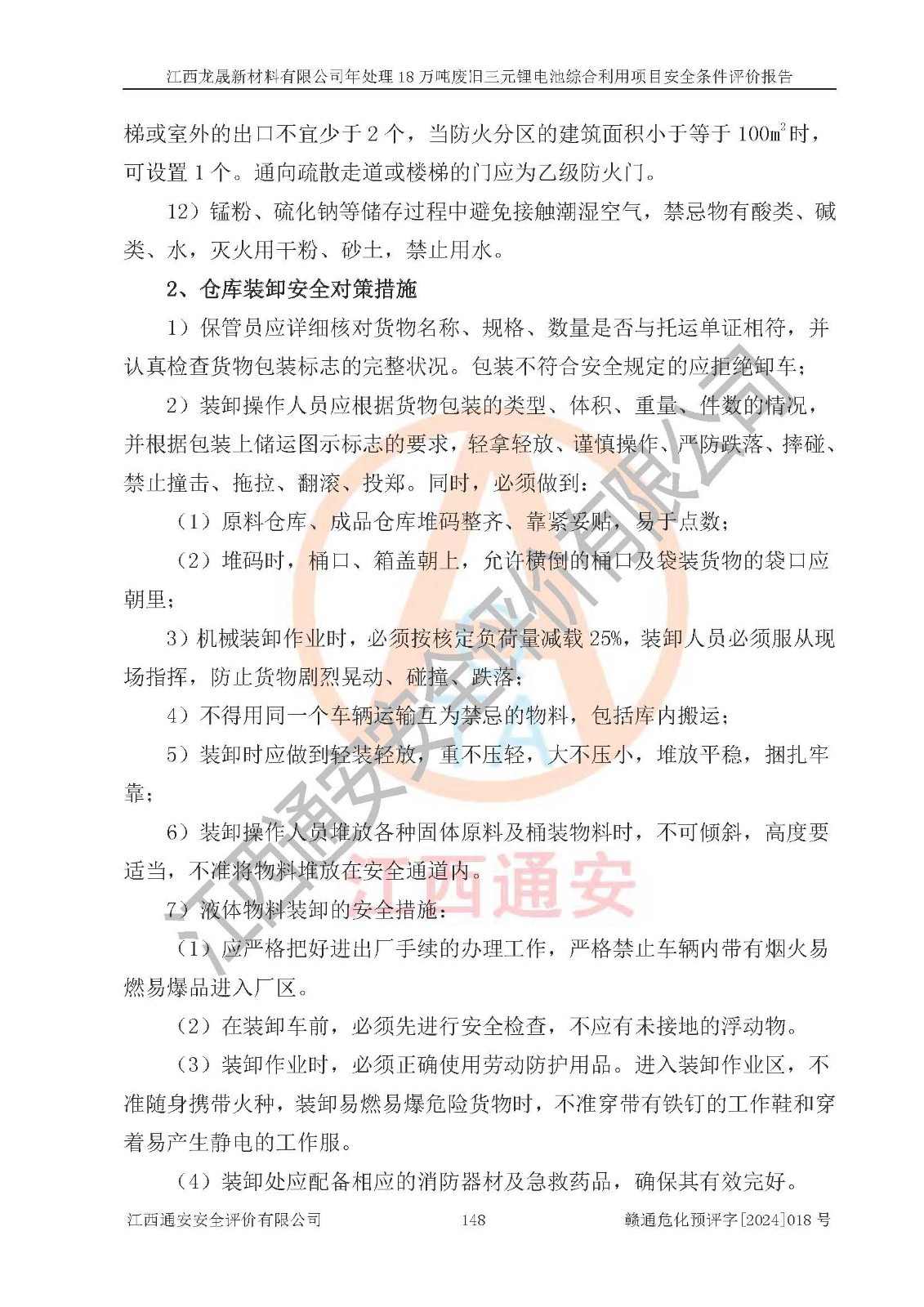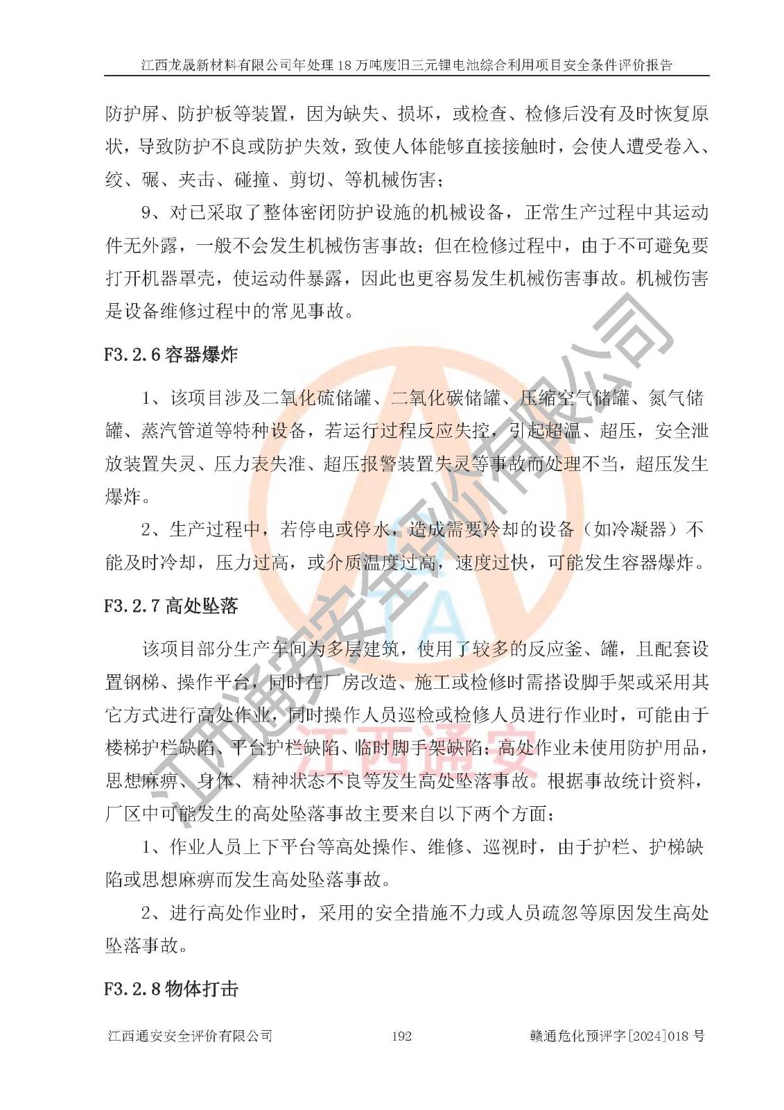 评价结论 | 江西龙晟新材料有限公司年处理18万吨废旧三元锂电池综合利用项目在以后的初步设计、施工图设计和建设施工、安装调试及生产运行中,如能严格执行**有关安全生产的法律法规、规章、标准、规范,认真落实项目可行性研究报告提出的安全对策措施,并合理采纳本报告中提出的安全对策措施及建议,真正做到安全设施与主体工程同时设计、同时施工、同时投入生产和使用,则工程潜在的危险、有害因素可得到**控制,风险在**控制和可接受范围内。 | |||
