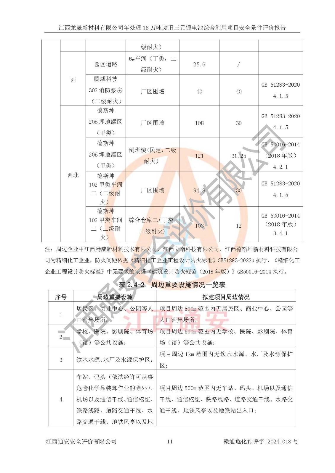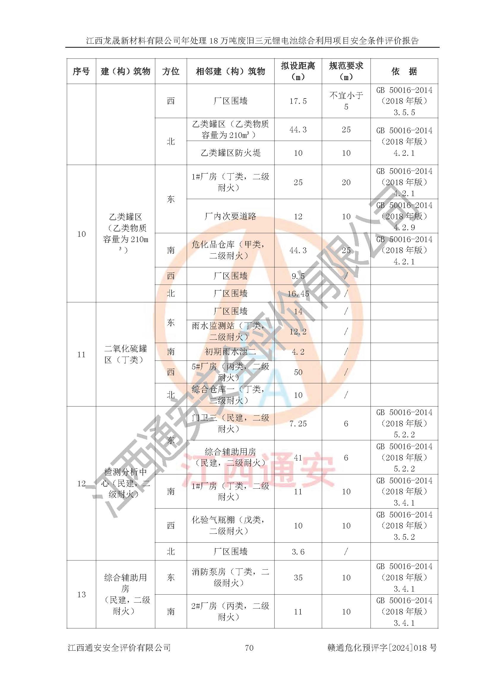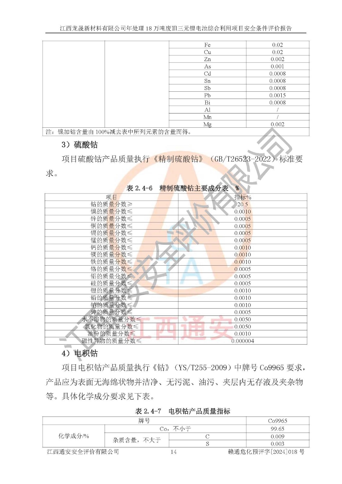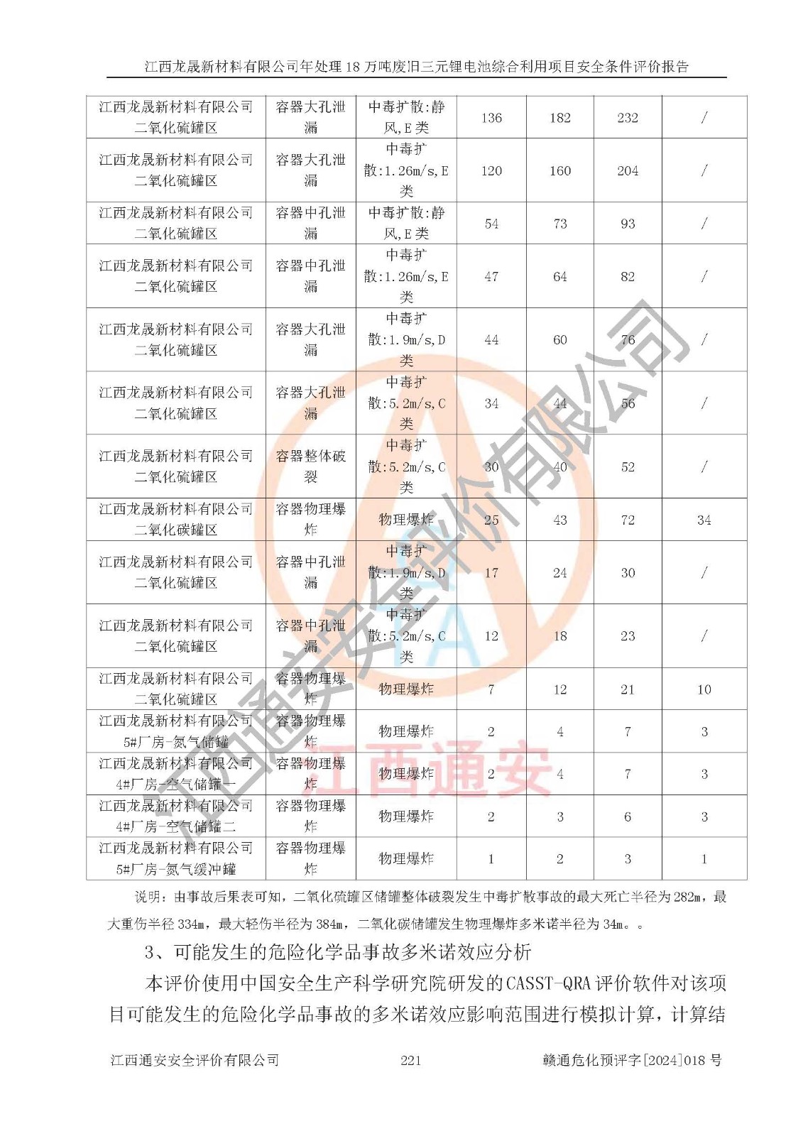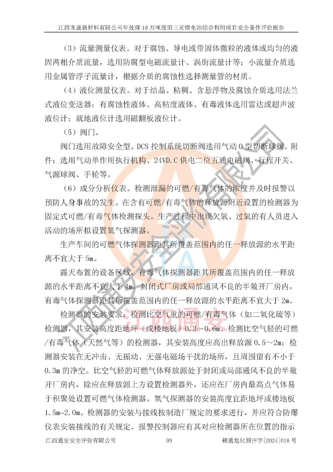 评价结论 | 江西龙晟新材料有限公司年处理18万吨废旧三元锂电池综合利用项目在以后的初步设计、施工图设计和建设施工、安装调试及生产运行中,如能严格执行**有关安全生产的法律法规、规章、标准、规范,认真落实项目可行性研究报告提出的安全对策措施,并合理采纳本报告中提出的安全对策措施及建议,真正做到安全设施与主体工程同时设计、同时施工、同时投入生产和使用,则工程潜在的危险、有害因素可得到**控制,风险在**控制和可接受范围内。 | |||