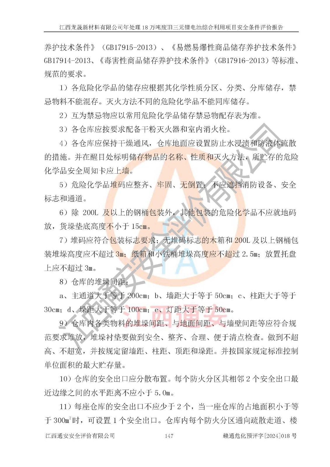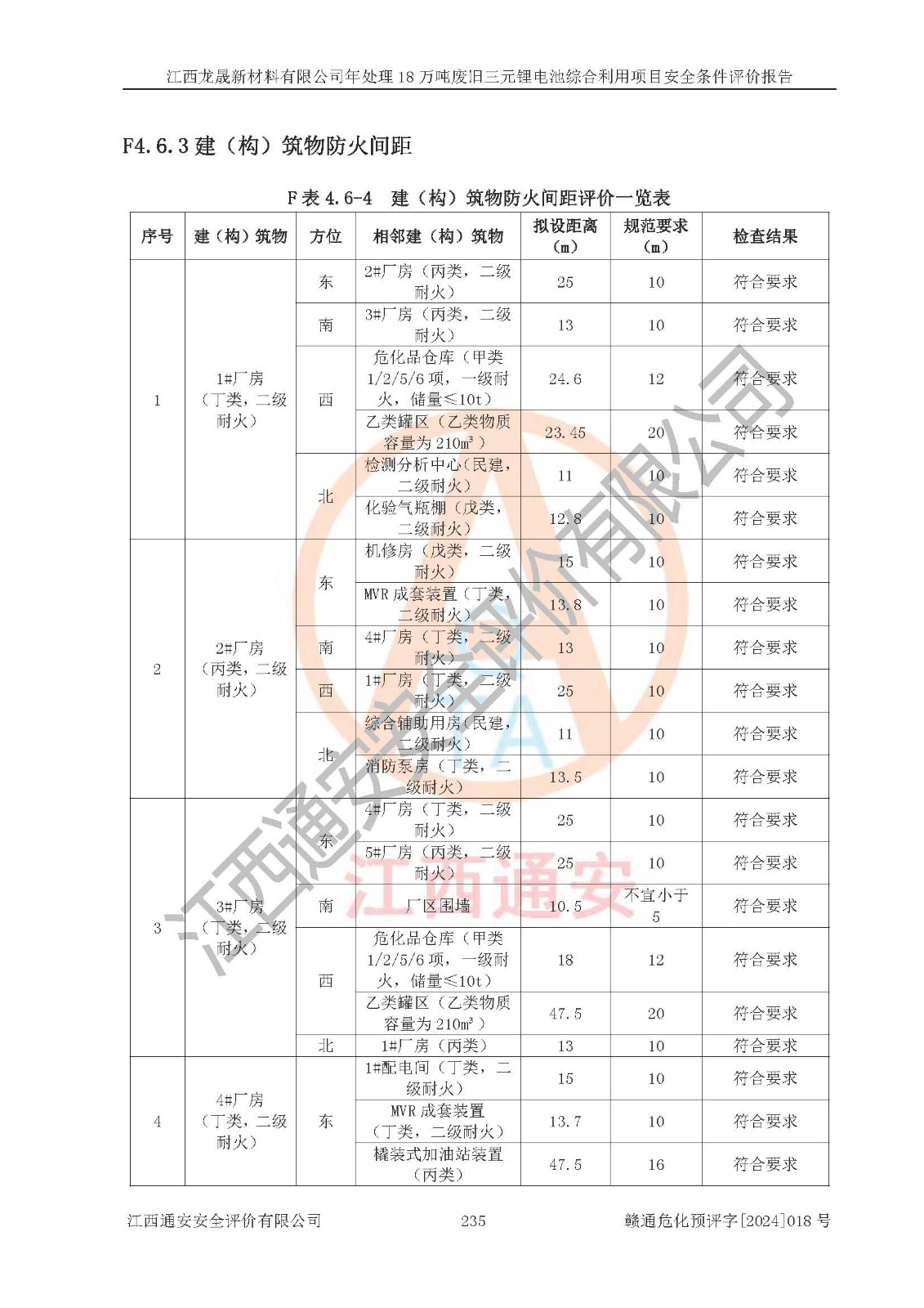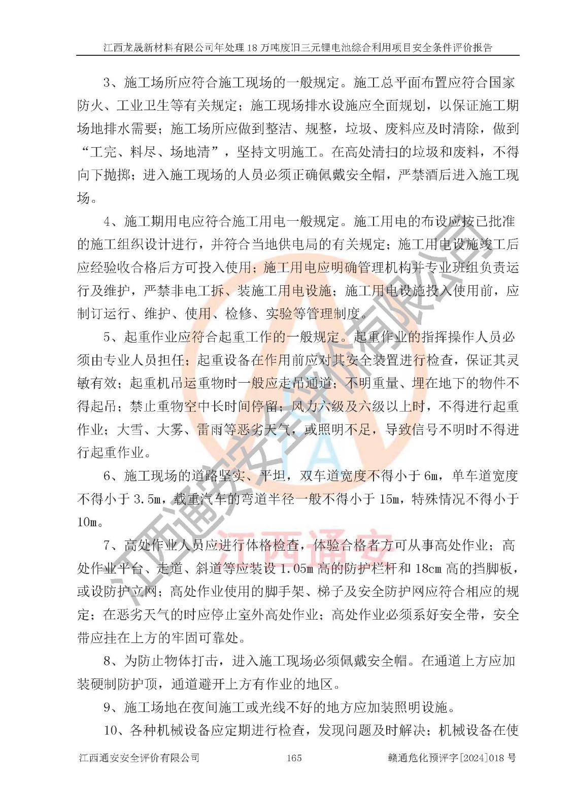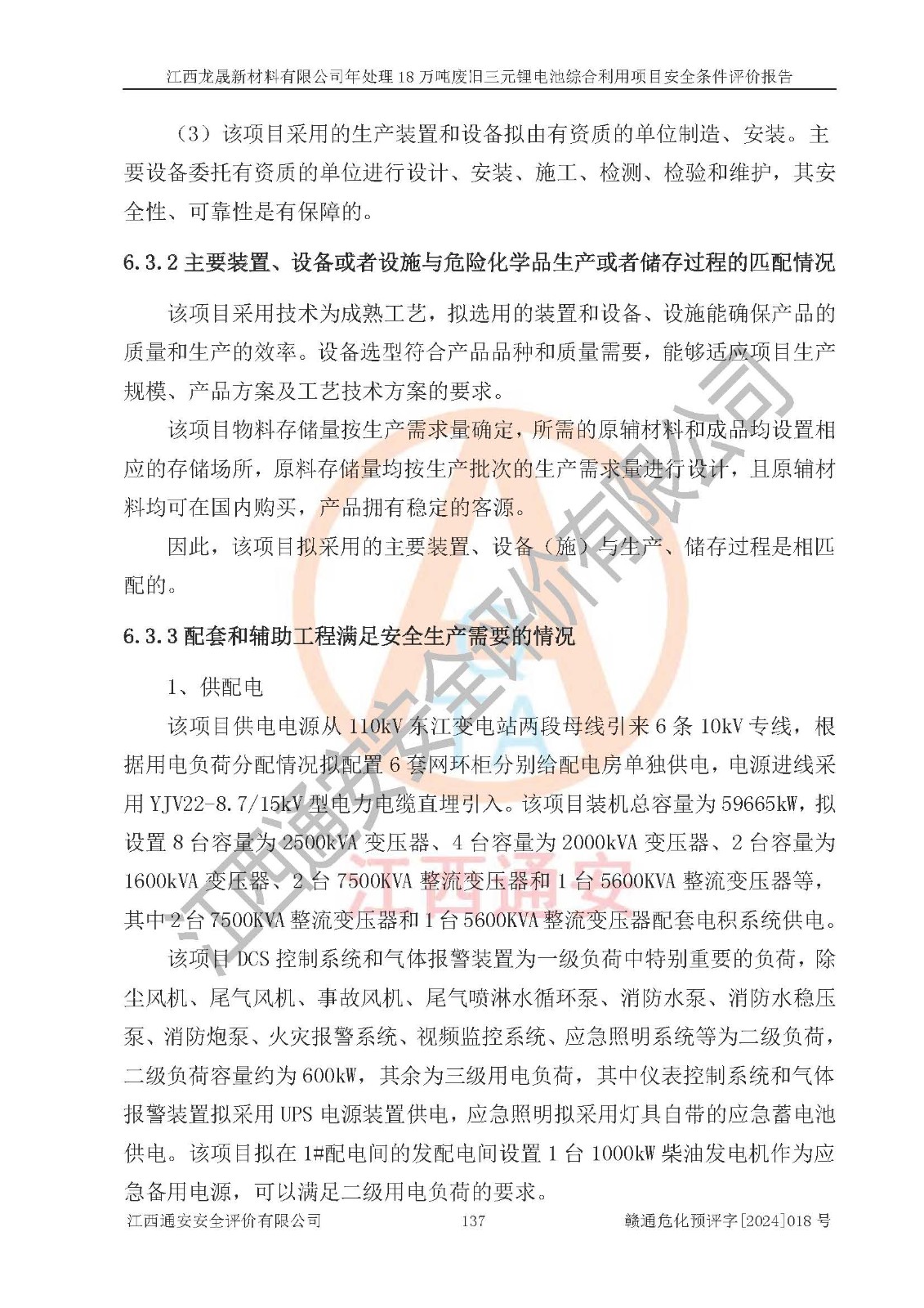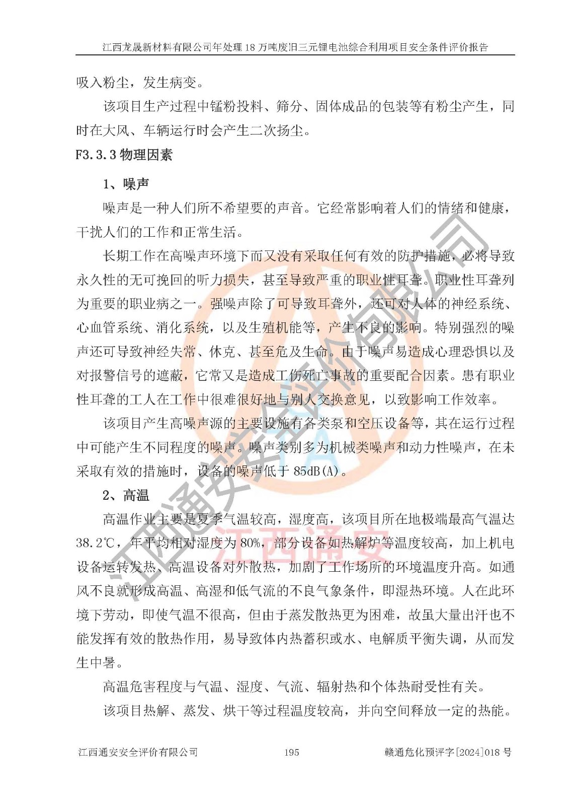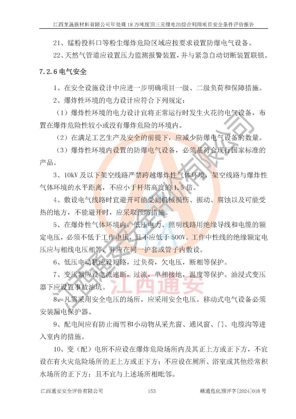 评价结论 | 江西龙晟新材料有限公司年处理18万吨废旧三元锂电池综合利用项目在以后的初步设计、施工图设计和建设施工、安装调试及生产运行中,如能严格执行**有关安全生产的法律法规、规章、标准、规范,认真落实项目可行性研究报告提出的安全对策措施,并合理采纳本报告中提出的安全对策措施及建议,真正做到安全设施与主体工程同时设计、同时施工、同时投入生产和使用,则工程潜在的危险、有害因素可得到**控制,风险在**控制和可接受范围内。 | |||