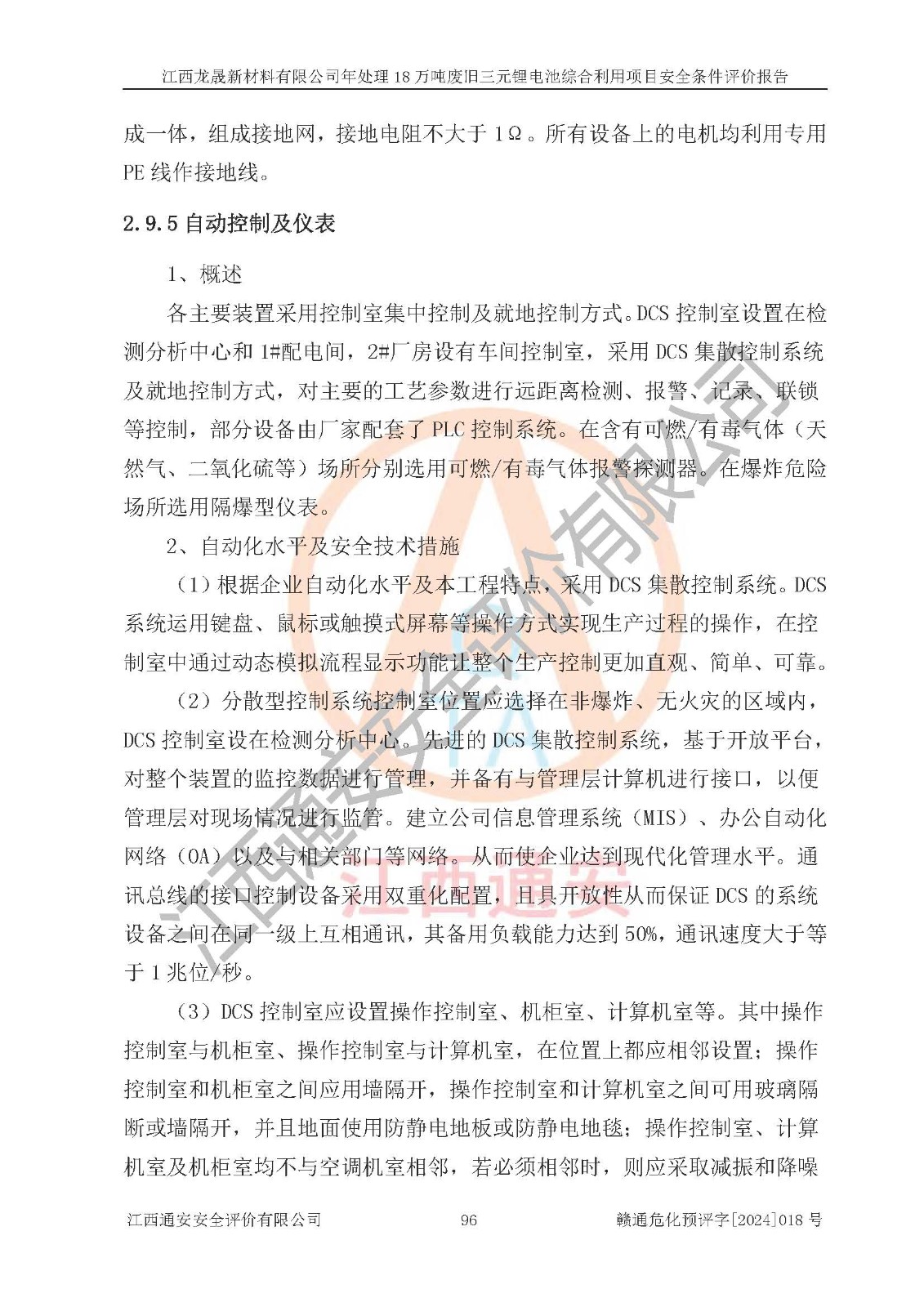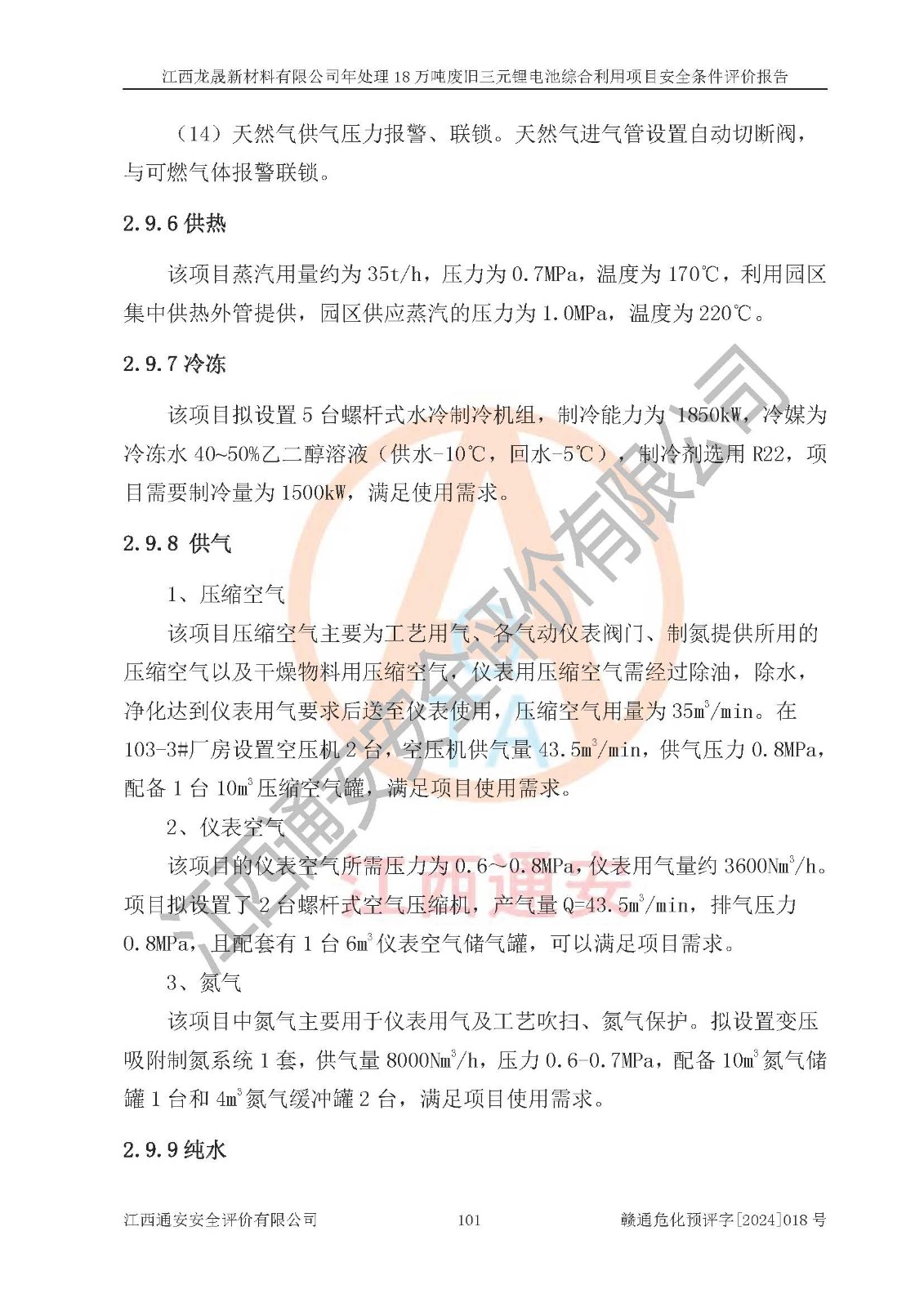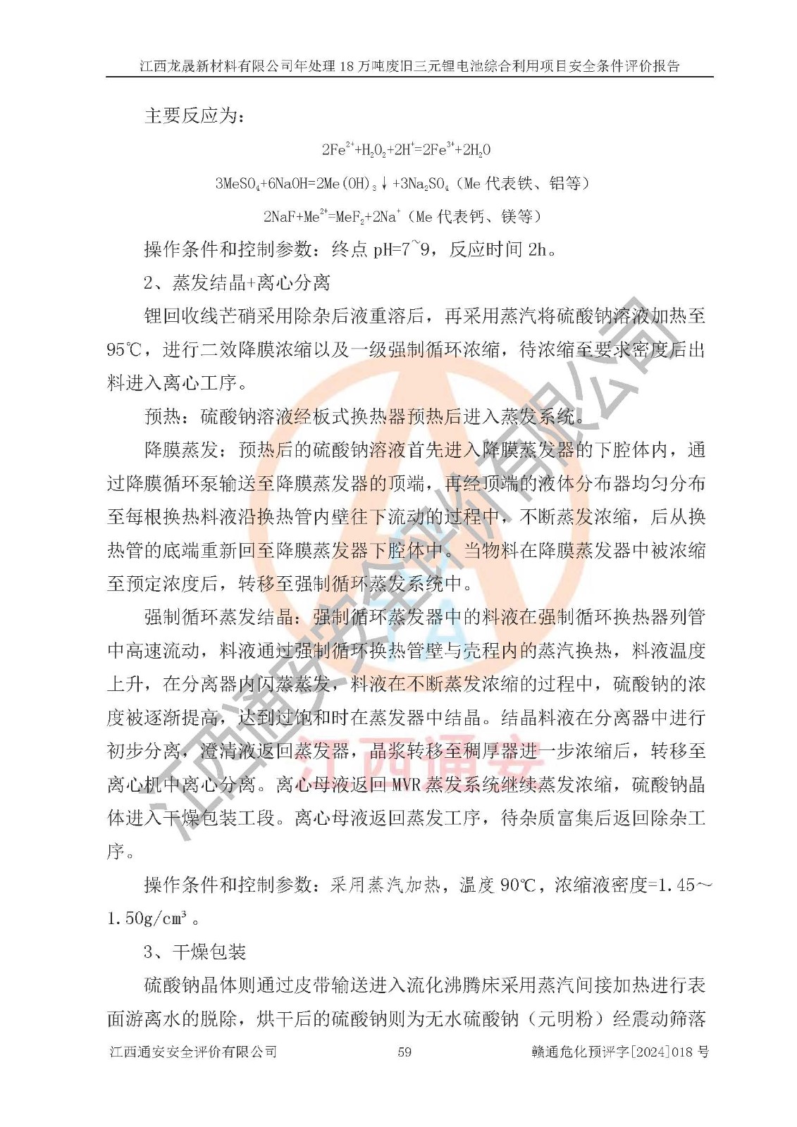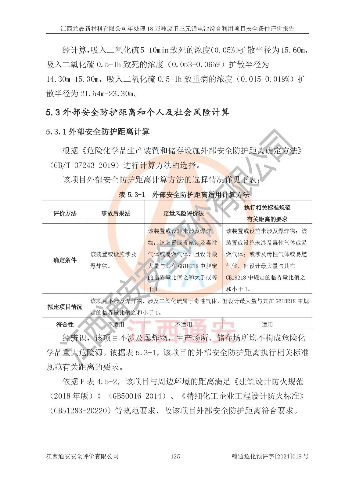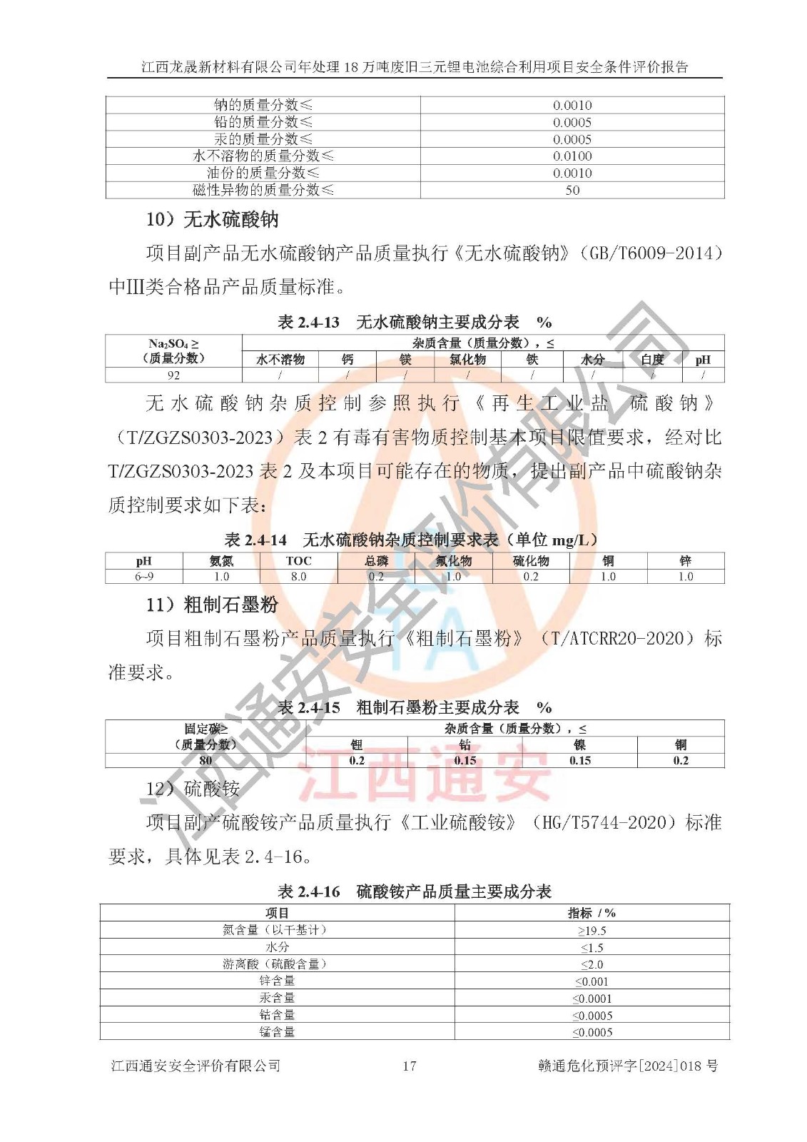 评价结论 | 江西龙晟新材料有限公司年处理18万吨废旧三元锂电池综合利用项目在以后的初步设计、施工图设计和建设施工、安装调试及生产运行中,如能严格执行**有关安全生产的法律法规、规章、标准、规范,认真落实项目可行性研究报告提出的安全对策措施,并合理采纳本报告中提出的安全对策措施及建议,真正做到安全设施与主体工程同时设计、同时施工、同时投入生产和使用,则工程潜在的危险、有害因素可得到**控制,风险在**控制和可接受范围内。 | |||