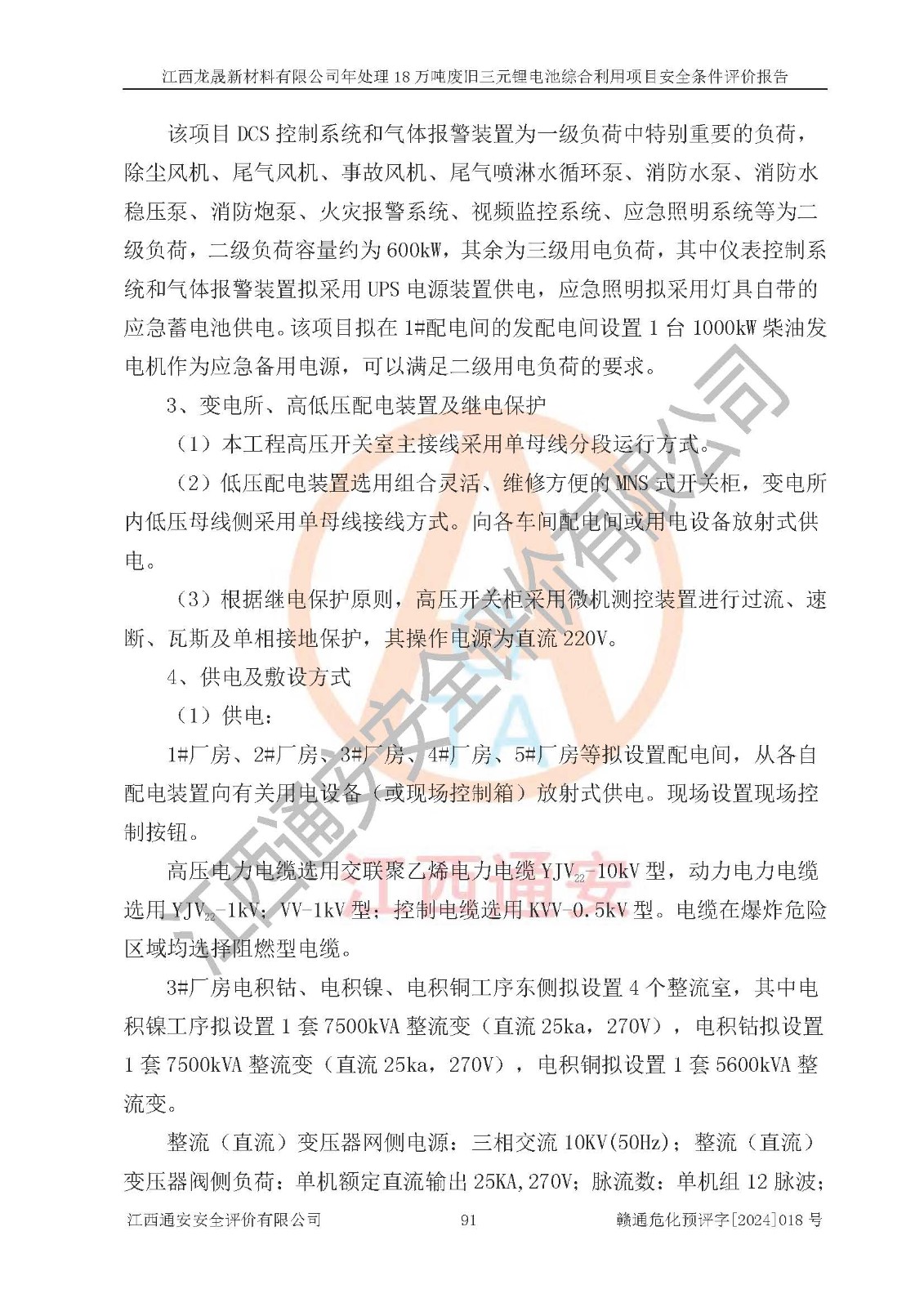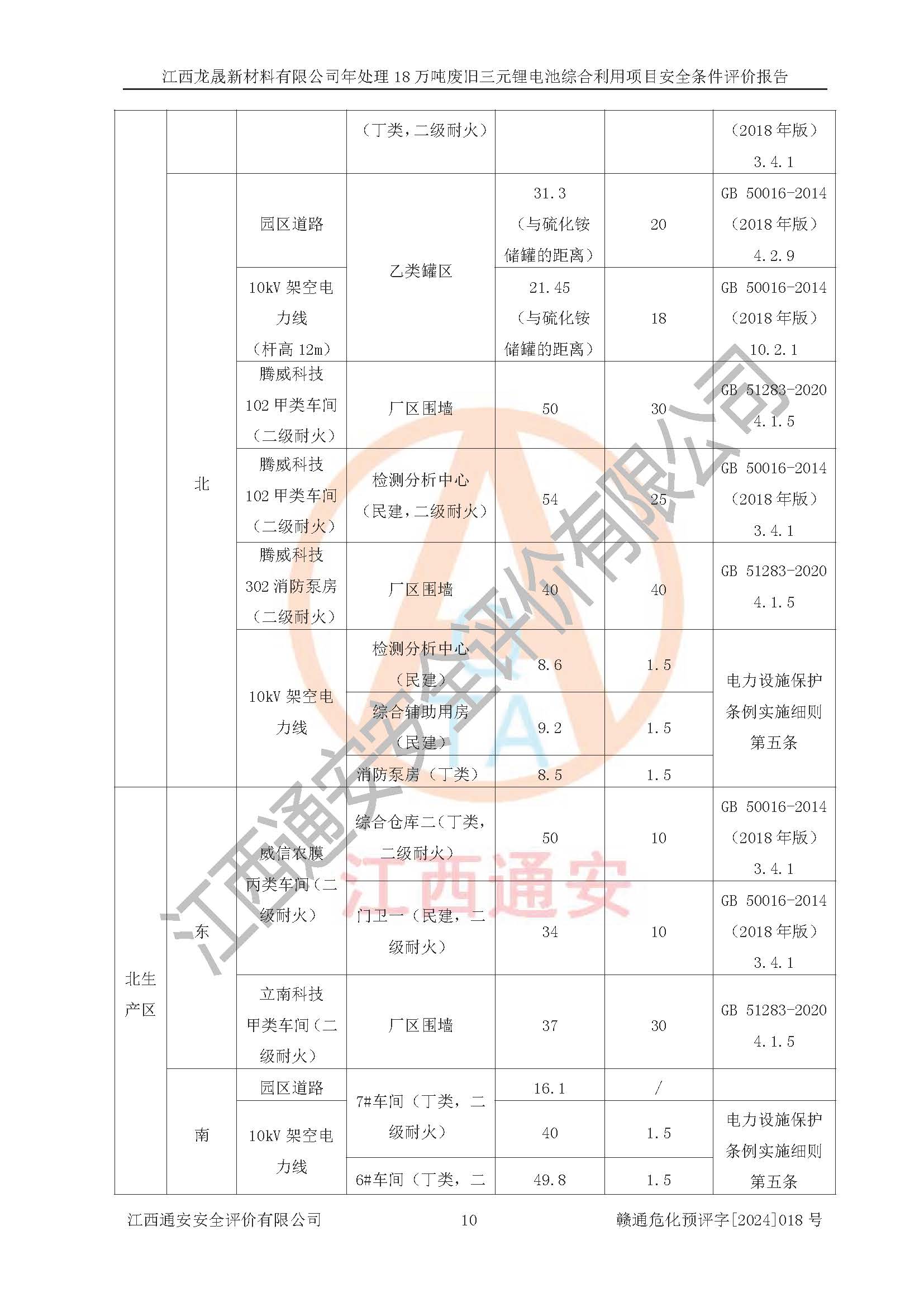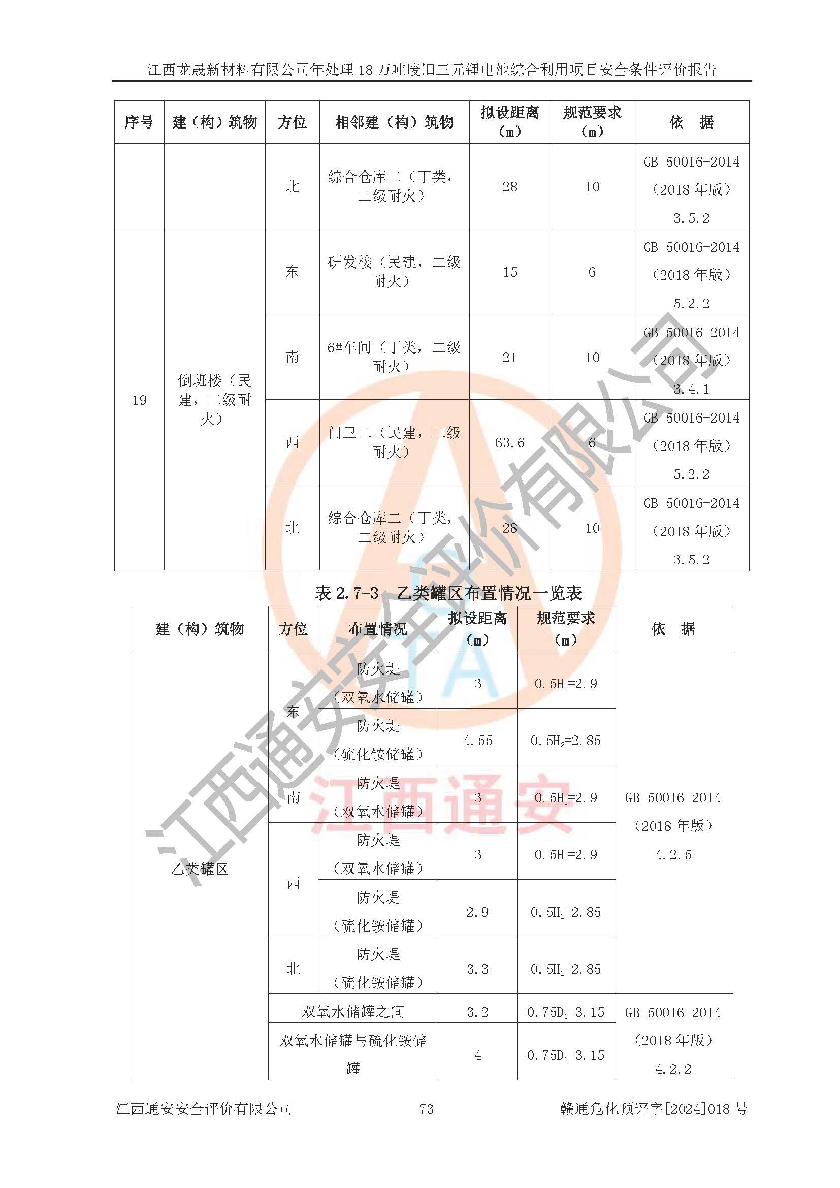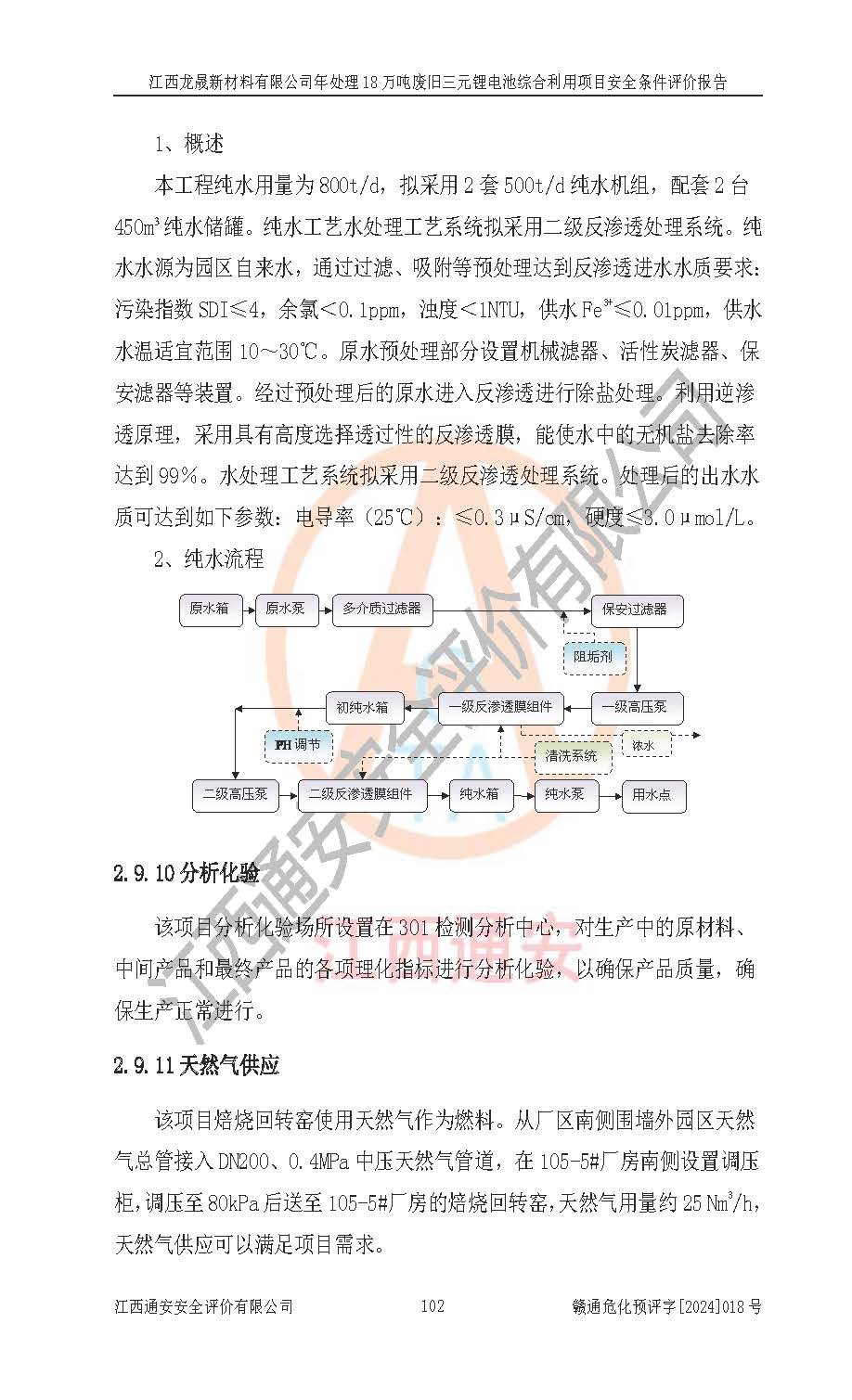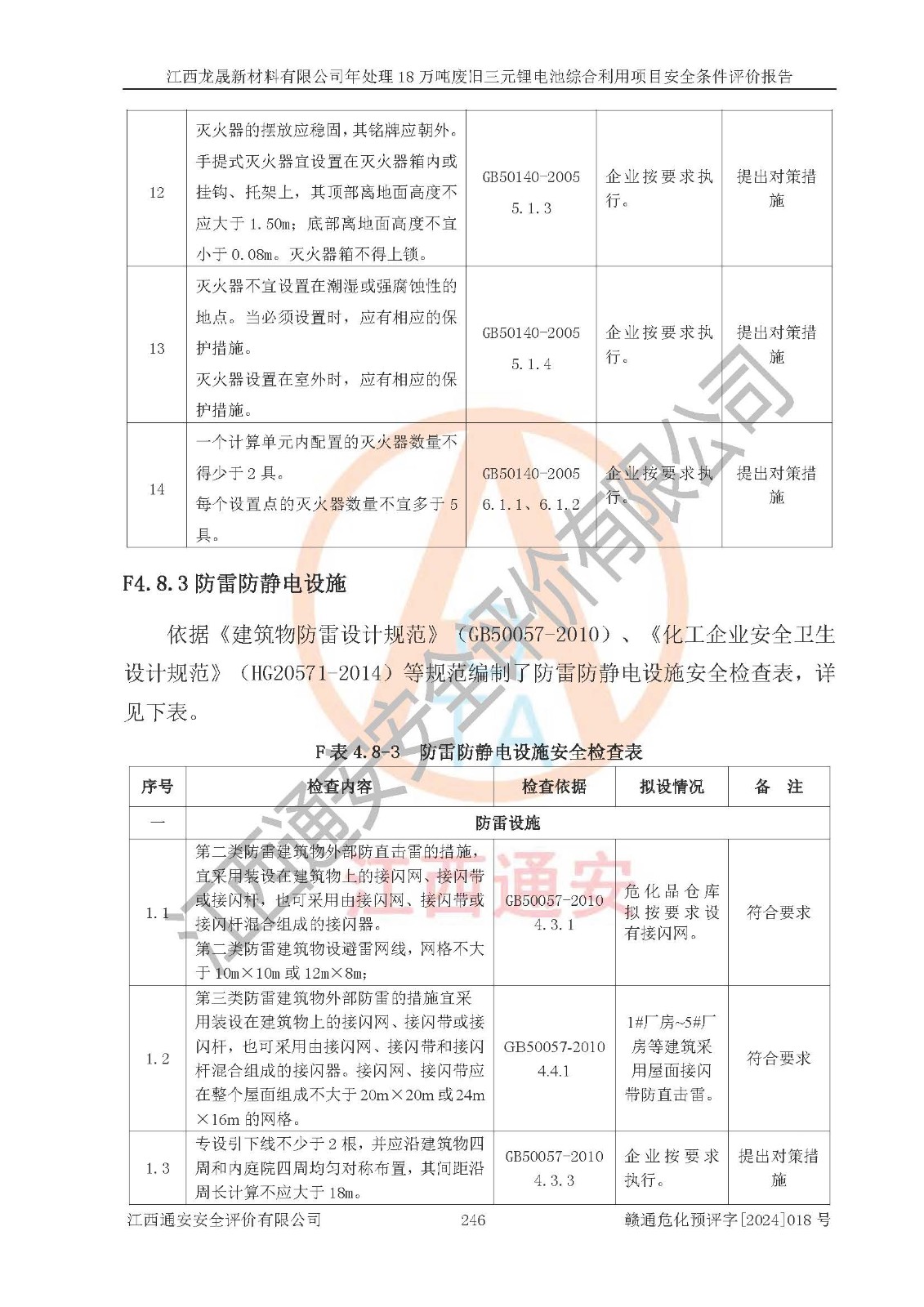 评价结论 | 江西龙晟新材料有限公司年处理18万吨废旧三元锂电池综合利用项目在以后的初步设计、施工图设计和建设施工、安装调试及生产运行中,如能严格执行**有关安全生产的法律法规、规章、标准、规范,认真落实项目可行性研究报告提出的安全对策措施,并合理采纳本报告中提出的安全对策措施及建议,真正做到安全设施与主体工程同时设计、同时施工、同时投入生产和使用,则工程潜在的危险、有害因素可得到**控制,风险在**控制和可接受范围内。 | |||