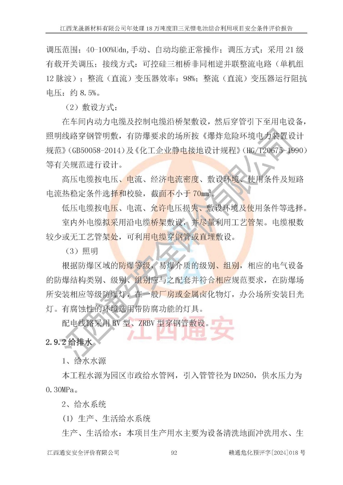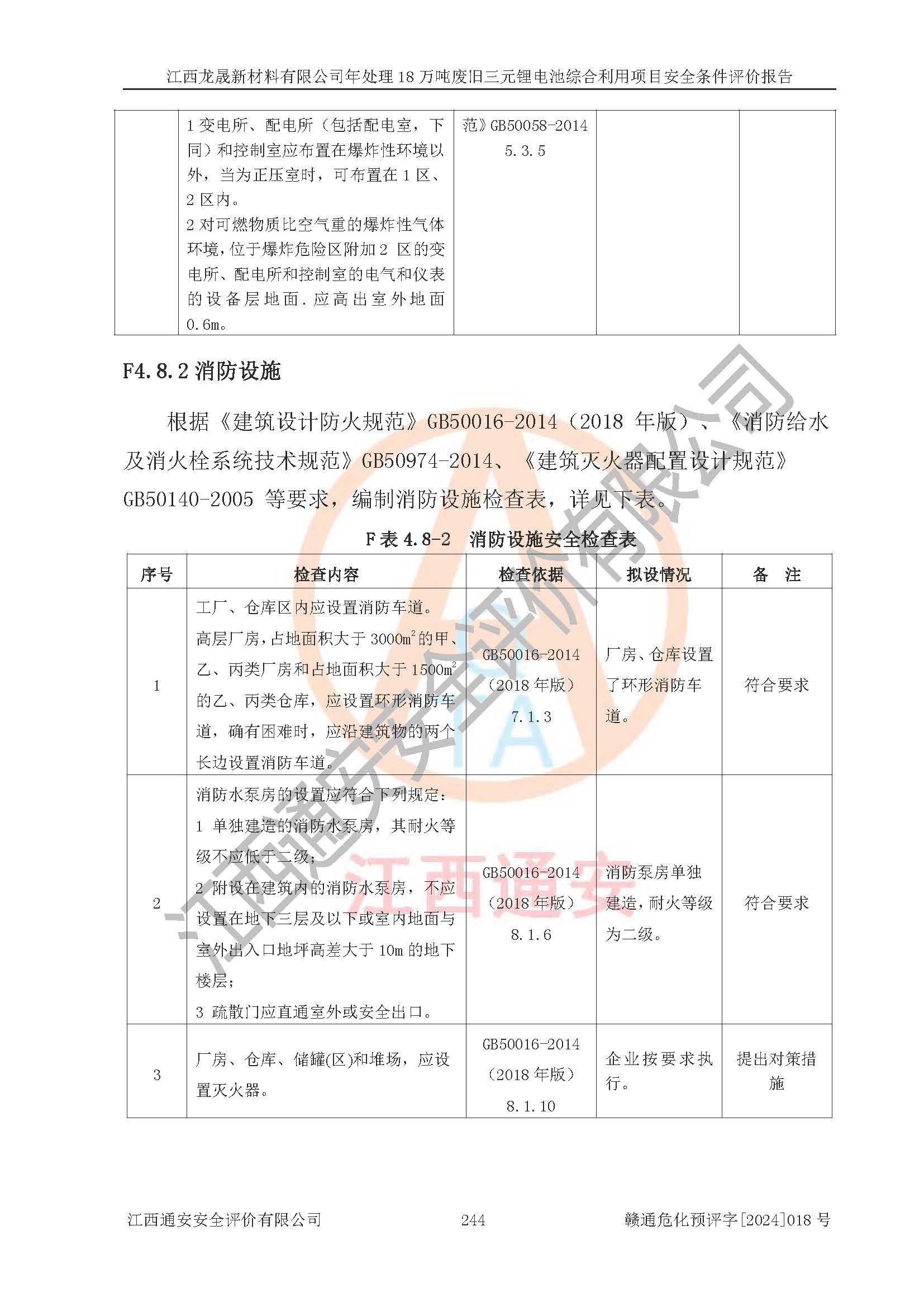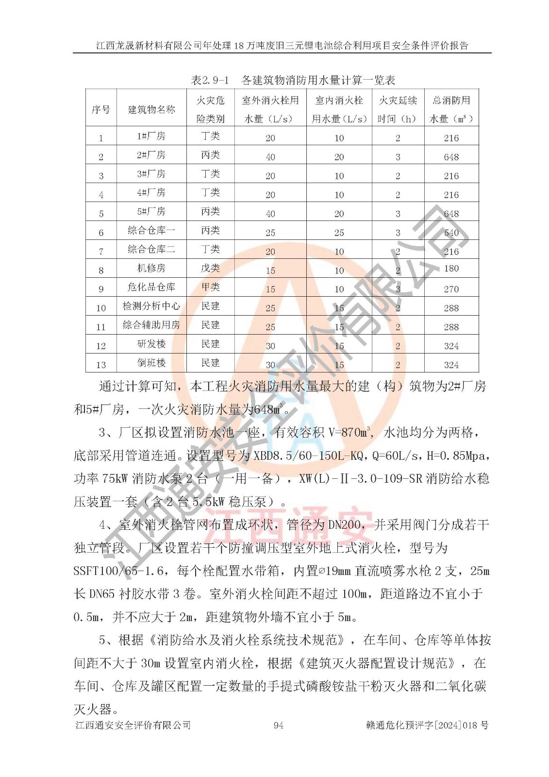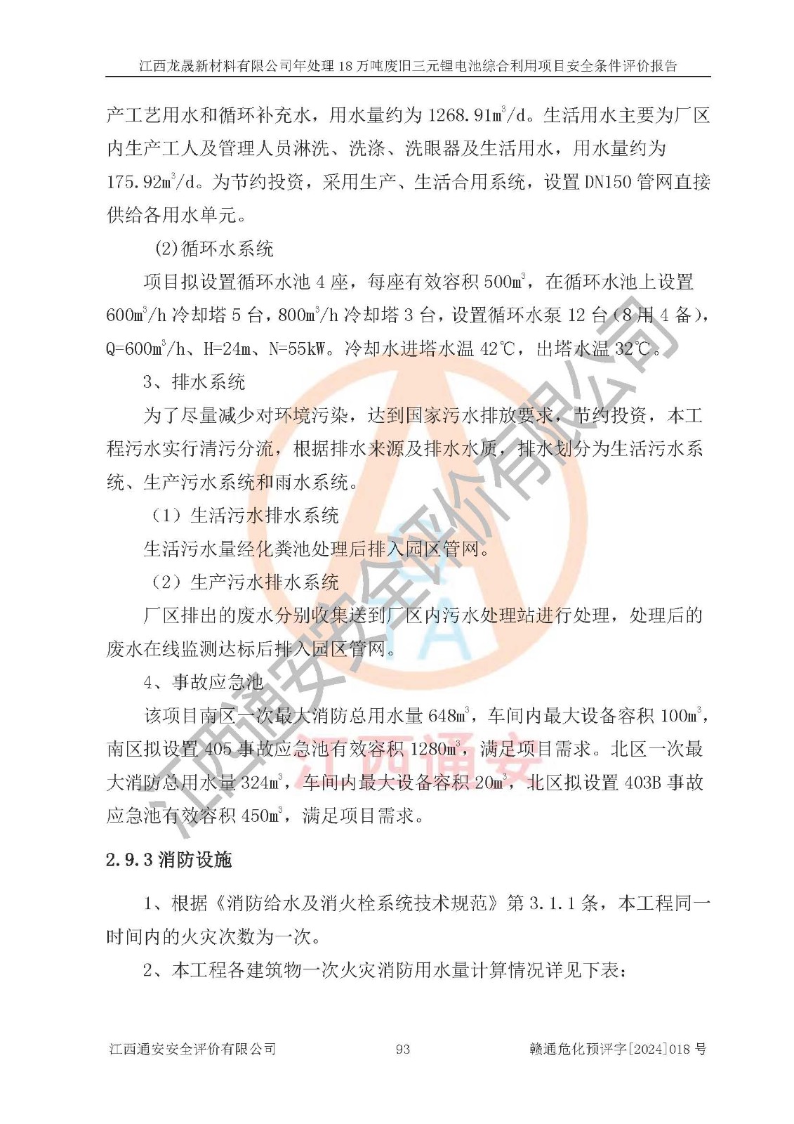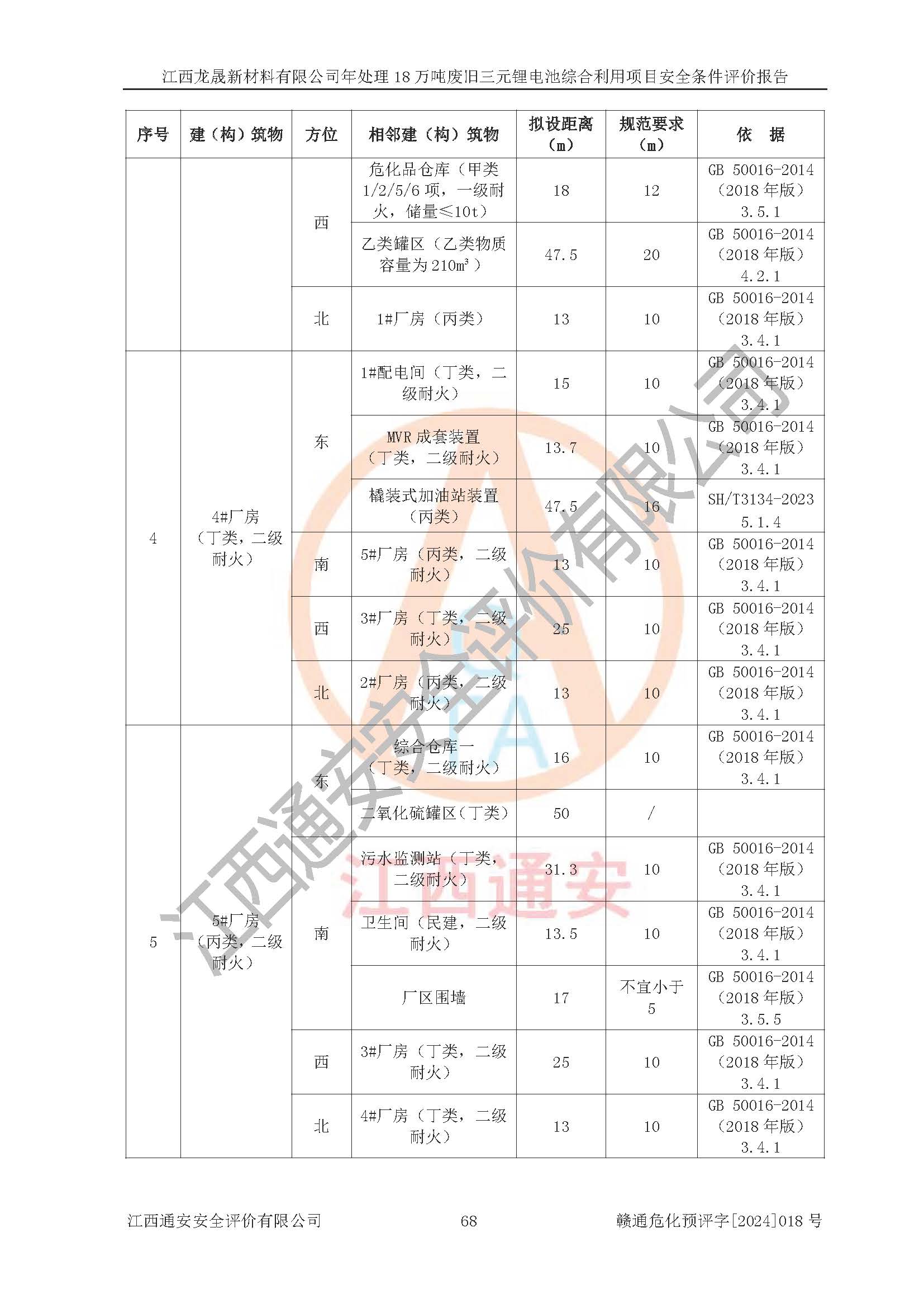 评价结论 | 江西龙晟新材料有限公司年处理18万吨废旧三元锂电池综合利用项目在以后的初步设计、施工图设计和建设施工、安装调试及生产运行中,如能严格执行**有关安全生产的法律法规、规章、标准、规范,认真落实项目可行性研究报告提出的安全对策措施,并合理采纳本报告中提出的安全对策措施及建议,真正做到安全设施与主体工程同时设计、同时施工、同时投入生产和使用,则工程潜在的危险、有害因素可得到**控制,风险在**控制和可接受范围内。 | |||