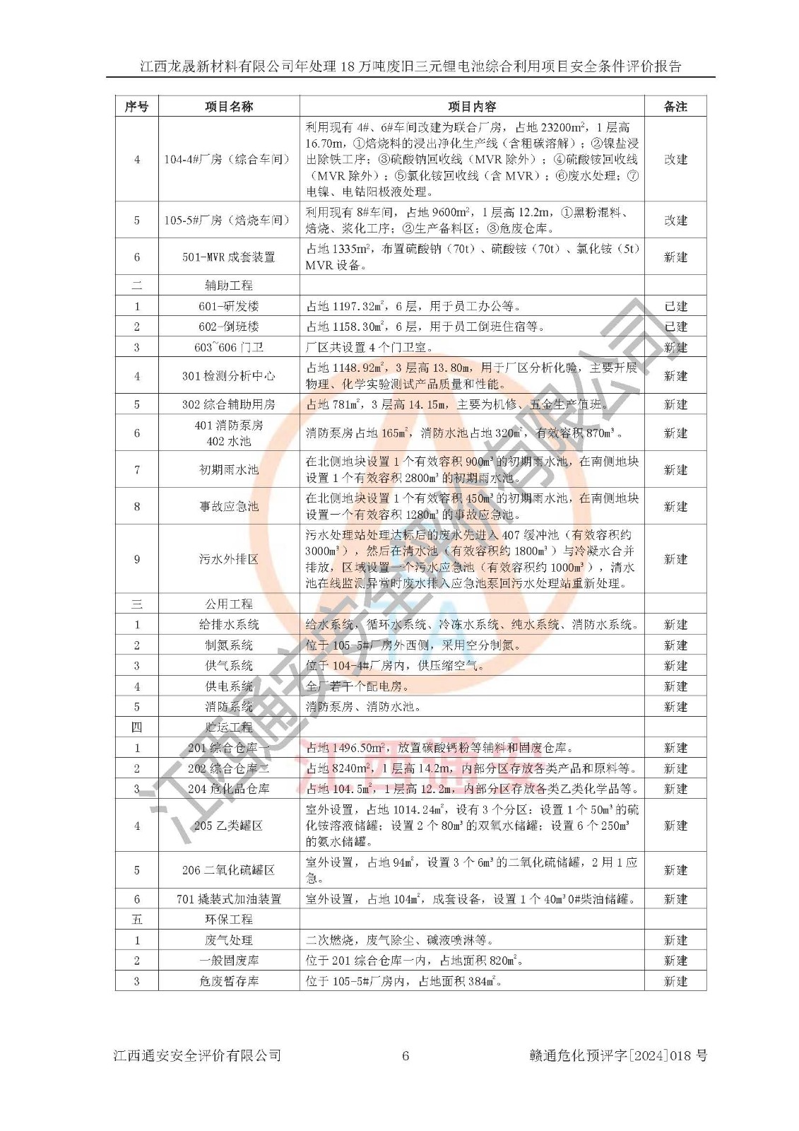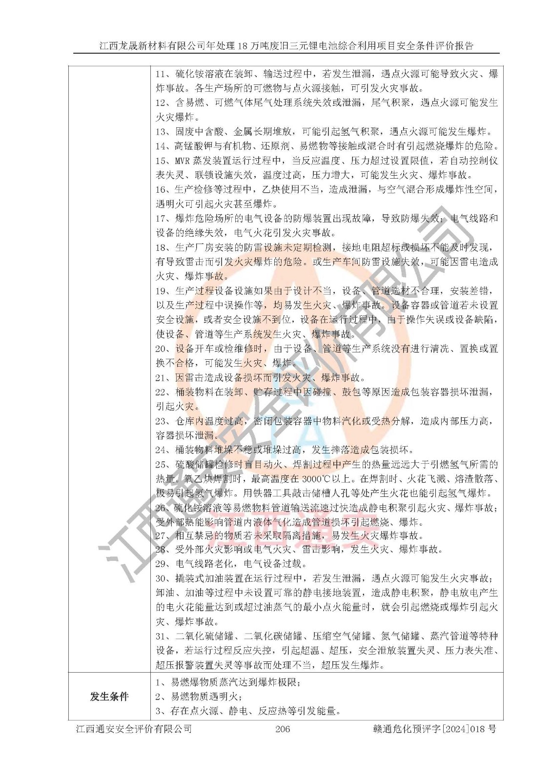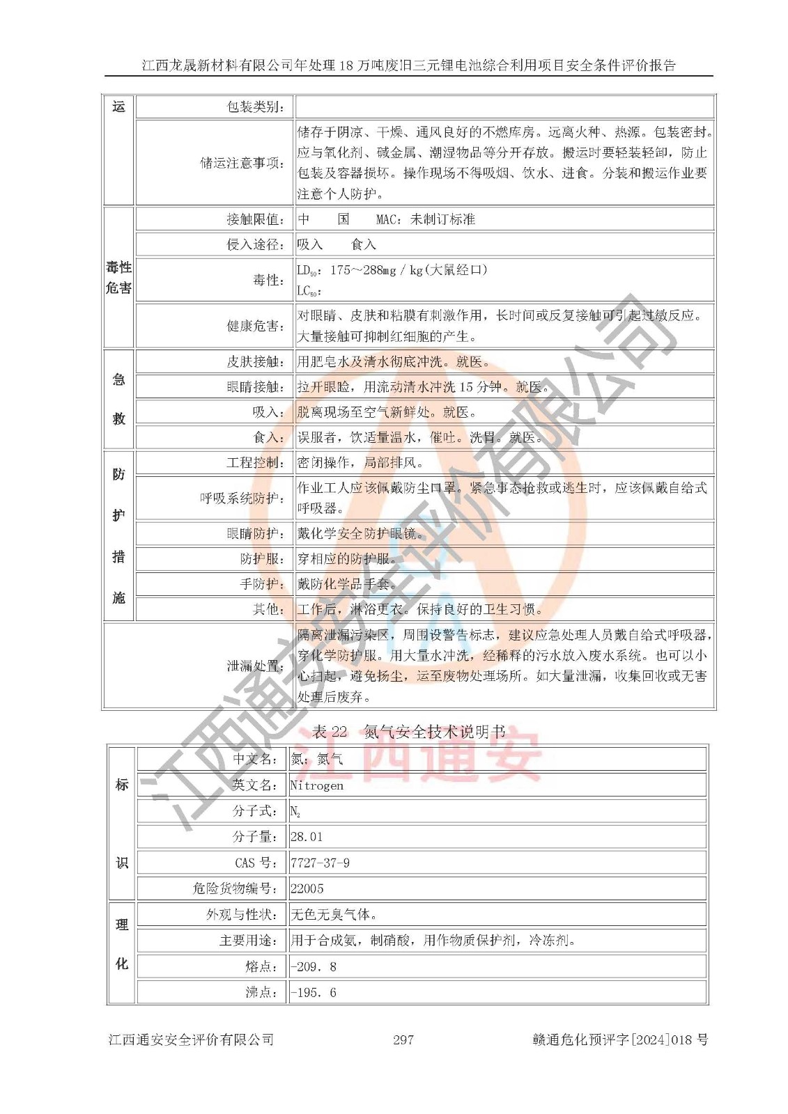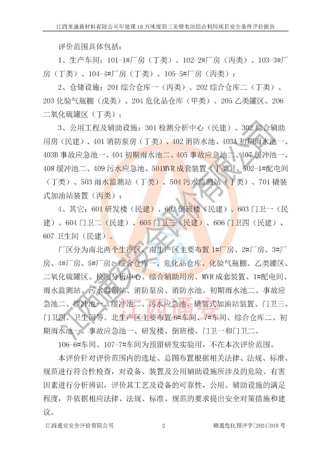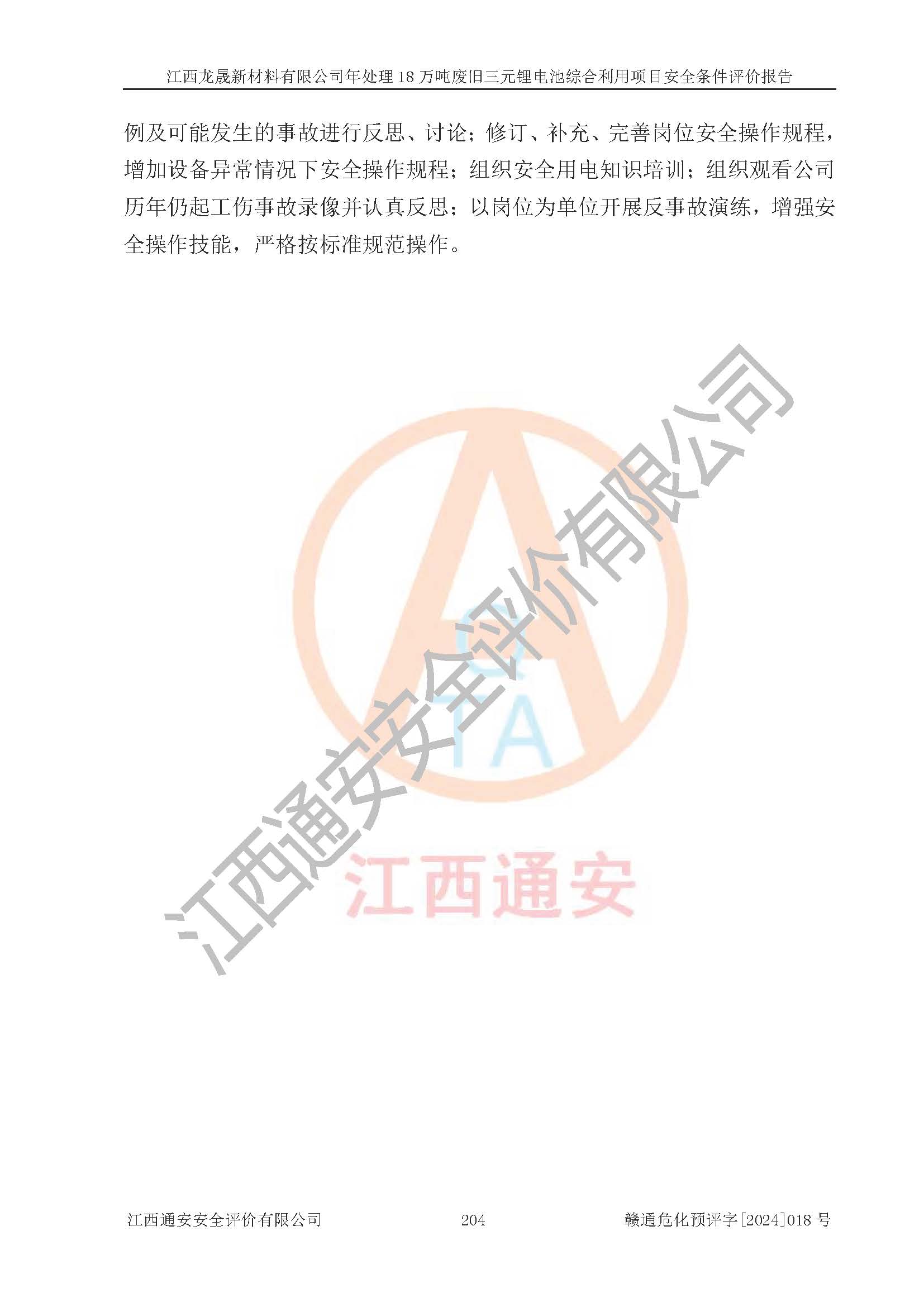 评价报告名称 | 江西龙晟新材料有限公司年处理18万吨废旧三元锂电池综合利用项目安全条件评价报告 | |||