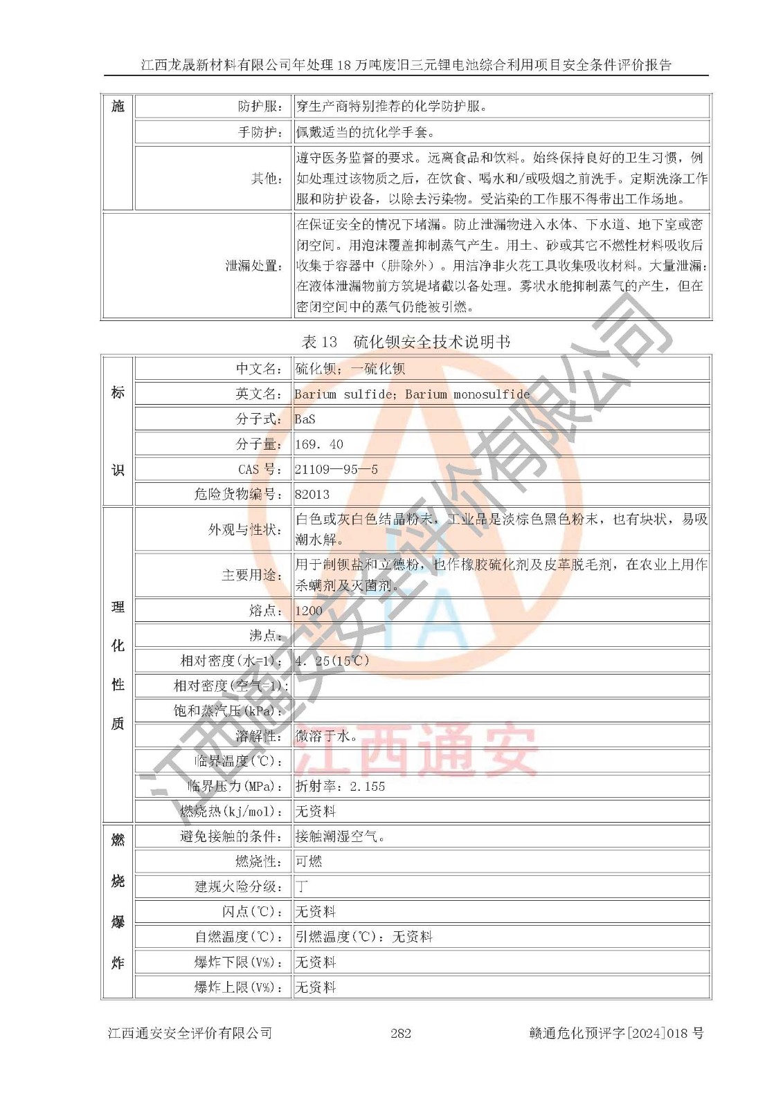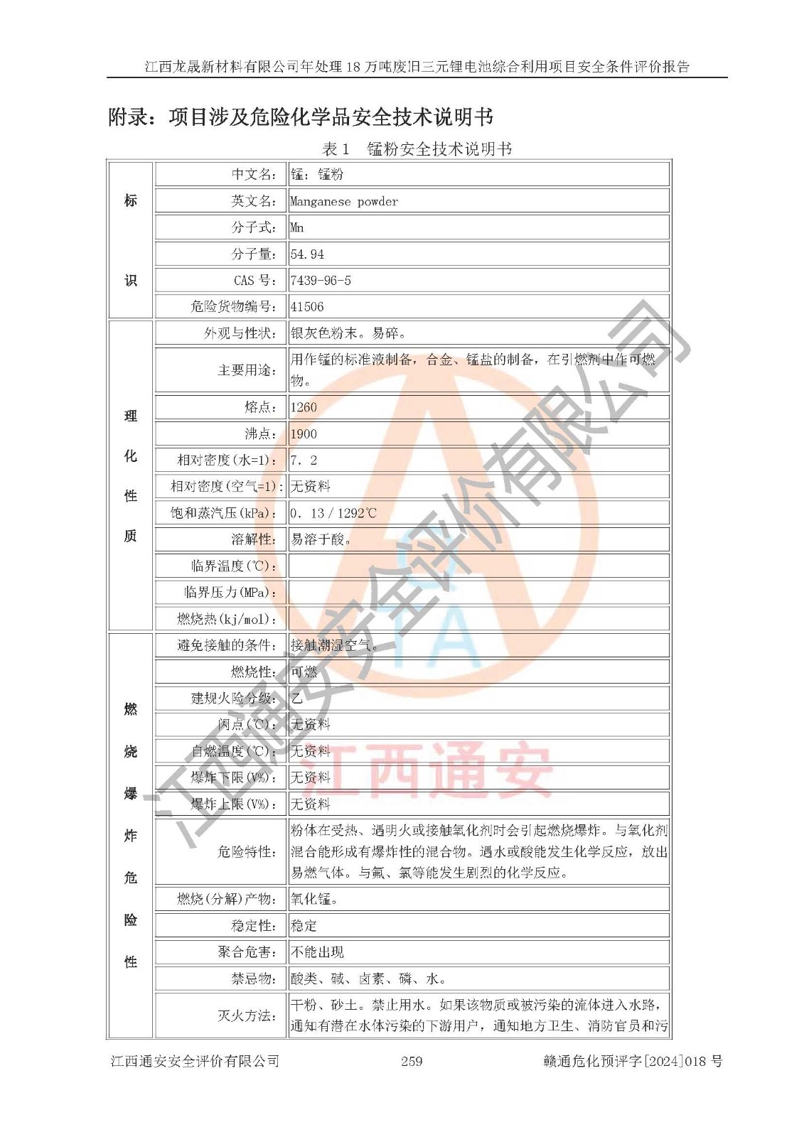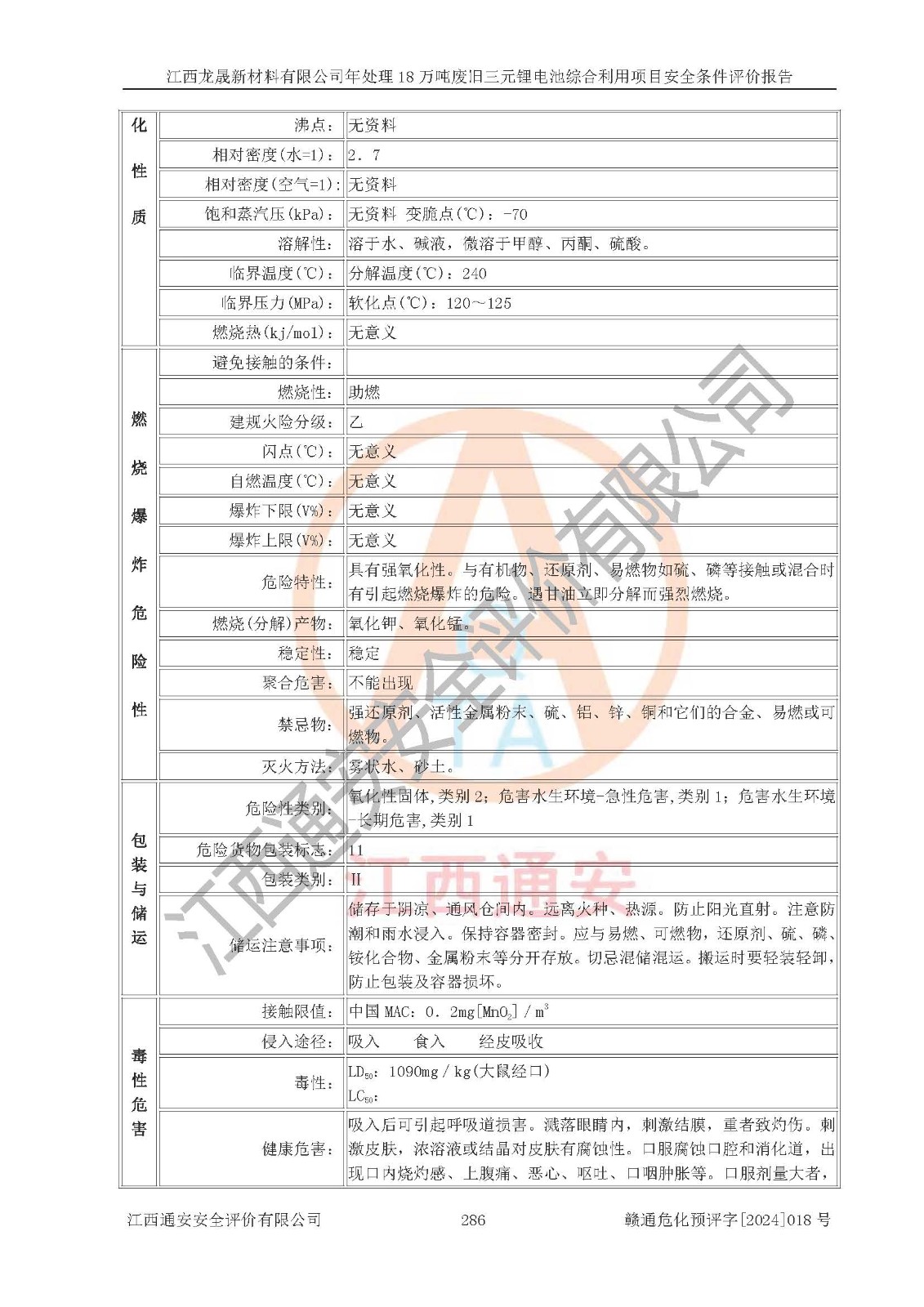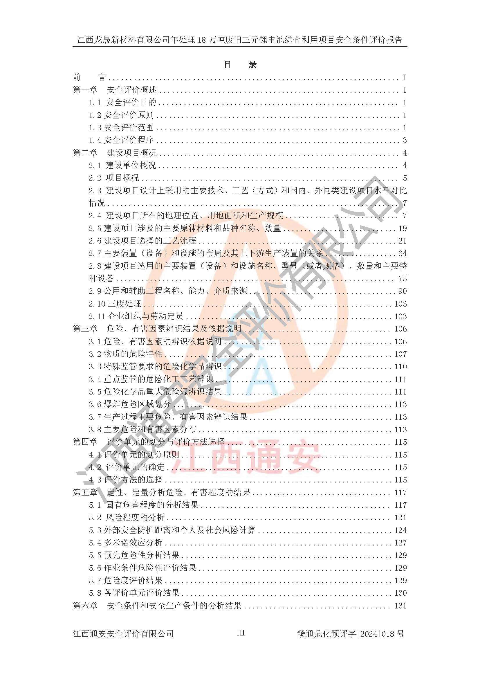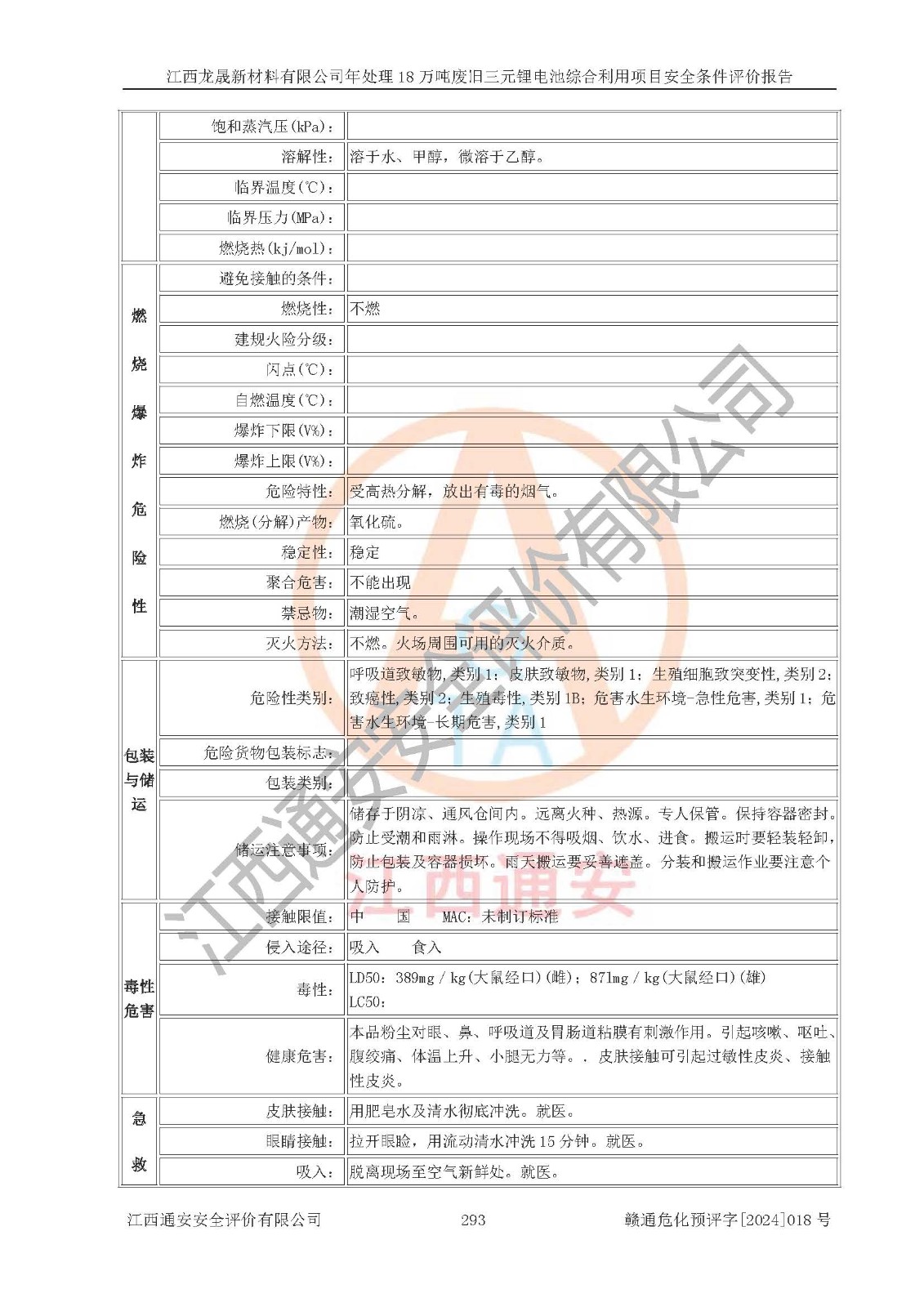 评价报告名称 | 江西龙晟新材料有限公司年处理18万吨废旧三元锂电池综合利用项目安全条件评价报告 | |||