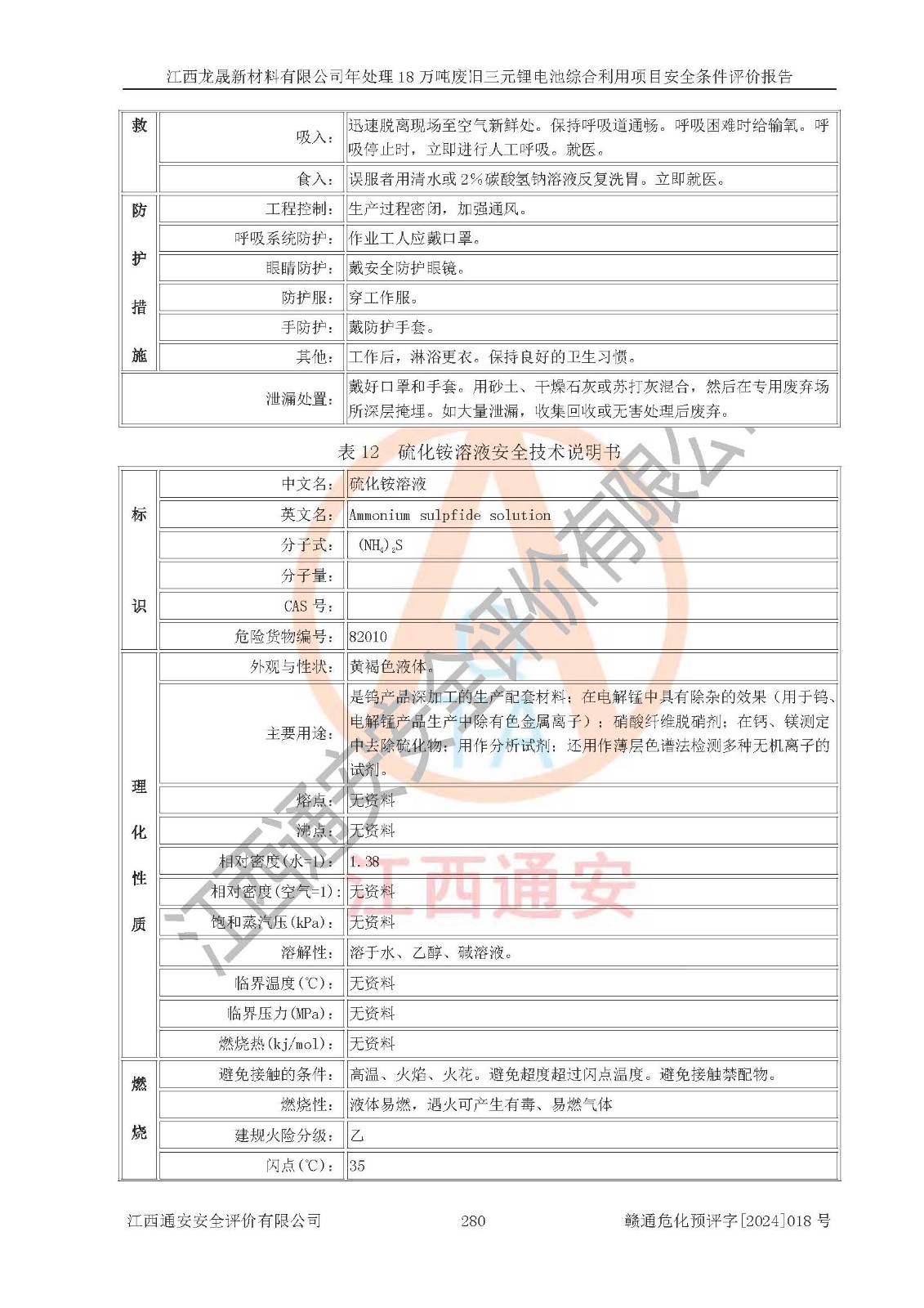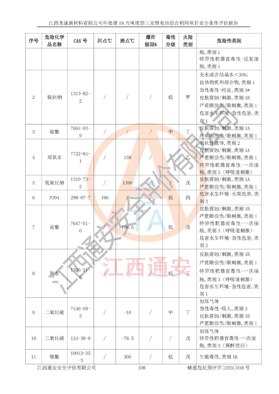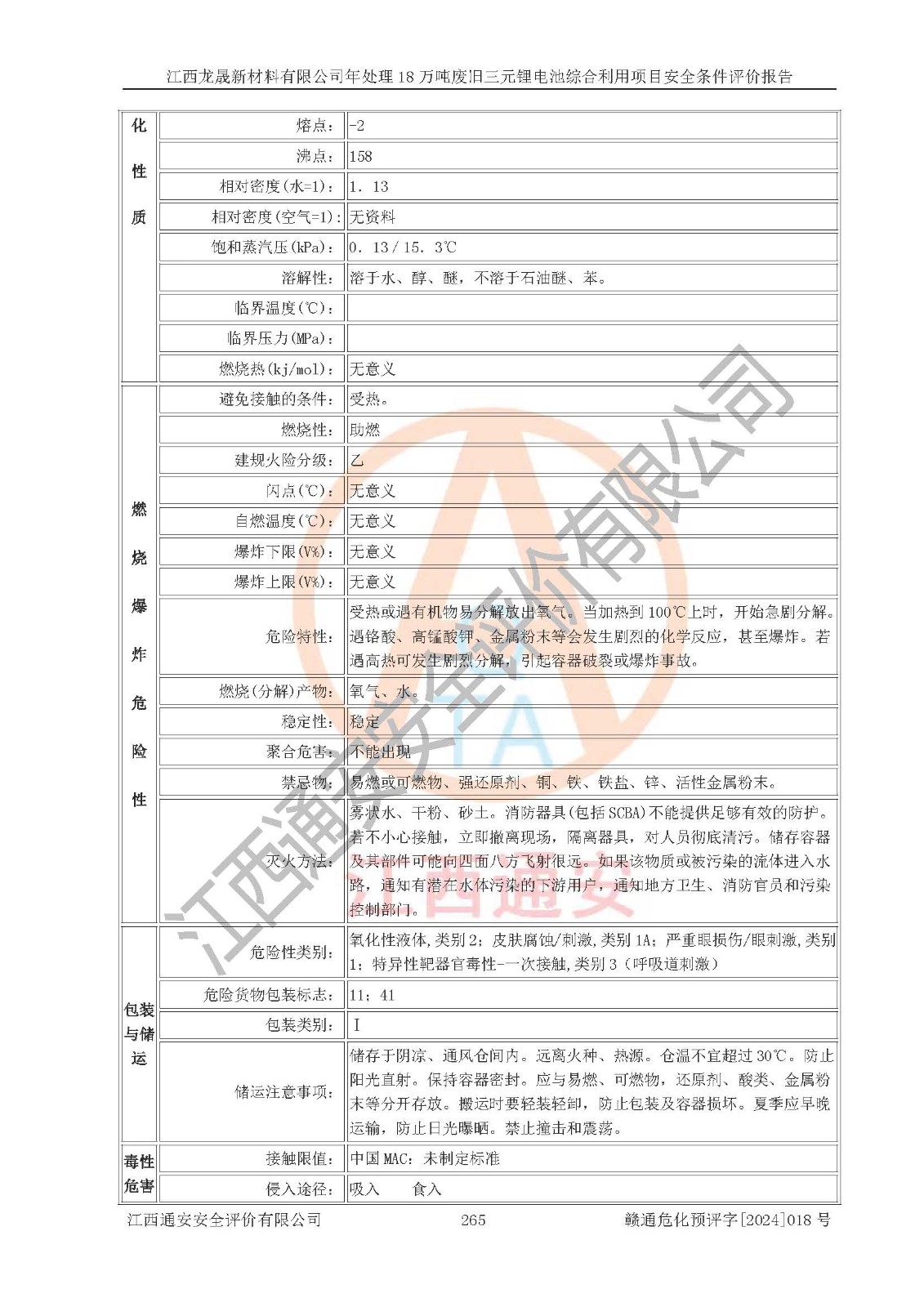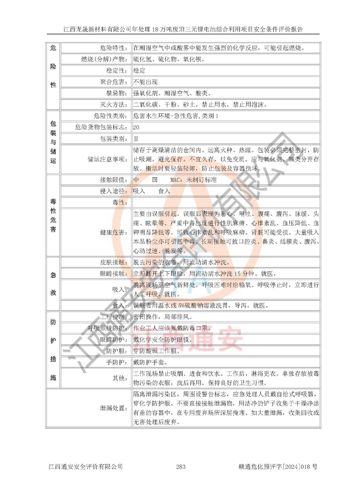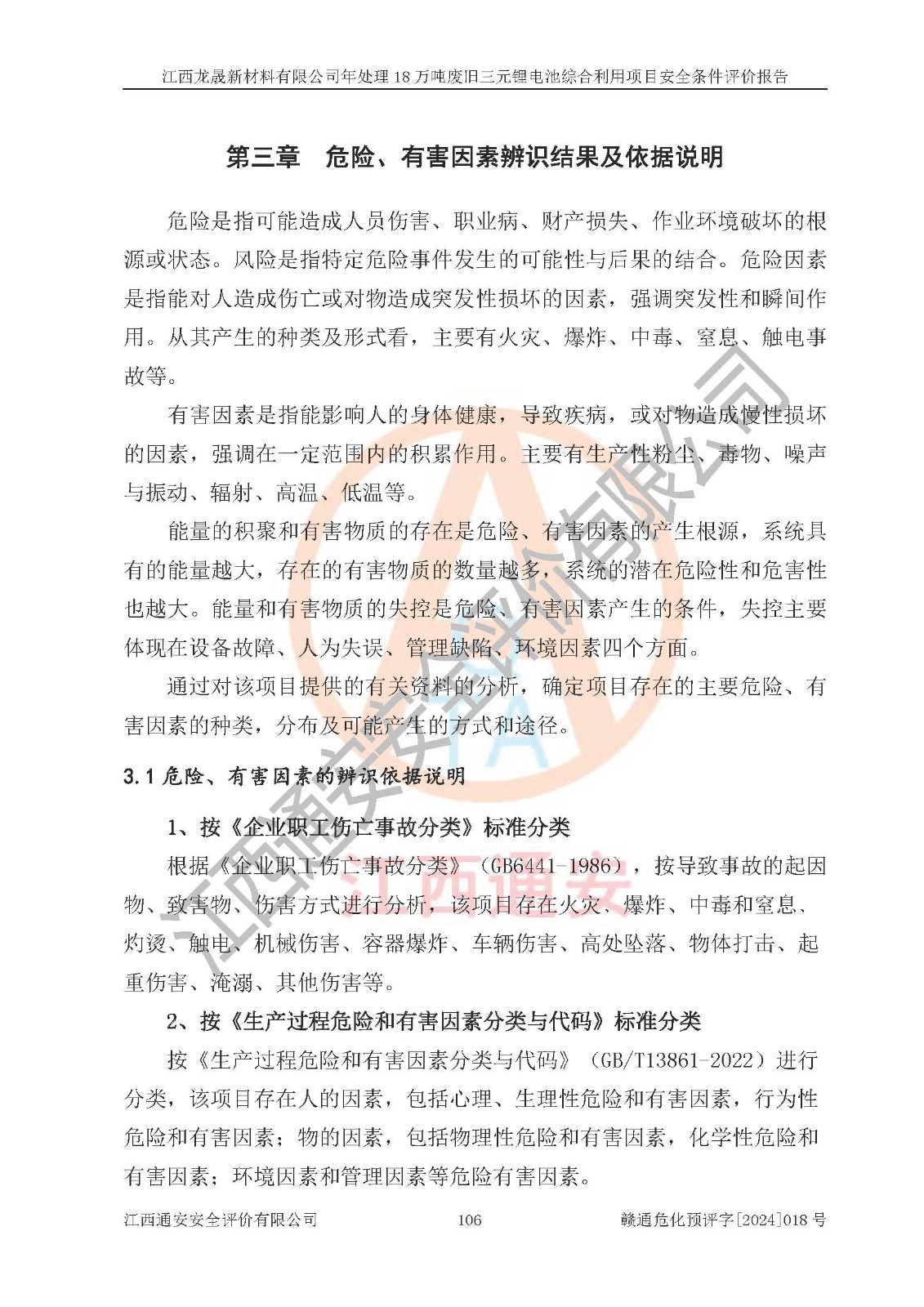 评价报告名称 | 江西龙晟新材料有限公司年处理18万吨废旧三元锂电池综合利用项目安全条件评价报告 | |||
