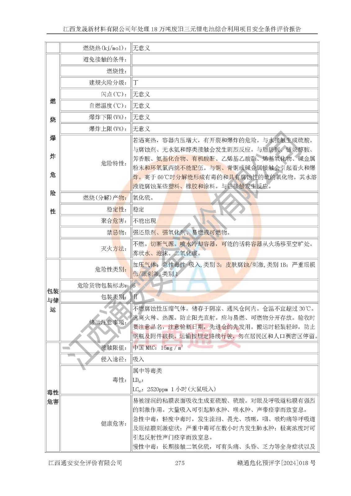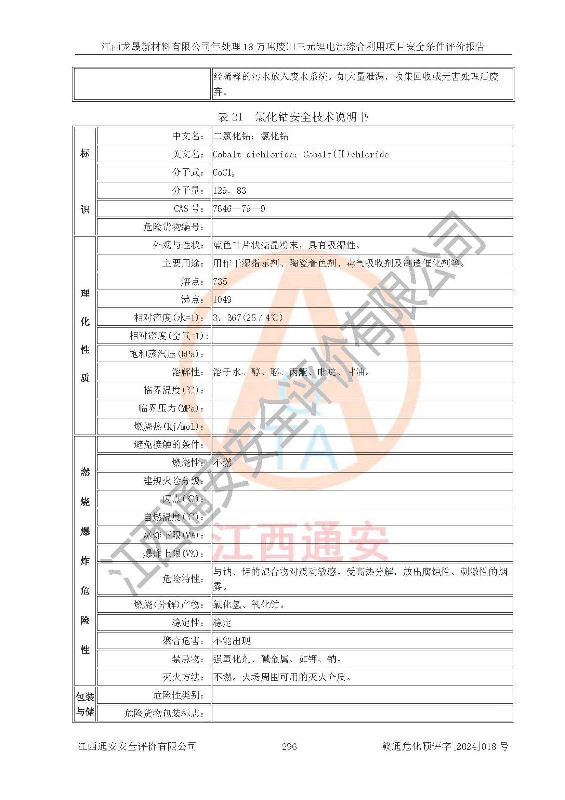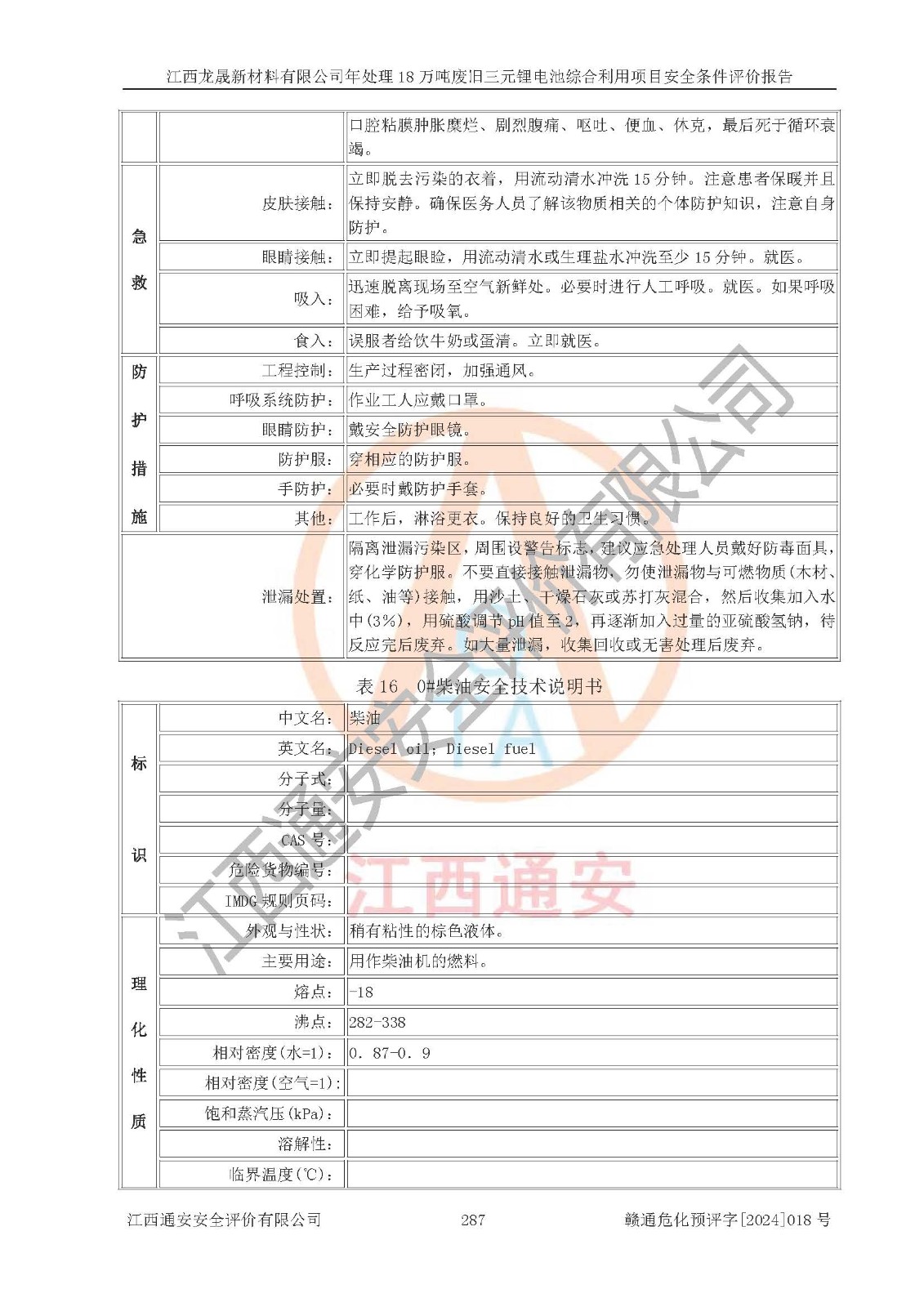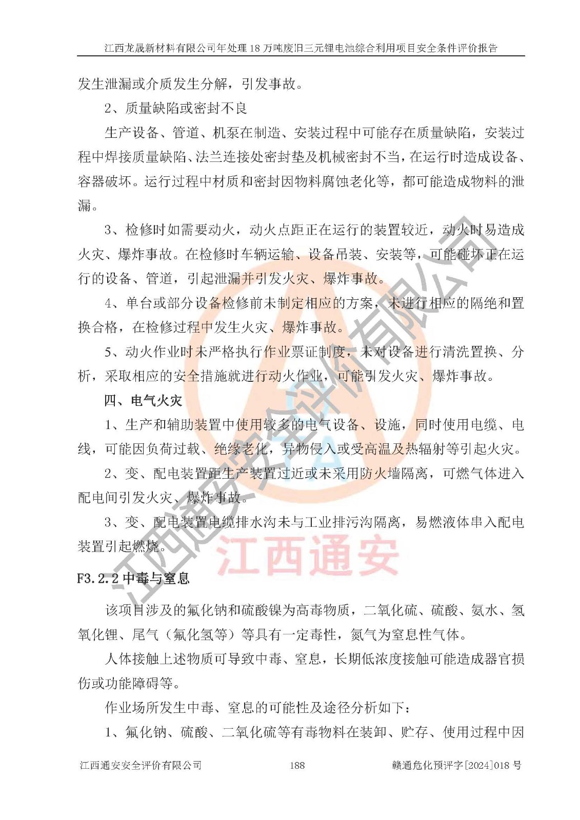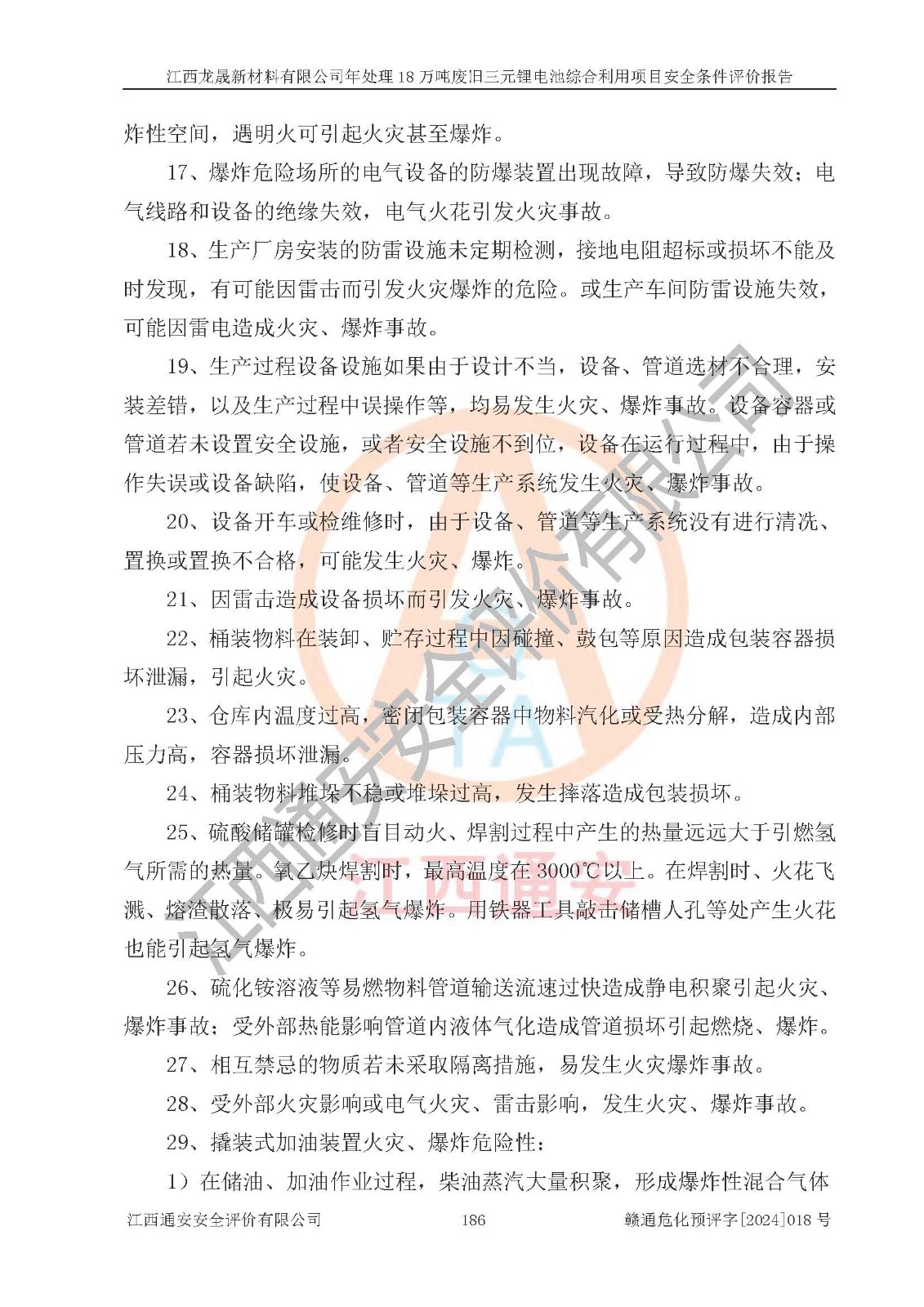 评价报告名称 | 江西龙晟新材料有限公司年处理18万吨废旧三元锂电池综合利用项目安全条件评价报告 | |||