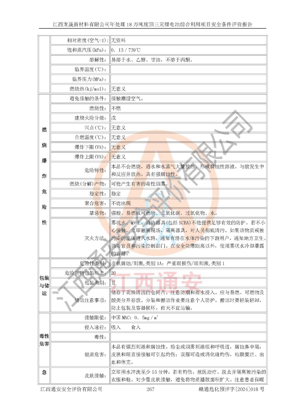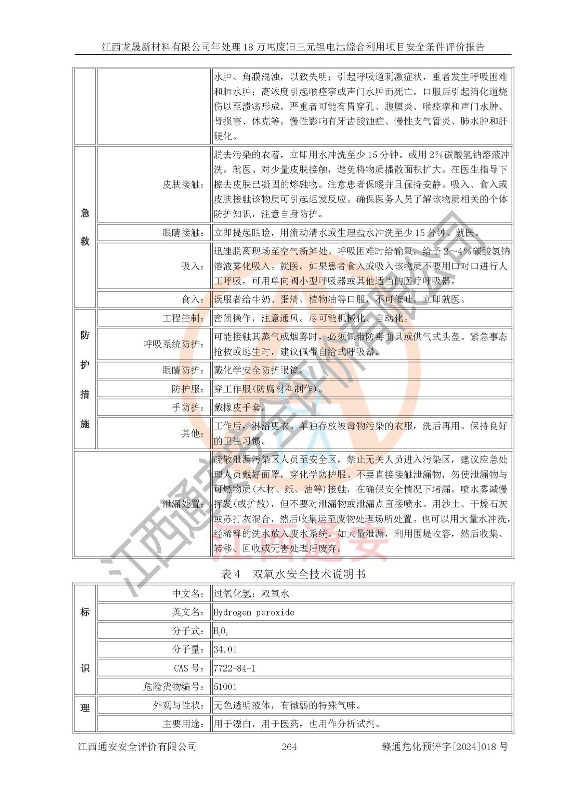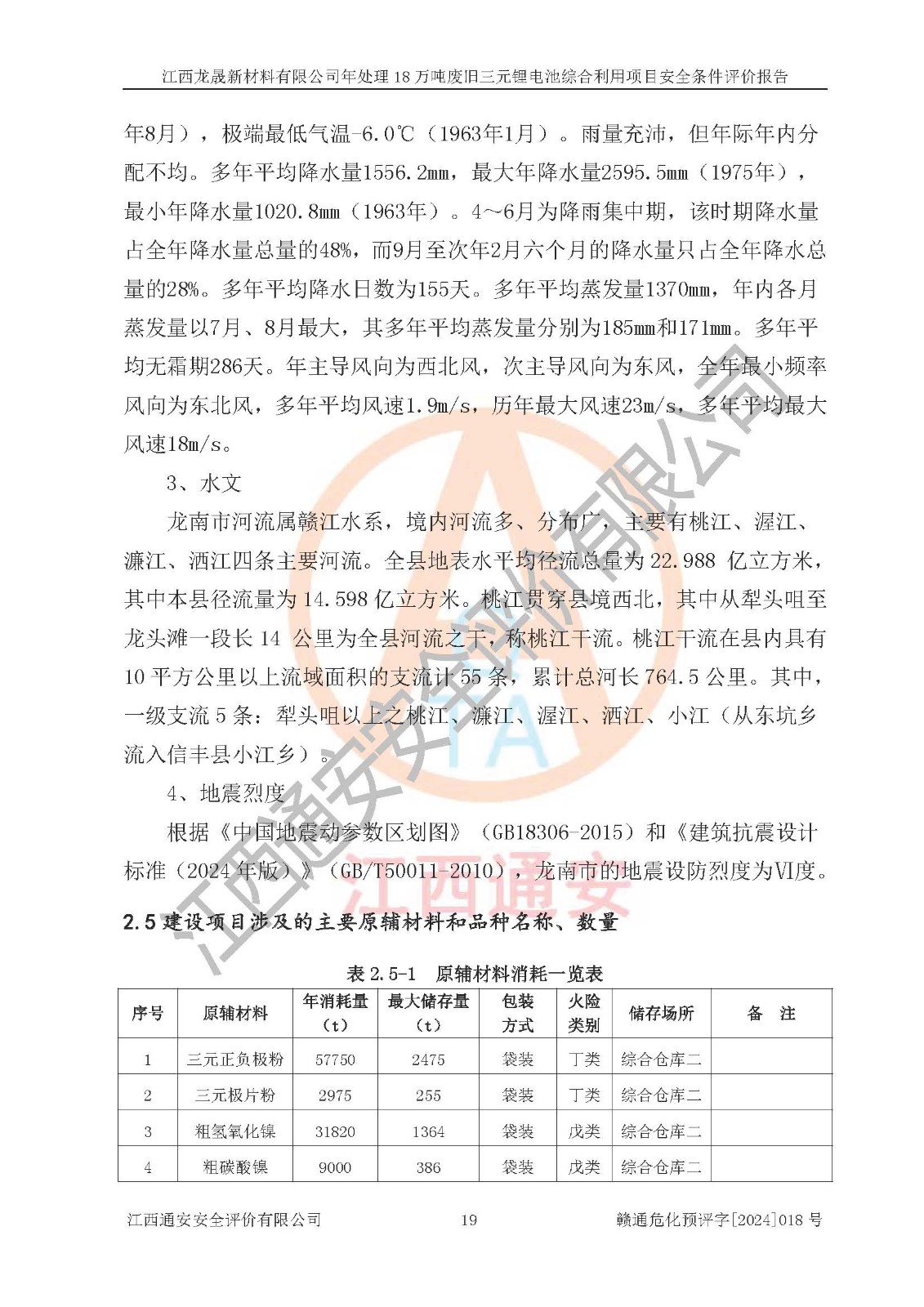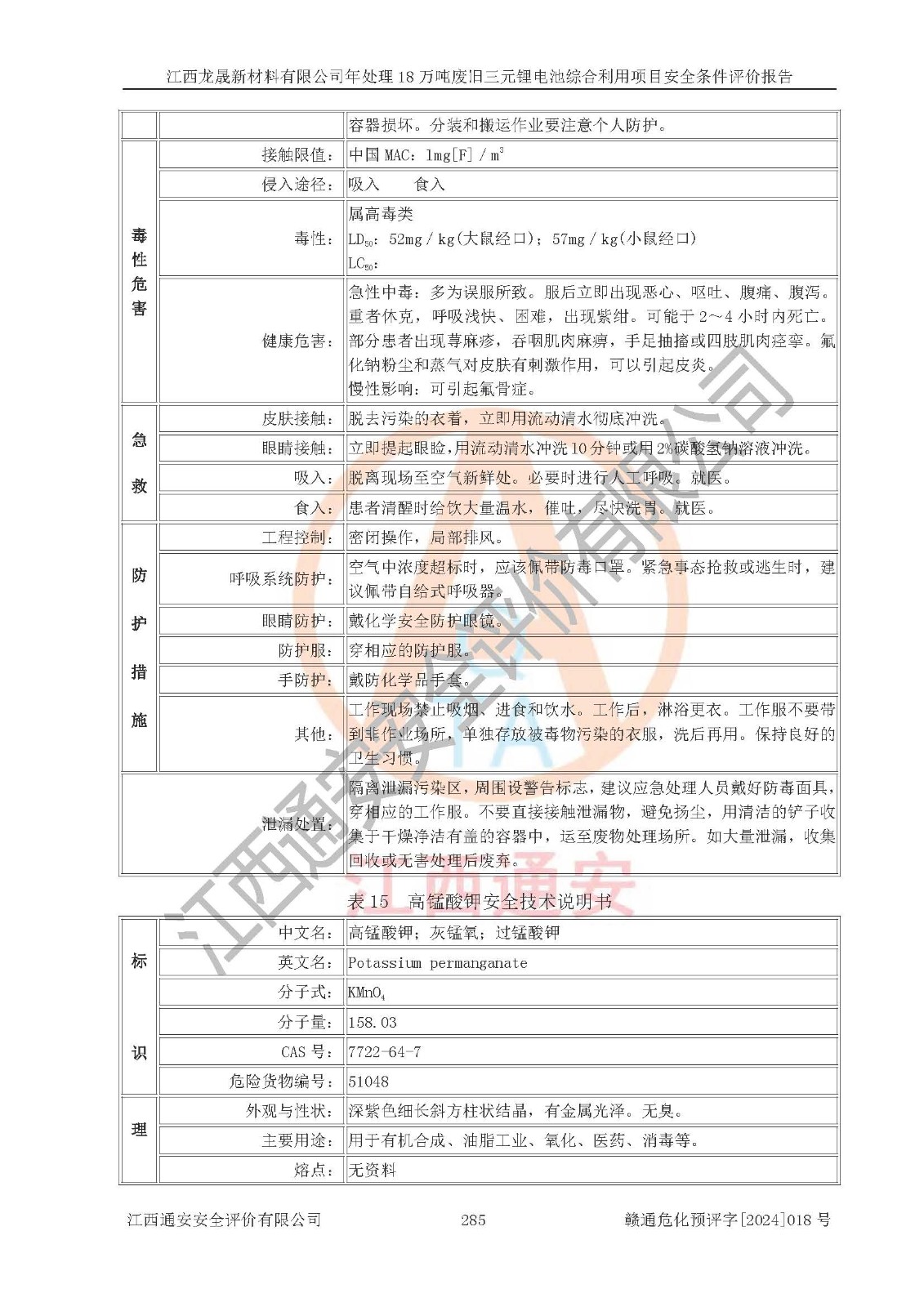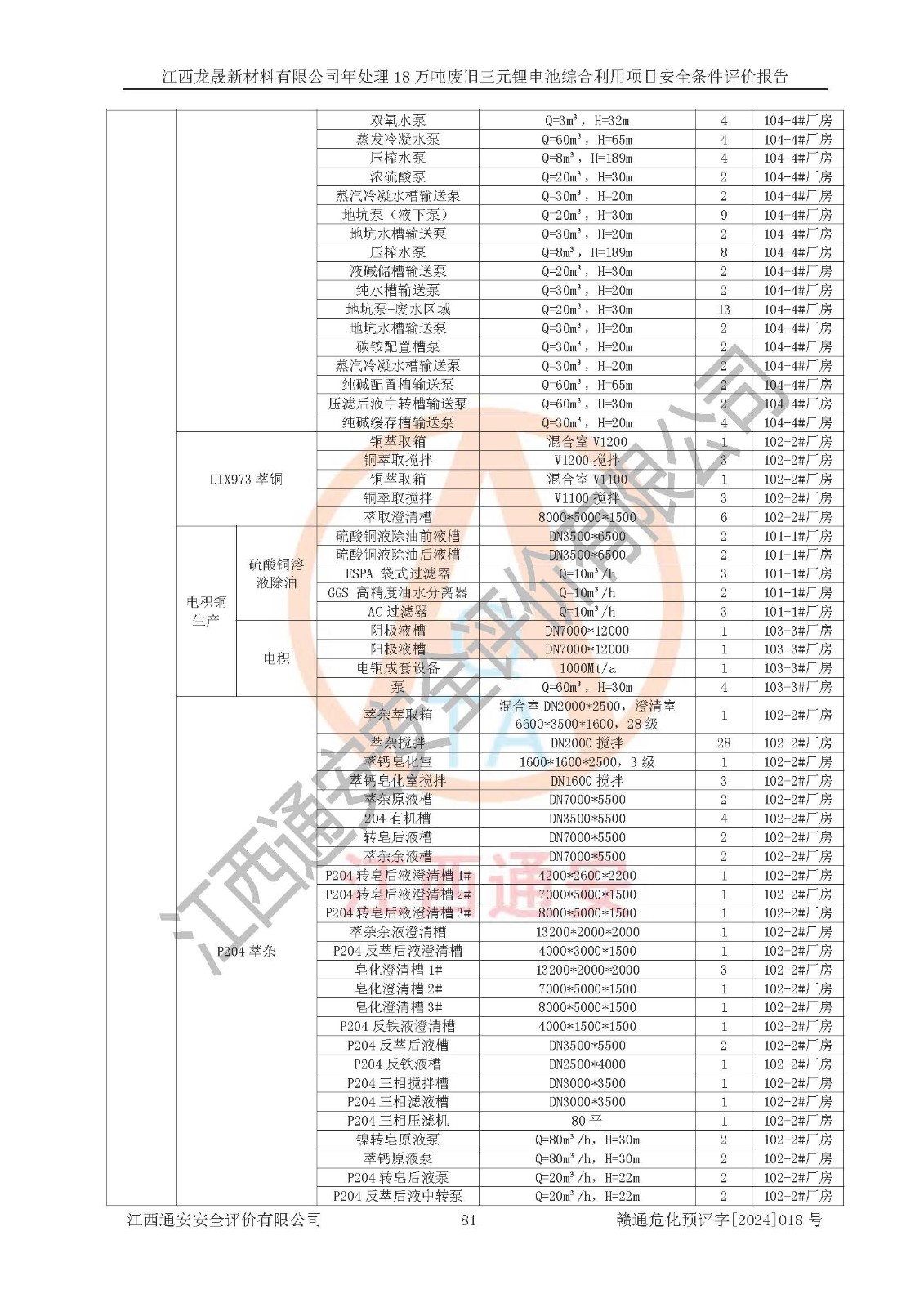 评价报告名称 | 江西龙晟新材料有限公司年处理18万吨废旧三元锂电池综合利用项目安全条件评价报告 | |||