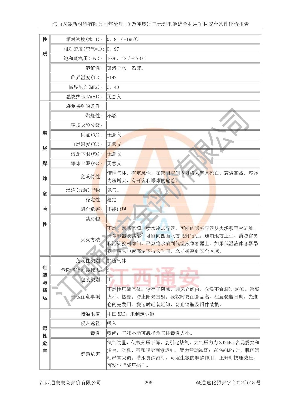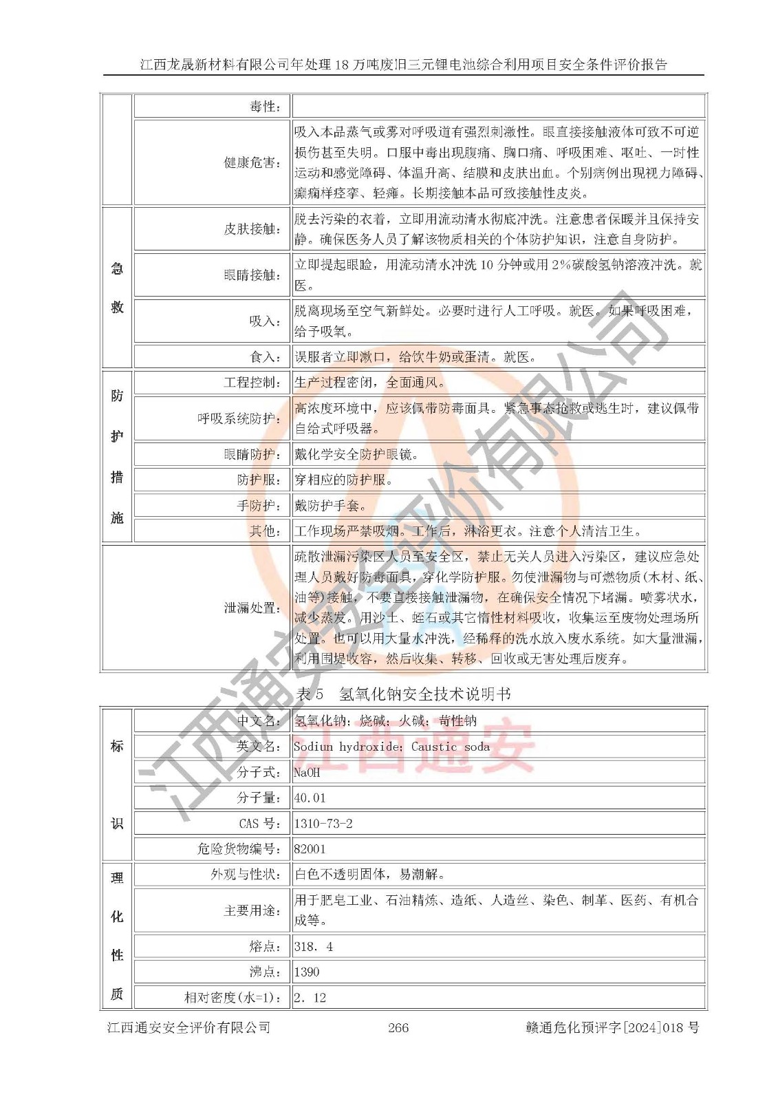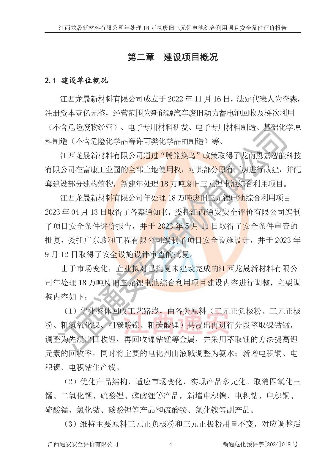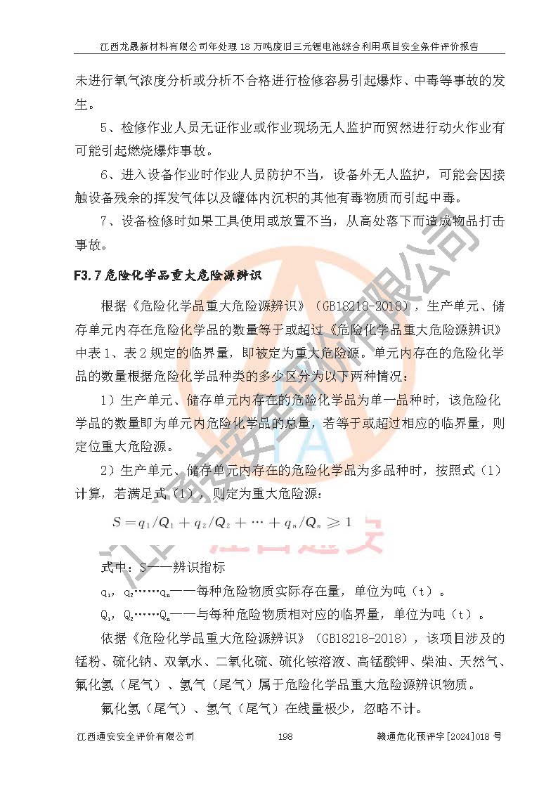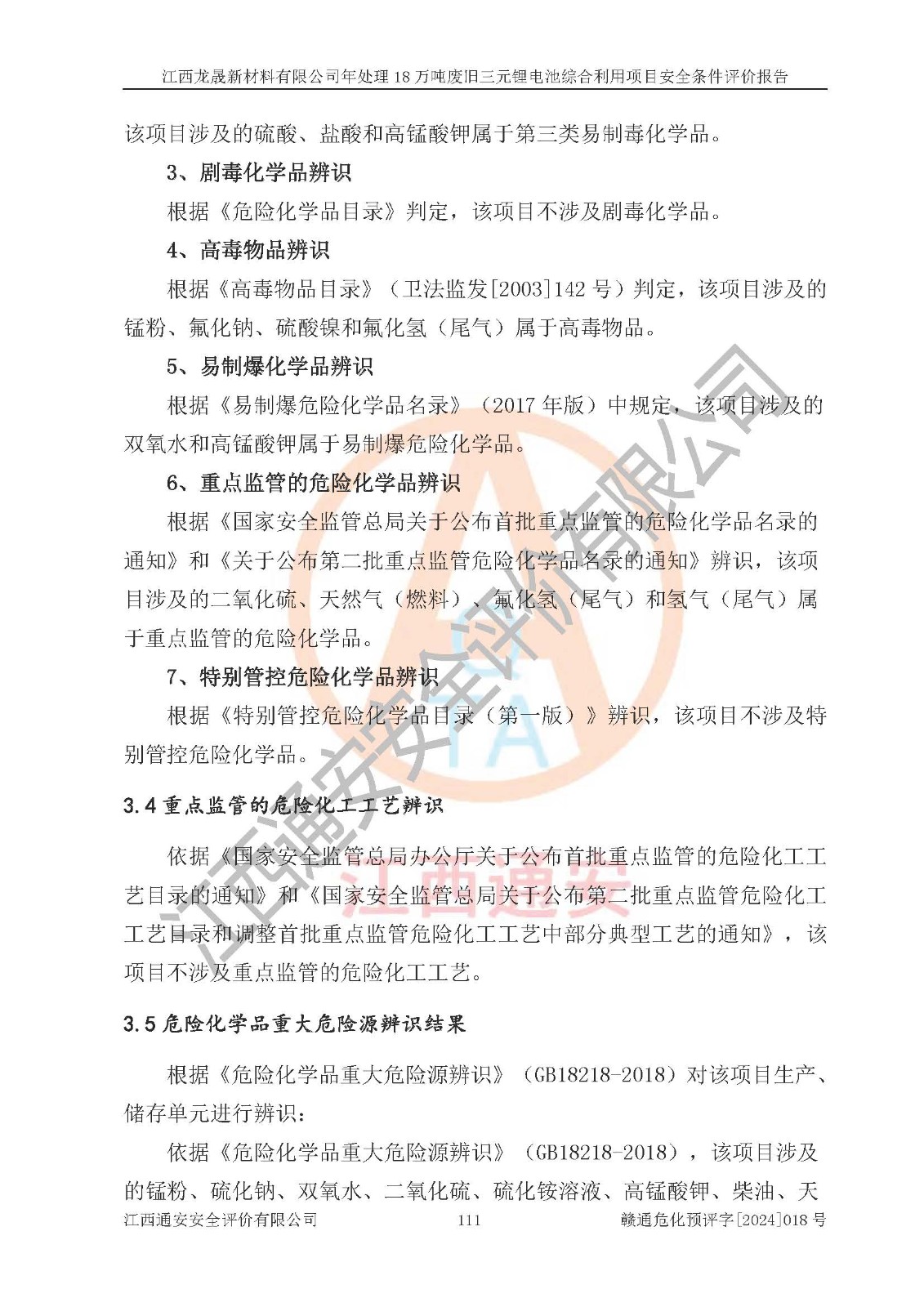 评价报告名称 | 江西龙晟新材料有限公司年处理18万吨废旧三元锂电池综合利用项目安全条件评价报告 | |||