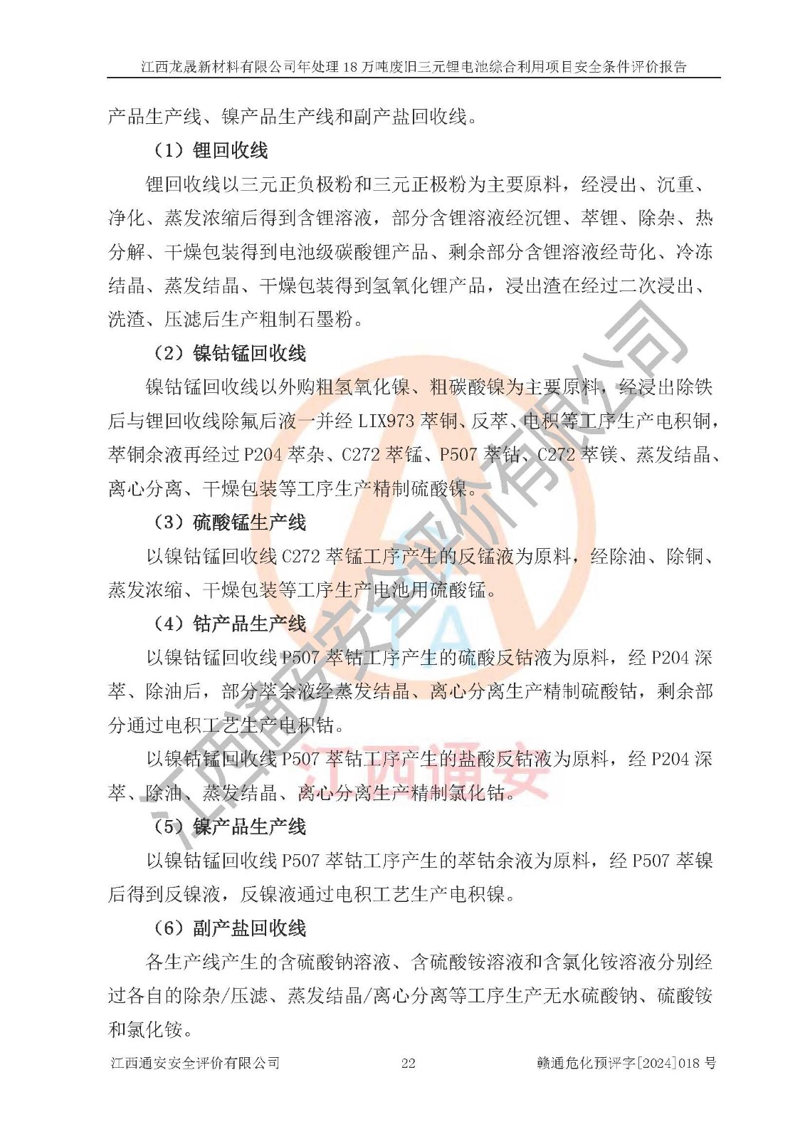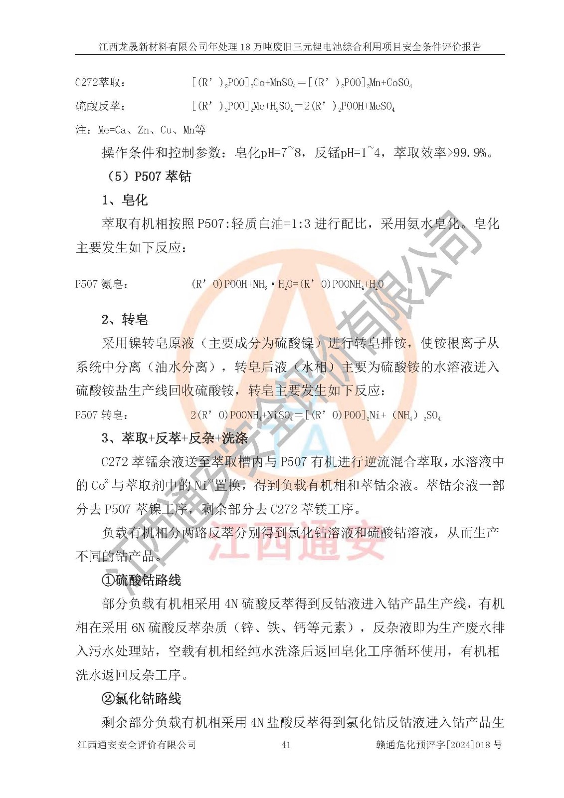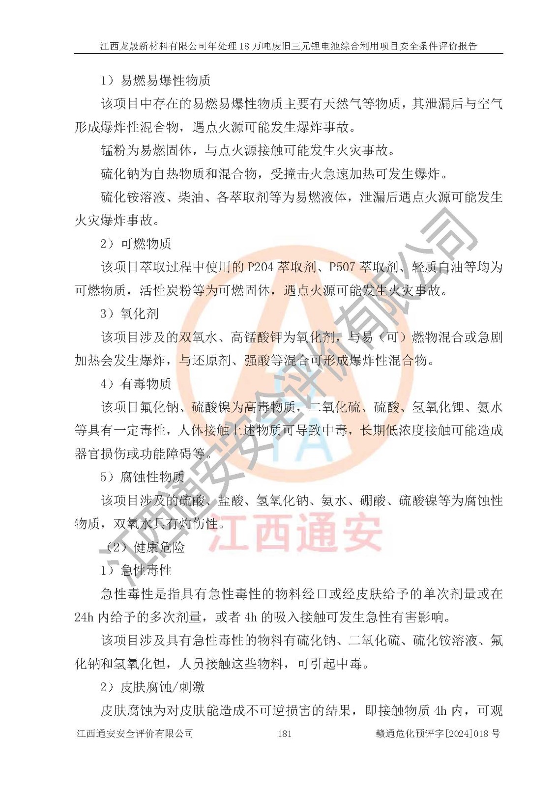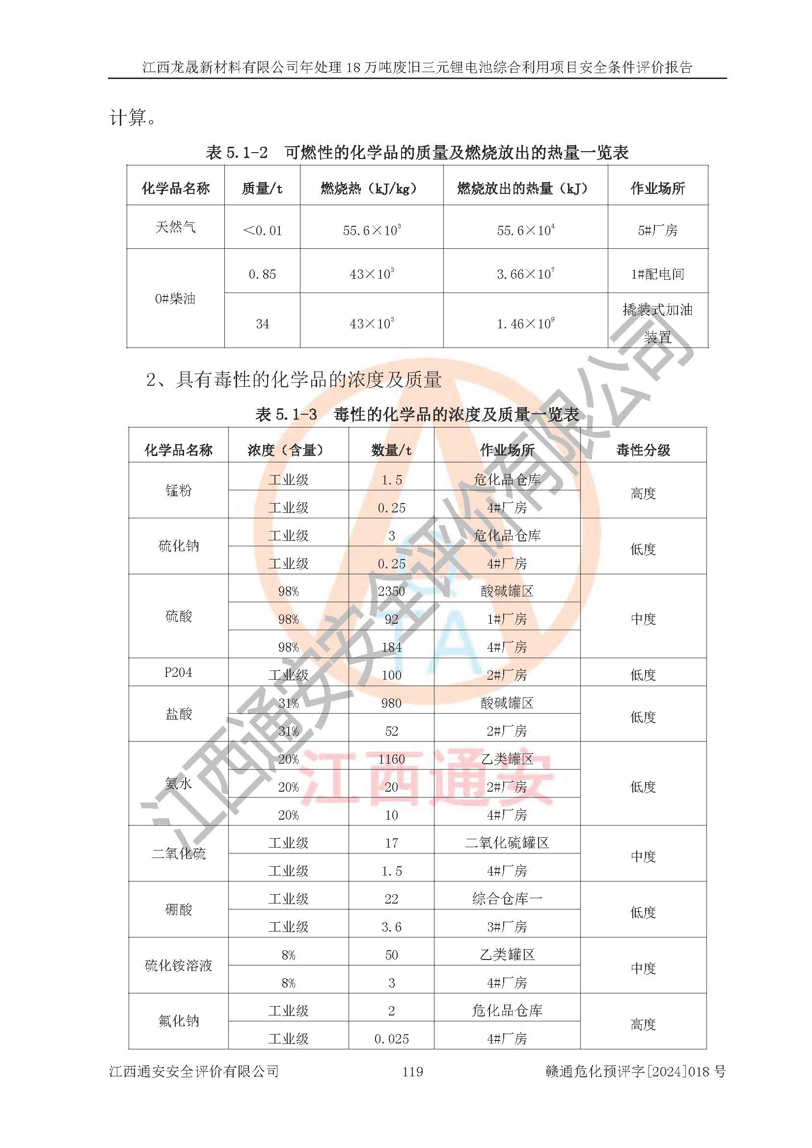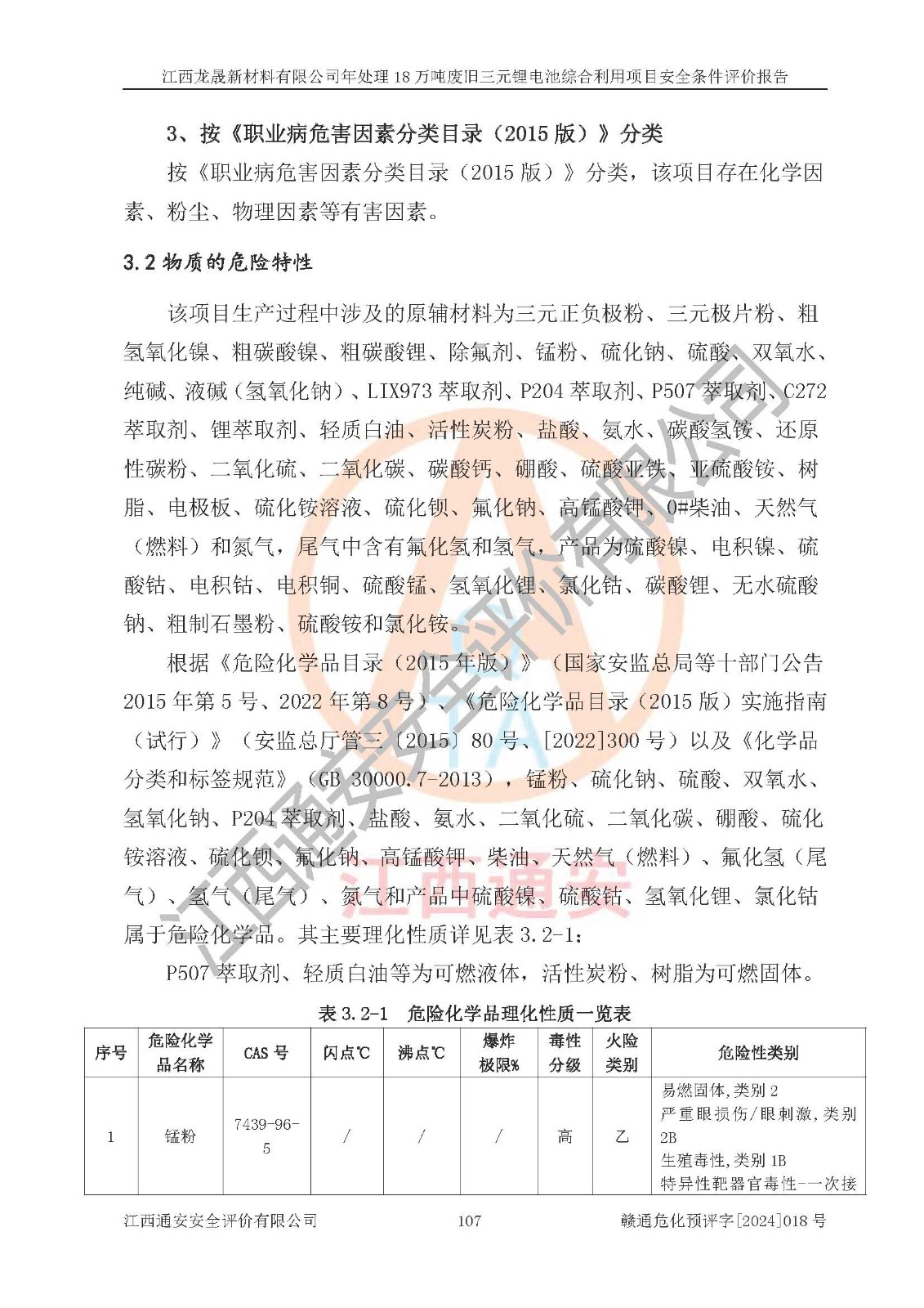 项目简介 | 江西龙晟新材料有限公司(以下简称龙晟新材料公司)成立于2022年11月16日,法定**人为李森,注册资本壹亿元整,经营范围为新能源汽车废旧动力蓄电池回收及梯次利用(不含危险废物经营)、电子**材料研发、电子**材料制造、基础化学原料制造(不含危险化学品等许可类化学品的制造)等。 江西龙晟新材料有限公司年处理18万吨废旧三元锂电池综合利用项目2023年4月3日取得了建设用地规划许可证,2023年04月13日取得了备案通知书,委托江西通安安全评价有限公司编制了项目安全条件评价报告,并于2023年5月11日取得了安全条件审查的批复,委托广东政和工程有限公司编制了项目安全设施设计,并于2023年9月12日取得了安全设施设计审查的批复。依据《危险化学品建设项目安全监督管理办法》和《江西省应急管理厅关于印发<江西省危险化学品建设项目安全监督管理实施细则>(试行)的通知》等规定,因建设项目的工艺路线、产品方案及规模等发生重大变化,建设单位应当重新进行安全评价。 江西龙晟新材料有限公司2024年09月25日对年处理18万吨废旧三元锂电池综合利用项目备案文件进行了变更,建设地点位于龙南经济技术开发区富康工业园,厂址属于省级认定的化工集中区。该项目生产过程中涉及使用的原辅材料有三元正负极粉、三元极片粉、粗氢氧化镍、粗碳酸镍、粗碳酸锂、除氟剂、锰粉、硫化钠、硫酸、双氧水、纯碱、液碱(氢氧化钠)、LIX973萃取剂、P204萃取剂、P507萃取剂、C272萃取剂、锂萃取剂、轻质白油、活性炭粉、盐酸、氨水、碳酸氢铵、还原性碳粉、二氧化硫、二氧化碳、碳酸钙、硼酸、硫酸亚铁、亚硫酸铵、树脂、电极板、硫化铵溶液、硫化钡、氟化钠、高锰酸钾、柴油、天然气(燃料)和氮气,尾气中含有氟化氢和氢气,产品为硫酸镍、电积镍、硫酸钴、电积钴、电积铜、硫酸锰、氢氧化锂、氯化钴、碳酸锂、无水硫酸钠、粗制石墨粉、硫酸铵和氯化铵。经辨识,锰粉、硫化钠、硫酸、双氧水、氢氧化钠、P204萃取剂、盐酸、氨水、二氧化硫、二氧化碳、硼酸、硫化铵溶液、硫化钡、氟化钠、高锰酸钾、柴油、天然气(燃料)、氟化氢(尾气)、氢气(尾气)、氮气、硫酸镍、硫酸钴、氢氧化锂和氯化钴属于危险化学品,硫酸、盐酸和高锰酸钾属于易制毒化学品,双氧水和高锰酸钾属于易制爆危险化学品,锰粉、氟化钠、硫酸镍和氟化氢(尾气)属于高毒物品,二氧化硫、天然气(燃料)、氟化氢(尾气)和氢气(尾气)属于重点监管的危险化学品,不涉及重点监管的危险化工工艺,生产、储存单元均不构成危险化学品重大危险源。该项目生产过程中主要的危险有害因素为火灾、爆炸、中毒与窒息、灼烫。根据《安全生产许可证条例》、《危险化学品安全管理条例》和《危险化学品生产企业安全生产许可实施办法》等相关规定,该项目产品中硫酸镍、硫酸钴、氢氧化锂和氯化钴属于危险化学品,需要办理危险化学品安全生产许可证。 | |||
