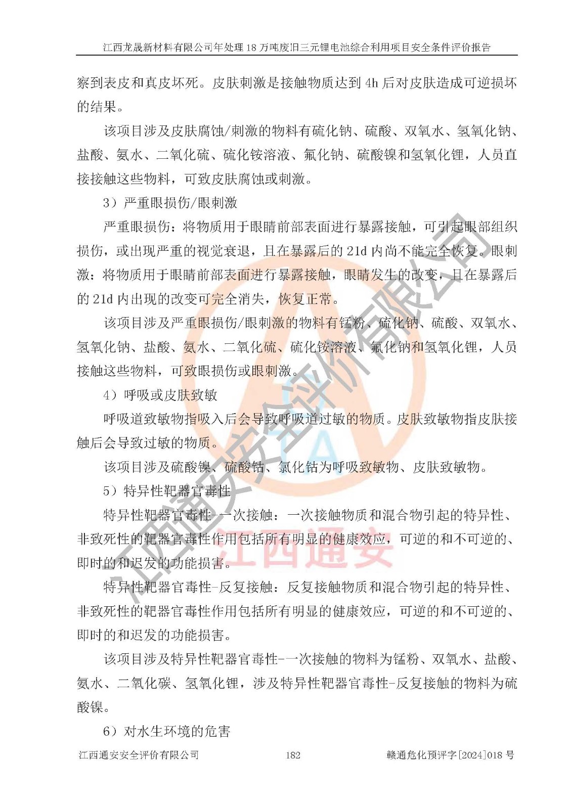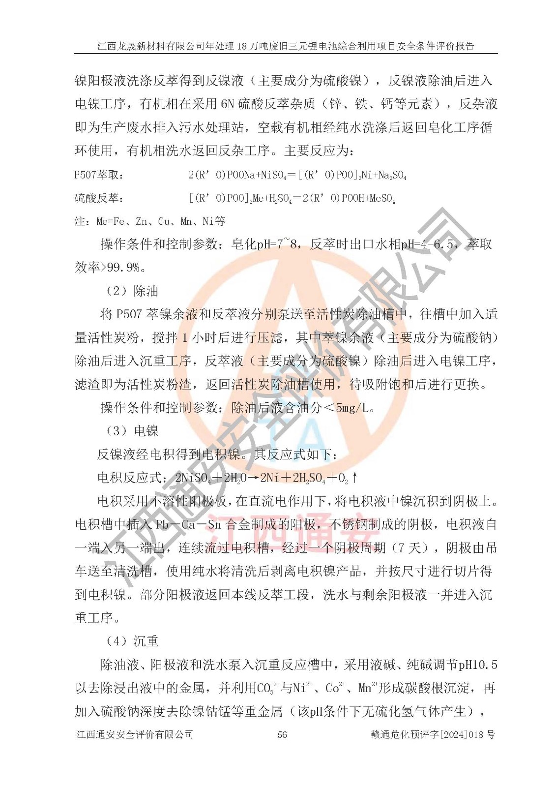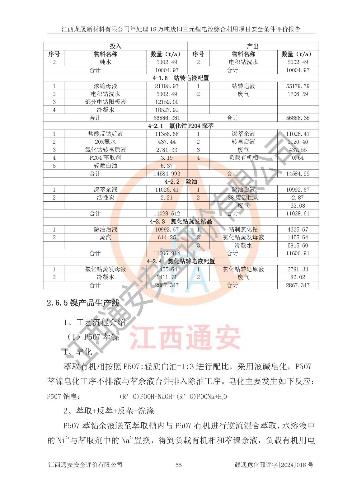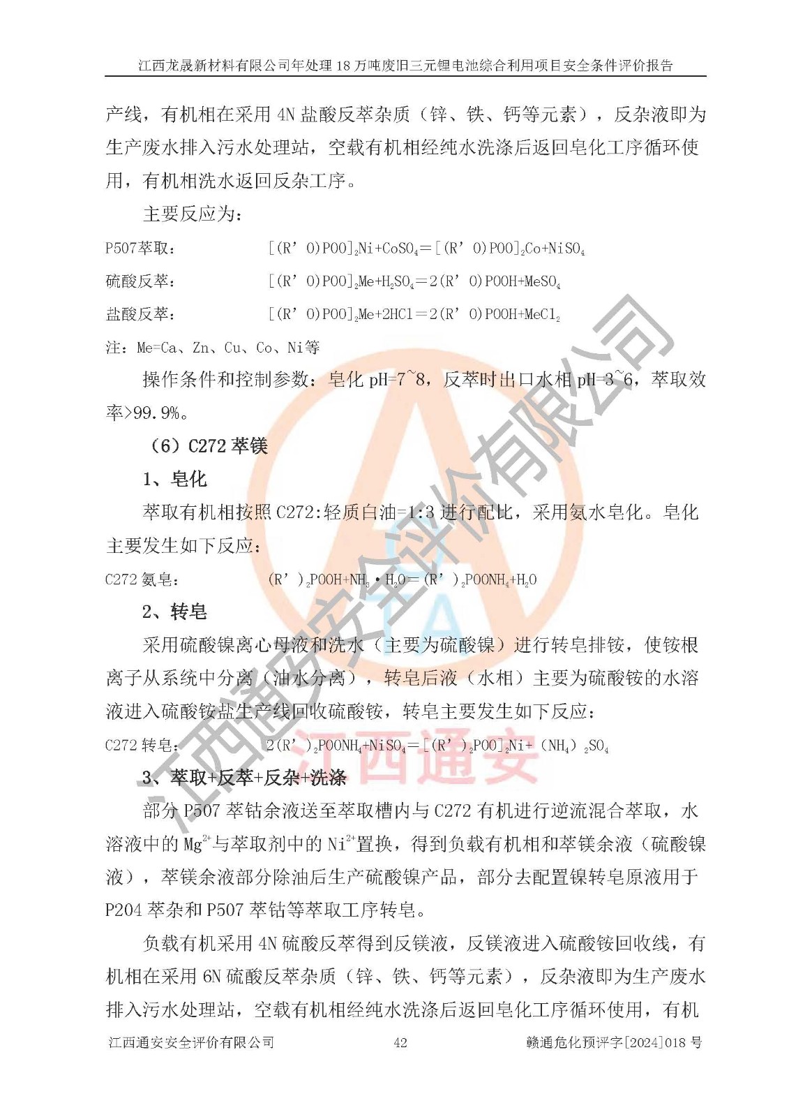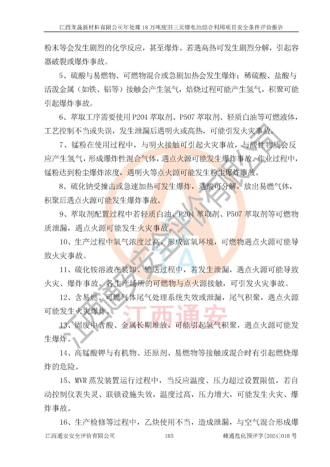 项目简介 | 江西龙晟新材料有限公司(以下简称龙晟新材料公司)成立于2022年11月16日,法定**人为李森,注册资本壹亿元整,经营范围为新能源汽车废旧动力蓄电池回收及梯次利用(不含危险废物经营)、电子**材料研发、电子**材料制造、基础化学原料制造(不含危险化学品等许可类化学品的制造)等。 江西龙晟新材料有限公司年处理18万吨废旧三元锂电池综合利用项目2023年4月3日取得了建设用地规划许可证,2023年04月13日取得了备案通知书,委托江西通安安全评价有限公司编制了项目安全条件评价报告,并于2023年5月11日取得了安全条件审查的批复,委托广东政和工程有限公司编制了项目安全设施设计,并于2023年9月12日取得了安全设施设计审查的批复。依据《危险化学品建设项目安全监督管理办法》和《江西省应急管理厅关于印发<江西省危险化学品建设项目安全监督管理实施细则>(试行)的通知》等规定,因建设项目的工艺路线、产品方案及规模等发生重大变化,建设单位应当重新进行安全评价。 江西龙晟新材料有限公司2024年09月25日对年处理18万吨废旧三元锂电池综合利用项目备案文件进行了变更,建设地点位于龙南经济技术开发区富康工业园,厂址属于省级认定的化工集中区。该项目生产过程中涉及使用的原辅材料有三元正负极粉、三元极片粉、粗氢氧化镍、粗碳酸镍、粗碳酸锂、除氟剂、锰粉、硫化钠、硫酸、双氧水、纯碱、液碱(氢氧化钠)、LIX973萃取剂、P204萃取剂、P507萃取剂、C272萃取剂、锂萃取剂、轻质白油、活性炭粉、盐酸、氨水、碳酸氢铵、还原性碳粉、二氧化硫、二氧化碳、碳酸钙、硼酸、硫酸亚铁、亚硫酸铵、树脂、电极板、硫化铵溶液、硫化钡、氟化钠、高锰酸钾、柴油、天然气(燃料)和氮气,尾气中含有氟化氢和氢气,产品为硫酸镍、电积镍、硫酸钴、电积钴、电积铜、硫酸锰、氢氧化锂、氯化钴、碳酸锂、无水硫酸钠、粗制石墨粉、硫酸铵和氯化铵。经辨识,锰粉、硫化钠、硫酸、双氧水、氢氧化钠、P204萃取剂、盐酸、氨水、二氧化硫、二氧化碳、硼酸、硫化铵溶液、硫化钡、氟化钠、高锰酸钾、柴油、天然气(燃料)、氟化氢(尾气)、氢气(尾气)、氮气、硫酸镍、硫酸钴、氢氧化锂和氯化钴属于危险化学品,硫酸、盐酸和高锰酸钾属于易制毒化学品,双氧水和高锰酸钾属于易制爆危险化学品,锰粉、氟化钠、硫酸镍和氟化氢(尾气)属于高毒物品,二氧化硫、天然气(燃料)、氟化氢(尾气)和氢气(尾气)属于重点监管的危险化学品,不涉及重点监管的危险化工工艺,生产、储存单元均不构成危险化学品重大危险源。该项目生产过程中主要的危险有害因素为火灾、爆炸、中毒与窒息、灼烫。根据《安全生产许可证条例》、《危险化学品安全管理条例》和《危险化学品生产企业安全生产许可实施办法》等相关规定,该项目产品中硫酸镍、硫酸钴、氢氧化锂和氯化钴属于危险化学品,需要办理危险化学品安全生产许可证。 | |||