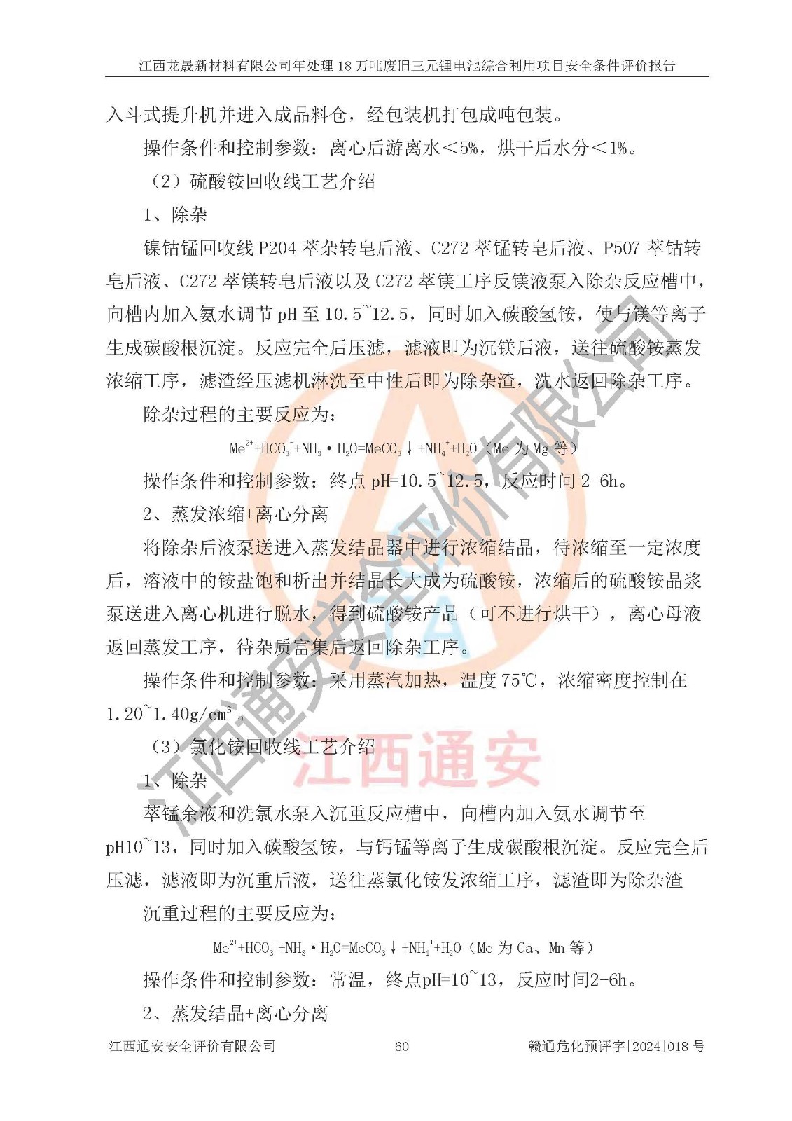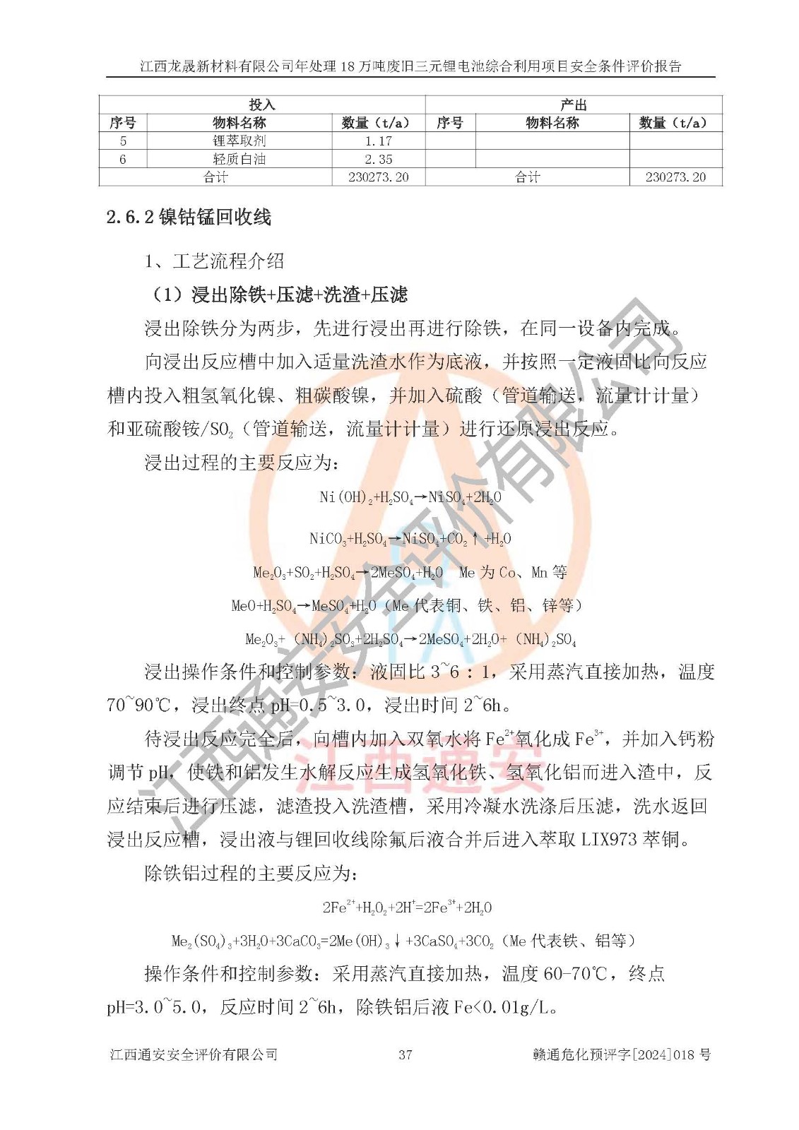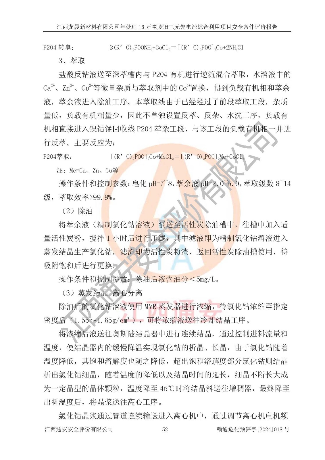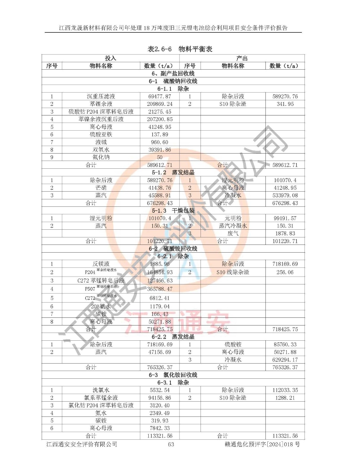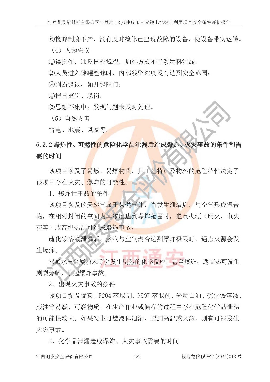 项目简介 | 江西龙晟新材料有限公司(以下简称龙晟新材料公司)成立于2022年11月16日,法定**人为李森,注册资本壹亿元整,经营范围为新能源汽车废旧动力蓄电池回收及梯次利用(不含危险废物经营)、电子**材料研发、电子**材料制造、基础化学原料制造(不含危险化学品等许可类化学品的制造)等。 江西龙晟新材料有限公司年处理18万吨废旧三元锂电池综合利用项目2023年4月3日取得了建设用地规划许可证,2023年04月13日取得了备案通知书,委托江西通安安全评价有限公司编制了项目安全条件评价报告,并于2023年5月11日取得了安全条件审查的批复,委托广东政和工程有限公司编制了项目安全设施设计,并于2023年9月12日取得了安全设施设计审查的批复。依据《危险化学品建设项目安全监督管理办法》和《江西省应急管理厅关于印发<江西省危险化学品建设项目安全监督管理实施细则>(试行)的通知》等规定,因建设项目的工艺路线、产品方案及规模等发生重大变化,建设单位应当重新进行安全评价。 江西龙晟新材料有限公司2024年09月25日对年处理18万吨废旧三元锂电池综合利用项目备案文件进行了变更,建设地点位于龙南经济技术开发区富康工业园,厂址属于省级认定的化工集中区。该项目生产过程中涉及使用的原辅材料有三元正负极粉、三元极片粉、粗氢氧化镍、粗碳酸镍、粗碳酸锂、除氟剂、锰粉、硫化钠、硫酸、双氧水、纯碱、液碱(氢氧化钠)、LIX973萃取剂、P204萃取剂、P507萃取剂、C272萃取剂、锂萃取剂、轻质白油、活性炭粉、盐酸、氨水、碳酸氢铵、还原性碳粉、二氧化硫、二氧化碳、碳酸钙、硼酸、硫酸亚铁、亚硫酸铵、树脂、电极板、硫化铵溶液、硫化钡、氟化钠、高锰酸钾、柴油、天然气(燃料)和氮气,尾气中含有氟化氢和氢气,产品为硫酸镍、电积镍、硫酸钴、电积钴、电积铜、硫酸锰、氢氧化锂、氯化钴、碳酸锂、无水硫酸钠、粗制石墨粉、硫酸铵和氯化铵。经辨识,锰粉、硫化钠、硫酸、双氧水、氢氧化钠、P204萃取剂、盐酸、氨水、二氧化硫、二氧化碳、硼酸、硫化铵溶液、硫化钡、氟化钠、高锰酸钾、柴油、天然气(燃料)、氟化氢(尾气)、氢气(尾气)、氮气、硫酸镍、硫酸钴、氢氧化锂和氯化钴属于危险化学品,硫酸、盐酸和高锰酸钾属于易制毒化学品,双氧水和高锰酸钾属于易制爆危险化学品,锰粉、氟化钠、硫酸镍和氟化氢(尾气)属于高毒物品,二氧化硫、天然气(燃料)、氟化氢(尾气)和氢气(尾气)属于重点监管的危险化学品,不涉及重点监管的危险化工工艺,生产、储存单元均不构成危险化学品重大危险源。该项目生产过程中主要的危险有害因素为火灾、爆炸、中毒与窒息、灼烫。根据《安全生产许可证条例》、《危险化学品安全管理条例》和《危险化学品生产企业安全生产许可实施办法》等相关规定,该项目产品中硫酸镍、硫酸钴、氢氧化锂和氯化钴属于危险化学品,需要办理危险化学品安全生产许可证。 | |||