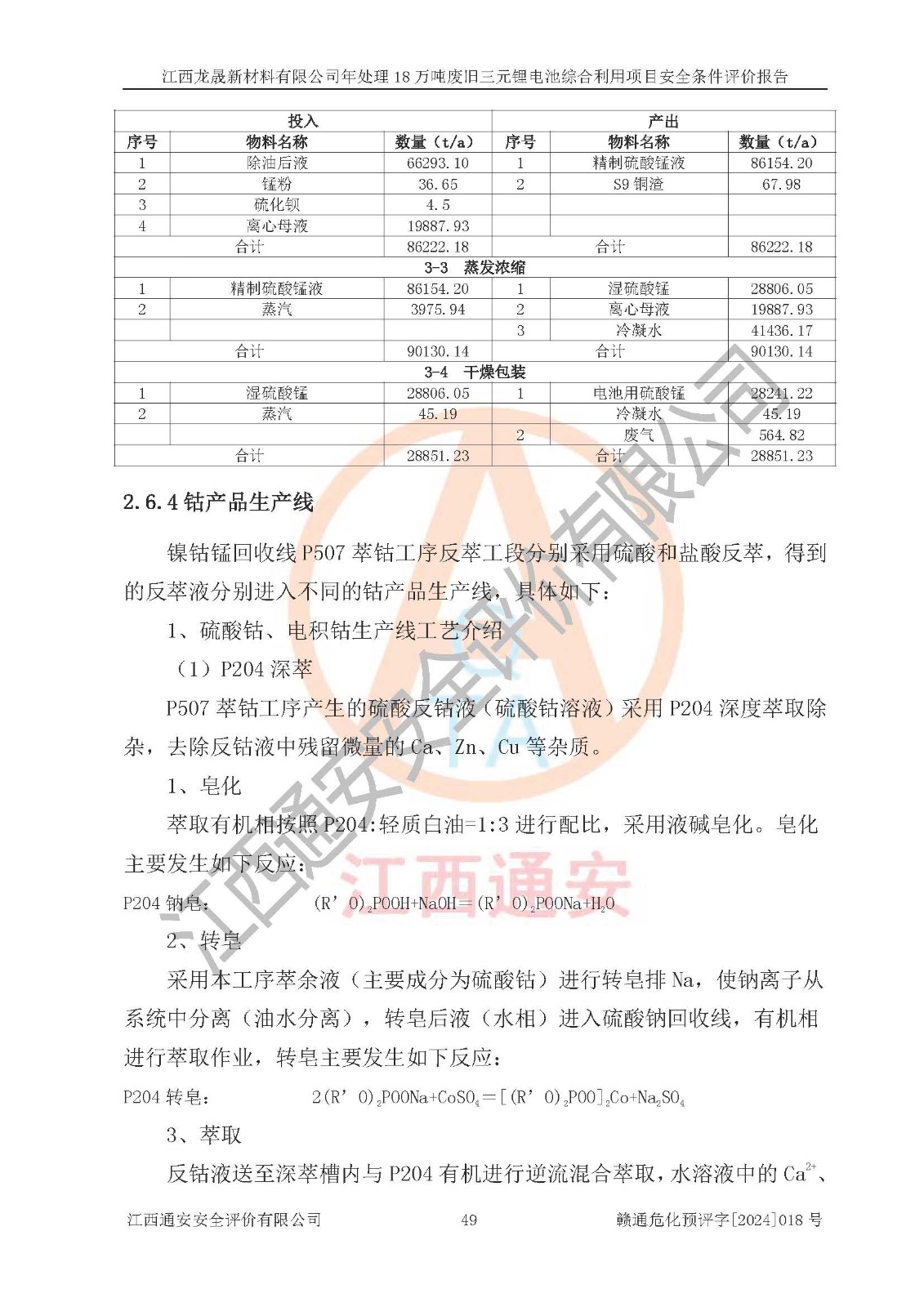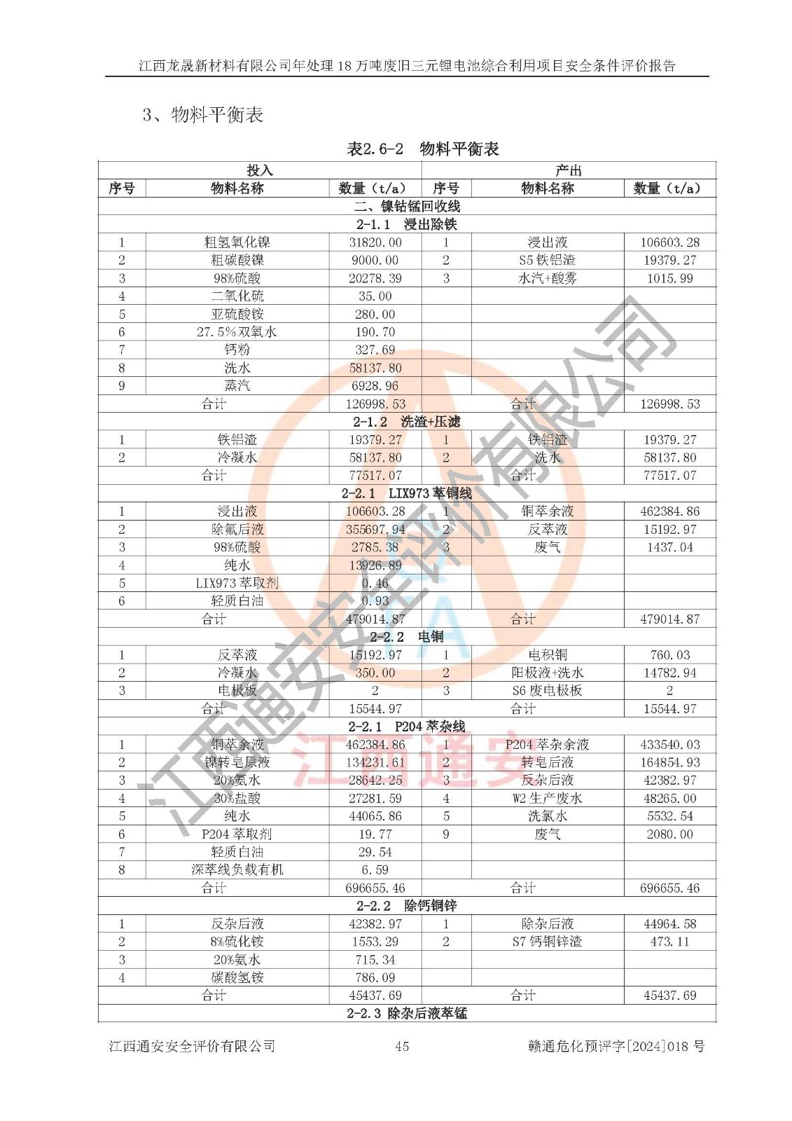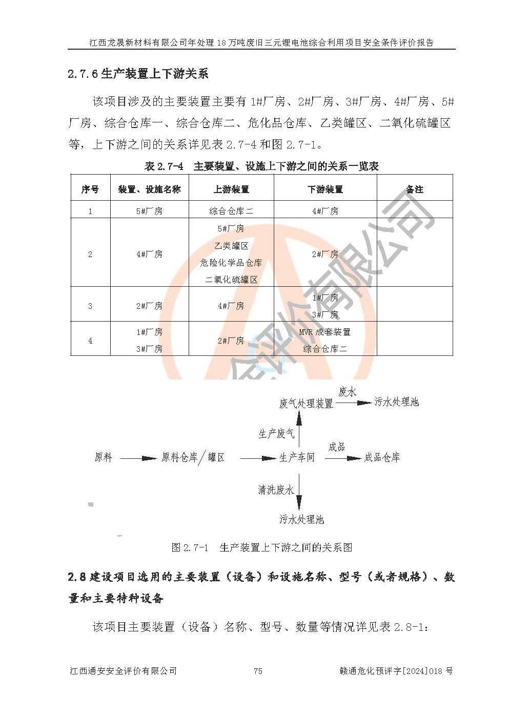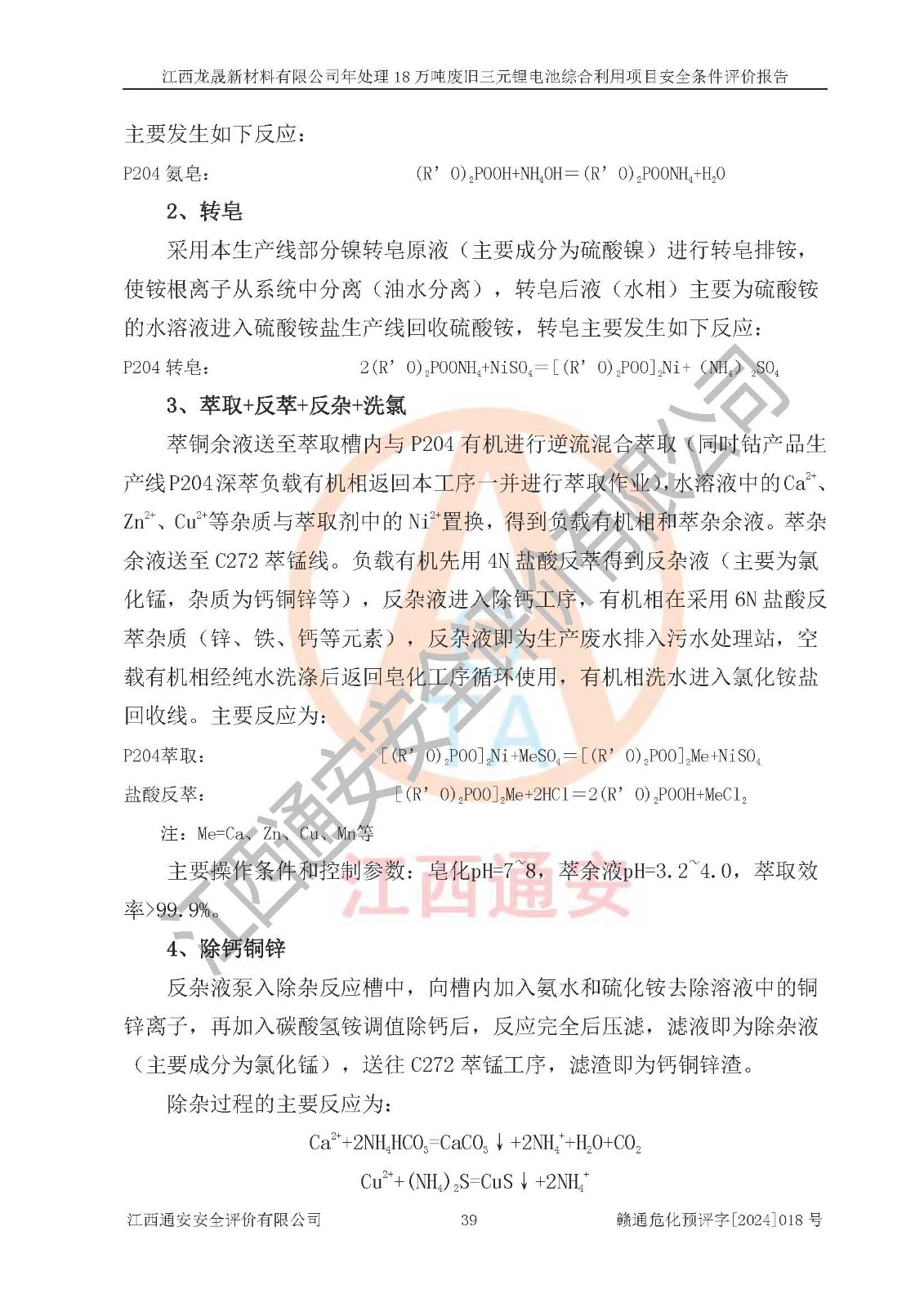 项目简介 | 江西龙晟新材料有限公司(以下简称龙晟新材料公司)成立于2022年11月16日,法定**人为李森,注册资本壹亿元整,经营范围为新能源汽车废旧动力蓄电池回收及梯次利用(不含危险废物经营)、电子**材料研发、电子**材料制造、基础化学原料制造(不含危险化学品等许可类化学品的制造)等。 江西龙晟新材料有限公司年处理18万吨废旧三元锂电池综合利用项目2023年4月3日取得了建设用地规划许可证,2023年04月13日取得了备案通知书,委托江西通安安全评价有限公司编制了项目安全条件评价报告,并于2023年5月11日取得了安全条件审查的批复,委托广东政和工程有限公司编制了项目安全设施设计,并于2023年9月12日取得了安全设施设计审查的批复。依据《危险化学品建设项目安全监督管理办法》和《江西省应急管理厅关于印发<江西省危险化学品建设项目安全监督管理实施细则>(试行)的通知》等规定,因建设项目的工艺路线、产品方案及规模等发生重大变化,建设单位应当重新进行安全评价。 江西龙晟新材料有限公司2024年09月25日对年处理18万吨废旧三元锂电池综合利用项目备案文件进行了变更,建设地点位于龙南经济技术开发区富康工业园,厂址属于省级认定的化工集中区。该项目生产过程中涉及使用的原辅材料有三元正负极粉、三元极片粉、粗氢氧化镍、粗碳酸镍、粗碳酸锂、除氟剂、锰粉、硫化钠、硫酸、双氧水、纯碱、液碱(氢氧化钠)、LIX973萃取剂、P204萃取剂、P507萃取剂、C272萃取剂、锂萃取剂、轻质白油、活性炭粉、盐酸、氨水、碳酸氢铵、还原性碳粉、二氧化硫、二氧化碳、碳酸钙、硼酸、硫酸亚铁、亚硫酸铵、树脂、电极板、硫化铵溶液、硫化钡、氟化钠、高锰酸钾、柴油、天然气(燃料)和氮气,尾气中含有氟化氢和氢气,产品为硫酸镍、电积镍、硫酸钴、电积钴、电积铜、硫酸锰、氢氧化锂、氯化钴、碳酸锂、无水硫酸钠、粗制石墨粉、硫酸铵和氯化铵。经辨识,锰粉、硫化钠、硫酸、双氧水、氢氧化钠、P204萃取剂、盐酸、氨水、二氧化硫、二氧化碳、硼酸、硫化铵溶液、硫化钡、氟化钠、高锰酸钾、柴油、天然气(燃料)、氟化氢(尾气)、氢气(尾气)、氮气、硫酸镍、硫酸钴、氢氧化锂和氯化钴属于危险化学品,硫酸、盐酸和高锰酸钾属于易制毒化学品,双氧水和高锰酸钾属于易制爆危险化学品,锰粉、氟化钠、硫酸镍和氟化氢(尾气)属于高毒物品,二氧化硫、天然气(燃料)、氟化氢(尾气)和氢气(尾气)属于重点监管的危险化学品,不涉及重点监管的危险化工工艺,生产、储存单元均不构成危险化学品重大危险源。该项目生产过程中主要的危险有害因素为火灾、爆炸、中毒与窒息、灼烫。根据《安全生产许可证条例》、《危险化学品安全管理条例》和《危险化学品生产企业安全生产许可实施办法》等相关规定,该项目产品中硫酸镍、硫酸钴、氢氧化锂和氯化钴属于危险化学品,需要办理危险化学品安全生产许可证。 | |||