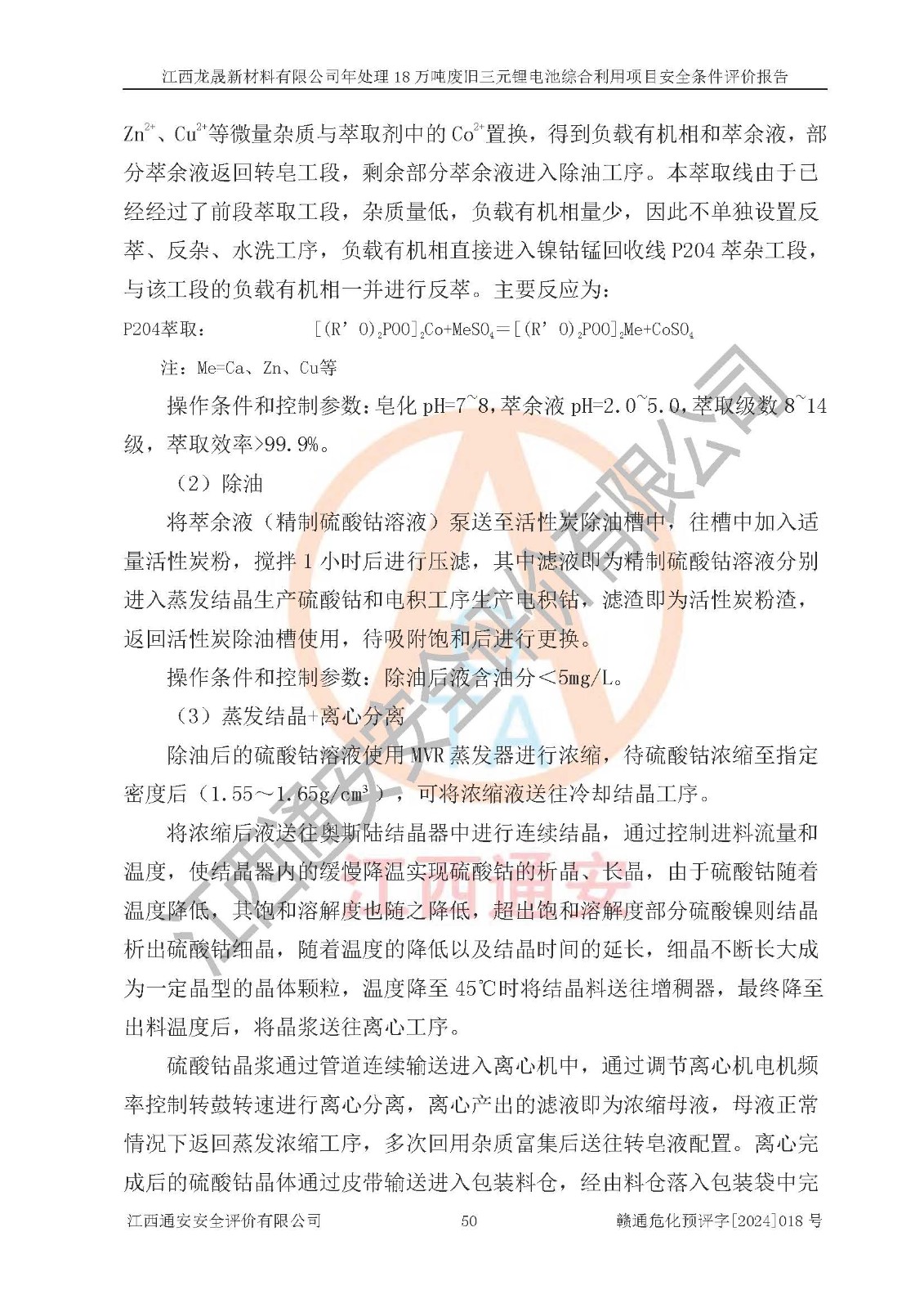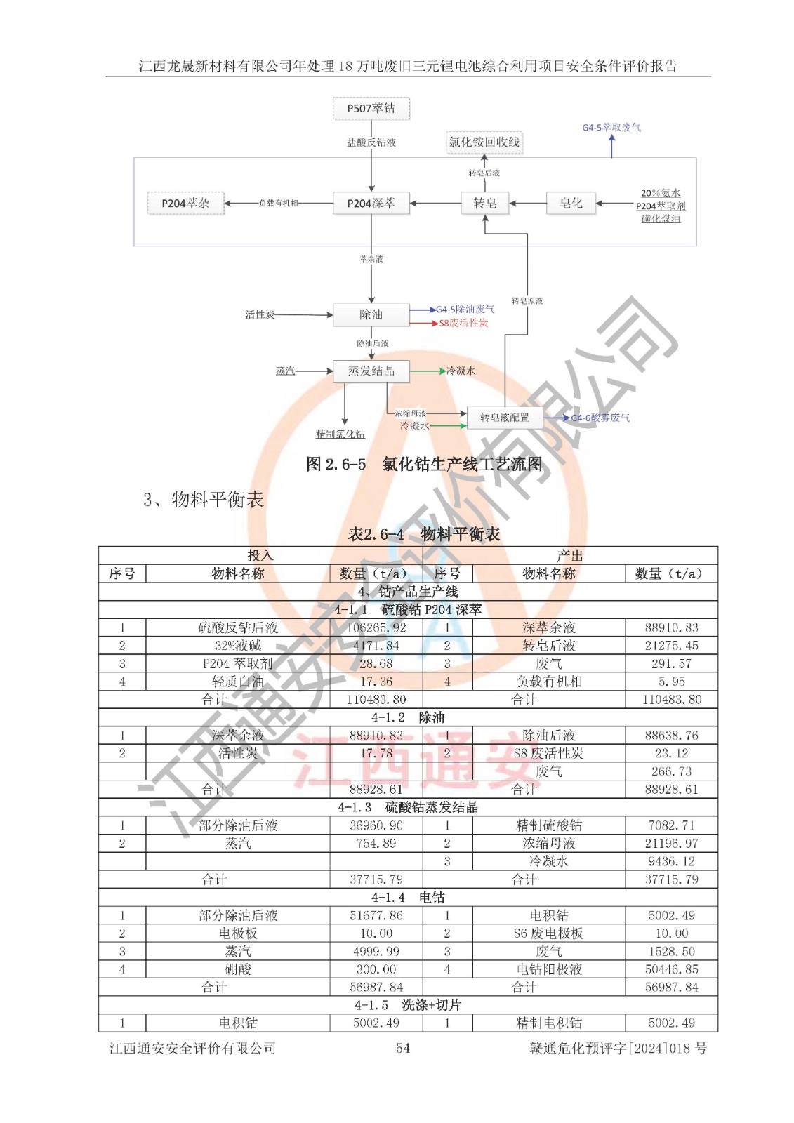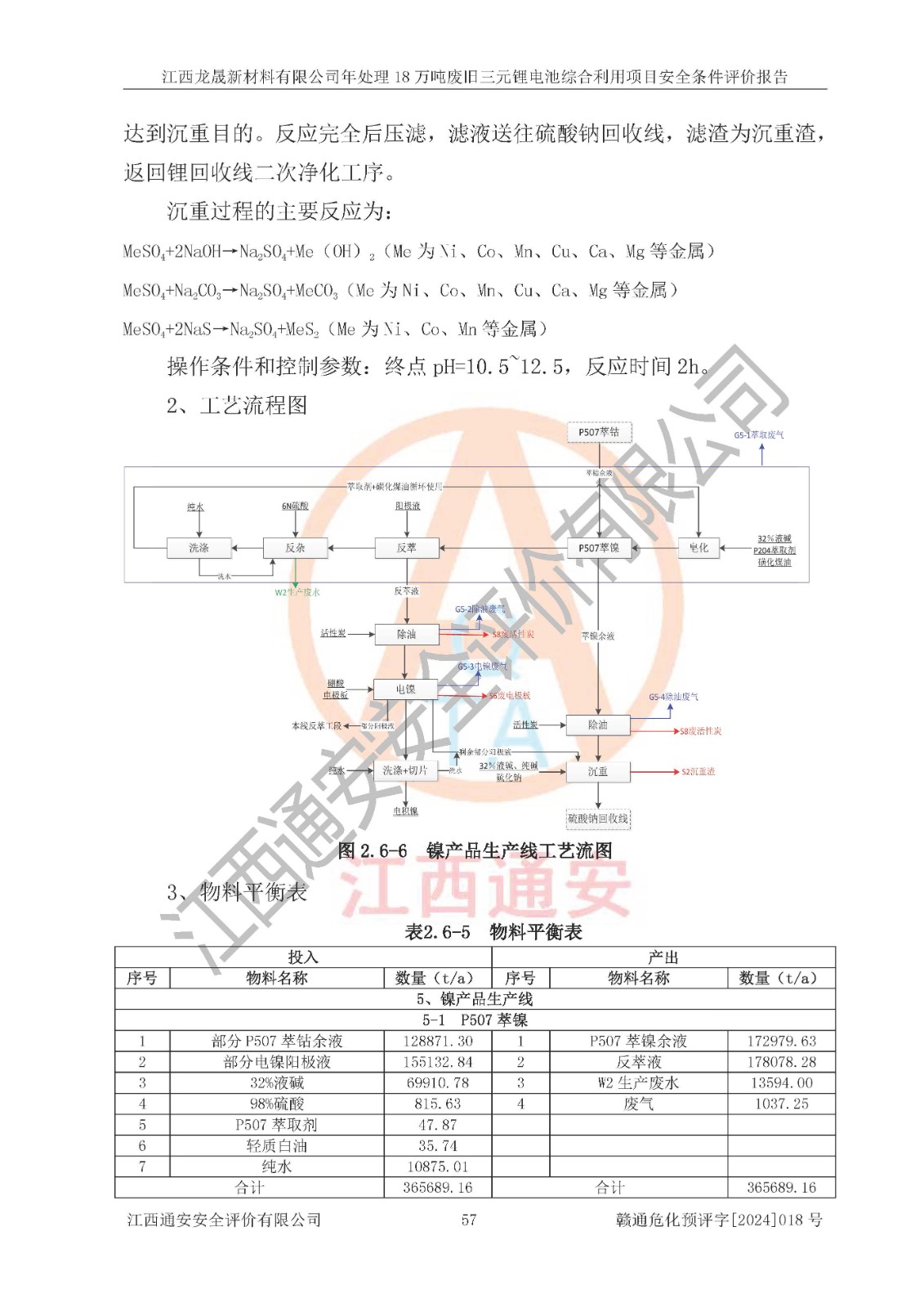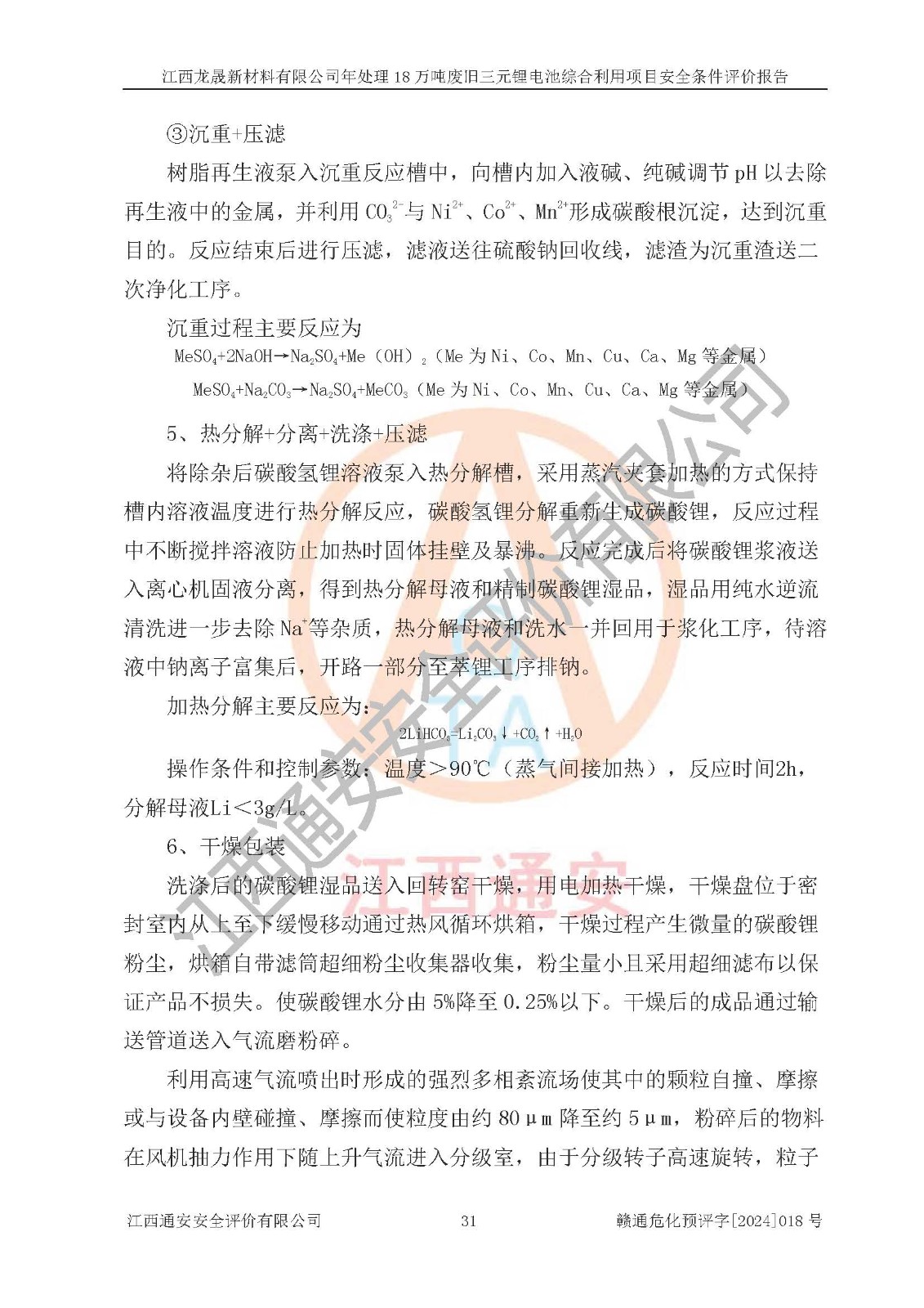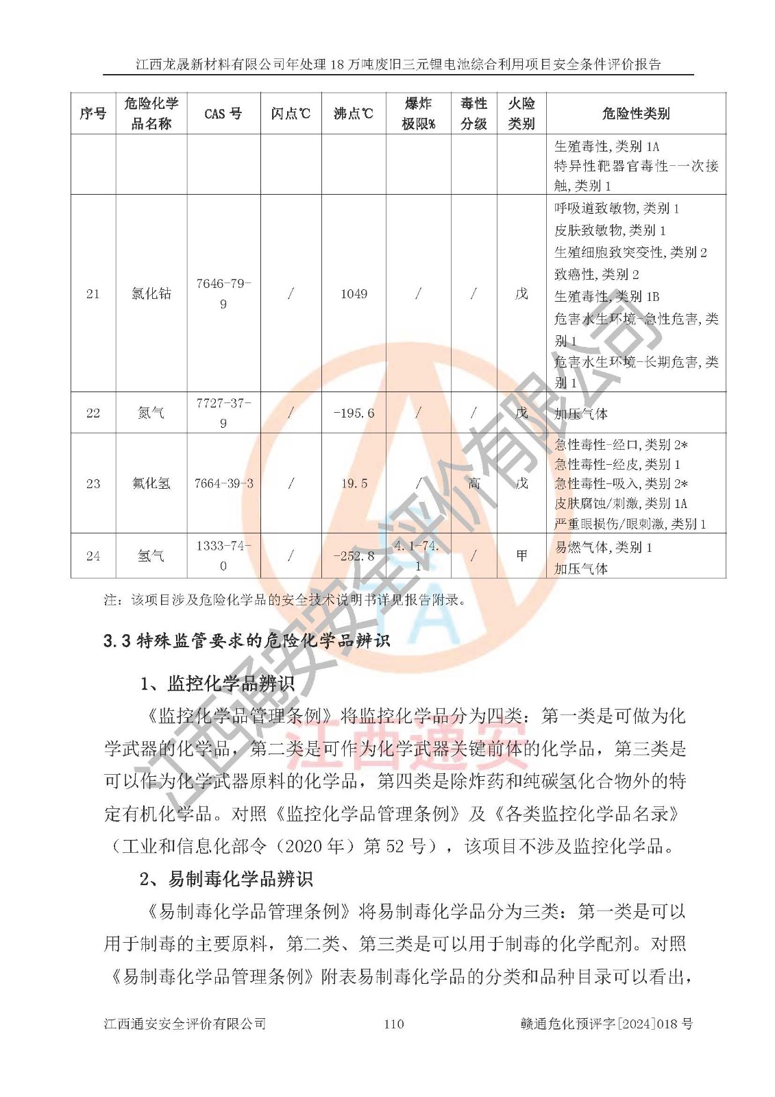 项目简介 | 江西龙晟新材料有限公司(以下简称龙晟新材料公司)成立于2022年11月16日,法定**人为李森,注册资本壹亿元整,经营范围为新能源汽车废旧动力蓄电池回收及梯次利用(不含危险废物经营)、电子**材料研发、电子**材料制造、基础化学原料制造(不含危险化学品等许可类化学品的制造)等。 江西龙晟新材料有限公司年处理18万吨废旧三元锂电池综合利用项目2023年4月3日取得了建设用地规划许可证,2023年04月13日取得了备案通知书,委托江西通安安全评价有限公司编制了项目安全条件评价报告,并于2023年5月11日取得了安全条件审查的批复,委托广东政和工程有限公司编制了项目安全设施设计,并于2023年9月12日取得了安全设施设计审查的批复。依据《危险化学品建设项目安全监督管理办法》和《江西省应急管理厅关于印发<江西省危险化学品建设项目安全监督管理实施细则>(试行)的通知》等规定,因建设项目的工艺路线、产品方案及规模等发生重大变化,建设单位应当重新进行安全评价。 江西龙晟新材料有限公司2024年09月25日对年处理18万吨废旧三元锂电池综合利用项目备案文件进行了变更,建设地点位于龙南经济技术开发区富康工业园,厂址属于省级认定的化工集中区。该项目生产过程中涉及使用的原辅材料有三元正负极粉、三元极片粉、粗氢氧化镍、粗碳酸镍、粗碳酸锂、除氟剂、锰粉、硫化钠、硫酸、双氧水、纯碱、液碱(氢氧化钠)、LIX973萃取剂、P204萃取剂、P507萃取剂、C272萃取剂、锂萃取剂、轻质白油、活性炭粉、盐酸、氨水、碳酸氢铵、还原性碳粉、二氧化硫、二氧化碳、碳酸钙、硼酸、硫酸亚铁、亚硫酸铵、树脂、电极板、硫化铵溶液、硫化钡、氟化钠、高锰酸钾、柴油、天然气(燃料)和氮气,尾气中含有氟化氢和氢气,产品为硫酸镍、电积镍、硫酸钴、电积钴、电积铜、硫酸锰、氢氧化锂、氯化钴、碳酸锂、无水硫酸钠、粗制石墨粉、硫酸铵和氯化铵。经辨识,锰粉、硫化钠、硫酸、双氧水、氢氧化钠、P204萃取剂、盐酸、氨水、二氧化硫、二氧化碳、硼酸、硫化铵溶液、硫化钡、氟化钠、高锰酸钾、柴油、天然气(燃料)、氟化氢(尾气)、氢气(尾气)、氮气、硫酸镍、硫酸钴、氢氧化锂和氯化钴属于危险化学品,硫酸、盐酸和高锰酸钾属于易制毒化学品,双氧水和高锰酸钾属于易制爆危险化学品,锰粉、氟化钠、硫酸镍和氟化氢(尾气)属于高毒物品,二氧化硫、天然气(燃料)、氟化氢(尾气)和氢气(尾气)属于重点监管的危险化学品,不涉及重点监管的危险化工工艺,生产、储存单元均不构成危险化学品重大危险源。该项目生产过程中主要的危险有害因素为火灾、爆炸、中毒与窒息、灼烫。根据《安全生产许可证条例》、《危险化学品安全管理条例》和《危险化学品生产企业安全生产许可实施办法》等相关规定,该项目产品中硫酸镍、硫酸钴、氢氧化锂和氯化钴属于危险化学品,需要办理危险化学品安全生产许可证。 | |||