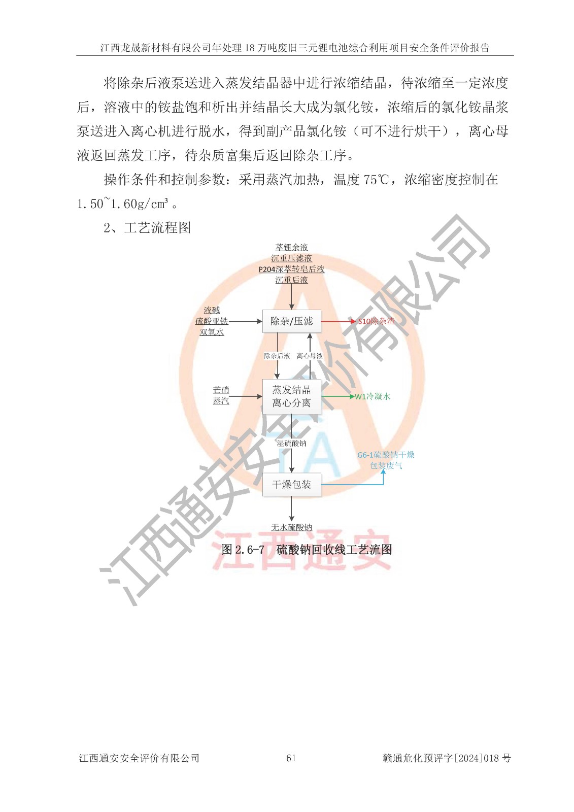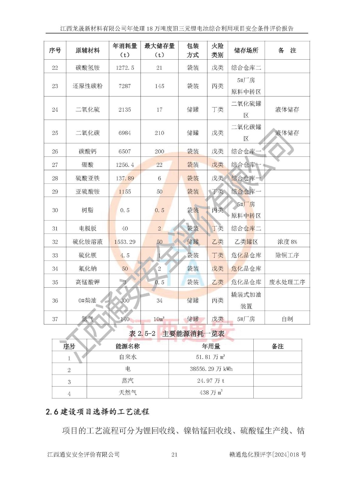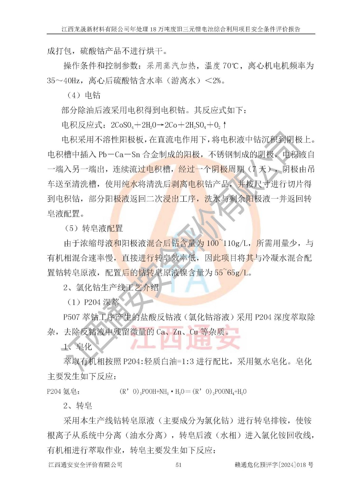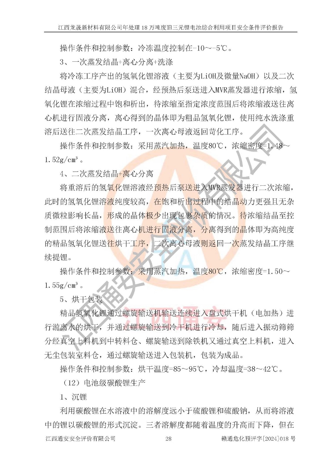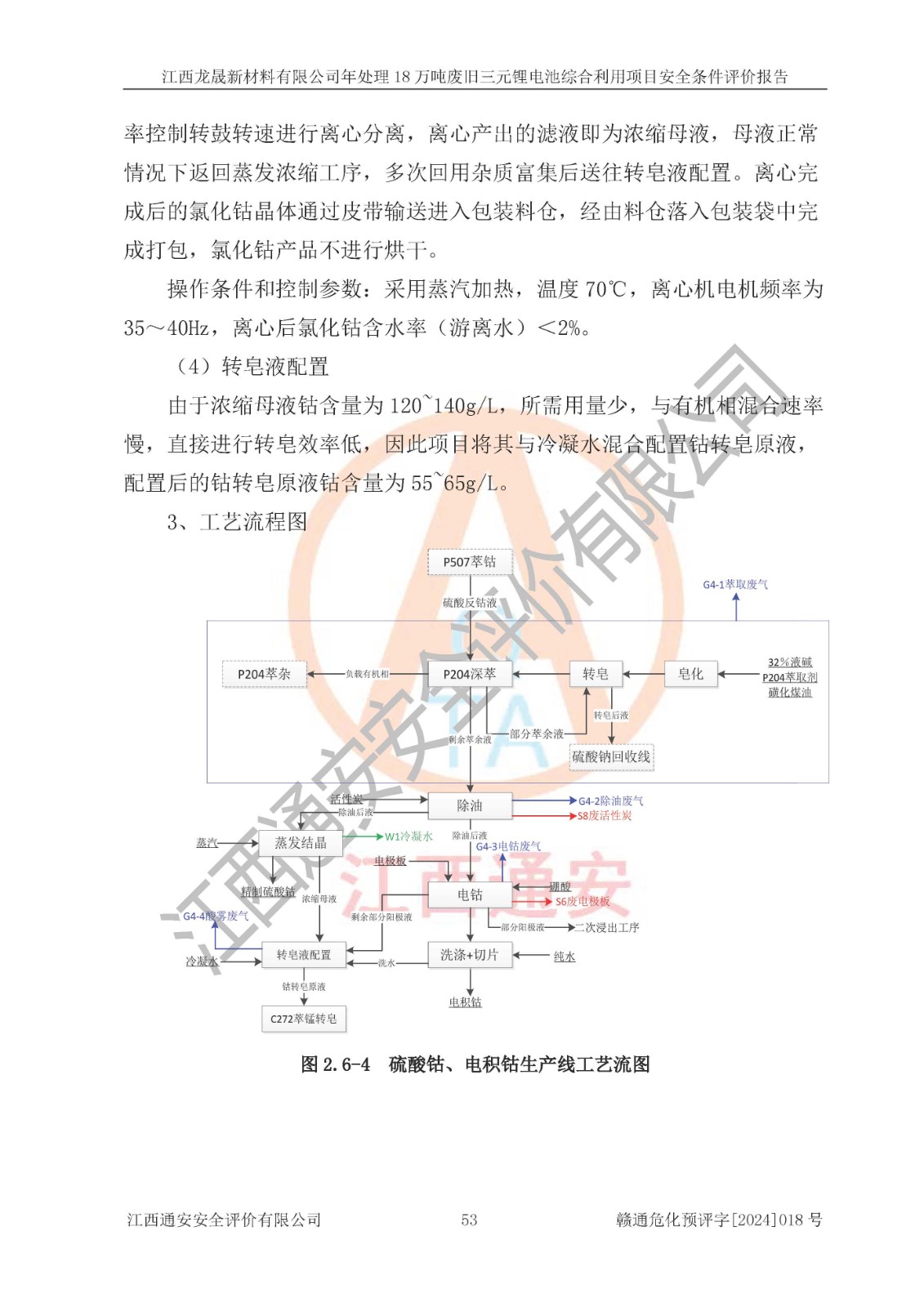 项目简介 | 江西龙晟新材料有限公司(以下简称龙晟新材料公司)成立于2022年11月16日,法定**人为李森,注册资本壹亿元整,经营范围为新能源汽车废旧动力蓄电池回收及梯次利用(不含危险废物经营)、电子**材料研发、电子**材料制造、基础化学原料制造(不含危险化学品等许可类化学品的制造)等。 江西龙晟新材料有限公司年处理18万吨废旧三元锂电池综合利用项目2023年4月3日取得了建设用地规划许可证,2023年04月13日取得了备案通知书,委托江西通安安全评价有限公司编制了项目安全条件评价报告,并于2023年5月11日取得了安全条件审查的批复,委托广东政和工程有限公司编制了项目安全设施设计,并于2023年9月12日取得了安全设施设计审查的批复。依据《危险化学品建设项目安全监督管理办法》和《江西省应急管理厅关于印发<江西省危险化学品建设项目安全监督管理实施细则>(试行)的通知》等规定,因建设项目的工艺路线、产品方案及规模等发生重大变化,建设单位应当重新进行安全评价。 江西龙晟新材料有限公司2024年09月25日对年处理18万吨废旧三元锂电池综合利用项目备案文件进行了变更,建设地点位于龙南经济技术开发区富康工业园,厂址属于省级认定的化工集中区。该项目生产过程中涉及使用的原辅材料有三元正负极粉、三元极片粉、粗氢氧化镍、粗碳酸镍、粗碳酸锂、除氟剂、锰粉、硫化钠、硫酸、双氧水、纯碱、液碱(氢氧化钠)、LIX973萃取剂、P204萃取剂、P507萃取剂、C272萃取剂、锂萃取剂、轻质白油、活性炭粉、盐酸、氨水、碳酸氢铵、还原性碳粉、二氧化硫、二氧化碳、碳酸钙、硼酸、硫酸亚铁、亚硫酸铵、树脂、电极板、硫化铵溶液、硫化钡、氟化钠、高锰酸钾、柴油、天然气(燃料)和氮气,尾气中含有氟化氢和氢气,产品为硫酸镍、电积镍、硫酸钴、电积钴、电积铜、硫酸锰、氢氧化锂、氯化钴、碳酸锂、无水硫酸钠、粗制石墨粉、硫酸铵和氯化铵。经辨识,锰粉、硫化钠、硫酸、双氧水、氢氧化钠、P204萃取剂、盐酸、氨水、二氧化硫、二氧化碳、硼酸、硫化铵溶液、硫化钡、氟化钠、高锰酸钾、柴油、天然气(燃料)、氟化氢(尾气)、氢气(尾气)、氮气、硫酸镍、硫酸钴、氢氧化锂和氯化钴属于危险化学品,硫酸、盐酸和高锰酸钾属于易制毒化学品,双氧水和高锰酸钾属于易制爆危险化学品,锰粉、氟化钠、硫酸镍和氟化氢(尾气)属于高毒物品,二氧化硫、天然气(燃料)、氟化氢(尾气)和氢气(尾气)属于重点监管的危险化学品,不涉及重点监管的危险化工工艺,生产、储存单元均不构成危险化学品重大危险源。该项目生产过程中主要的危险有害因素为火灾、爆炸、中毒与窒息、灼烫。根据《安全生产许可证条例》、《危险化学品安全管理条例》和《危险化学品生产企业安全生产许可实施办法》等相关规定,该项目产品中硫酸镍、硫酸钴、氢氧化锂和氯化钴属于危险化学品,需要办理危险化学品安全生产许可证。 | |||