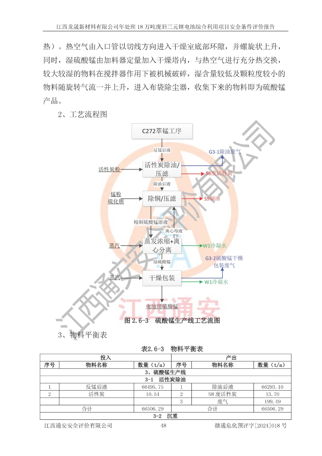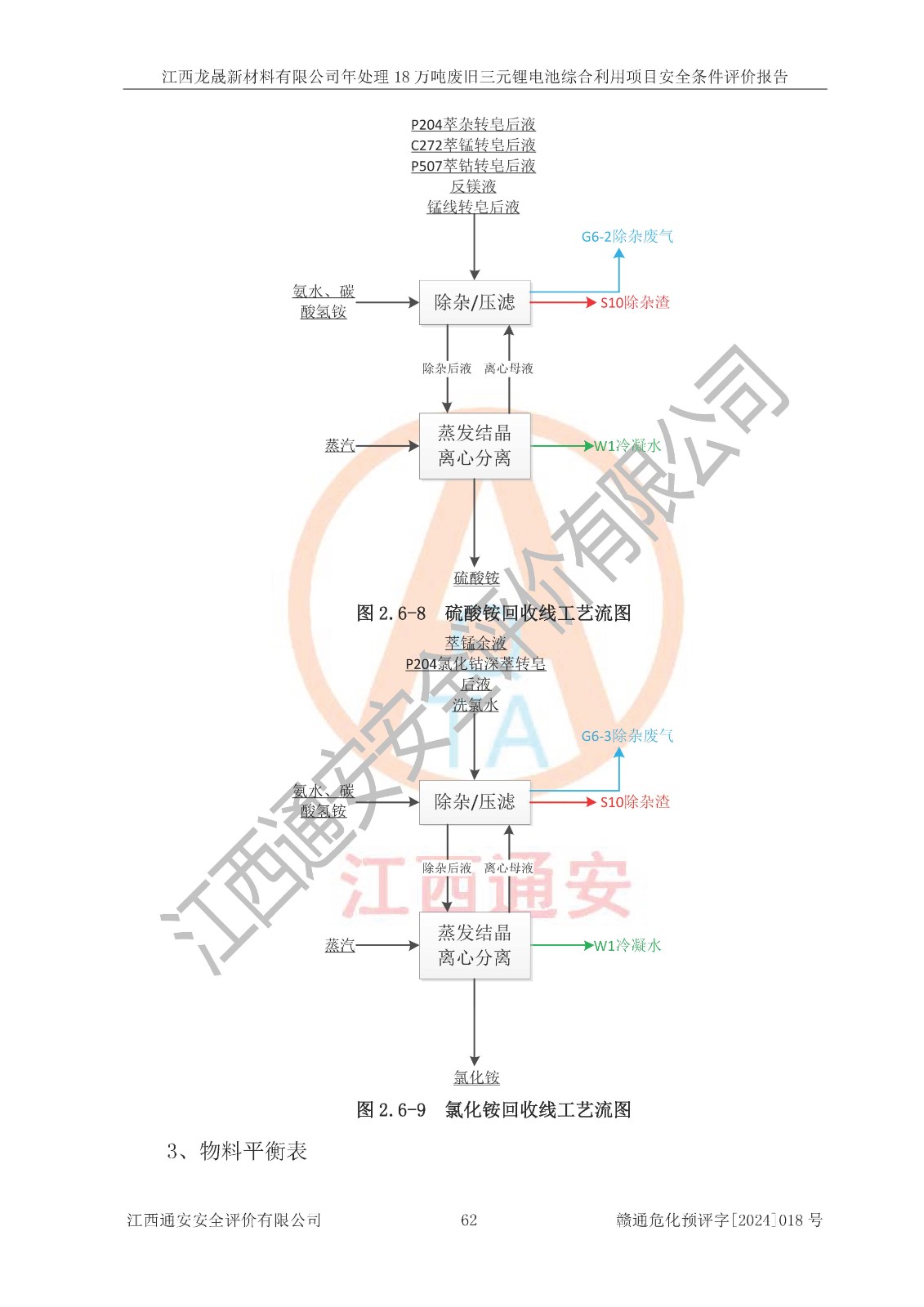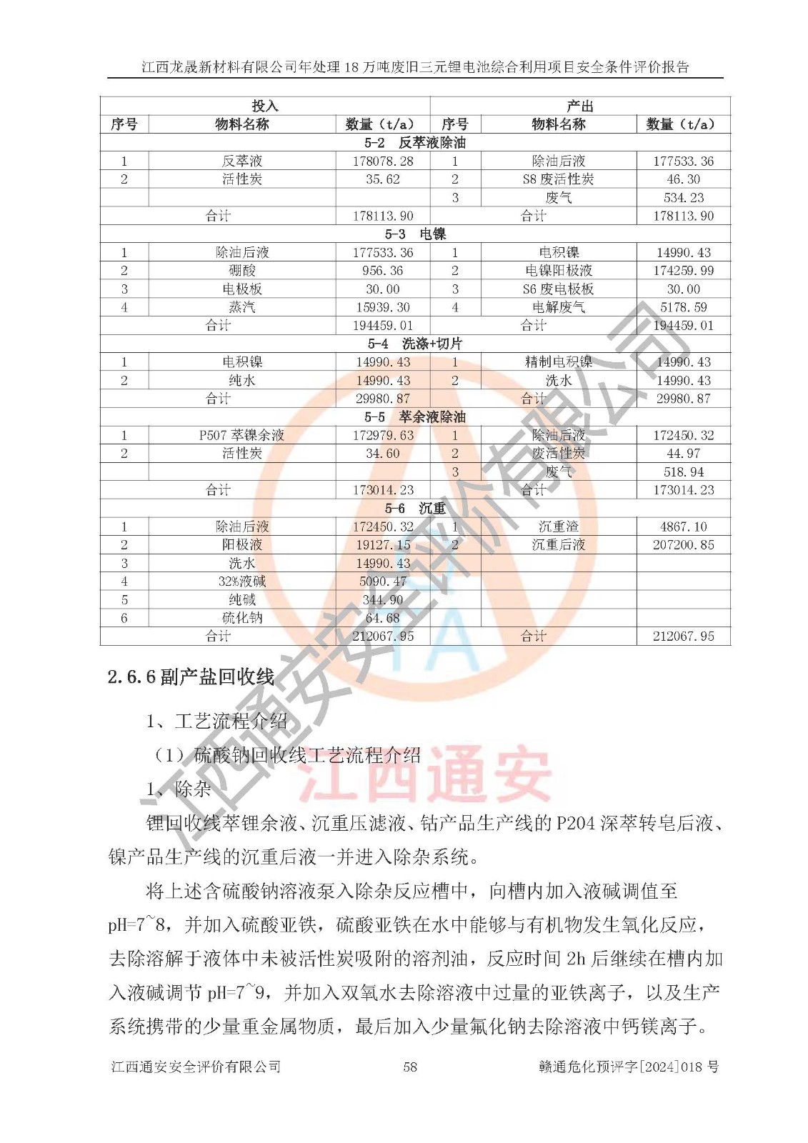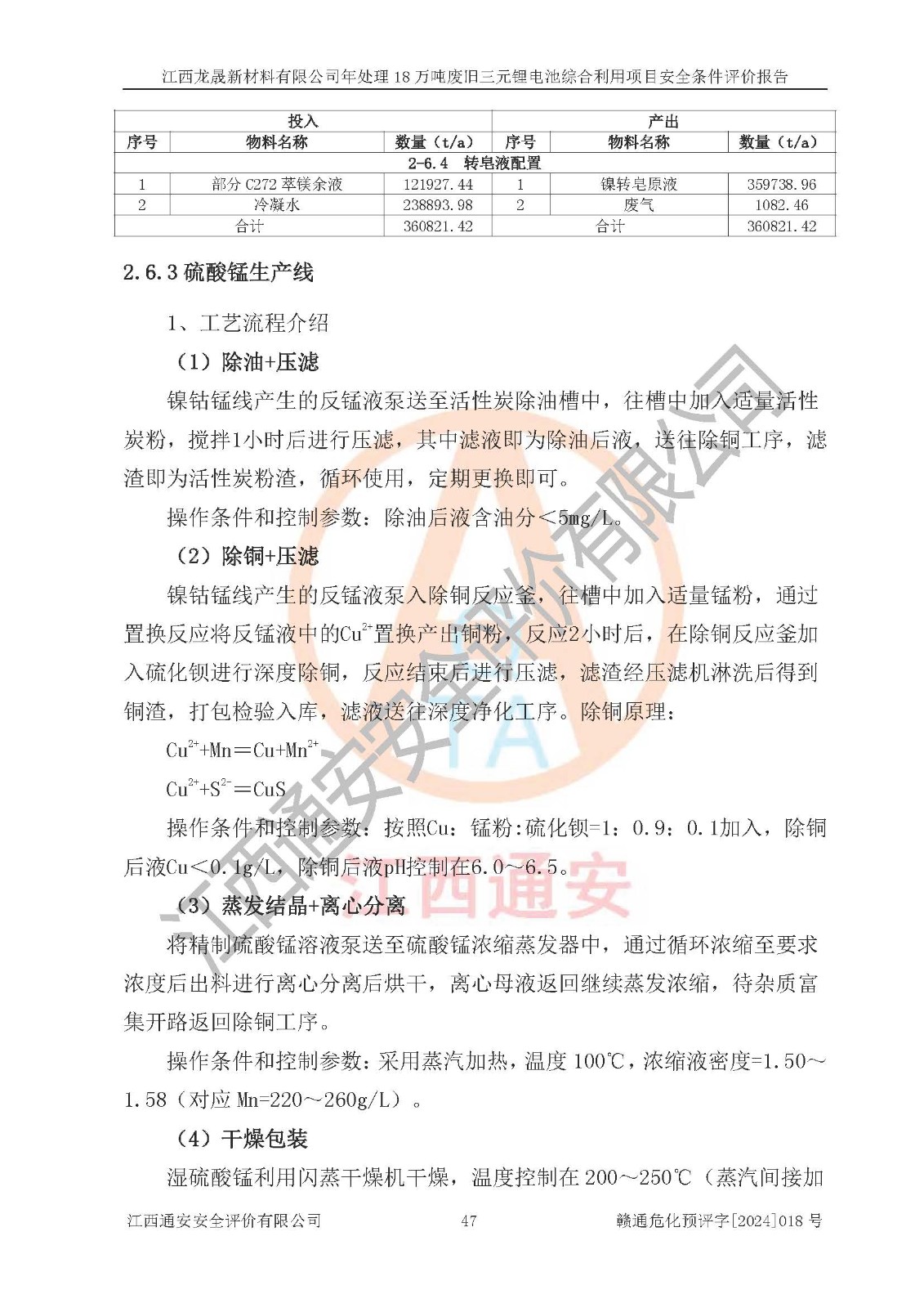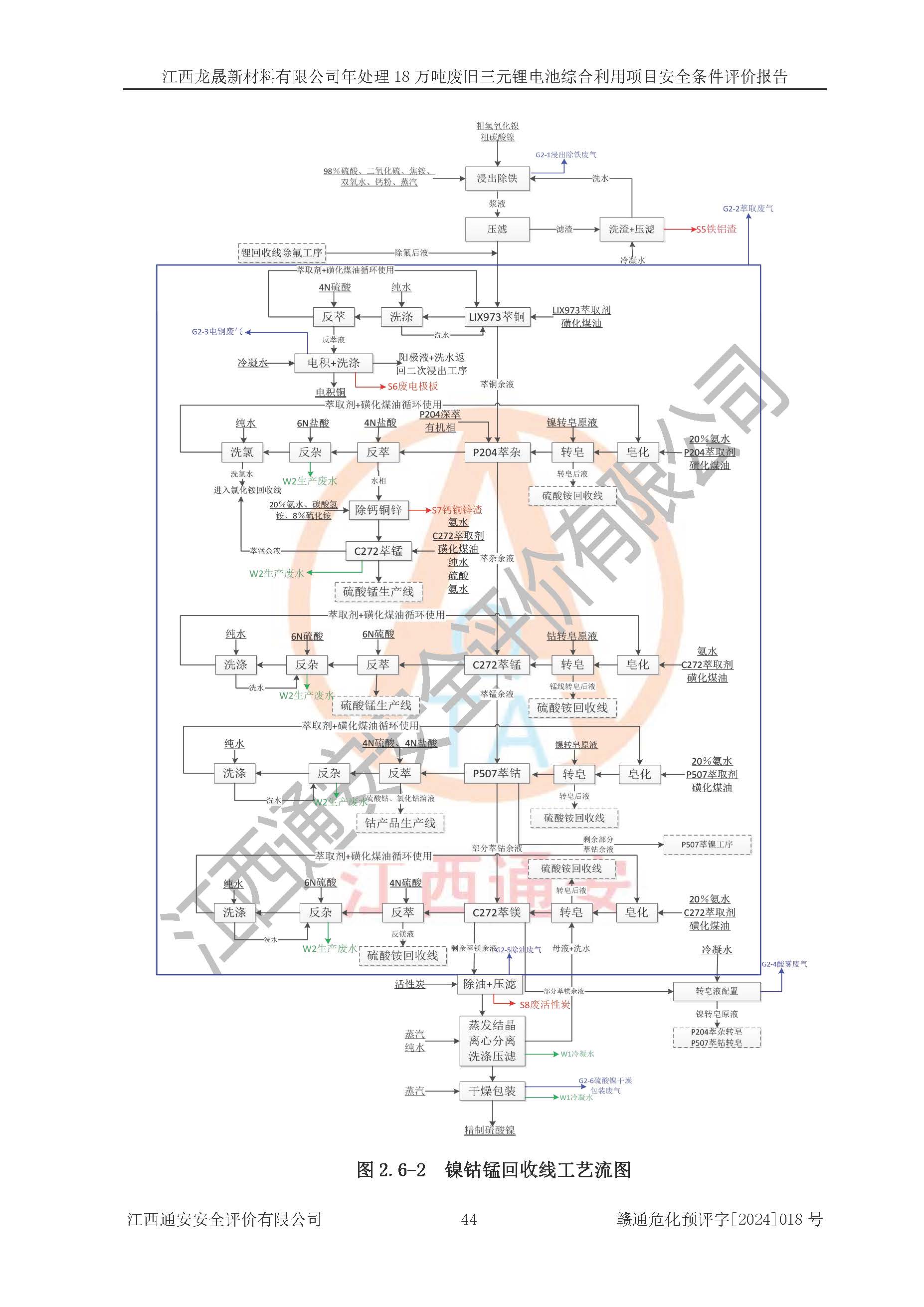 项目简介 | 江西龙晟新材料有限公司(以下简称龙晟新材料公司)成立于2022年11月16日,法定**人为李森,注册资本壹亿元整,经营范围为新能源汽车废旧动力蓄电池回收及梯次利用(不含危险废物经营)、电子**材料研发、电子**材料制造、基础化学原料制造(不含危险化学品等许可类化学品的制造)等。 江西龙晟新材料有限公司年处理18万吨废旧三元锂电池综合利用项目2023年4月3日取得了建设用地规划许可证,2023年04月13日取得了备案通知书,委托江西通安安全评价有限公司编制了项目安全条件评价报告,并于2023年5月11日取得了安全条件审查的批复,委托广东政和工程有限公司编制了项目安全设施设计,并于2023年9月12日取得了安全设施设计审查的批复。依据《危险化学品建设项目安全监督管理办法》和《江西省应急管理厅关于印发<江西省危险化学品建设项目安全监督管理实施细则>(试行)的通知》等规定,因建设项目的工艺路线、产品方案及规模等发生重大变化,建设单位应当重新进行安全评价。 江西龙晟新材料有限公司2024年09月25日对年处理18万吨废旧三元锂电池综合利用项目备案文件进行了变更,建设地点位于龙南经济技术开发区富康工业园,厂址属于省级认定的化工集中区。该项目生产过程中涉及使用的原辅材料有三元正负极粉、三元极片粉、粗氢氧化镍、粗碳酸镍、粗碳酸锂、除氟剂、锰粉、硫化钠、硫酸、双氧水、纯碱、液碱(氢氧化钠)、LIX973萃取剂、P204萃取剂、P507萃取剂、C272萃取剂、锂萃取剂、轻质白油、活性炭粉、盐酸、氨水、碳酸氢铵、还原性碳粉、二氧化硫、二氧化碳、碳酸钙、硼酸、硫酸亚铁、亚硫酸铵、树脂、电极板、硫化铵溶液、硫化钡、氟化钠、高锰酸钾、柴油、天然气(燃料)和氮气,尾气中含有氟化氢和氢气,产品为硫酸镍、电积镍、硫酸钴、电积钴、电积铜、硫酸锰、氢氧化锂、氯化钴、碳酸锂、无水硫酸钠、粗制石墨粉、硫酸铵和氯化铵。经辨识,锰粉、硫化钠、硫酸、双氧水、氢氧化钠、P204萃取剂、盐酸、氨水、二氧化硫、二氧化碳、硼酸、硫化铵溶液、硫化钡、氟化钠、高锰酸钾、柴油、天然气(燃料)、氟化氢(尾气)、氢气(尾气)、氮气、硫酸镍、硫酸钴、氢氧化锂和氯化钴属于危险化学品,硫酸、盐酸和高锰酸钾属于易制毒化学品,双氧水和高锰酸钾属于易制爆危险化学品,锰粉、氟化钠、硫酸镍和氟化氢(尾气)属于高毒物品,二氧化硫、天然气(燃料)、氟化氢(尾气)和氢气(尾气)属于重点监管的危险化学品,不涉及重点监管的危险化工工艺,生产、储存单元均不构成危险化学品重大危险源。该项目生产过程中主要的危险有害因素为火灾、爆炸、中毒与窒息、灼烫。根据《安全生产许可证条例》、《危险化学品安全管理条例》和《危险化学品生产企业安全生产许可实施办法》等相关规定,该项目产品中硫酸镍、硫酸钴、氢氧化锂和氯化钴属于危险化学品,需要办理危险化学品安全生产许可证。 | |||