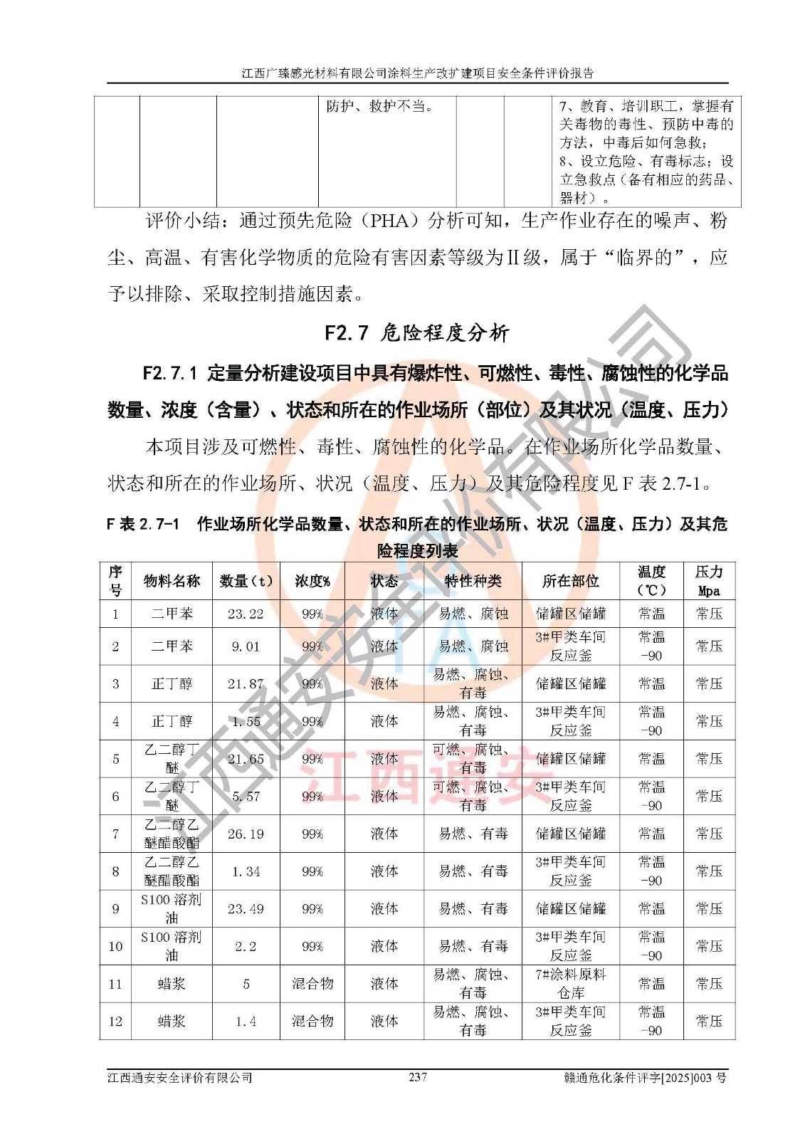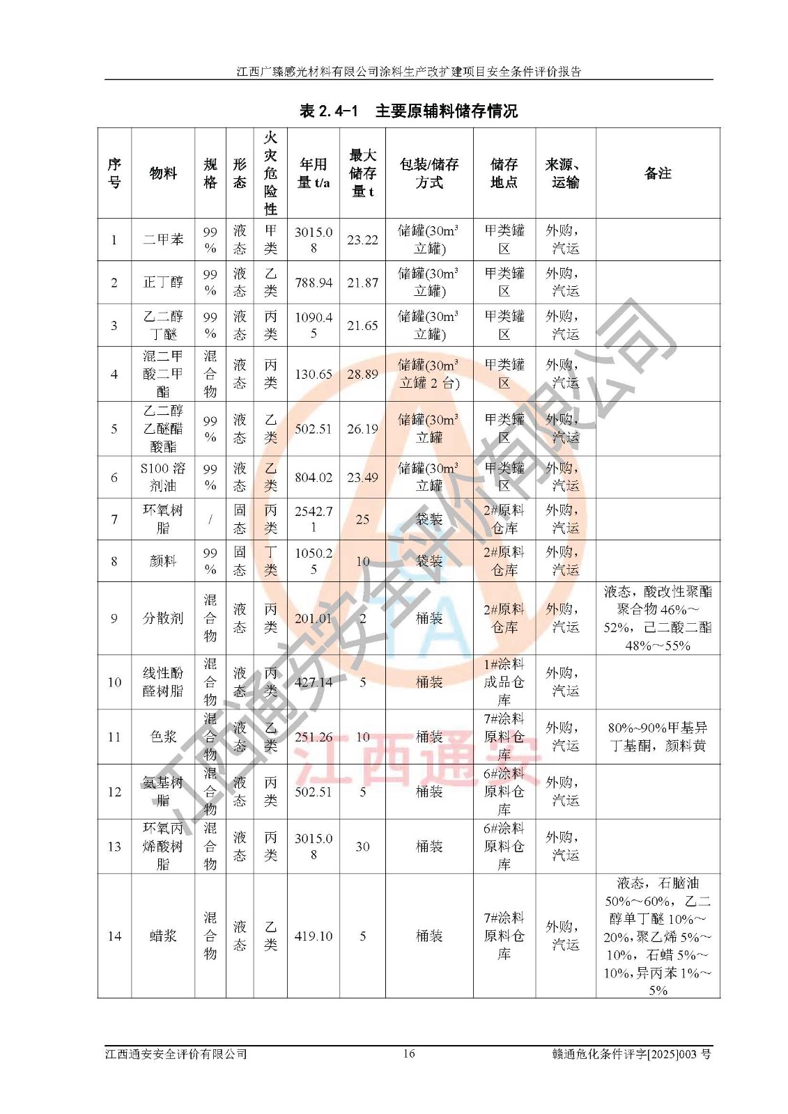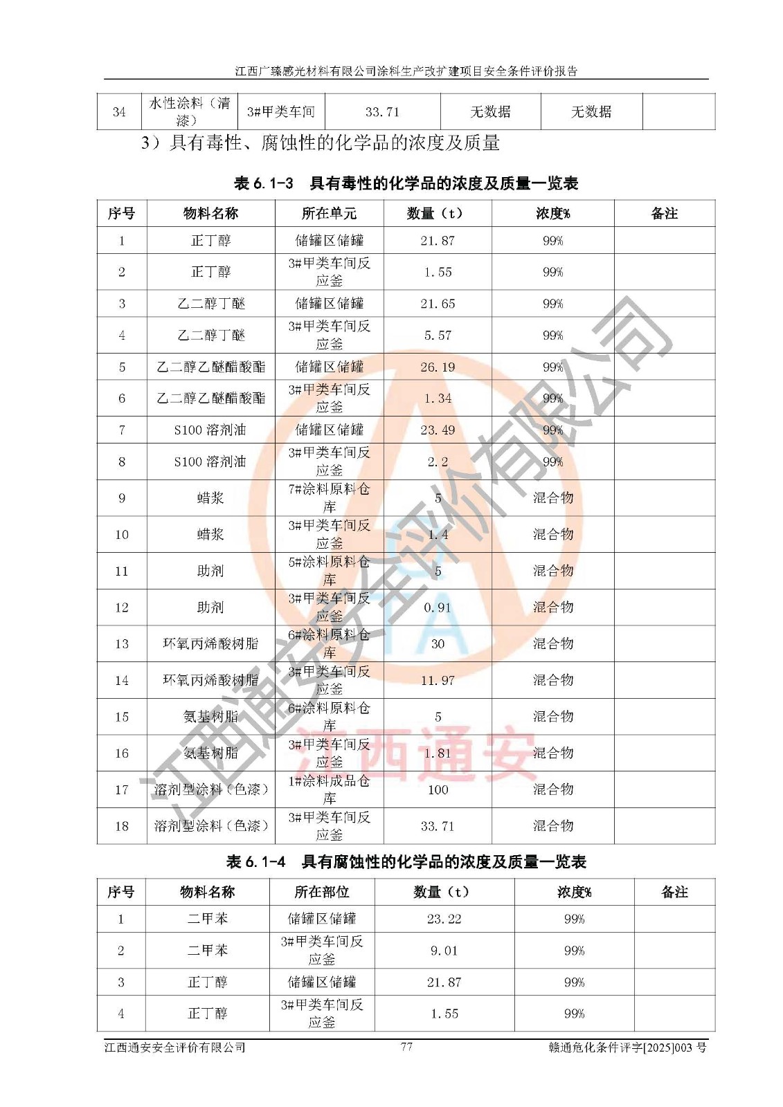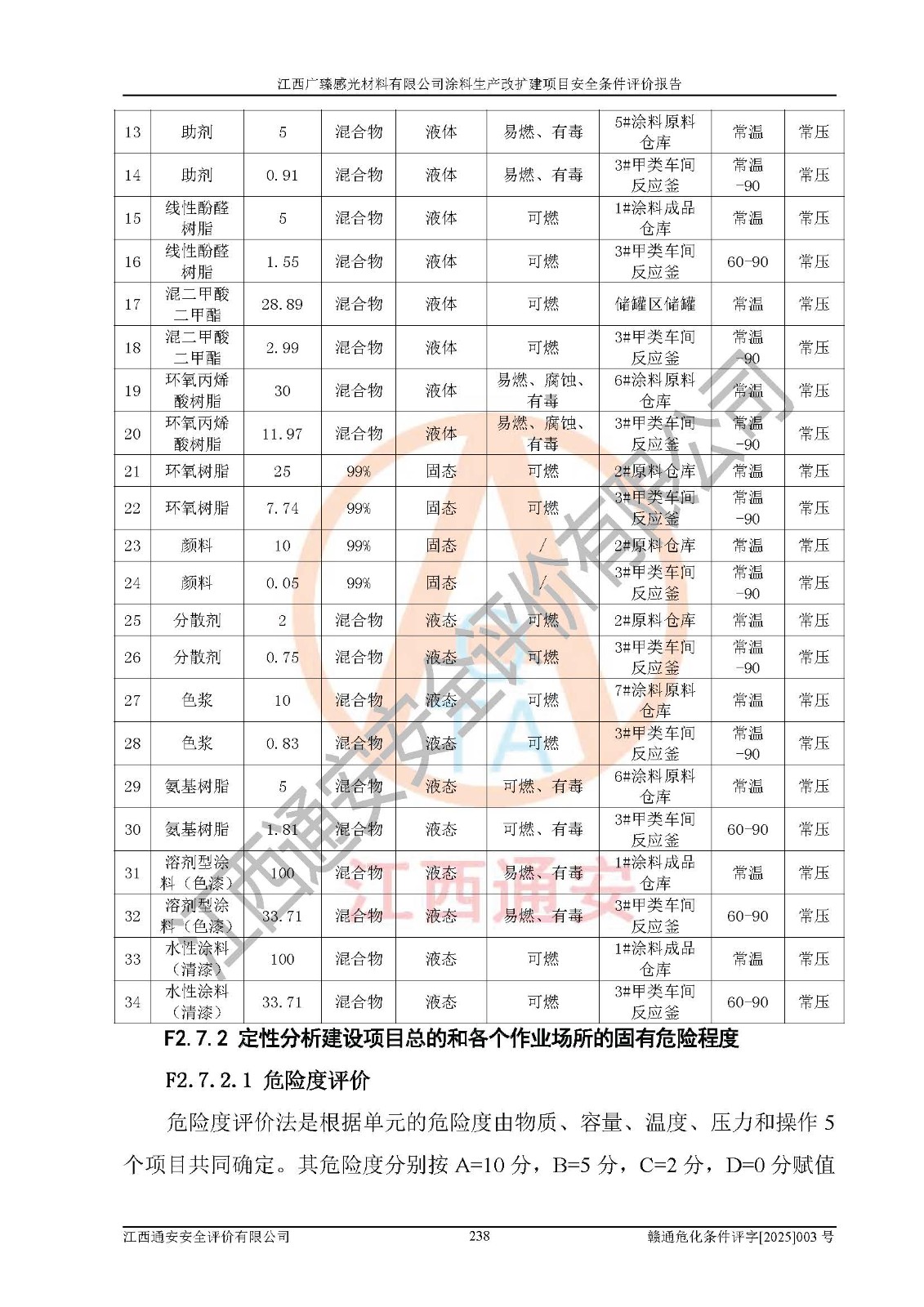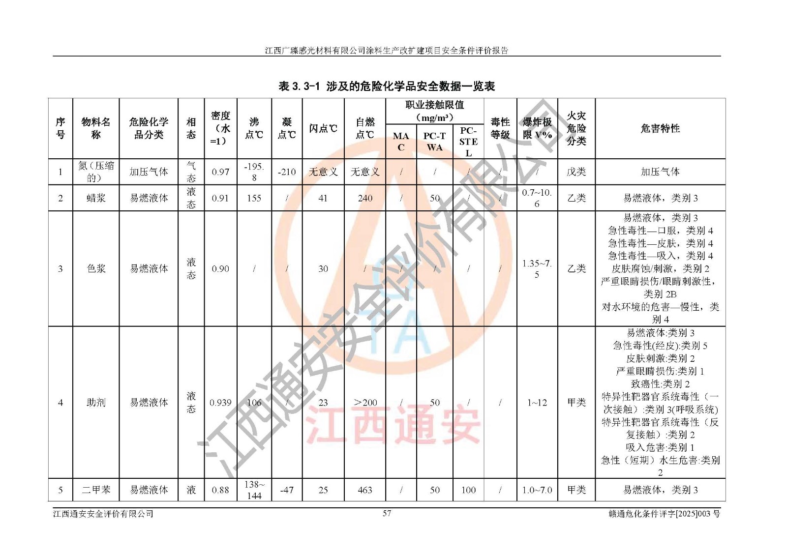 1)本项目取得了龙南市行政审批局下发的《江西省工业企业技术改造项目备案通知书》(项目统一代码为:2408-360727-07-02-3253323)、《建设用地规划许可证》、龙南市自然资源局出具对《关于为江西广臻年产2万吨涂料技改项目出具用地证明的函》的复函,符合地方产业发展规划的要求。 2)根据《危险化学品目录》(2015年版,十部委公告2022年第8号修订),本项目原辅料蜡浆、色浆、助剂、二甲苯、正丁醇、乙二醇丁醚、乙二醇乙醚醋酸酯、S100溶剂油、氮气[压缩的]及产品溶剂型涂料(色漆)属于危险化学品。本项目不涉及监控化学品、剧毒化学品、易制爆化学品、易制毒化学品、重点监管的危险化学品、特别管控危险化学品、高毒物品。本项目不涉及重点监管的危险化工工艺。 3)根据《危险化学品重大危险源辨识》(GB18218-2018),该项目未构成危险化学品重大危险源。 4)项目存在的主要危险因素有:火灾爆炸、容器爆炸、中毒窒息、灼烫、触电、**伤害、机械伤害、高处坠落、物体打击、淹溺等,存在的主要危害因素有:噪声与振动、高温、有害化学物质等;引起事故的原因有人的不安全行为、物的不安全状态、管理缺陷和环境不良。其中*主要的危险有害因素是火灾爆炸。 5)采用预先危险性分析法评价,结果为: (1)通过预先危险(PHA)分析可知,项目厂址及总体布局单元存在周边环境相互影响,发生异常情况,可对周边企业生产经营活动、人员活动产生影响;存在自然条件影响,可因雷击、暴雨等引起事故;存在**伤害、建筑物危害,其固有的危险性等级为Ⅱ级,属于“临界的”,应予以排除、采取控制措施因素。 (2)生产作业存在的危险因素包括火灾爆炸、触电、灼烫、中毒窒息固有的危险等级为Ⅲ级,属于“危险的”,可能导致人员伤亡和系统损坏的因素,需要采取防范和对策措施的因素;其它危险因素固有的危险等级为Ⅱ级,属于“临界的”,应予以排除、采取控制措施因素。 (3)生产作业存在的噪声、粉尘、高温、有害化学物质的危险有害因素等级为Ⅱ级,属于“临界的”,应予以排除、采取控制措施因素。 6)危险度评价分析,结果为: 生产装置危险度评价分析:3#甲类车间为中度危险(Ⅱ级)。 储存单元危险度评价分析:1#涂料成品仓库为**危险(Ⅰ级)、5#涂料原料仓库为**危险(Ⅰ级)、6#涂料原料仓库为中度危险(Ⅱ级)、7#涂料原料仓库为中度危险(Ⅱ级)、9#危废仓库为中度危险(Ⅱ级)、2#丙类原料仓库为中度危险(Ⅱ级)、甲类罐区为**危险(Ⅰ级)。 7)作业条件危险性评价结果:在选定的评价单元中,其危险分值均在70以下,危险程度基本属于“可能危险”、“稍有危险”范围,作业条件相对安全。企业经营过程中首先应重点加强对甲类生产车间、甲类仓库、储罐区的危险因素的严格控制,注重日常安全管理;其次要建立健全完善的安全生产责任制、安全管理制度、安全技术操作规程并**其贯彻落实;第三要认真抓好操作人员、管理人员的安全知识和操作技能的培训,**人员具有与工程技术水平相适应的技术素质和安全素质,**安全作业。 8)项目建设场地符合当地规划要求,建设场地通过合理规划,其选址、周边环境、总平面布置、交通运输等能符合《中华人民共和国安全生产法》《危险化学品安全管理条例》《建筑设计防火规范》《精细化工企业工程设计防火标准》等法规、标准、规范要求。 厂址地区地震活动相对较弱,灾害性天气出现频率稍高,自然灾害对项目建设具有**影响,通过采取相应的防护措施,自然条件适宜建设。 9)建设项目符合**产业政策的要求;选择工艺为现行成熟工艺,其安全可靠性可得到**。 10)本报告已根据有关安全生产法律、法规、规章和**标准、行业标准,并严格执行省委办公厅省**办公厅《关于全面加强危险化学品安全生产工作的实施意见》(赣办发[2020]32号)及鄱阳湖生态经济区、长江经济带、“五河一湖”相关政策规定,客观、公正、科学地进行安全评价,项目符合《江西省应急管理厅关于印发《江西省危险化学品建设项目安全监督管理实施细则》(试行)的通知》(赣应急字[2021]100号)的要求。 11)本报告结合工艺特征,提出应采取的对应的自动化控制系统及自动化实施方案,满足《江西省应急管理厅关于印发《江西省化工企业自动化提升实施方案》(试行)的通知》(赣应急字[2021]190号)的要求。 综上所述:江西广臻感光材料有限公司涂料生产改扩建项目的产业政策、安全条件、厂址、总体布局、主要技术和工艺、装置、设施、配套和辅助工程、安全管理等均满足安全生产相关法律法规、标准规范的要求,该建设项目的危险、有害因素可得到**控制,风险在可接受范围内,具有**的本质安全水平。企业应认真落实本报告提出的安全对策与建议,在下一步设计、建设施工过程中严把质量关、严格施工安全管理和检查,使各项安全措施落实到实处,且严格执行建设项目安全设施“三同时”的规定,建立**的事故应急体系和措施。 |