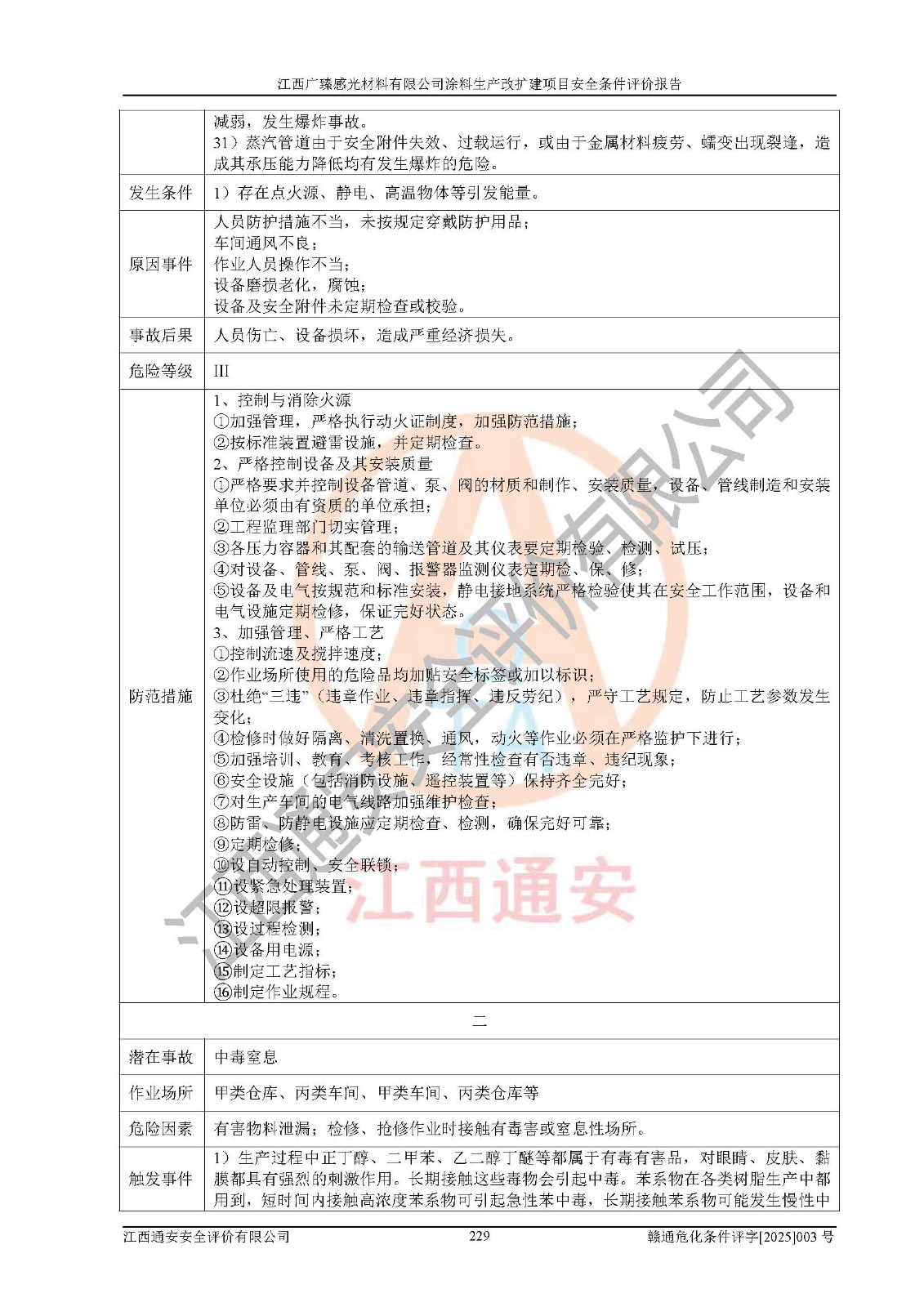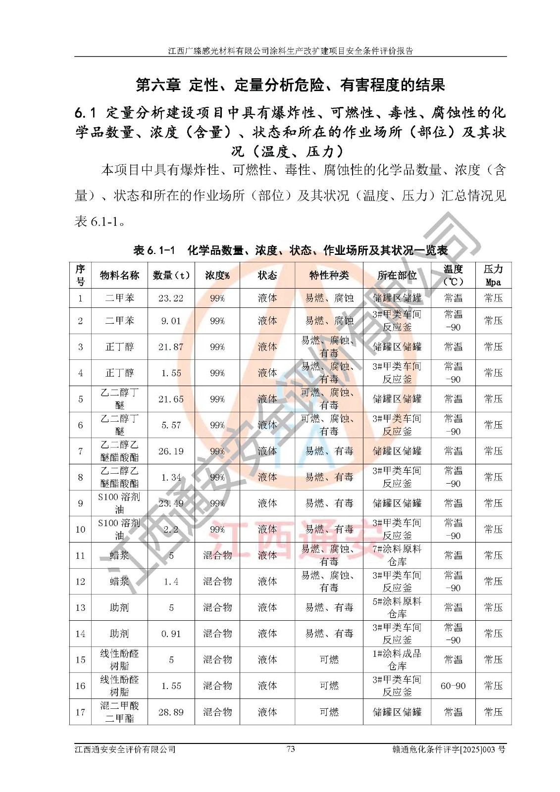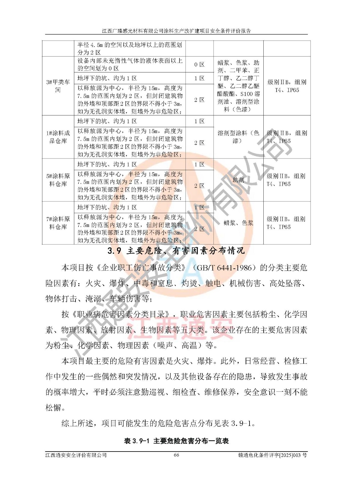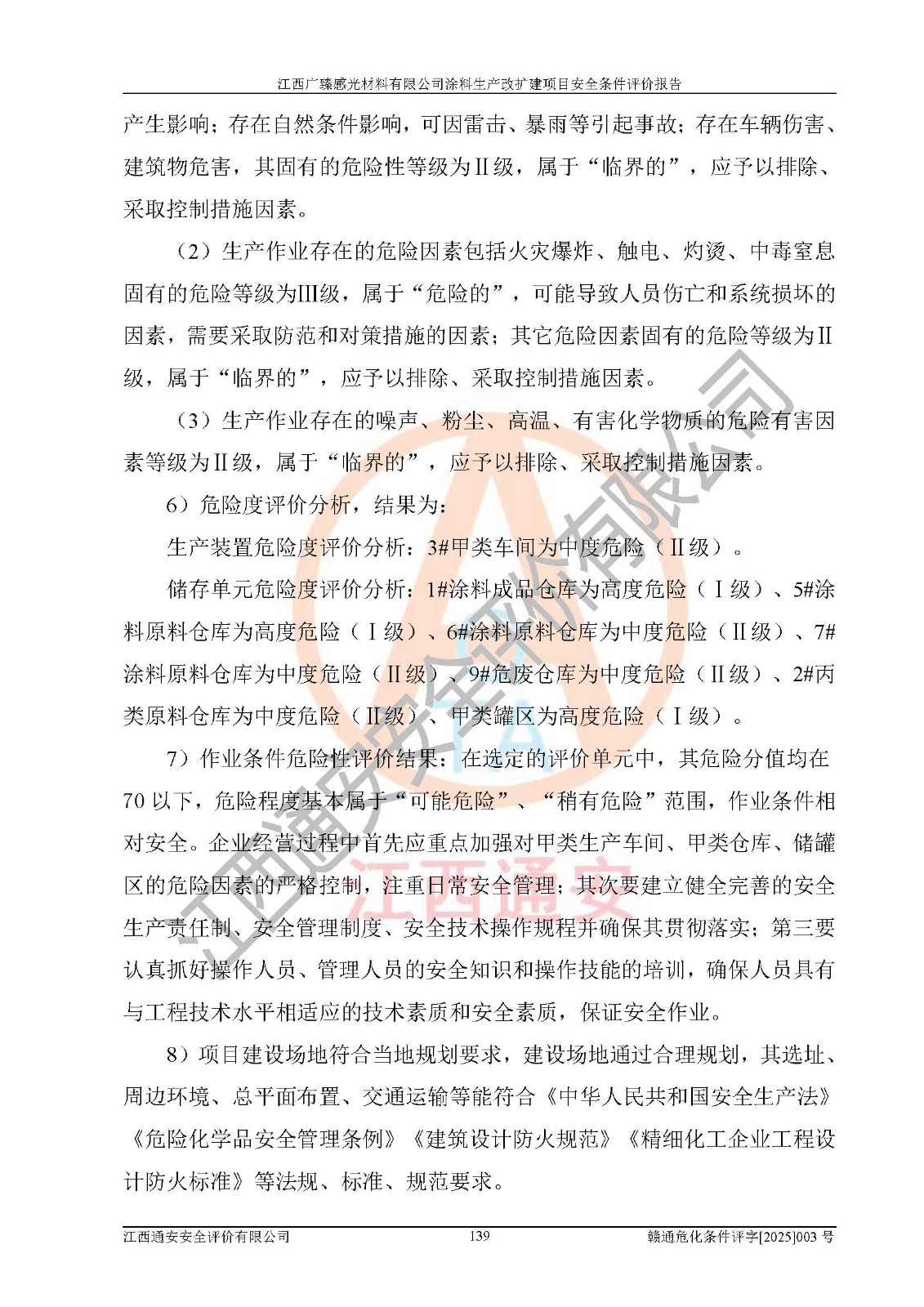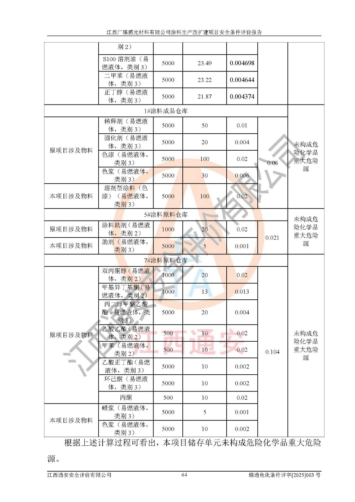 1)本项目取得了龙南市行政审批局下发的《江西省工业企业技术改造项目备案通知书》(项目统一代码为:2408-360727-07-02-3253323)、《建设用地规划许可证》、龙南市自然资源局出具对《关于为江西广臻年产2万吨涂料技改项目出具用地证明的函》的复函,符合地方产业发展规划的要求。 2)根据《危险化学品目录》(2015年版,十部委公告2022年第8号修订),本项目原辅料蜡浆、色浆、助剂、二甲苯、正丁醇、乙二醇丁醚、乙二醇乙醚醋酸酯、S100溶剂油、氮气[压缩的]及产品溶剂型涂料(色漆)属于危险化学品。本项目不涉及监控化学品、剧毒化学品、易制爆化学品、易制毒化学品、重点监管的危险化学品、特别管控危险化学品、高毒物品。本项目不涉及重点监管的危险化工工艺。 3)根据《危险化学品重大危险源辨识》(GB18218-2018),该项目未构成危险化学品重大危险源。 4)项目存在的主要危险因素有:火灾爆炸、容器爆炸、中毒窒息、灼烫、触电、**伤害、机械伤害、高处坠落、物体打击、淹溺等,存在的主要危害因素有:噪声与振动、高温、有害化学物质等;引起事故的原因有人的不安全行为、物的不安全状态、管理缺陷和环境不良。其中*主要的危险有害因素是火灾爆炸。 5)采用预先危险性分析法评价,结果为: (1)通过预先危险(PHA)分析可知,项目厂址及总体布局单元存在周边环境相互影响,发生异常情况,可对周边企业生产经营活动、人员活动产生影响;存在自然条件影响,可因雷击、暴雨等引起事故;存在**伤害、建筑物危害,其固有的危险性等级为Ⅱ级,属于“临界的”,应予以排除、采取控制措施因素。 (2)生产作业存在的危险因素包括火灾爆炸、触电、灼烫、中毒窒息固有的危险等级为Ⅲ级,属于“危险的”,可能导致人员伤亡和系统损坏的因素,需要采取防范和对策措施的因素;其它危险因素固有的危险等级为Ⅱ级,属于“临界的”,应予以排除、采取控制措施因素。 (3)生产作业存在的噪声、粉尘、高温、有害化学物质的危险有害因素等级为Ⅱ级,属于“临界的”,应予以排除、采取控制措施因素。 6)危险度评价分析,结果为: 生产装置危险度评价分析:3#甲类车间为中度危险(Ⅱ级)。 储存单元危险度评价分析:1#涂料成品仓库为**危险(Ⅰ级)、5#涂料原料仓库为**危险(Ⅰ级)、6#涂料原料仓库为中度危险(Ⅱ级)、7#涂料原料仓库为中度危险(Ⅱ级)、9#危废仓库为中度危险(Ⅱ级)、2#丙类原料仓库为中度危险(Ⅱ级)、甲类罐区为**危险(Ⅰ级)。 7)作业条件危险性评价结果:在选定的评价单元中,其危险分值均在70以下,危险程度基本属于“可能危险”、“稍有危险”范围,作业条件相对安全。企业经营过程中首先应重点加强对甲类生产车间、甲类仓库、储罐区的危险因素的严格控制,注重日常安全管理;其次要建立健全完善的安全生产责任制、安全管理制度、安全技术操作规程并**其贯彻落实;第三要认真抓好操作人员、管理人员的安全知识和操作技能的培训,**人员具有与工程技术水平相适应的技术素质和安全素质,**安全作业。 8)项目建设场地符合当地规划要求,建设场地通过合理规划,其选址、周边环境、总平面布置、交通运输等能符合《中华人民共和国安全生产法》《危险化学品安全管理条例》《建筑设计防火规范》《精细化工企业工程设计防火标准》等法规、标准、规范要求。 厂址地区地震活动相对较弱,灾害性天气出现频率稍高,自然灾害对项目建设具有**影响,通过采取相应的防护措施,自然条件适宜建设。 9)建设项目符合**产业政策的要求;选择工艺为现行成熟工艺,其安全可靠性可得到**。 10)本报告已根据有关安全生产法律、法规、规章和**标准、行业标准,并严格执行省委办公厅省**办公厅《关于全面加强危险化学品安全生产工作的实施意见》(赣办发[2020]32号)及鄱阳湖生态经济区、长江经济带、“五河一湖”相关政策规定,客观、公正、科学地进行安全评价,项目符合《江西省应急管理厅关于印发《江西省危险化学品建设项目安全监督管理实施细则》(试行)的通知》(赣应急字[2021]100号)的要求。 11)本报告结合工艺特征,提出应采取的对应的自动化控制系统及自动化实施方案,满足《江西省应急管理厅关于印发《江西省化工企业自动化提升实施方案》(试行)的通知》(赣应急字[2021]190号)的要求。 综上所述:江西广臻感光材料有限公司涂料生产改扩建项目的产业政策、安全条件、厂址、总体布局、主要技术和工艺、装置、设施、配套和辅助工程、安全管理等均满足安全生产相关法律法规、标准规范的要求,该建设项目的危险、有害因素可得到**控制,风险在可接受范围内,具有**的本质安全水平。企业应认真落实本报告提出的安全对策与建议,在下一步设计、建设施工过程中严把质量关、严格施工安全管理和检查,使各项安全措施落实到实处,且严格执行建设项目安全设施“三同时”的规定,建立**的事故应急体系和措施。 |