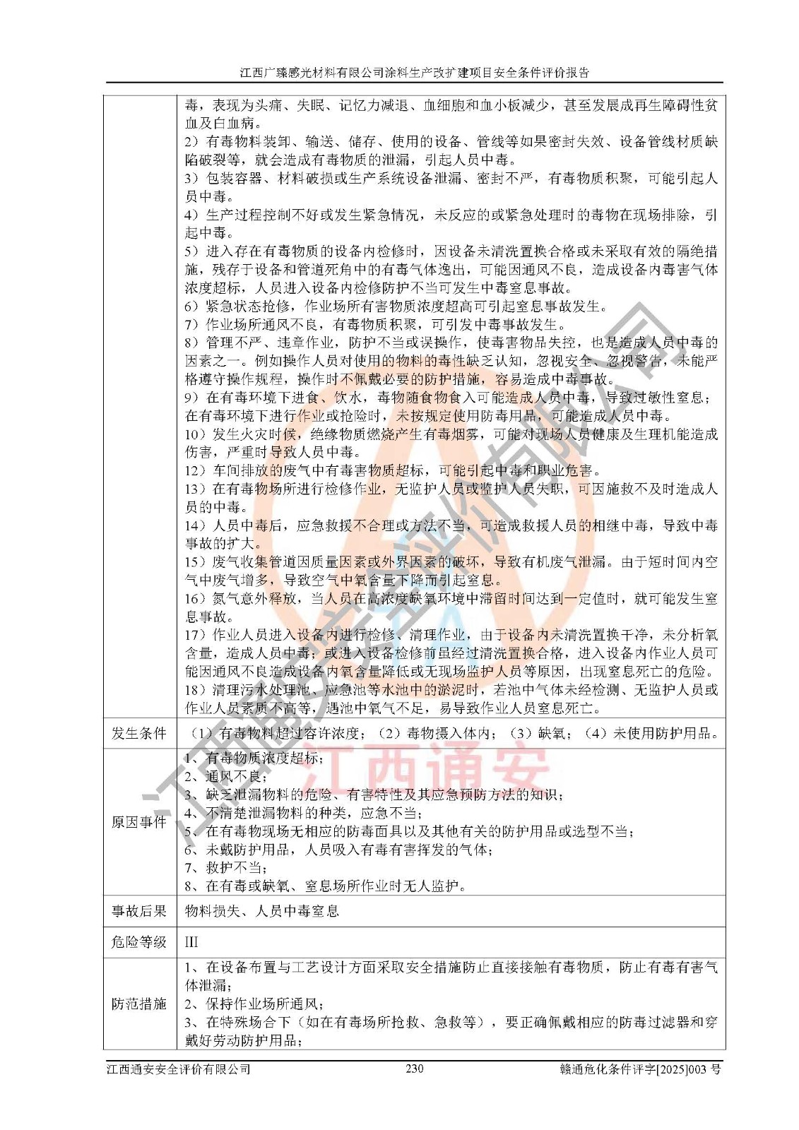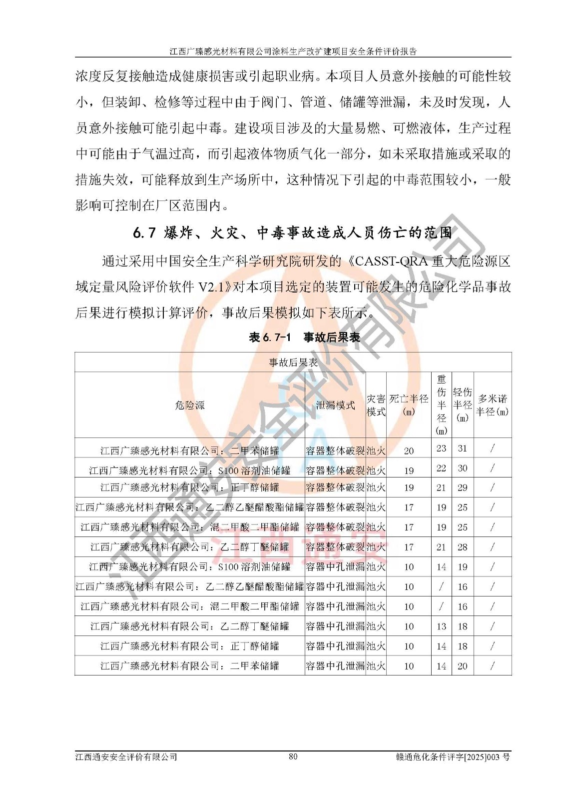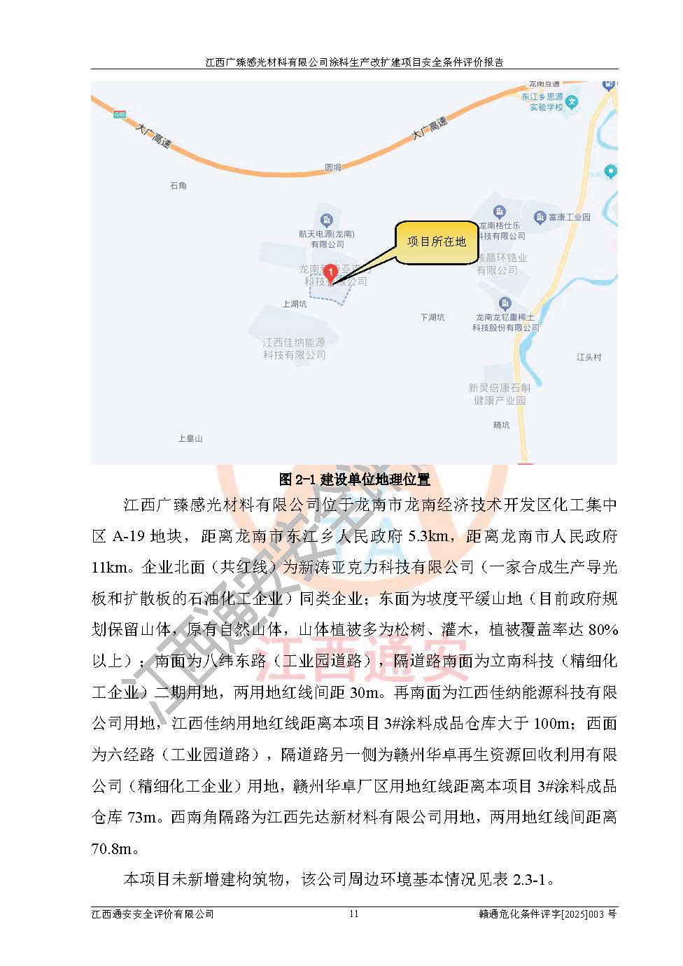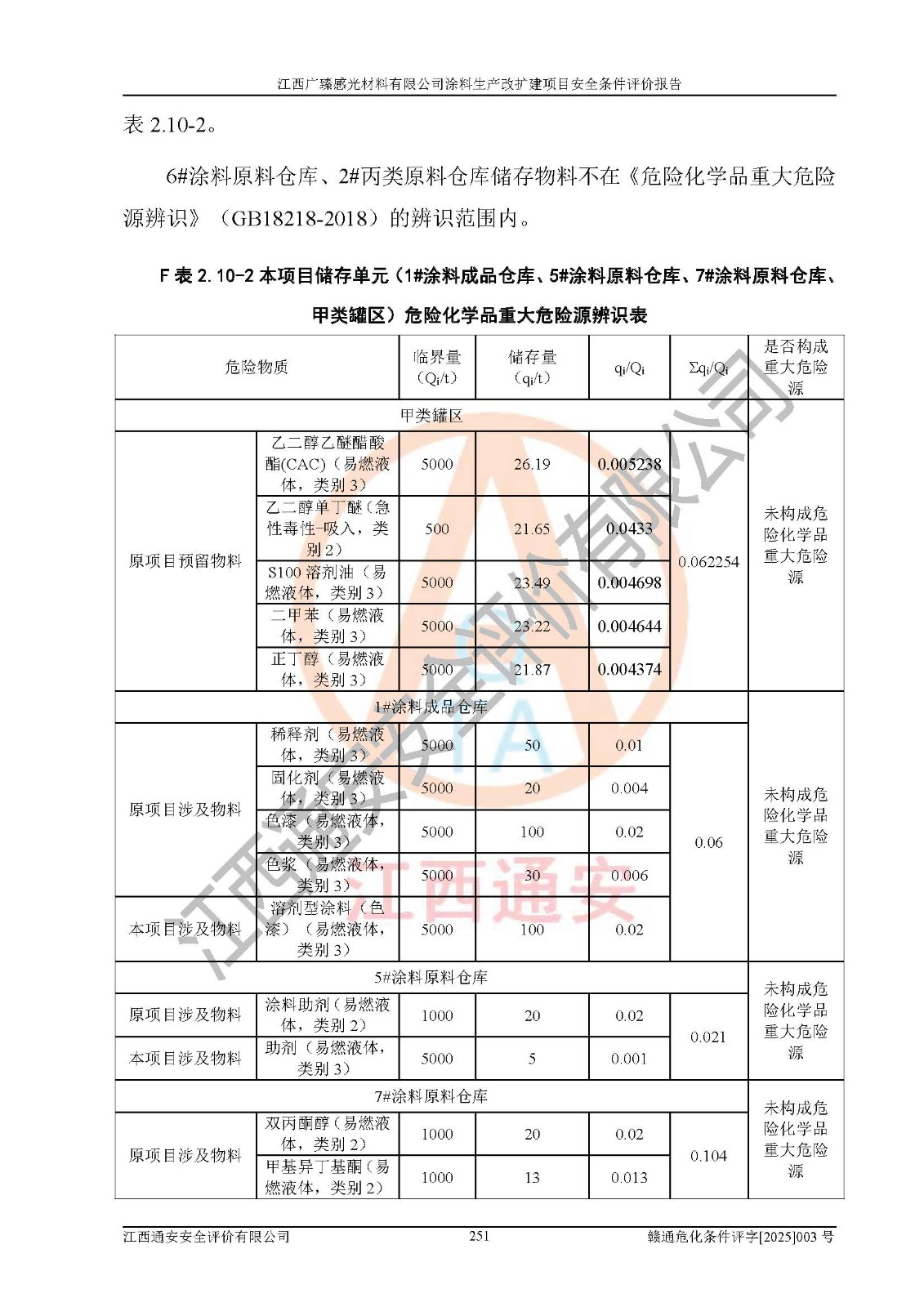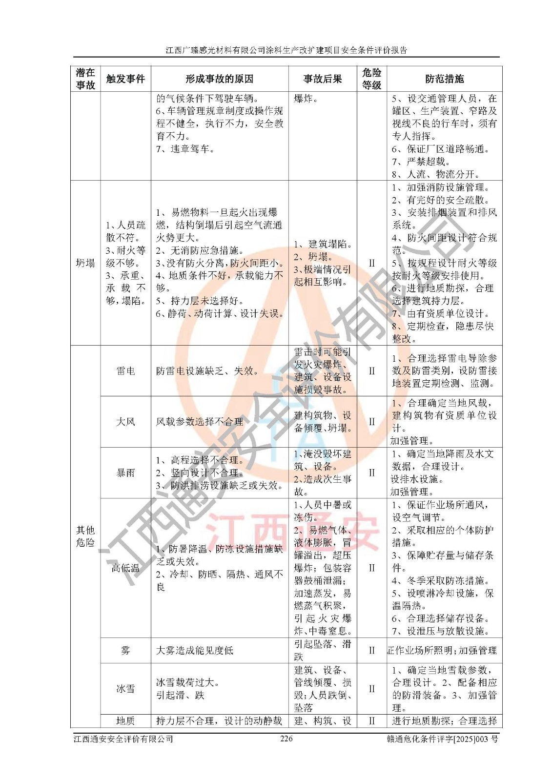 1)本项目取得了龙南市行政审批局下发的《江西省工业企业技术改造项目备案通知书》(项目统一代码为:2408-360727-07-02-3253323)、《建设用地规划许可证》、龙南市自然资源局出具对《关于为江西广臻年产2万吨涂料技改项目出具用地证明的函》的复函,符合地方产业发展规划的要求。 2)根据《危险化学品目录》(2015年版,十部委公告2022年第8号修订),本项目原辅料蜡浆、色浆、助剂、二甲苯、正丁醇、乙二醇丁醚、乙二醇乙醚醋酸酯、S100溶剂油、氮气[压缩的]及产品溶剂型涂料(色漆)属于危险化学品。本项目不涉及监控化学品、剧毒化学品、易制爆化学品、易制毒化学品、重点监管的危险化学品、特别管控危险化学品、高毒物品。本项目不涉及重点监管的危险化工工艺。 3)根据《危险化学品重大危险源辨识》(GB18218-2018),该项目未构成危险化学品重大危险源。 4)项目存在的主要危险因素有:火灾爆炸、容器爆炸、中毒窒息、灼烫、触电、**伤害、机械伤害、高处坠落、物体打击、淹溺等,存在的主要危害因素有:噪声与振动、高温、有害化学物质等;引起事故的原因有人的不安全行为、物的不安全状态、管理缺陷和环境不良。其中*主要的危险有害因素是火灾爆炸。 5)采用预先危险性分析法评价,结果为: (1)通过预先危险(PHA)分析可知,项目厂址及总体布局单元存在周边环境相互影响,发生异常情况,可对周边企业生产经营活动、人员活动产生影响;存在自然条件影响,可因雷击、暴雨等引起事故;存在**伤害、建筑物危害,其固有的危险性等级为Ⅱ级,属于“临界的”,应予以排除、采取控制措施因素。 (2)生产作业存在的危险因素包括火灾爆炸、触电、灼烫、中毒窒息固有的危险等级为Ⅲ级,属于“危险的”,可能导致人员伤亡和系统损坏的因素,需要采取防范和对策措施的因素;其它危险因素固有的危险等级为Ⅱ级,属于“临界的”,应予以排除、采取控制措施因素。 (3)生产作业存在的噪声、粉尘、高温、有害化学物质的危险有害因素等级为Ⅱ级,属于“临界的”,应予以排除、采取控制措施因素。 6)危险度评价分析,结果为: 生产装置危险度评价分析:3#甲类车间为中度危险(Ⅱ级)。 储存单元危险度评价分析:1#涂料成品仓库为**危险(Ⅰ级)、5#涂料原料仓库为**危险(Ⅰ级)、6#涂料原料仓库为中度危险(Ⅱ级)、7#涂料原料仓库为中度危险(Ⅱ级)、9#危废仓库为中度危险(Ⅱ级)、2#丙类原料仓库为中度危险(Ⅱ级)、甲类罐区为**危险(Ⅰ级)。 7)作业条件危险性评价结果:在选定的评价单元中,其危险分值均在70以下,危险程度基本属于“可能危险”、“稍有危险”范围,作业条件相对安全。企业经营过程中首先应重点加强对甲类生产车间、甲类仓库、储罐区的危险因素的严格控制,注重日常安全管理;其次要建立健全完善的安全生产责任制、安全管理制度、安全技术操作规程并**其贯彻落实;第三要认真抓好操作人员、管理人员的安全知识和操作技能的培训,**人员具有与工程技术水平相适应的技术素质和安全素质,**安全作业。 8)项目建设场地符合当地规划要求,建设场地通过合理规划,其选址、周边环境、总平面布置、交通运输等能符合《中华人民共和国安全生产法》《危险化学品安全管理条例》《建筑设计防火规范》《精细化工企业工程设计防火标准》等法规、标准、规范要求。 厂址地区地震活动相对较弱,灾害性天气出现频率稍高,自然灾害对项目建设具有**影响,通过采取相应的防护措施,自然条件适宜建设。 9)建设项目符合**产业政策的要求;选择工艺为现行成熟工艺,其安全可靠性可得到**。 10)本报告已根据有关安全生产法律、法规、规章和**标准、行业标准,并严格执行省委办公厅省**办公厅《关于全面加强危险化学品安全生产工作的实施意见》(赣办发[2020]32号)及鄱阳湖生态经济区、长江经济带、“五河一湖”相关政策规定,客观、公正、科学地进行安全评价,项目符合《江西省应急管理厅关于印发《江西省危险化学品建设项目安全监督管理实施细则》(试行)的通知》(赣应急字[2021]100号)的要求。 11)本报告结合工艺特征,提出应采取的对应的自动化控制系统及自动化实施方案,满足《江西省应急管理厅关于印发《江西省化工企业自动化提升实施方案》(试行)的通知》(赣应急字[2021]190号)的要求。 综上所述:江西广臻感光材料有限公司涂料生产改扩建项目的产业政策、安全条件、厂址、总体布局、主要技术和工艺、装置、设施、配套和辅助工程、安全管理等均满足安全生产相关法律法规、标准规范的要求,该建设项目的危险、有害因素可得到**控制,风险在可接受范围内,具有**的本质安全水平。企业应认真落实本报告提出的安全对策与建议,在下一步设计、建设施工过程中严把质量关、严格施工安全管理和检查,使各项安全措施落实到实处,且严格执行建设项目安全设施“三同时”的规定,建立**的事故应急体系和措施。 |