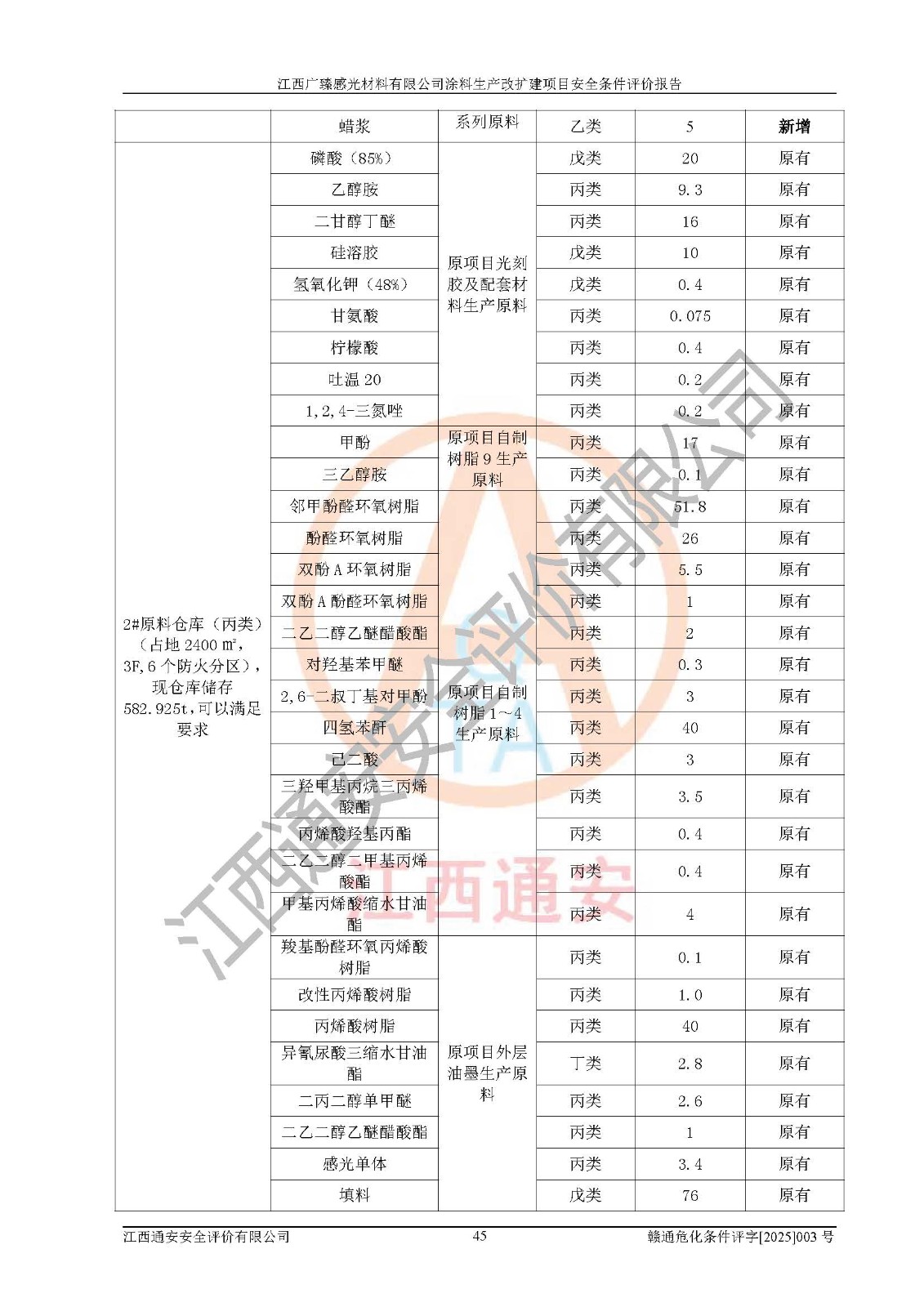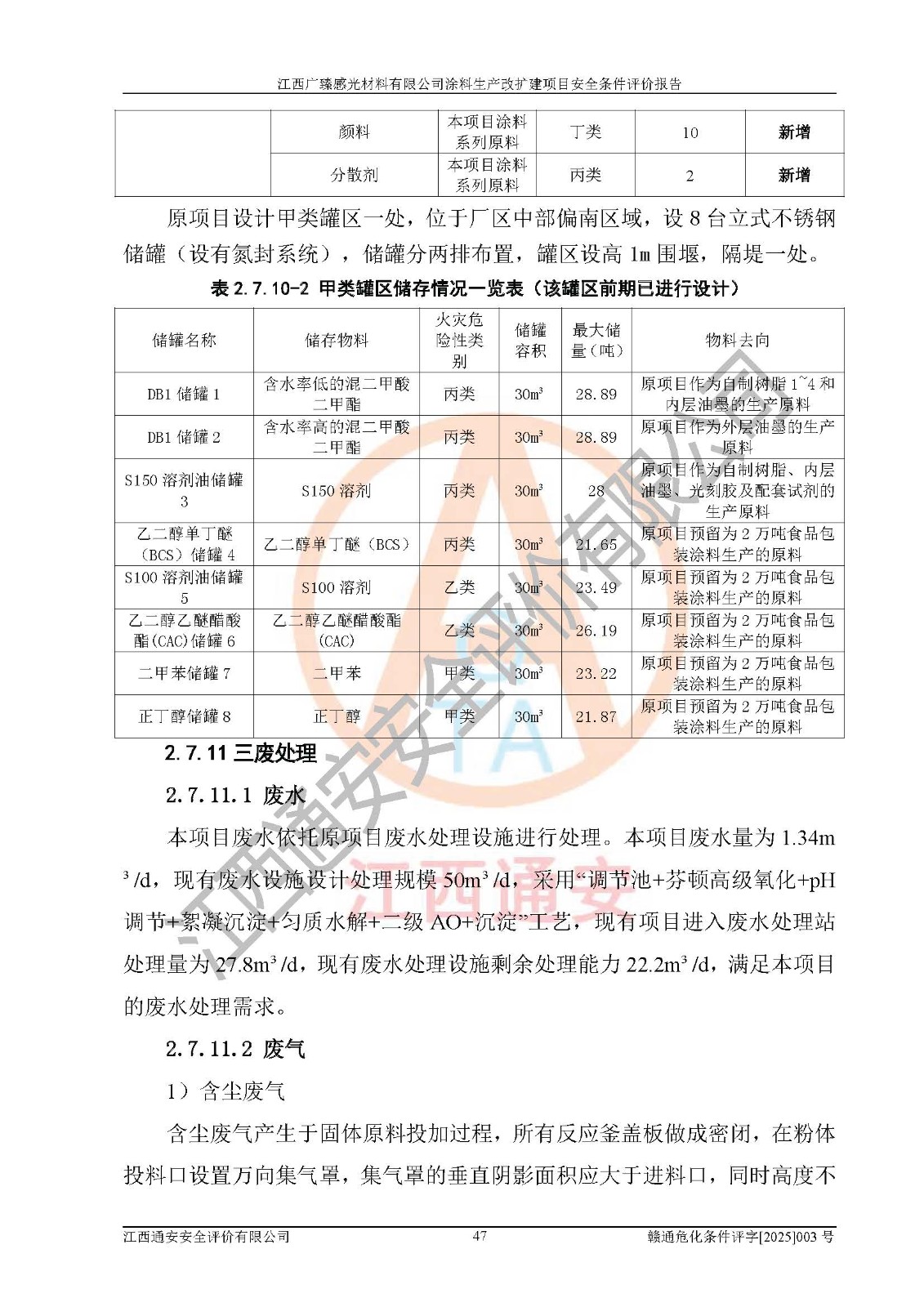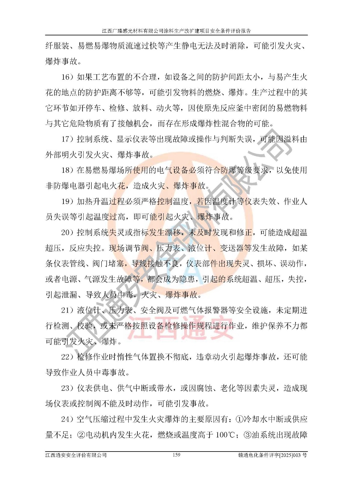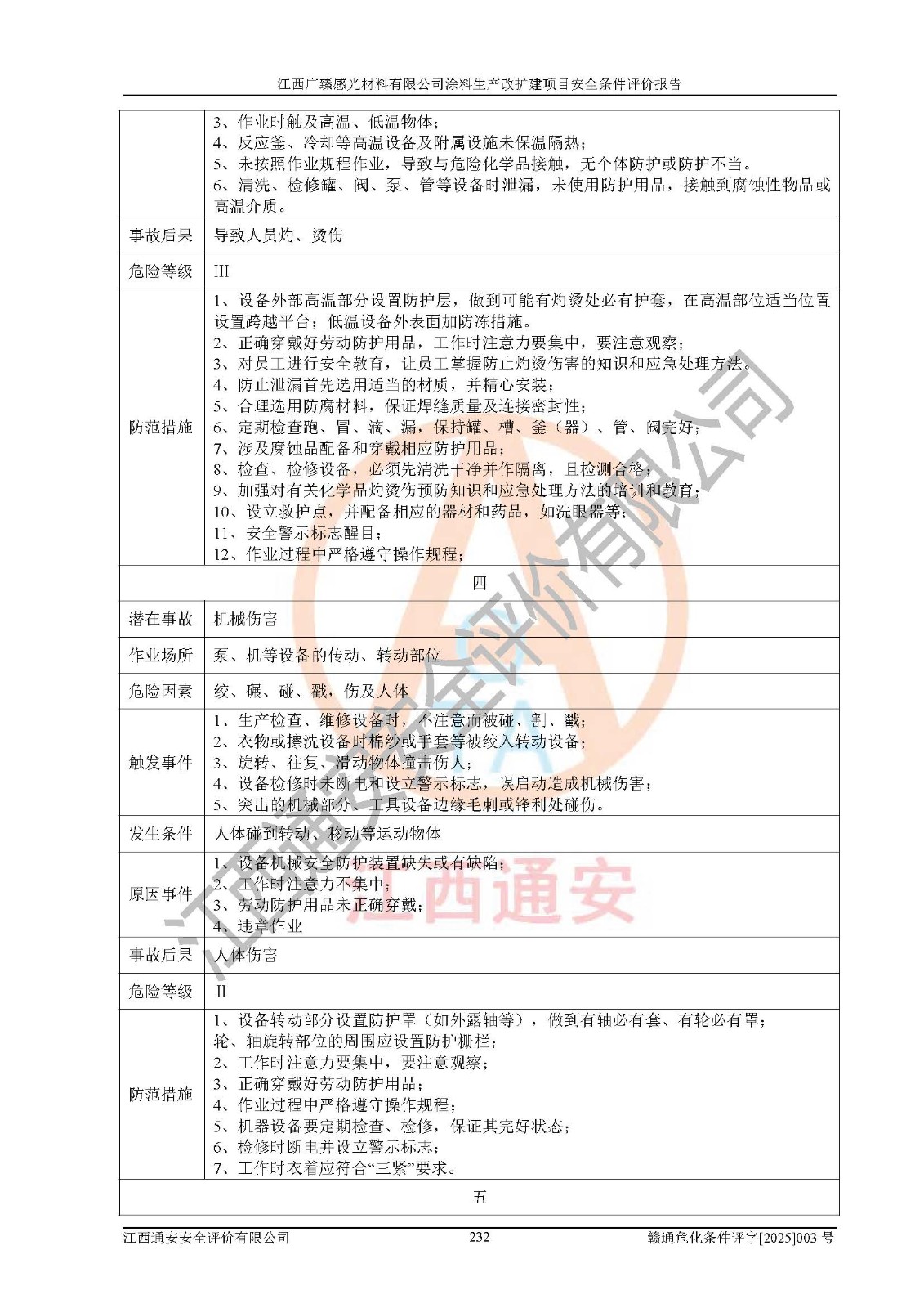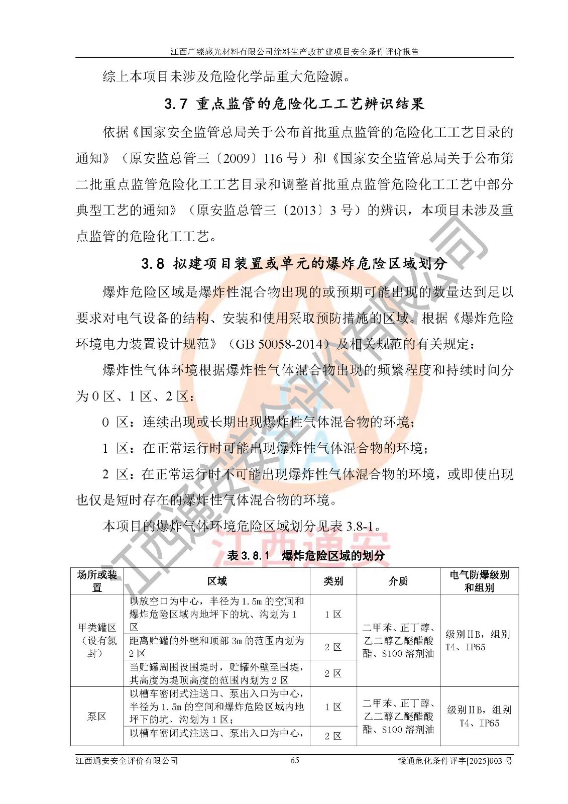 1)本项目取得了龙南市行政审批局下发的《江西省工业企业技术改造项目备案通知书》(项目统一代码为:2408-360727-07-02-3253323)、《建设用地规划许可证》、龙南市自然资源局出具对《关于为江西广臻年产2万吨涂料技改项目出具用地证明的函》的复函,符合地方产业发展规划的要求。 2)根据《危险化学品目录》(2015年版,十部委公告2022年第8号修订),本项目原辅料蜡浆、色浆、助剂、二甲苯、正丁醇、乙二醇丁醚、乙二醇乙醚醋酸酯、S100溶剂油、氮气[压缩的]及产品溶剂型涂料(色漆)属于危险化学品。本项目不涉及监控化学品、剧毒化学品、易制爆化学品、易制毒化学品、重点监管的危险化学品、特别管控危险化学品、高毒物品。本项目不涉及重点监管的危险化工工艺。 3)根据《危险化学品重大危险源辨识》(GB18218-2018),该项目未构成危险化学品重大危险源。 4)项目存在的主要危险因素有:火灾爆炸、容器爆炸、中毒窒息、灼烫、触电、**伤害、机械伤害、高处坠落、物体打击、淹溺等,存在的主要危害因素有:噪声与振动、高温、有害化学物质等;引起事故的原因有人的不安全行为、物的不安全状态、管理缺陷和环境不良。其中*主要的危险有害因素是火灾爆炸。 5)采用预先危险性分析法评价,结果为: (1)通过预先危险(PHA)分析可知,项目厂址及总体布局单元存在周边环境相互影响,发生异常情况,可对周边企业生产经营活动、人员活动产生影响;存在自然条件影响,可因雷击、暴雨等引起事故;存在**伤害、建筑物危害,其固有的危险性等级为Ⅱ级,属于“临界的”,应予以排除、采取控制措施因素。 (2)生产作业存在的危险因素包括火灾爆炸、触电、灼烫、中毒窒息固有的危险等级为Ⅲ级,属于“危险的”,可能导致人员伤亡和系统损坏的因素,需要采取防范和对策措施的因素;其它危险因素固有的危险等级为Ⅱ级,属于“临界的”,应予以排除、采取控制措施因素。 (3)生产作业存在的噪声、粉尘、高温、有害化学物质的危险有害因素等级为Ⅱ级,属于“临界的”,应予以排除、采取控制措施因素。 6)危险度评价分析,结果为: 生产装置危险度评价分析:3#甲类车间为中度危险(Ⅱ级)。 储存单元危险度评价分析:1#涂料成品仓库为**危险(Ⅰ级)、5#涂料原料仓库为**危险(Ⅰ级)、6#涂料原料仓库为中度危险(Ⅱ级)、7#涂料原料仓库为中度危险(Ⅱ级)、9#危废仓库为中度危险(Ⅱ级)、2#丙类原料仓库为中度危险(Ⅱ级)、甲类罐区为**危险(Ⅰ级)。 7)作业条件危险性评价结果:在选定的评价单元中,其危险分值均在70以下,危险程度基本属于“可能危险”、“稍有危险”范围,作业条件相对安全。企业经营过程中首先应重点加强对甲类生产车间、甲类仓库、储罐区的危险因素的严格控制,注重日常安全管理;其次要建立健全完善的安全生产责任制、安全管理制度、安全技术操作规程并**其贯彻落实;第三要认真抓好操作人员、管理人员的安全知识和操作技能的培训,**人员具有与工程技术水平相适应的技术素质和安全素质,**安全作业。 8)项目建设场地符合当地规划要求,建设场地通过合理规划,其选址、周边环境、总平面布置、交通运输等能符合《中华人民共和国安全生产法》《危险化学品安全管理条例》《建筑设计防火规范》《精细化工企业工程设计防火标准》等法规、标准、规范要求。 厂址地区地震活动相对较弱,灾害性天气出现频率稍高,自然灾害对项目建设具有**影响,通过采取相应的防护措施,自然条件适宜建设。 9)建设项目符合**产业政策的要求;选择工艺为现行成熟工艺,其安全可靠性可得到**。 10)本报告已根据有关安全生产法律、法规、规章和**标准、行业标准,并严格执行省委办公厅省**办公厅《关于全面加强危险化学品安全生产工作的实施意见》(赣办发[2020]32号)及鄱阳湖生态经济区、长江经济带、“五河一湖”相关政策规定,客观、公正、科学地进行安全评价,项目符合《江西省应急管理厅关于印发《江西省危险化学品建设项目安全监督管理实施细则》(试行)的通知》(赣应急字[2021]100号)的要求。 11)本报告结合工艺特征,提出应采取的对应的自动化控制系统及自动化实施方案,满足《江西省应急管理厅关于印发《江西省化工企业自动化提升实施方案》(试行)的通知》(赣应急字[2021]190号)的要求。 综上所述:江西广臻感光材料有限公司涂料生产改扩建项目的产业政策、安全条件、厂址、总体布局、主要技术和工艺、装置、设施、配套和辅助工程、安全管理等均满足安全生产相关法律法规、标准规范的要求,该建设项目的危险、有害因素可得到**控制,风险在可接受范围内,具有**的本质安全水平。企业应认真落实本报告提出的安全对策与建议,在下一步设计、建设施工过程中严把质量关、严格施工安全管理和检查,使各项安全措施落实到实处,且严格执行建设项目安全设施“三同时”的规定,建立**的事故应急体系和措施。 |