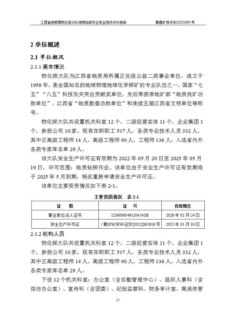 项目简介 | 江西省地质局物化探大队(以下简称“物化探大队”)为江西省地质局所属正处级公益二类事业单位,成立于1958年,是****的地球物理地球化学探矿的专业队伍之一,**“七五”“八五”科技攻关突出贡献奖单位,先后荣获原地矿部“地质找矿功勋单位”、江西省“地质勘查功勋单位”和连续五届江西省文明单位等称号。 物化探大队主要承担**地球物理勘查、地球化学勘查理论与应用研究,提供电法、磁法、重力、地震、地球化学调查勘查等工作。全队现有在职职工517人,各类专业技术人员332人,其中正高级工程师14人,高级工程师90人,工程师136人,入选**外各类专家库名单29人。持有地质灾害治理工程与危险性评估、测绘地理信息、工程勘察和环境污染治理等类别资质18项,其中**资质5项。共设置机关科室12个,二级经营实体11个,企业集团1个,参股公司10家。 该大队安全生产许可证**期为2022年05月20日至2025年05月19日,许可范围:地质钻探作业。按照《安全生产法》、《矿山安全法》和《关于做好非煤矿山企业安全生产许可证延期换证工作的通知》等有关规定,该单位需要延期换证,换证前应进行安全现状评价。 | |||||