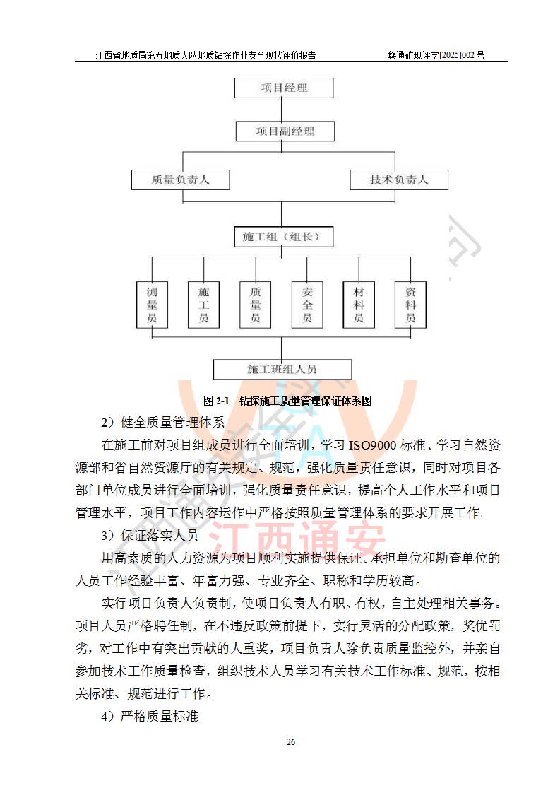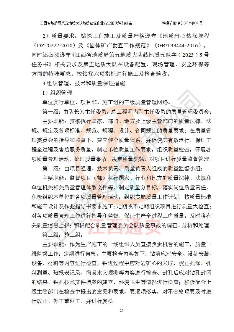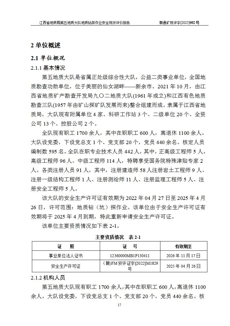 项目简介 | 江西省地质局第五地质大队(以下简称“第五地质大队”)是省属正处级综合性大队,公益二类事业单位,**地质勘查功勋单位,位于美丽的仙女湖畔——新余市。2021年10月,由江西省地质矿产勘查开发局九〇二地质大队(1961年成立)和江西有色地质勘查三队(1957年由矿山探矿队发展而来)整合组建而成。隶属于江西省地质局,大队现有附属单位4家、科研工作站3个、二级单位20个、全资公司13个、控股公司2个。 全队现有职工1700余人,其中在职职工600人,离退休1100余人。大队设党委,下设党总支1个、党支部20个,党员440余名。核定人员编制数595名。全队在职专业技术人员442人,其中,正高级工程师5人。高级工程师96人、中级工程师114人,特聘享受***特殊津贴专家2人。各类注册人员91人,其中,注册建造师58人注册岩土工程师9人、注册**结构工程师1人、注册测绘师11人、注册监理工程师5人、注册安全工程师5人。 该大队的安全生产许可证**期为2022年04月27日至2025年4月26日,许可范围:地质钻(坑)探作业。按照《安全生产法》、《矿山安全法》和《关于做好非煤矿山企业安全生产许可证延期换证工作的通知》等有关规定,该单位需要延期换证,换证前应进行安全现状评价。 | |||||