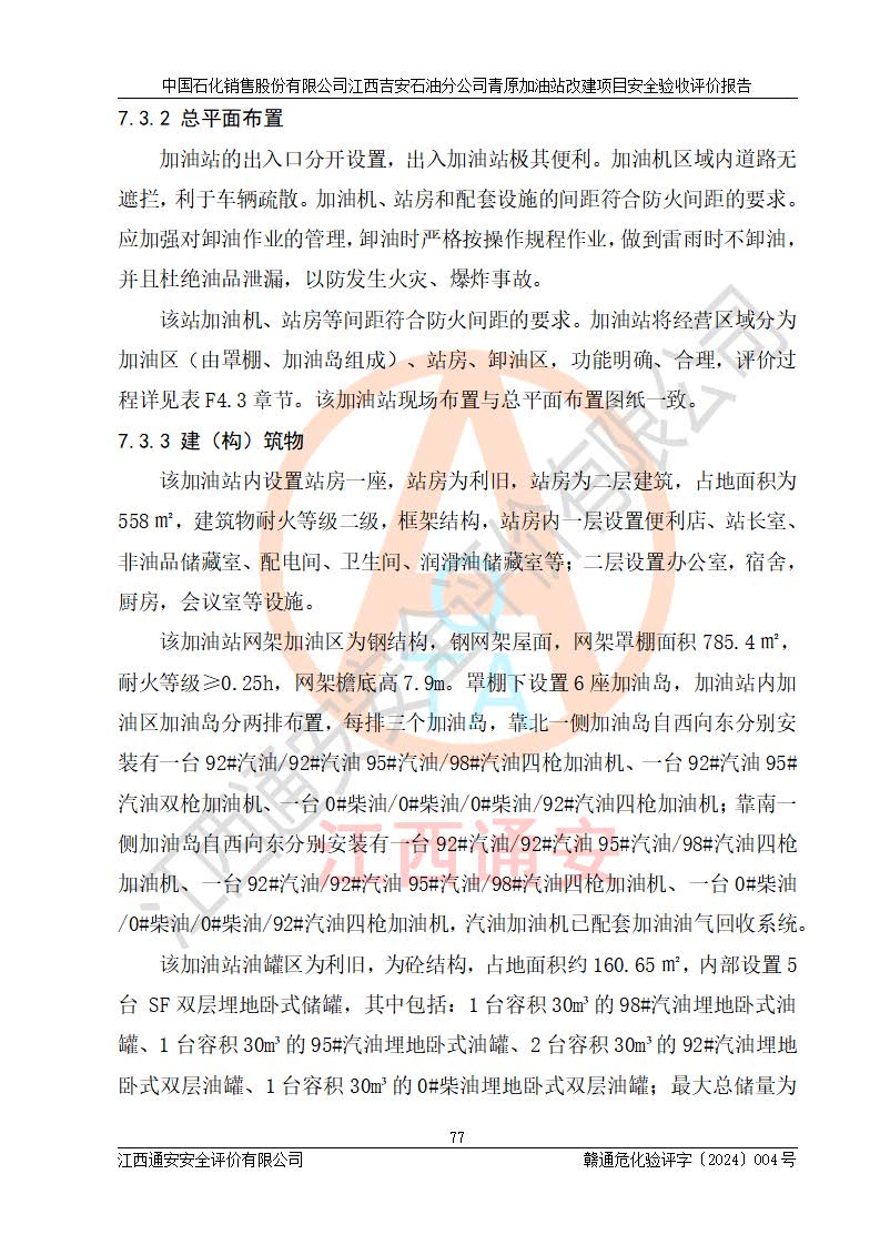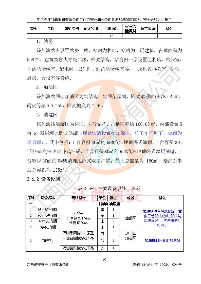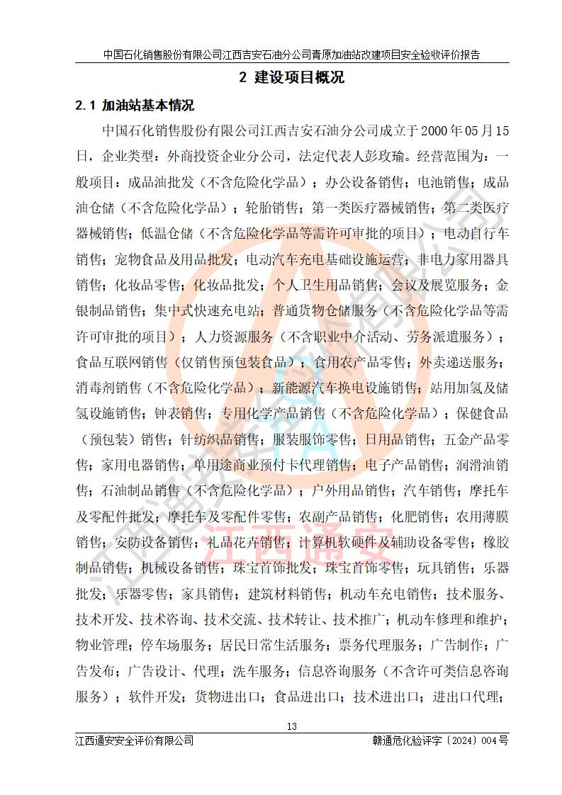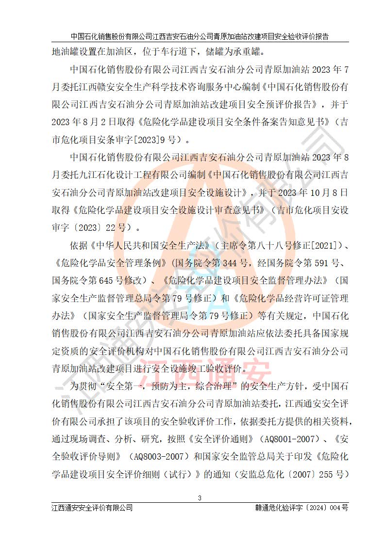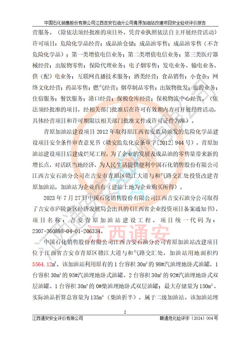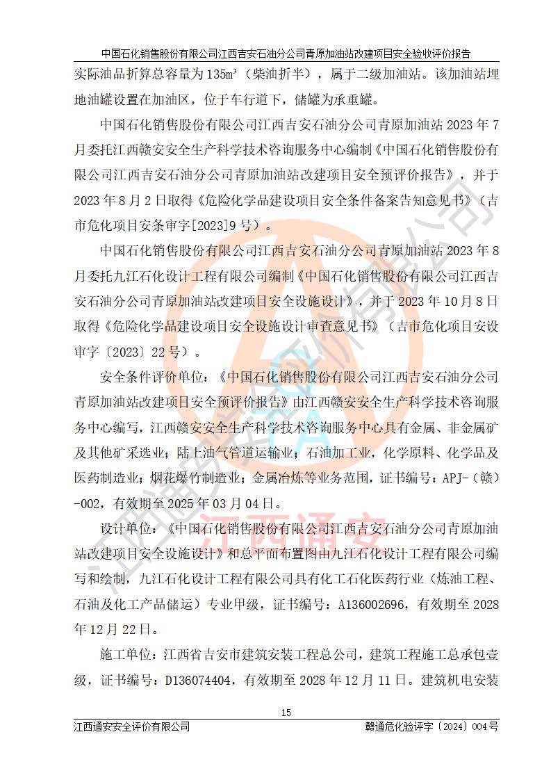 评价报告名称 | 中国石化销售股份有限公司江西吉安石油分公司青原加油站改建项目安全验收状评价报告 | |||
