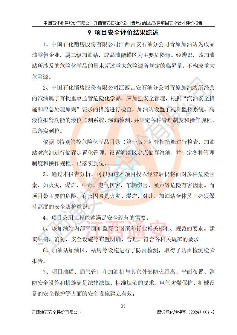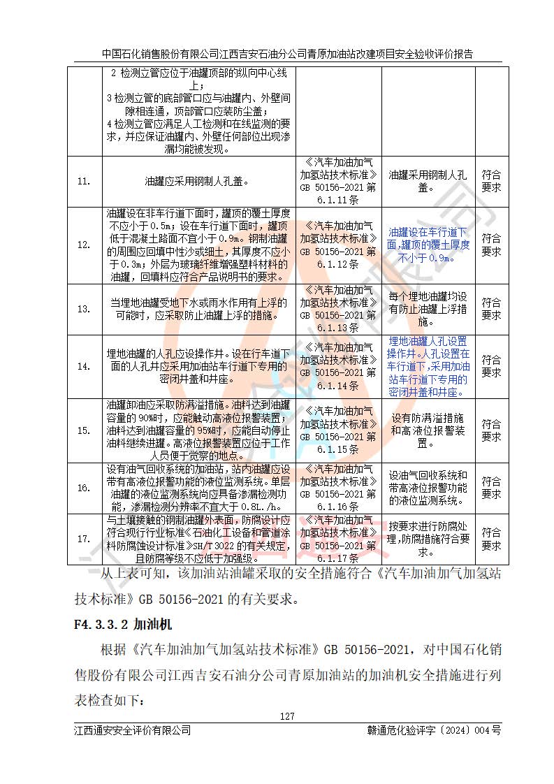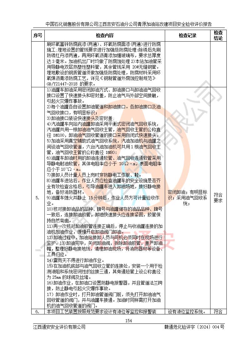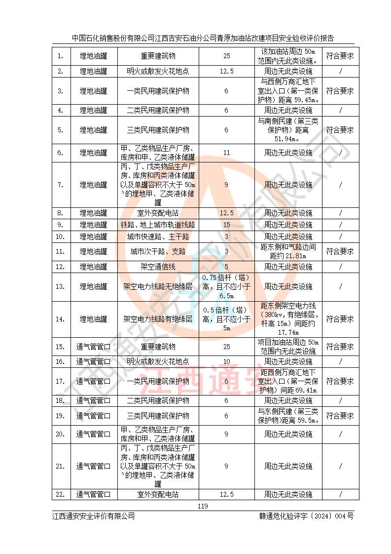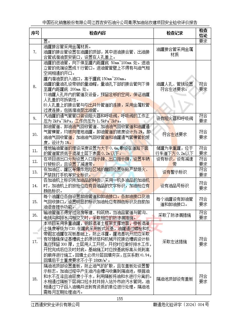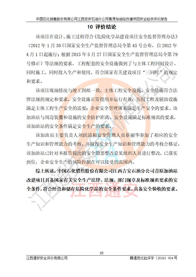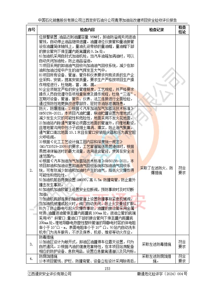 评价结论 | 中国石化销售股份有限公司江西吉安石油分公司青原加油站改建项目具备**有关安全生产法律、法规、部门规章及标准规范要求的安全条件,符合经营和储存危险化学品的安全条件要求,具备安全验收的要求。 | |||
