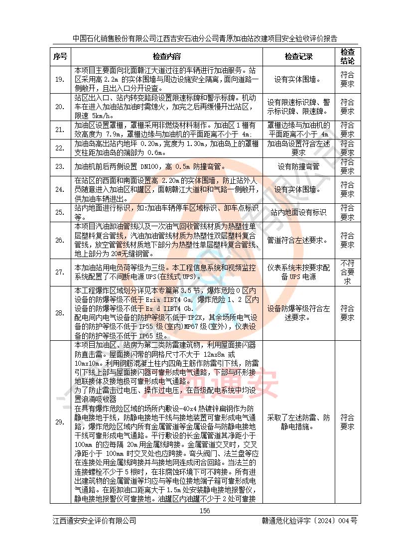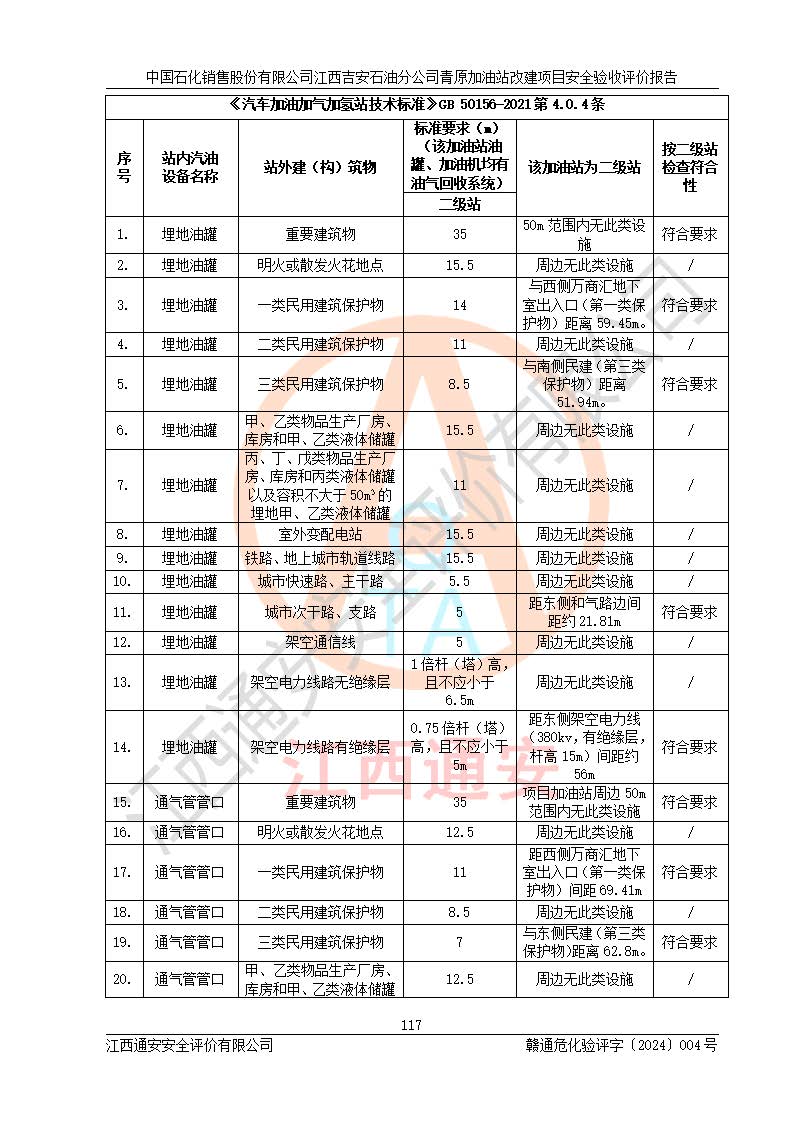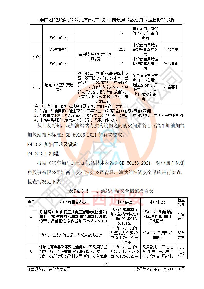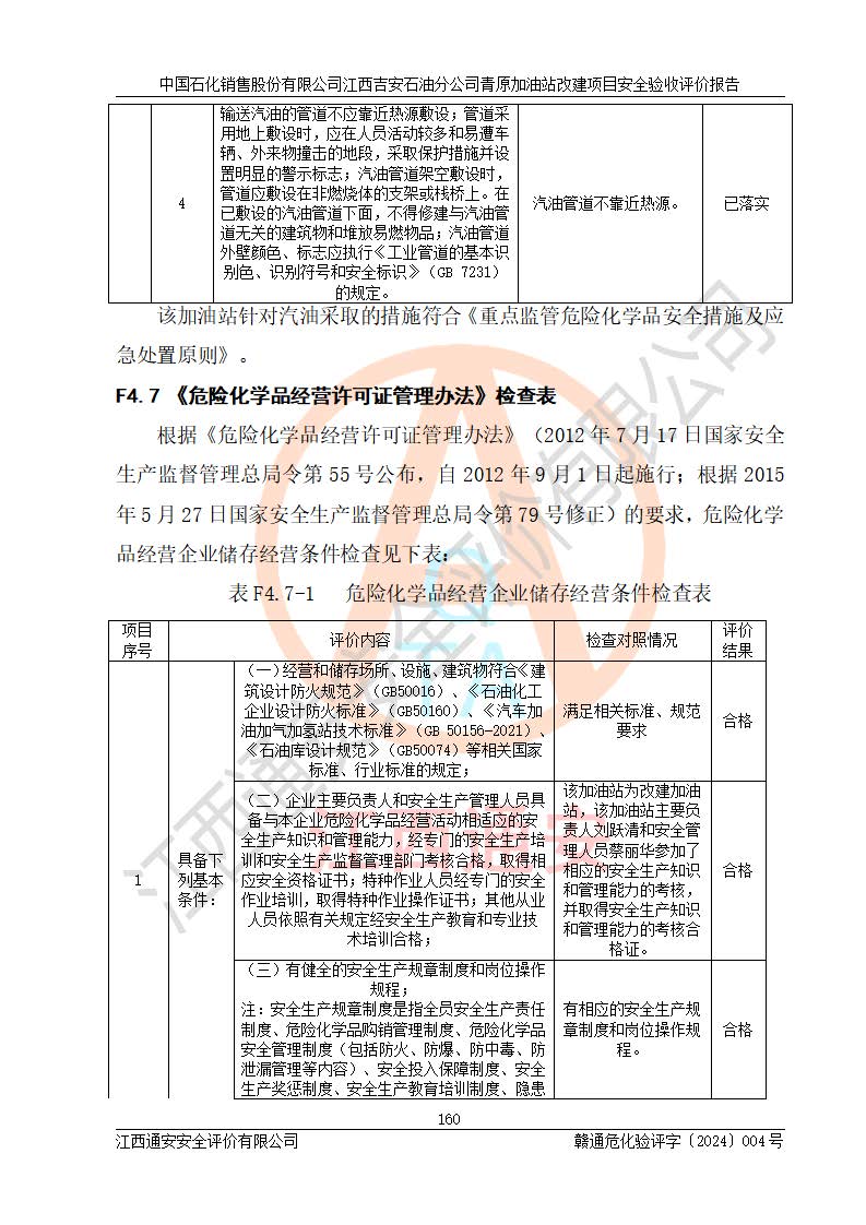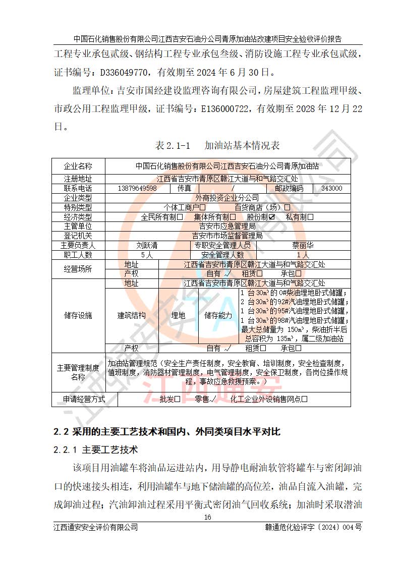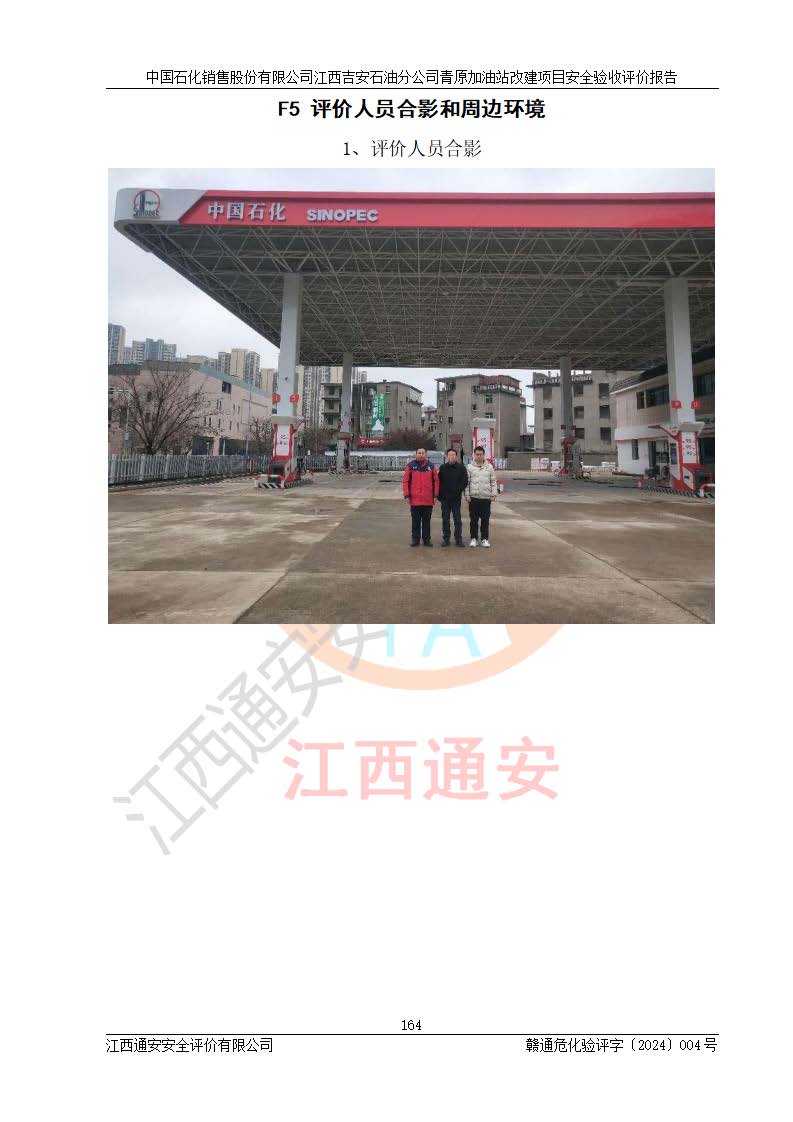 评价结论 | 中国石化销售股份有限公司江西吉安石油分公司青原加油站改建项目具备**有关安全生产法律、法规、部门规章及标准规范要求的安全条件,符合经营和储存危险化学品的安全条件要求,具备安全验收的要求。 | |||