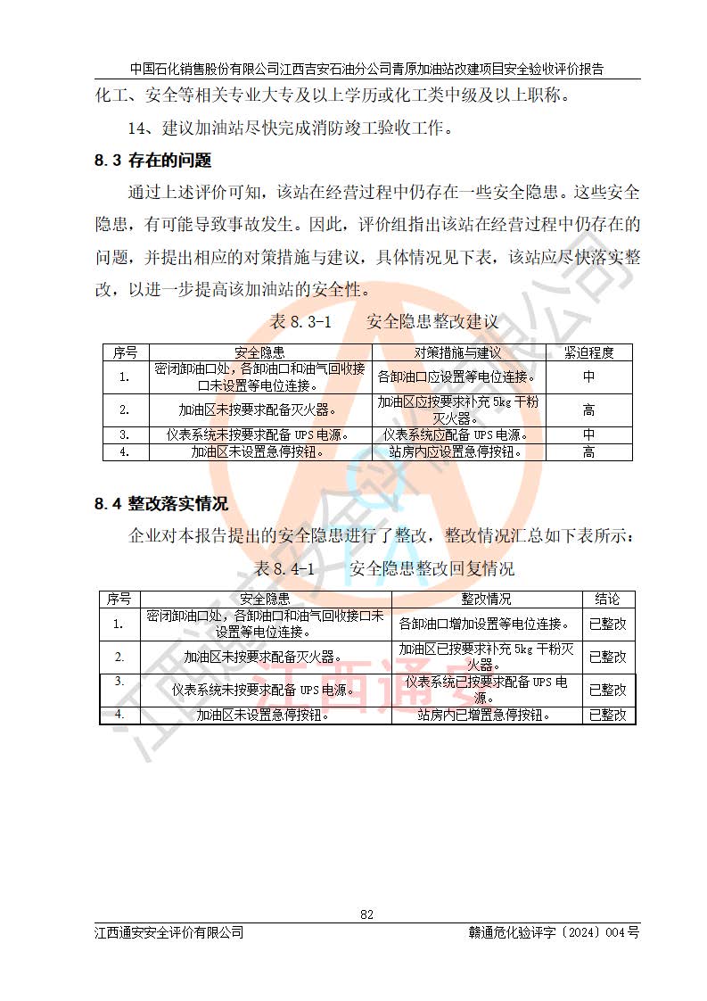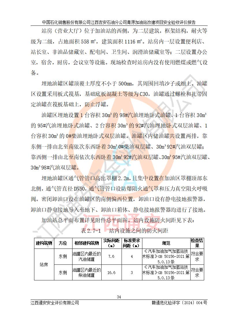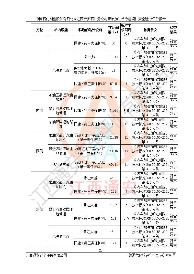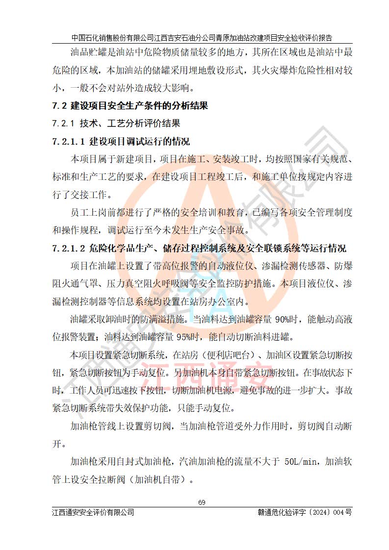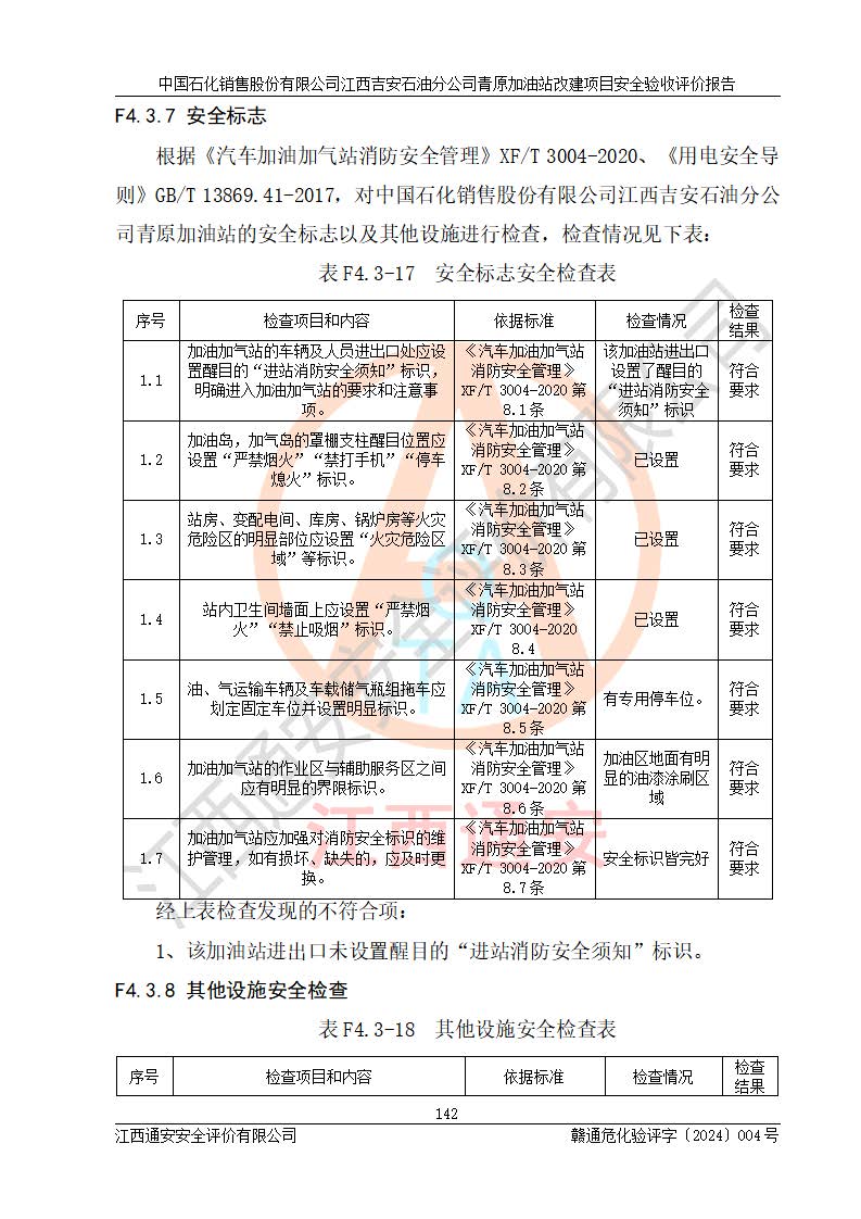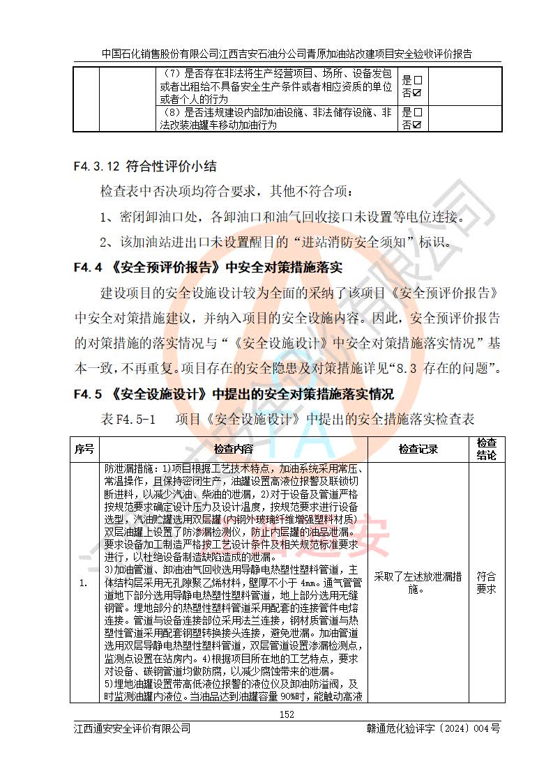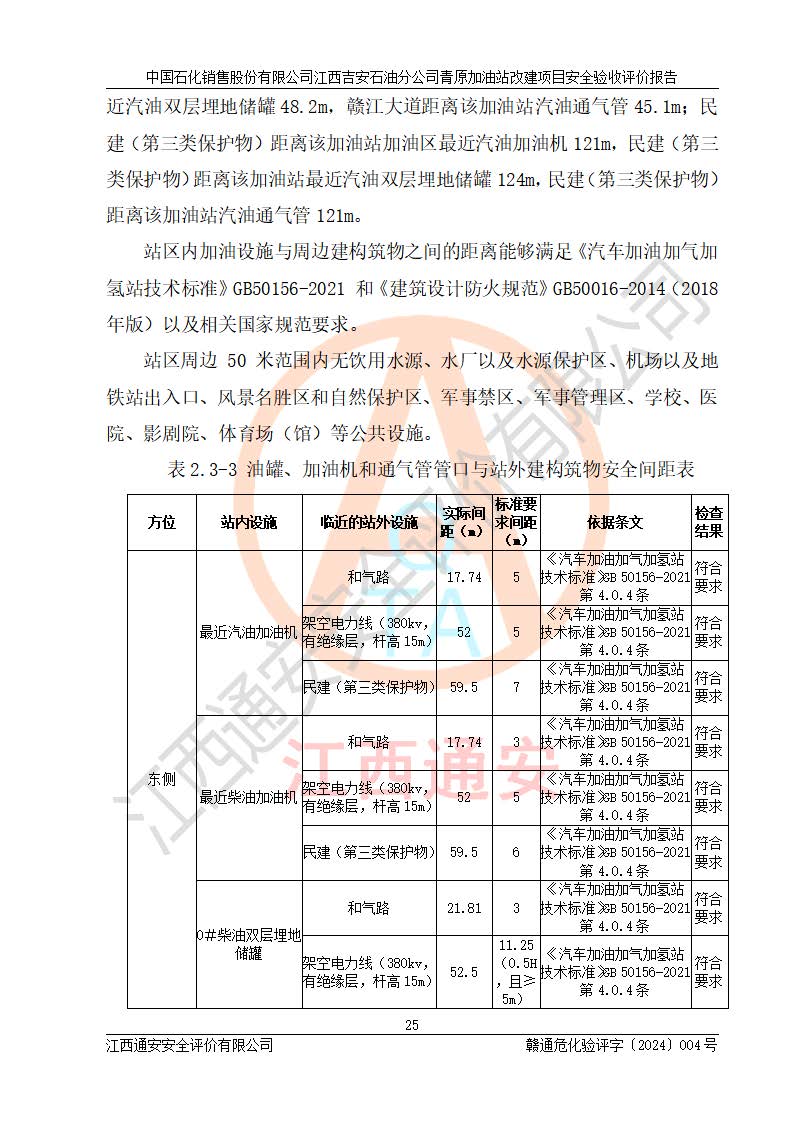评价结论 | 中国石化销售股份有限公司江西吉安石油分公司青原加油站改建项目具备**有关安全生产法律、法规、部门规章及标准规范要求的安全条件,符合经营和储存危险化学品的安全条件要求,具备安全验收的要求。 | |||