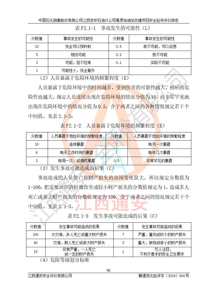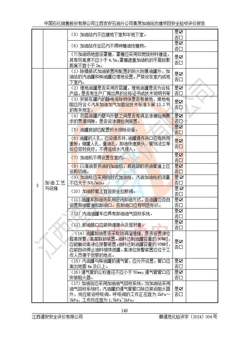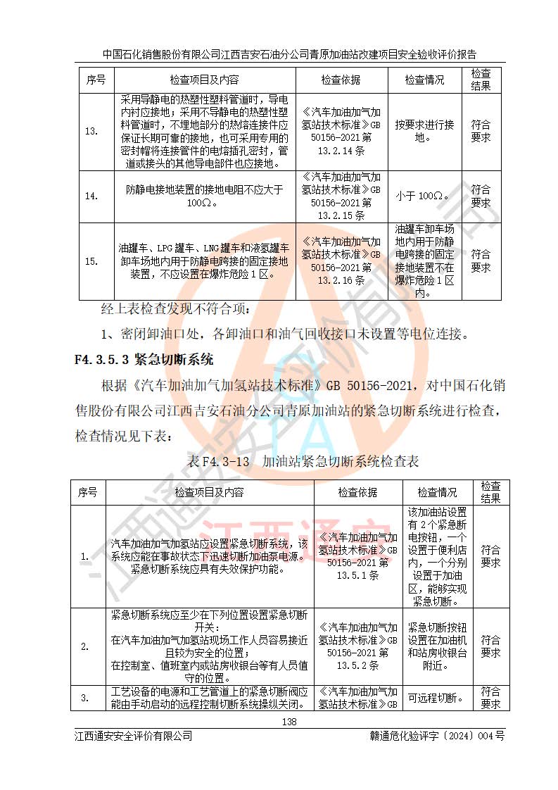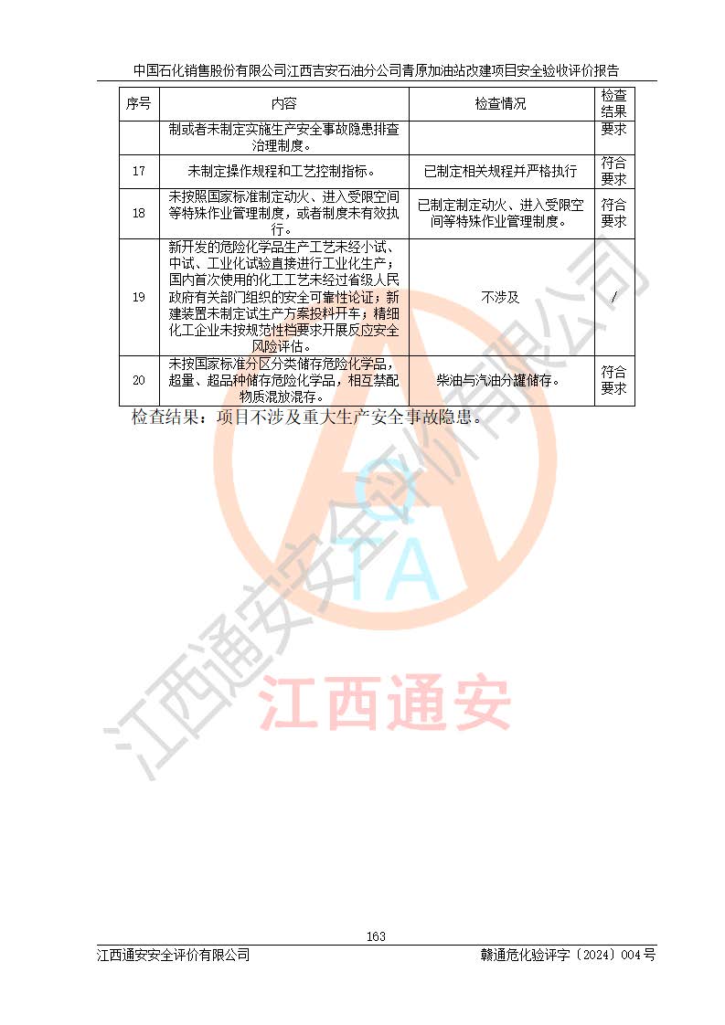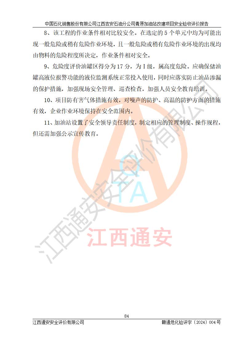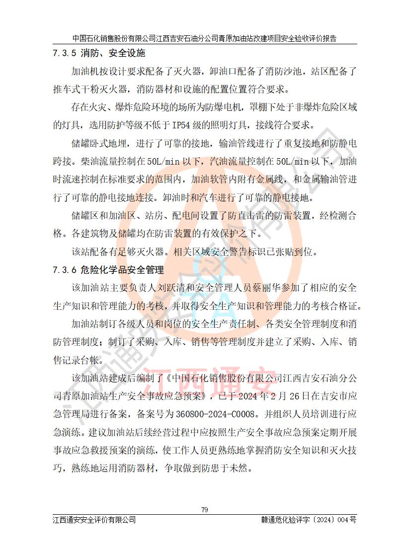 评价结论 | 中国石化销售股份有限公司江西吉安石油分公司青原加油站改建项目具备**有关安全生产法律、法规、部门规章及标准规范要求的安全条件,符合经营和储存危险化学品的安全条件要求,具备安全验收的要求。 | |||