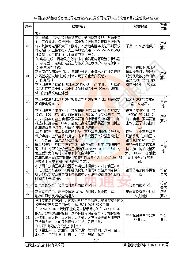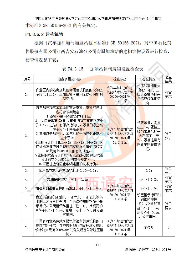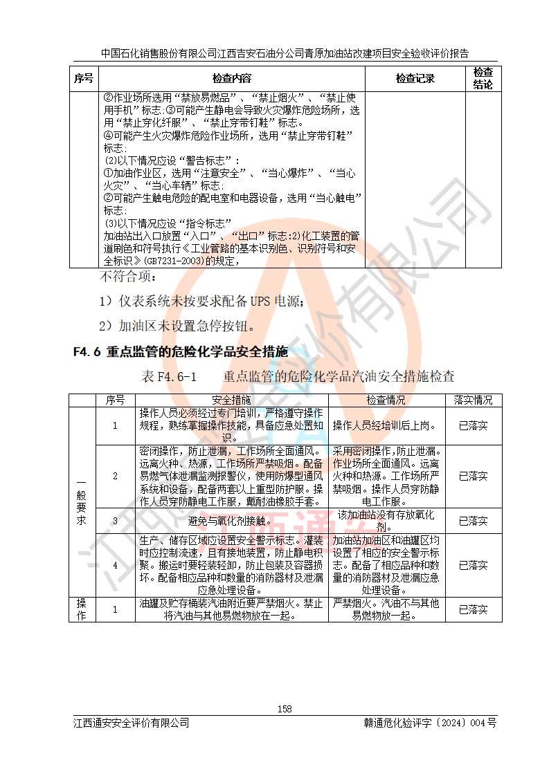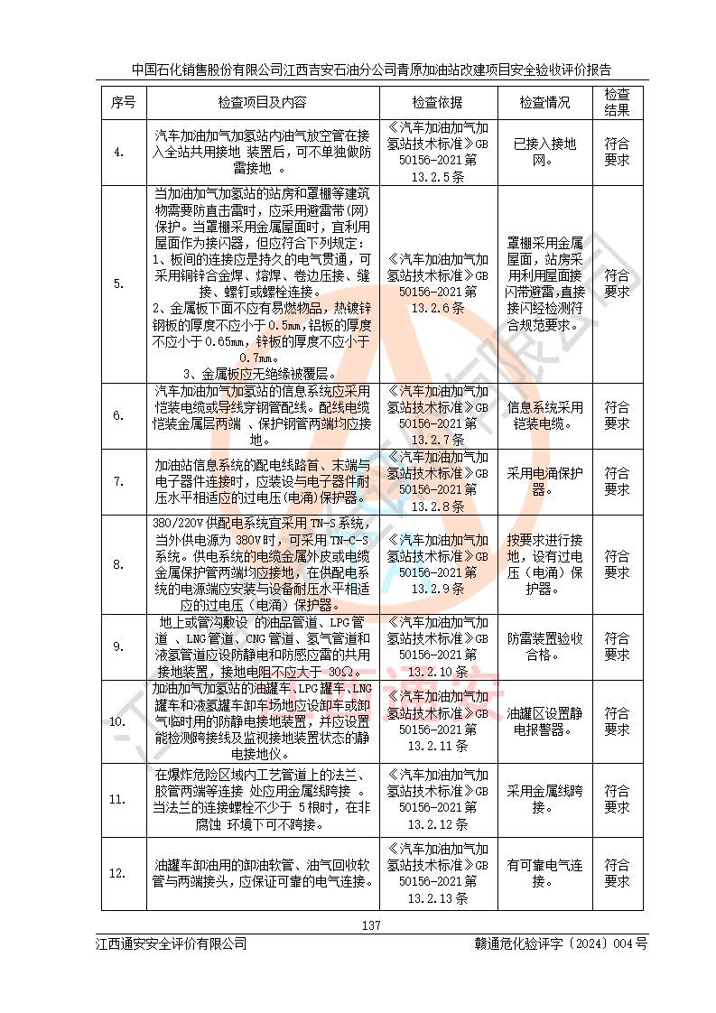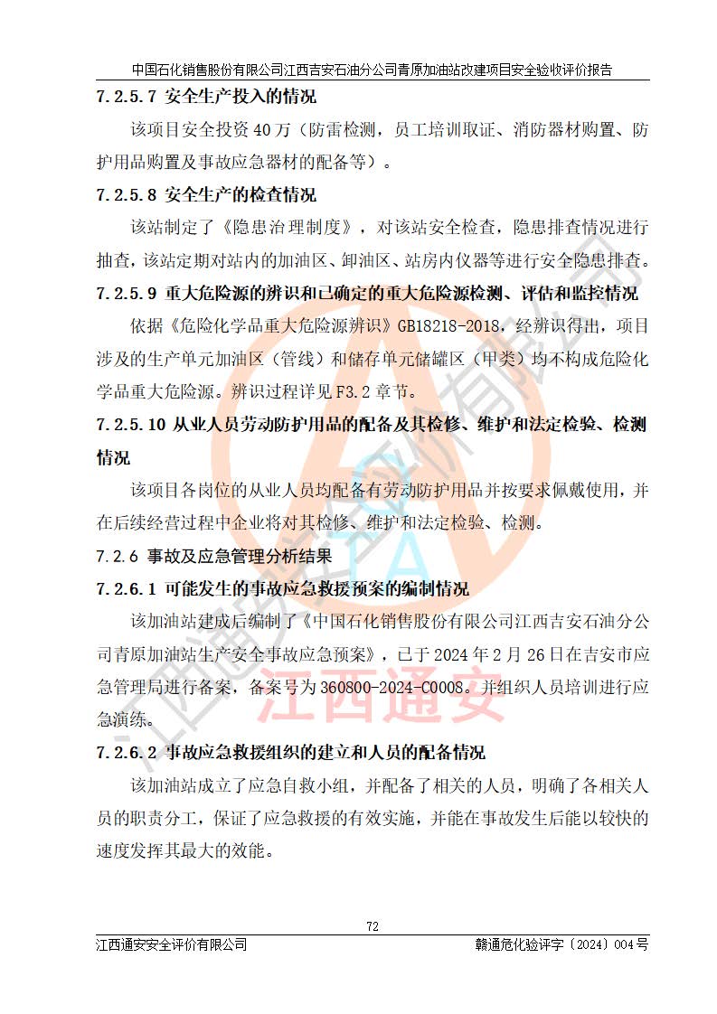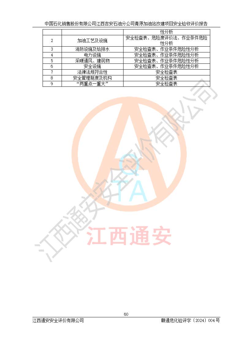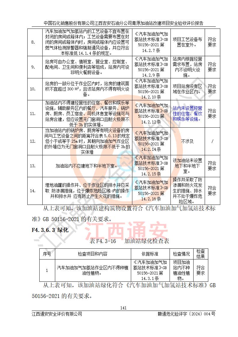 评价结论 | 中国石化销售股份有限公司江西吉安石油分公司青原加油站改建项目具备**有关安全生产法律、法规、部门规章及标准规范要求的安全条件,符合经营和储存危险化学品的安全条件要求,具备安全验收的要求。 | |||