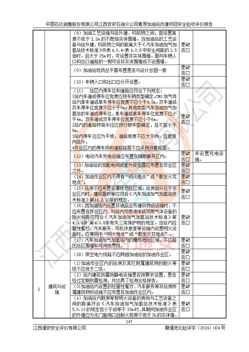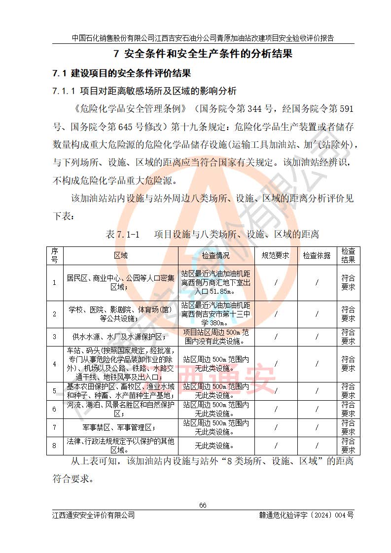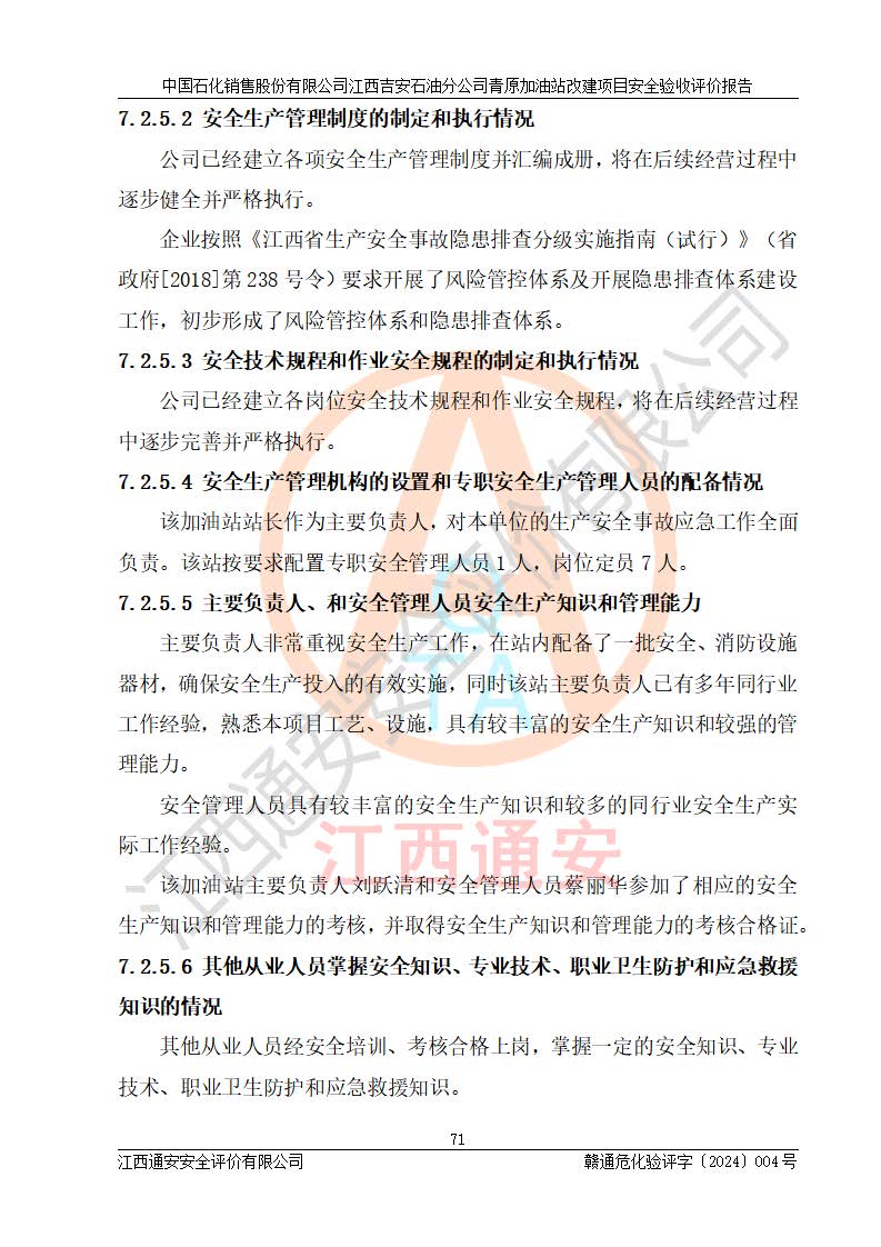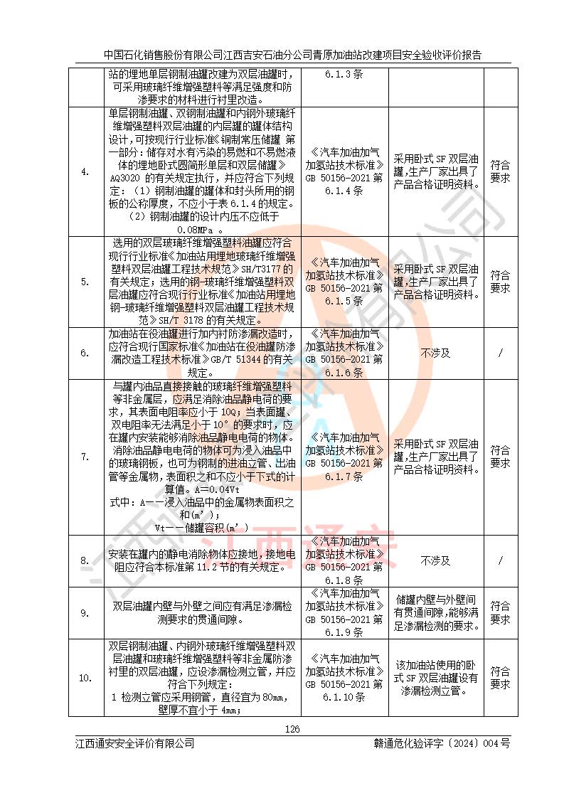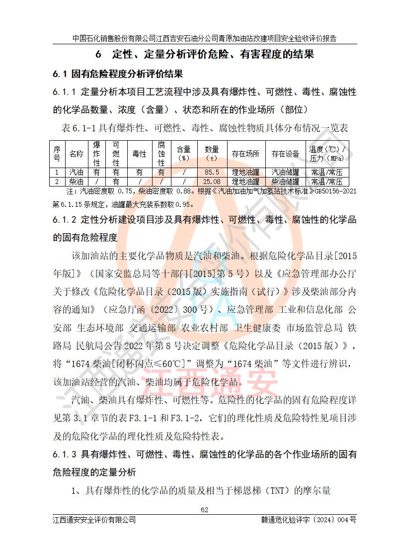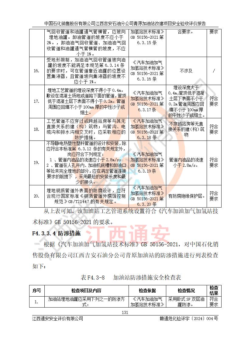 评价结论 | 中国石化销售股份有限公司江西吉安石油分公司青原加油站改建项目具备**有关安全生产法律、法规、部门规章及标准规范要求的安全条件,符合经营和储存危险化学品的安全条件要求,具备安全验收的要求。 | |||
