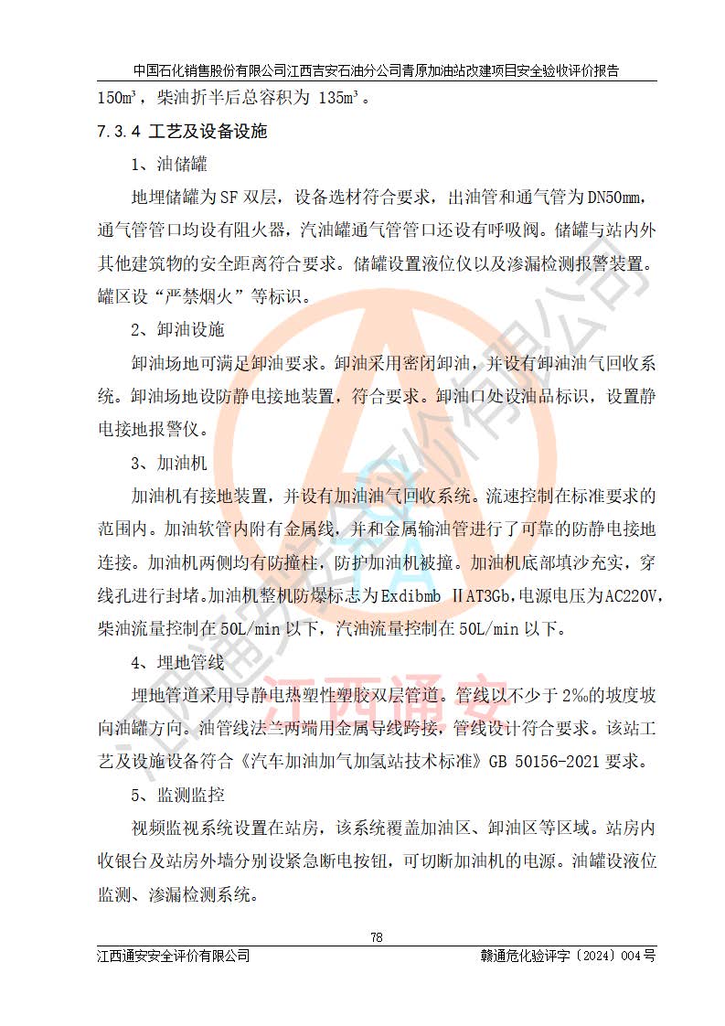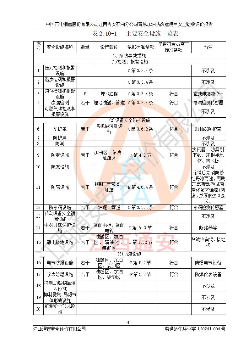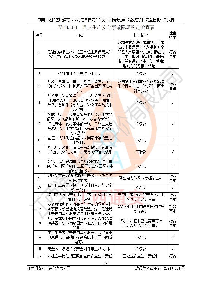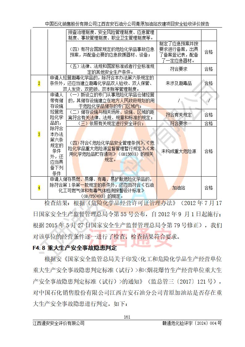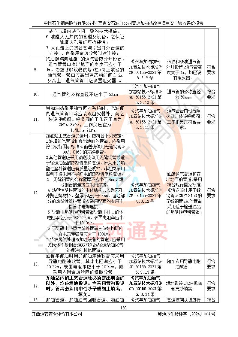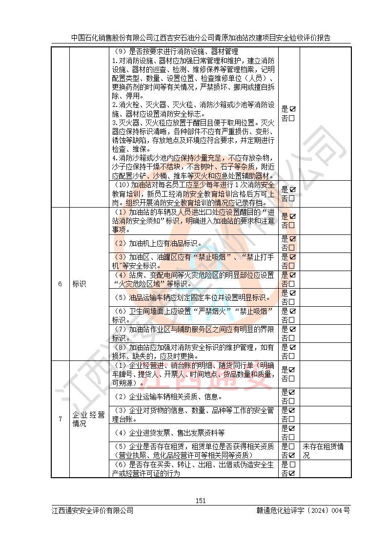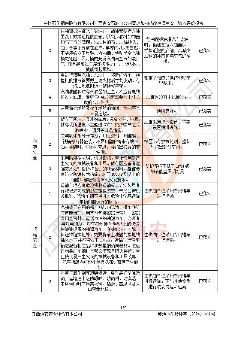 评价结论 | 中国石化销售股份有限公司江西吉安石油分公司青原加油站改建项目具备**有关安全生产法律、法规、部门规章及标准规范要求的安全条件,符合经营和储存危险化学品的安全条件要求,具备安全验收的要求。 | |||