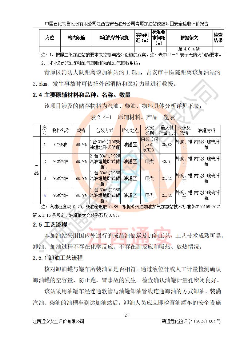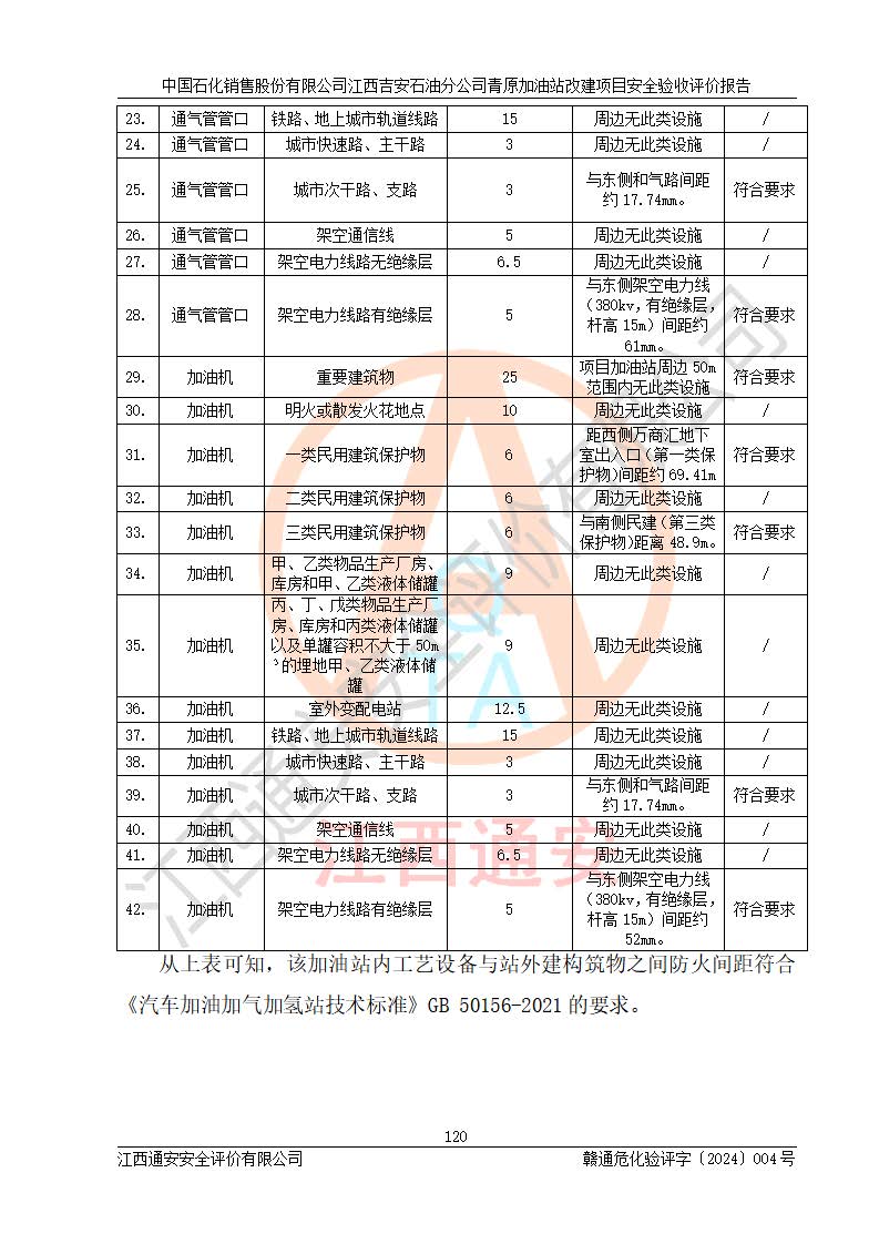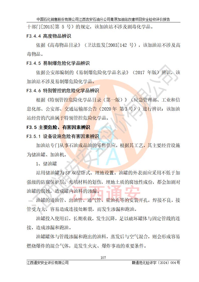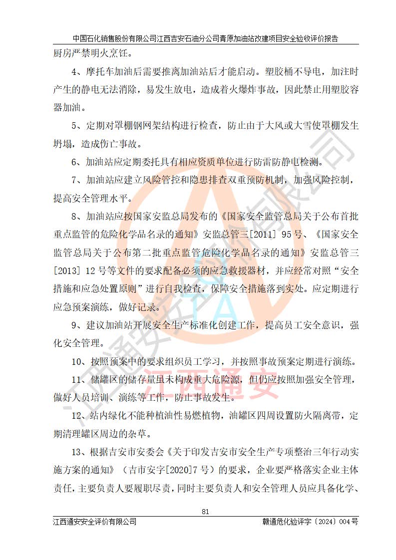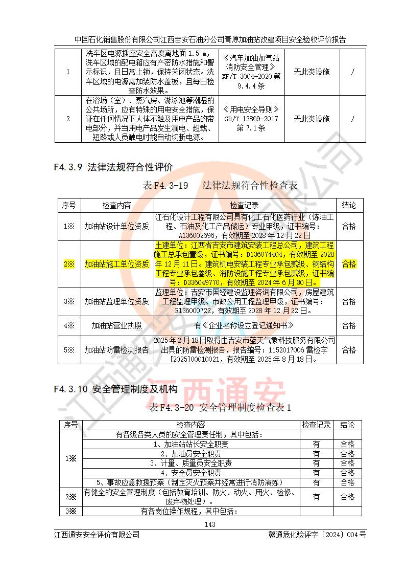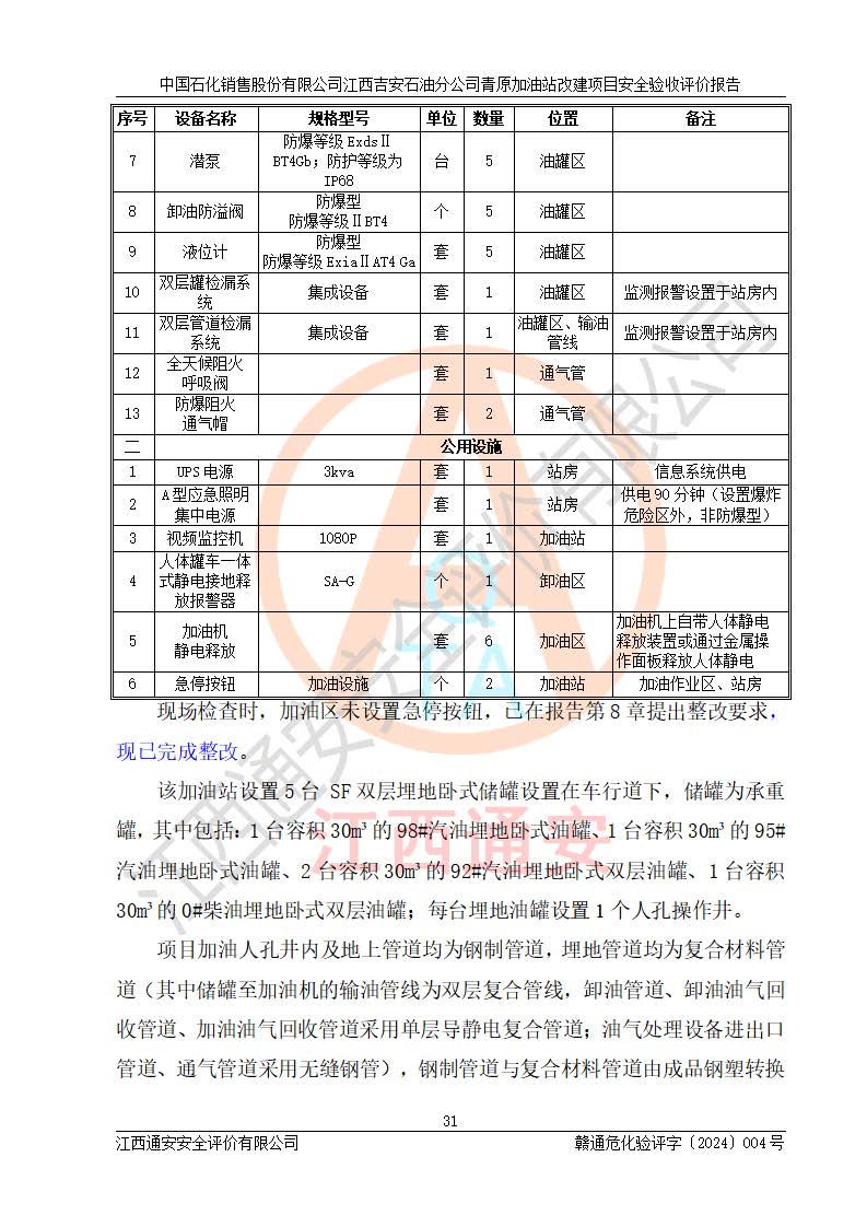 评价结论 | 中国石化销售股份有限公司江西吉安石油分公司青原加油站改建项目具备**有关安全生产法律、法规、部门规章及标准规范要求的安全条件,符合经营和储存危险化学品的安全条件要求,具备安全验收的要求。 | |||