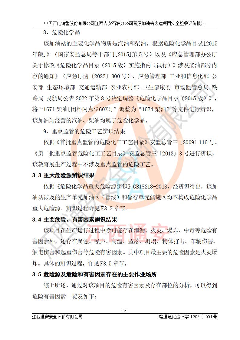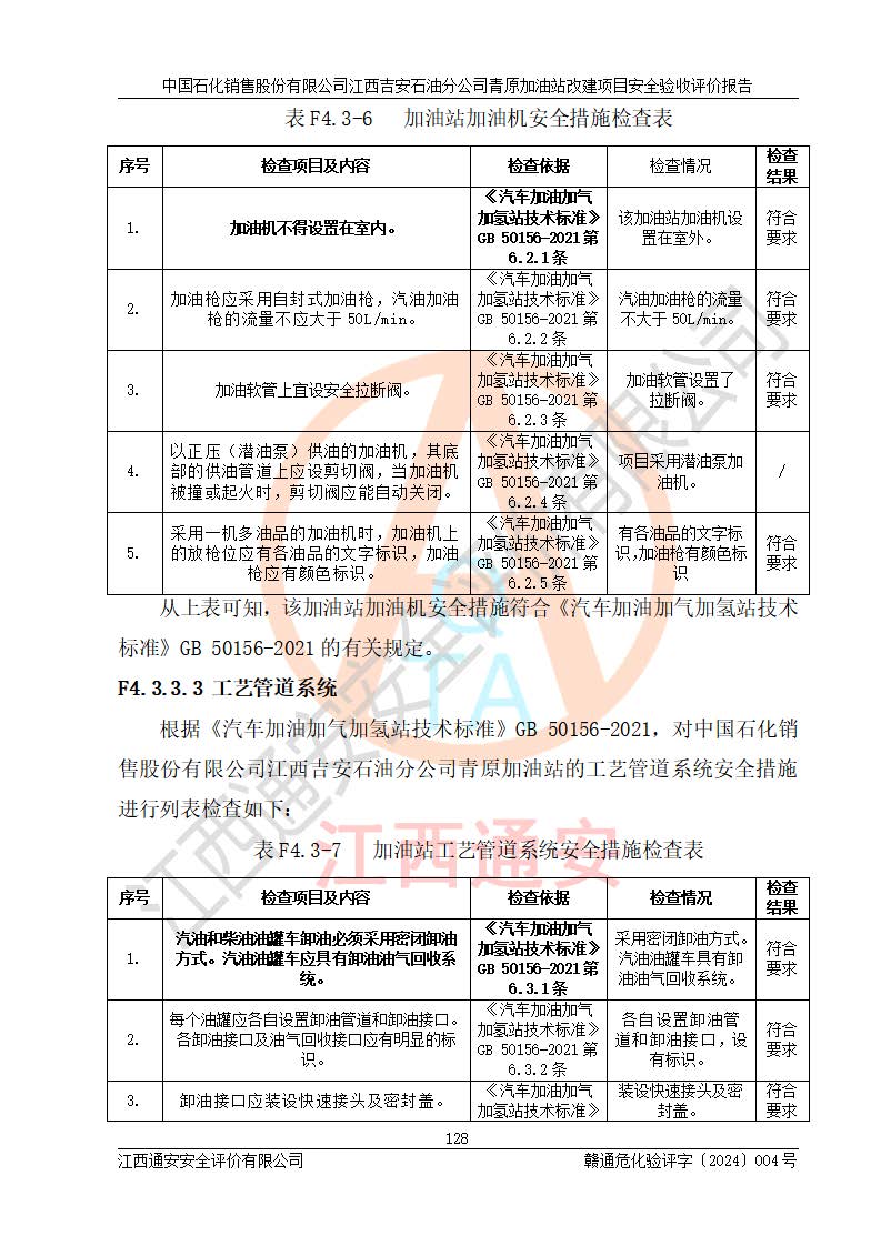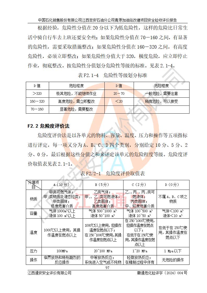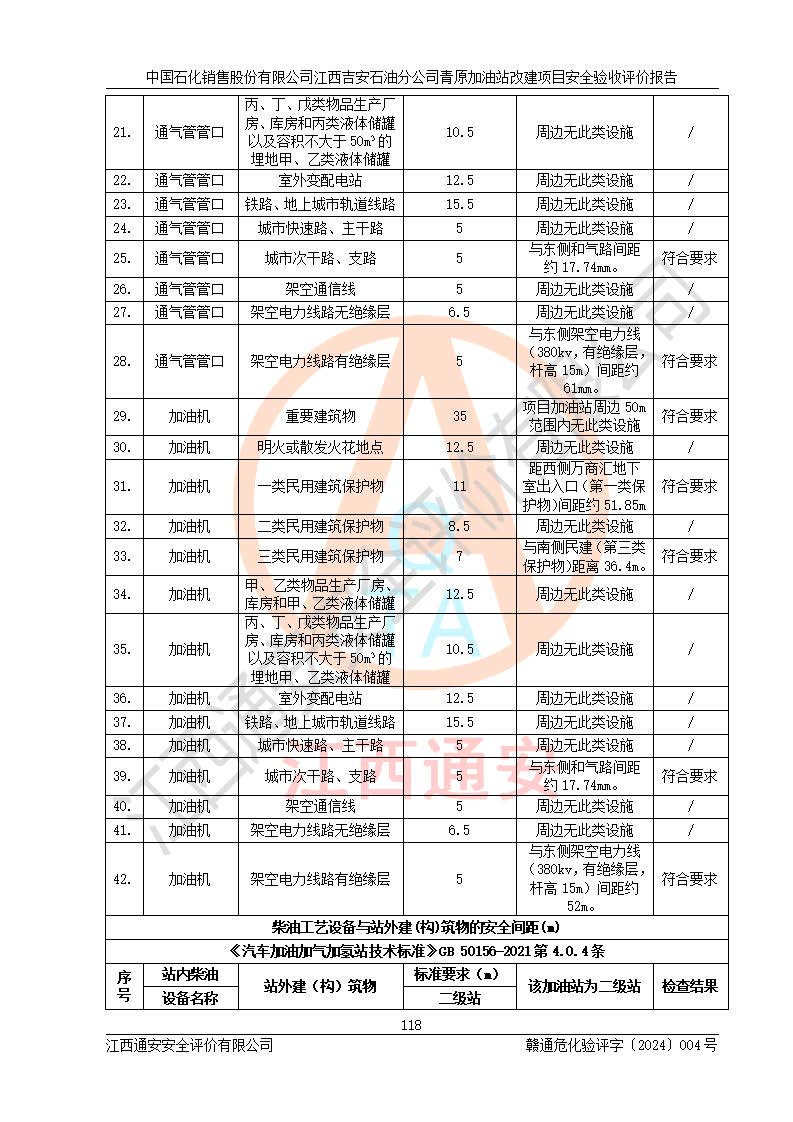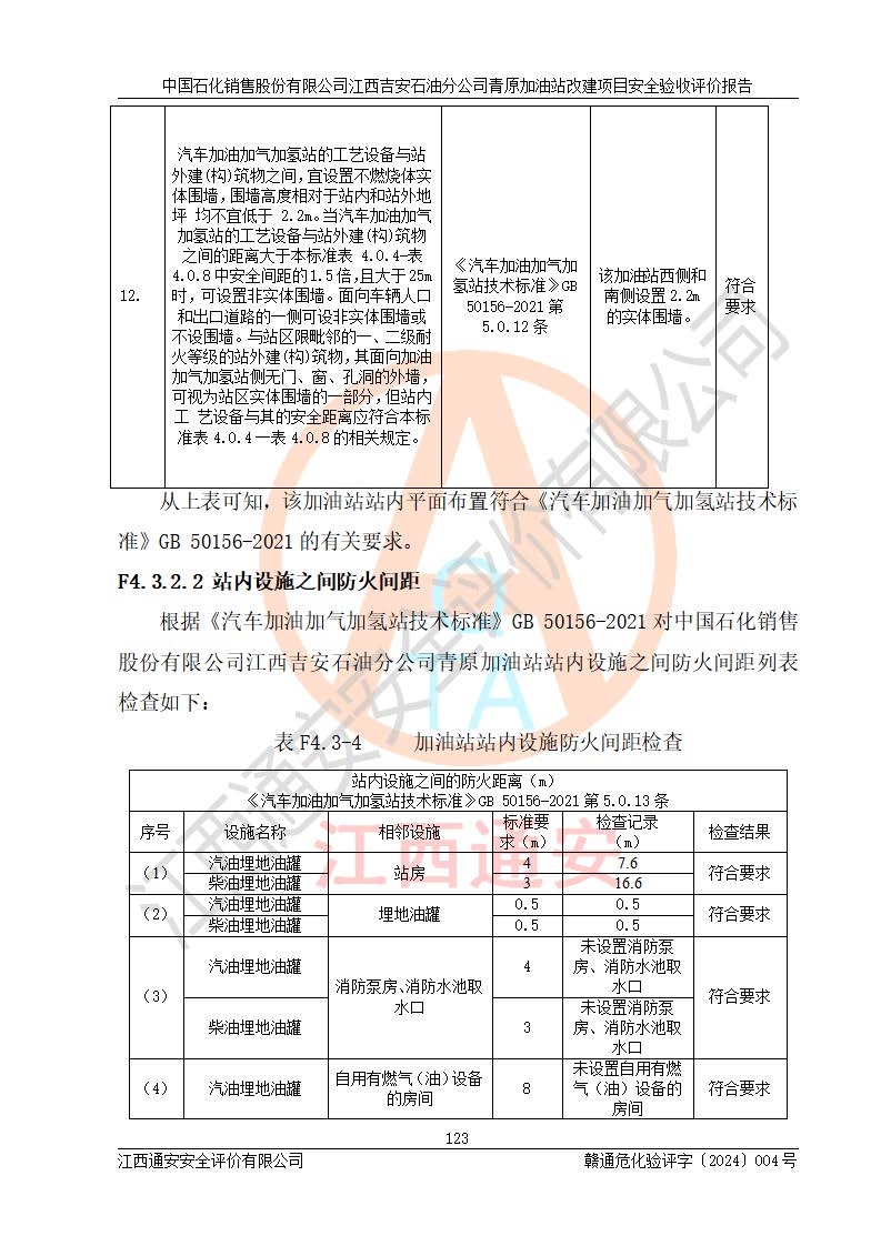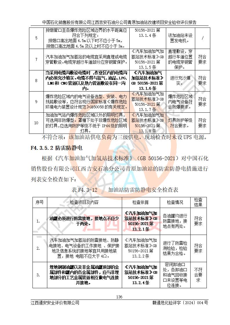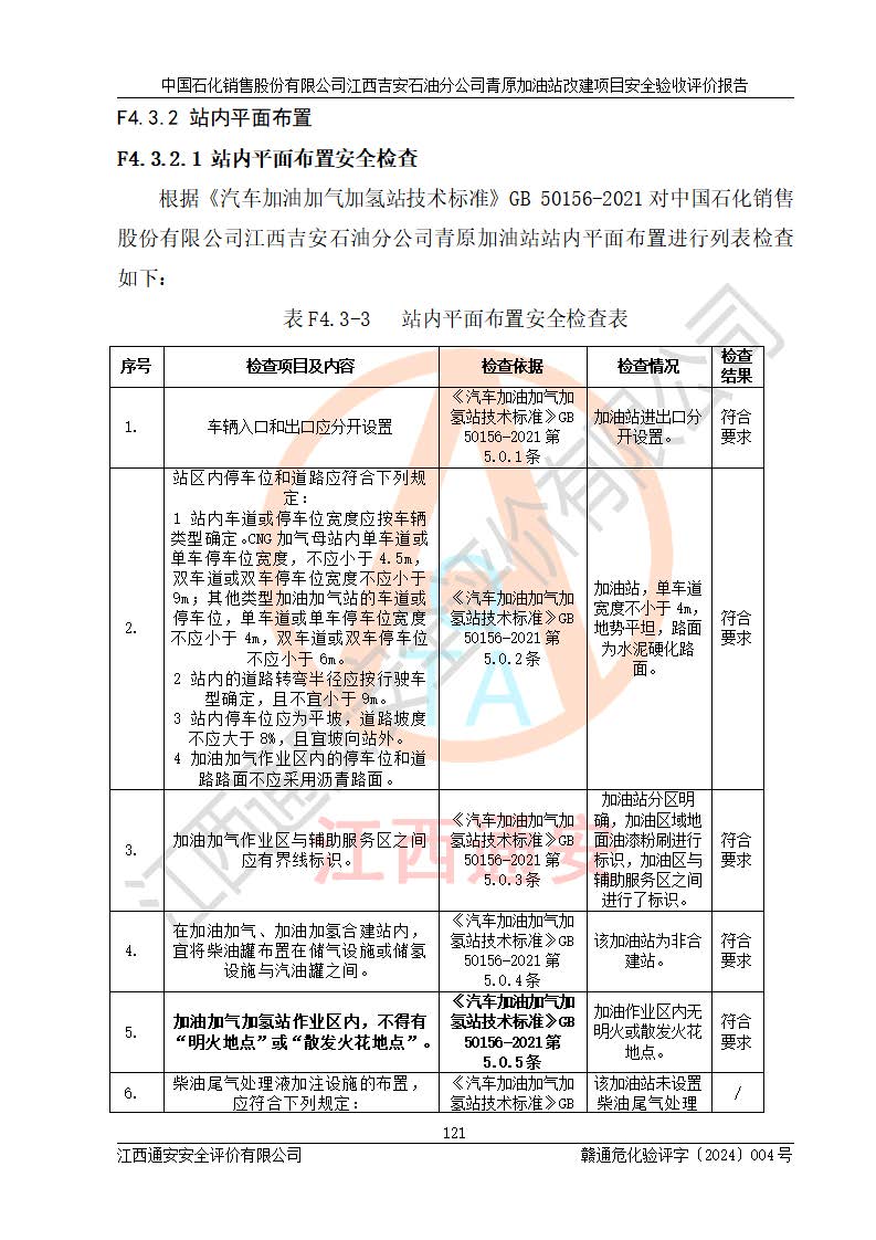 评价结论 | 中国石化销售股份有限公司江西吉安石油分公司青原加油站改建项目具备**有关安全生产法律、法规、部门规章及标准规范要求的安全条件,符合经营和储存危险化学品的安全条件要求,具备安全验收的要求。 | |||