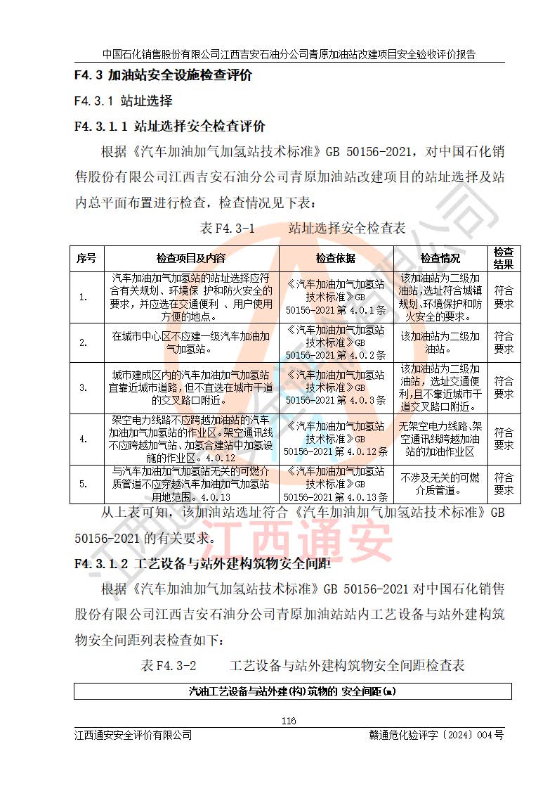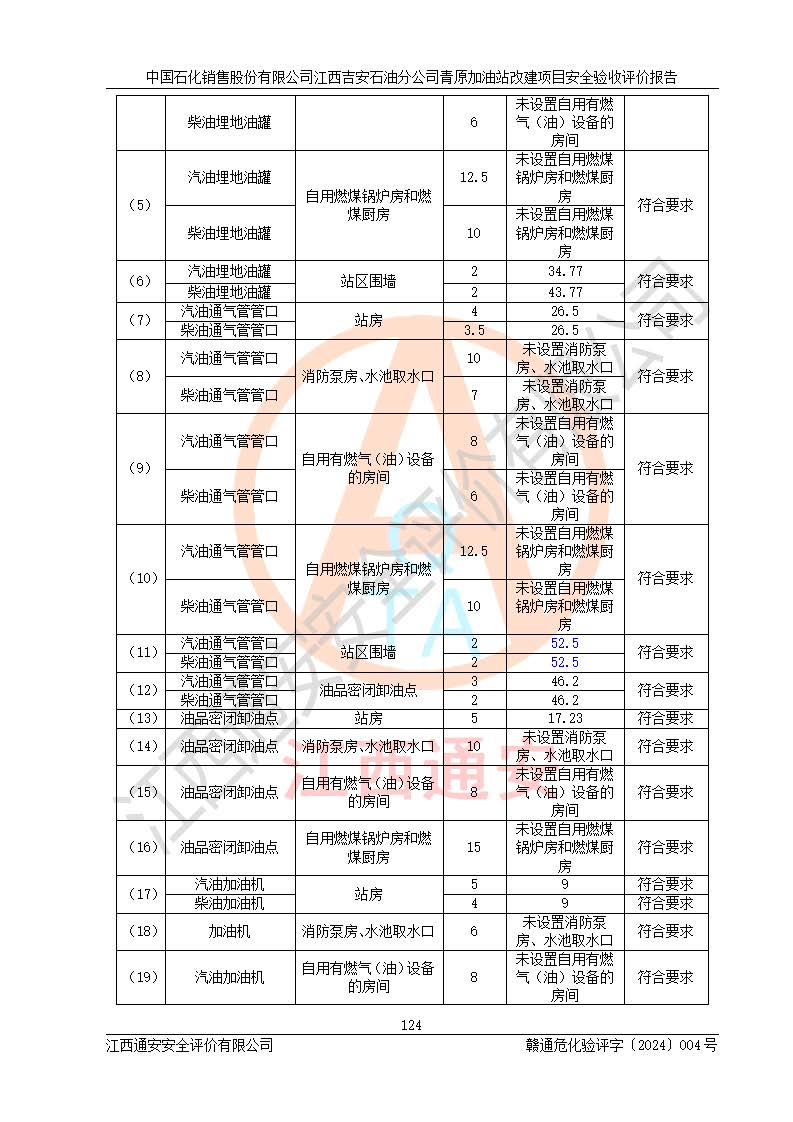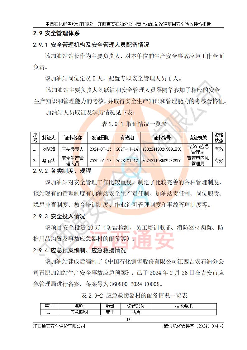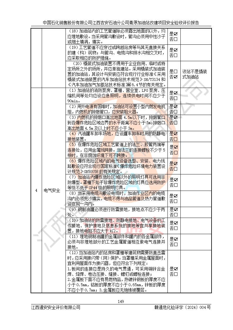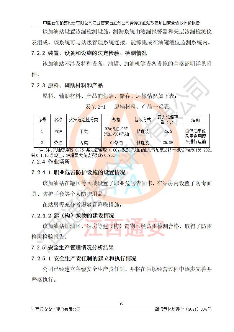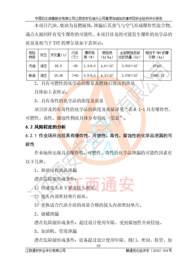 评价结论 | 中国石化销售股份有限公司江西吉安石油分公司青原加油站改建项目具备**有关安全生产法律、法规、部门规章及标准规范要求的安全条件,符合经营和储存危险化学品的安全条件要求,具备安全验收的要求。 | |||