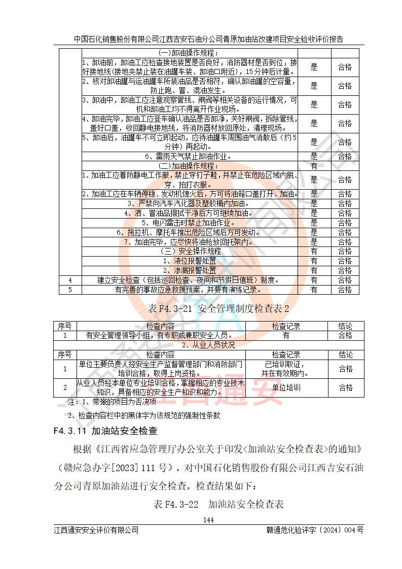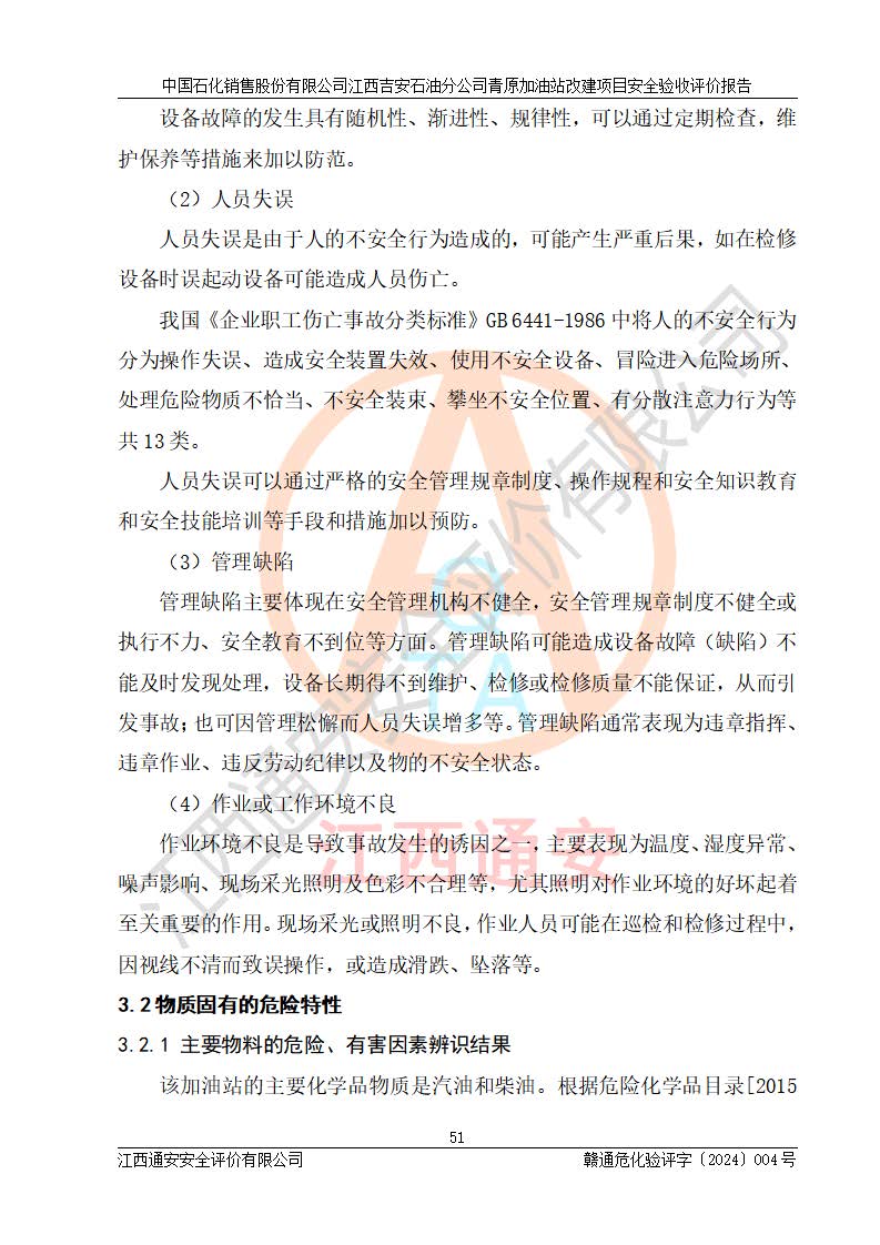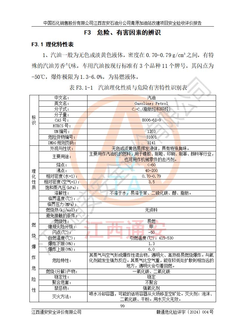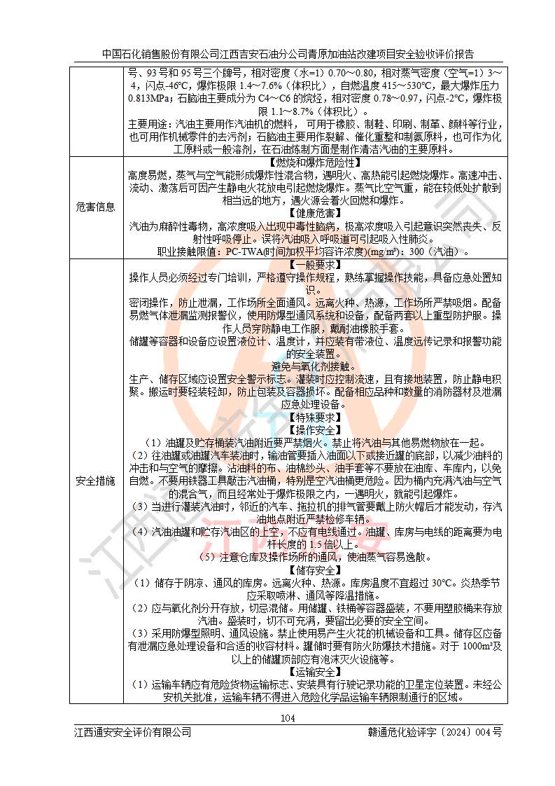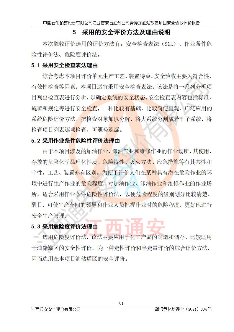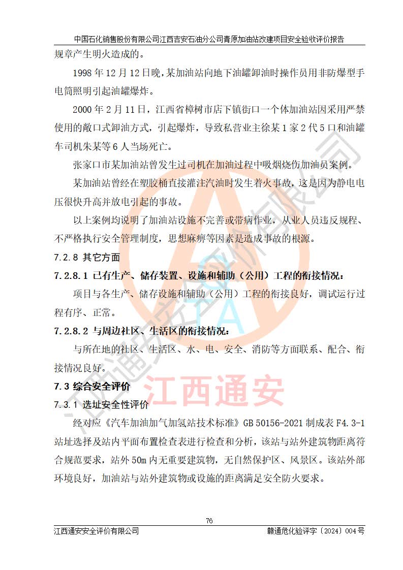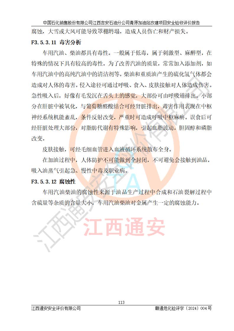 评价结论 | 中国石化销售股份有限公司江西吉安石油分公司青原加油站改建项目具备**有关安全生产法律、法规、部门规章及标准规范要求的安全条件,符合经营和储存危险化学品的安全条件要求,具备安全验收的要求。 | |||