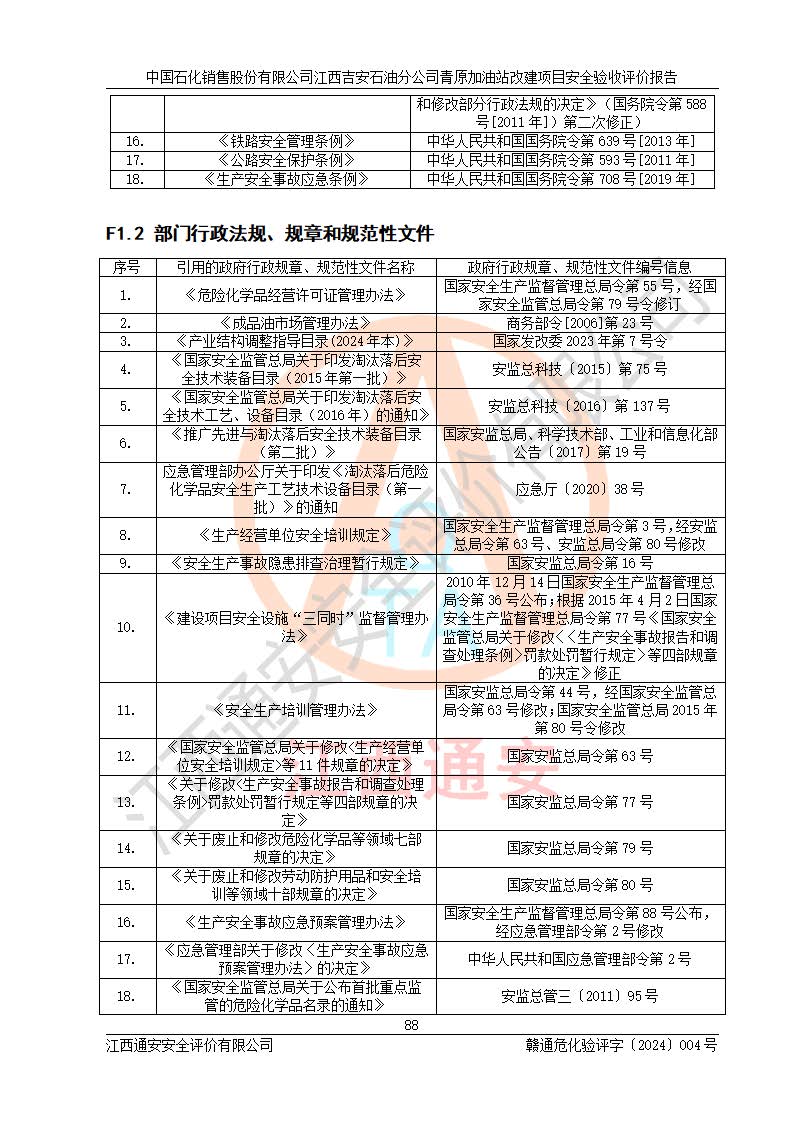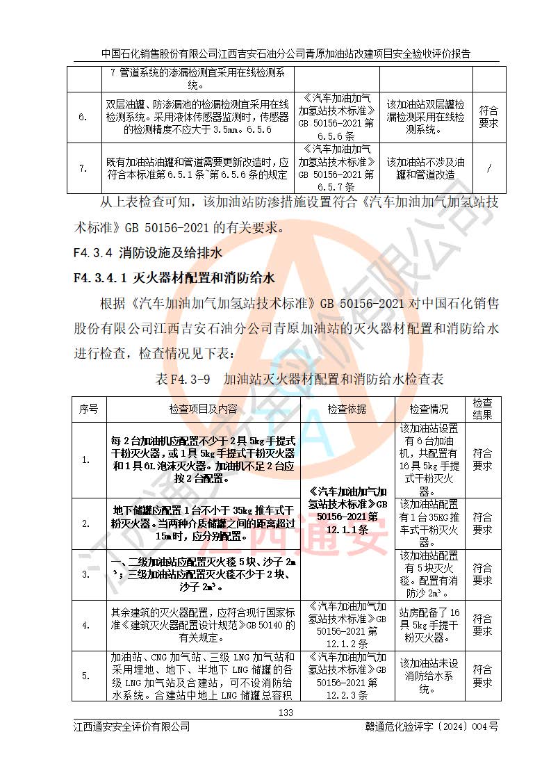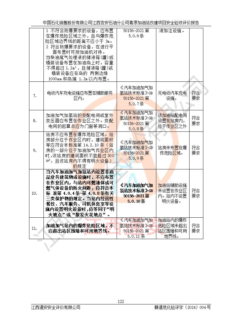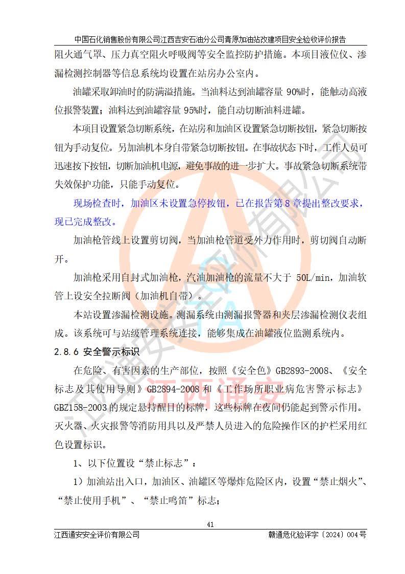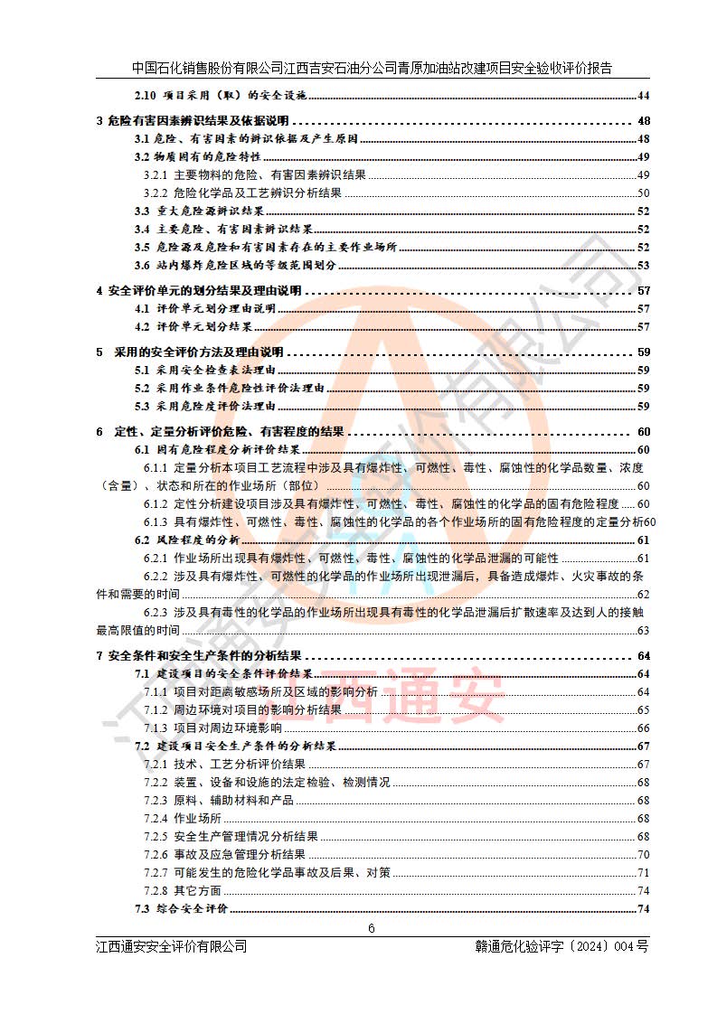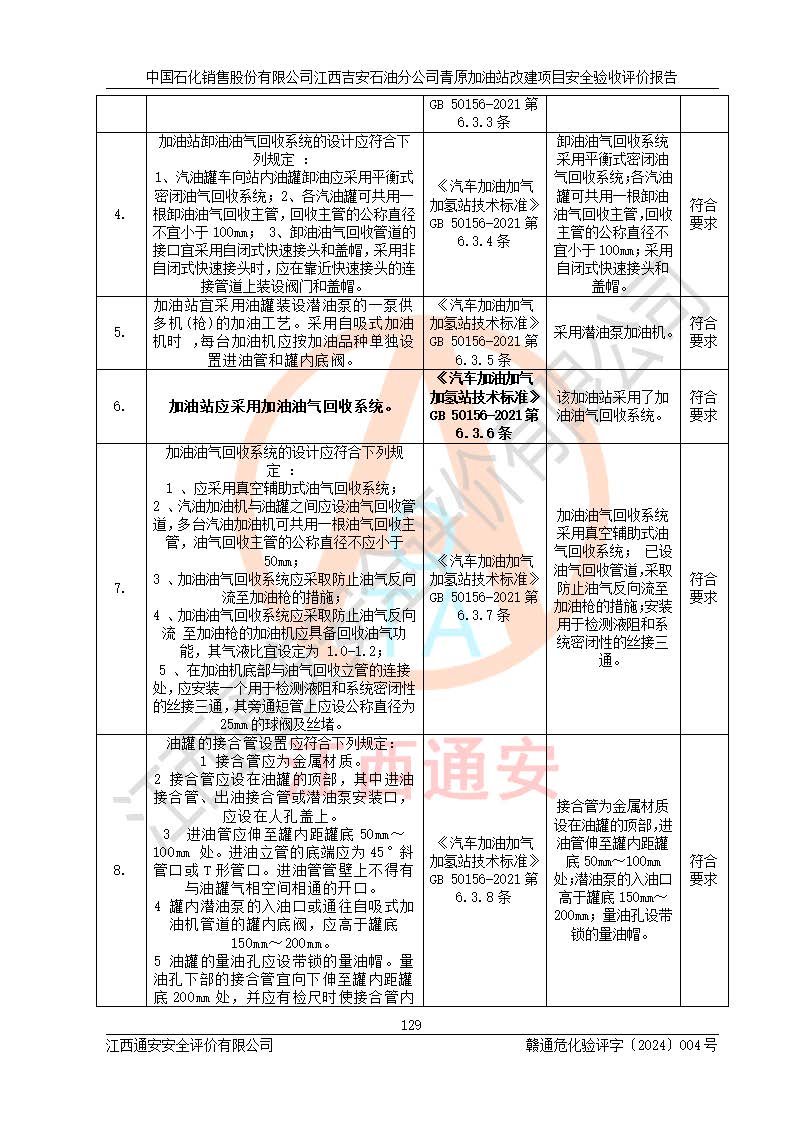 评价结论 | 中国石化销售股份有限公司江西吉安石油分公司青原加油站改建项目具备**有关安全生产法律、法规、部门规章及标准规范要求的安全条件,符合经营和储存危险化学品的安全条件要求,具备安全验收的要求。 | |||