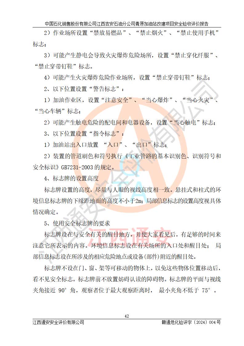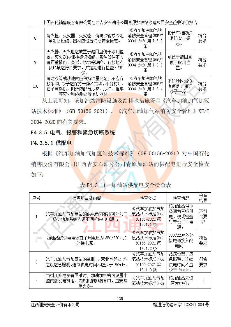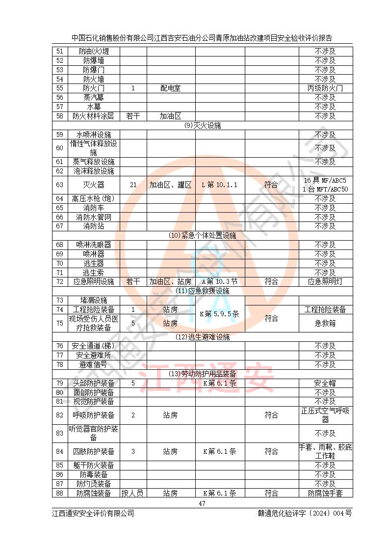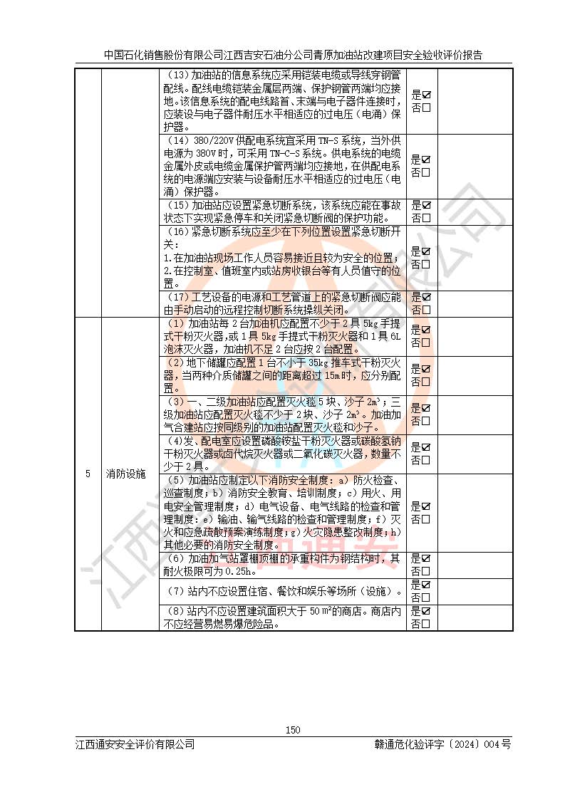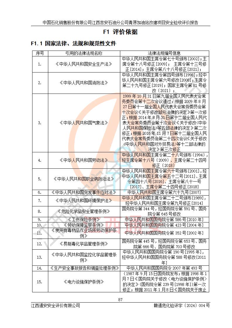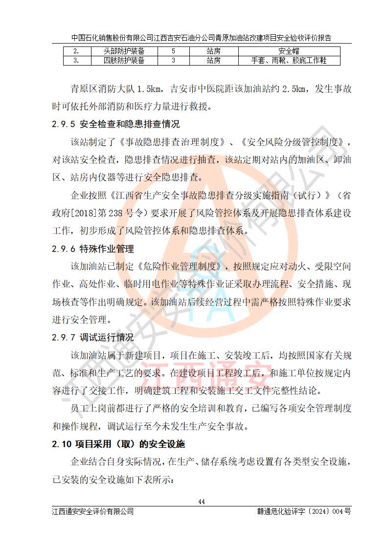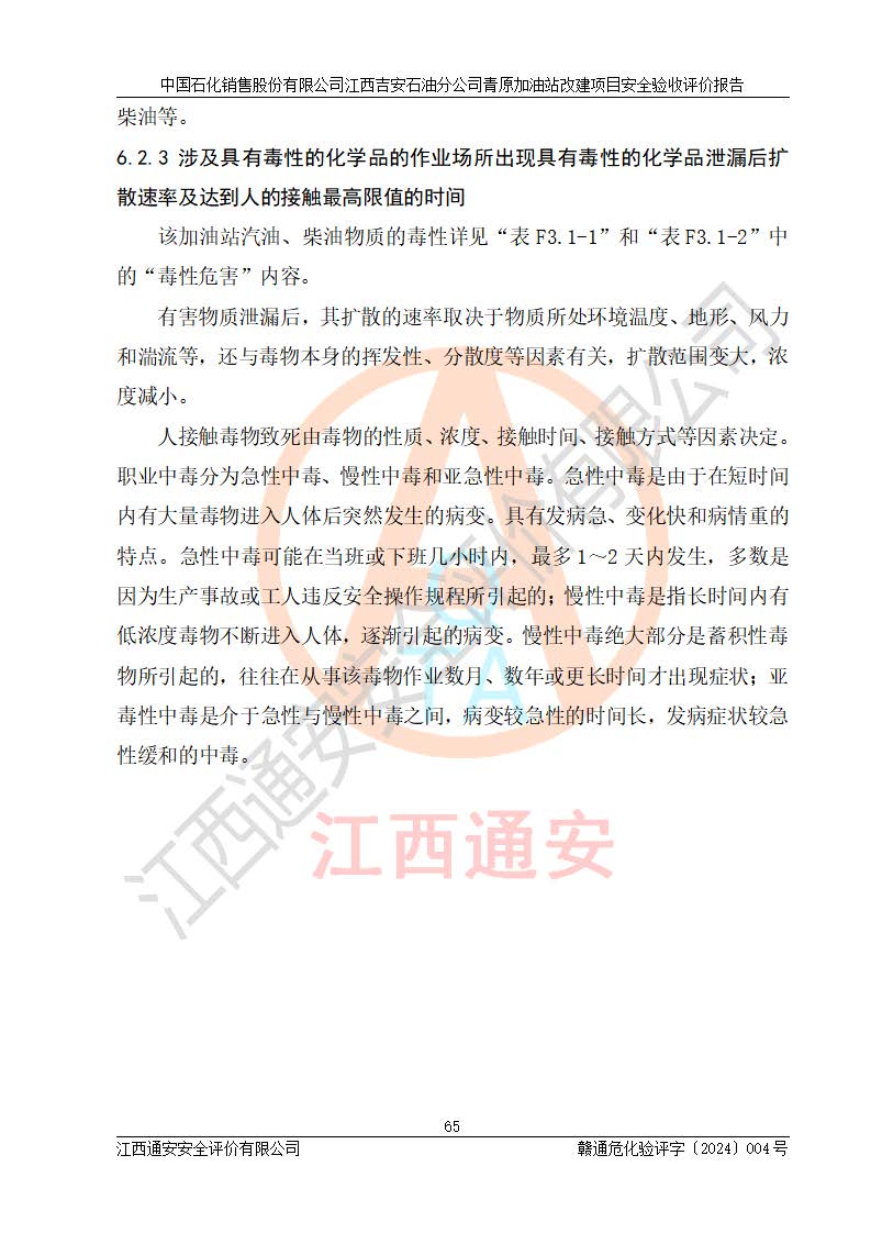 评价结论 | 中国石化销售股份有限公司江西吉安石油分公司青原加油站改建项目具备**有关安全生产法律、法规、部门规章及标准规范要求的安全条件,符合经营和储存危险化学品的安全条件要求,具备安全验收的要求。 | |||