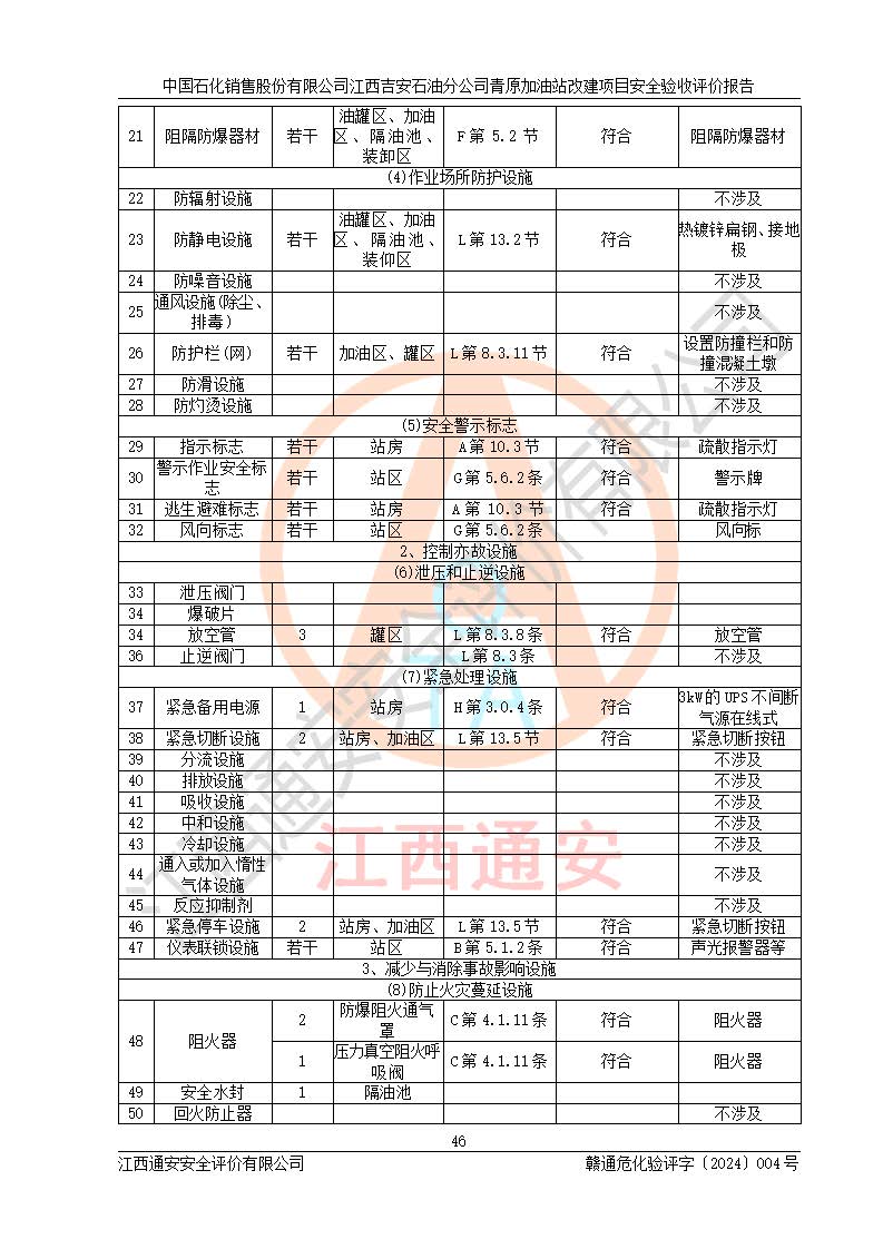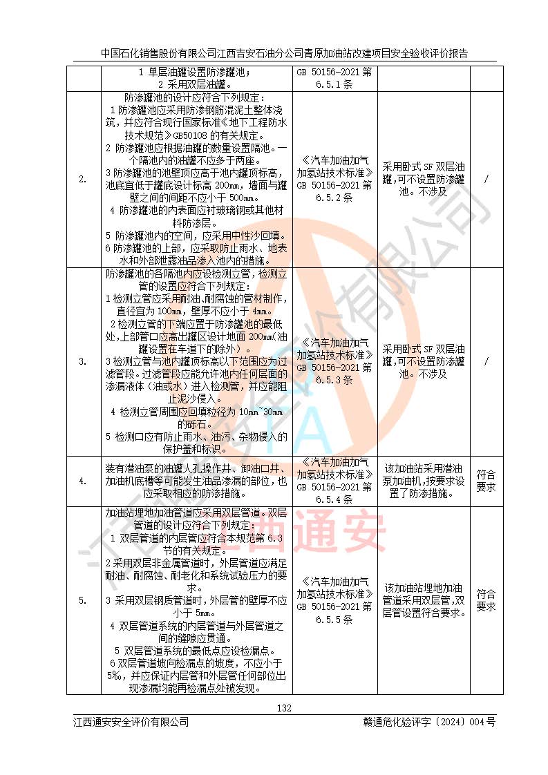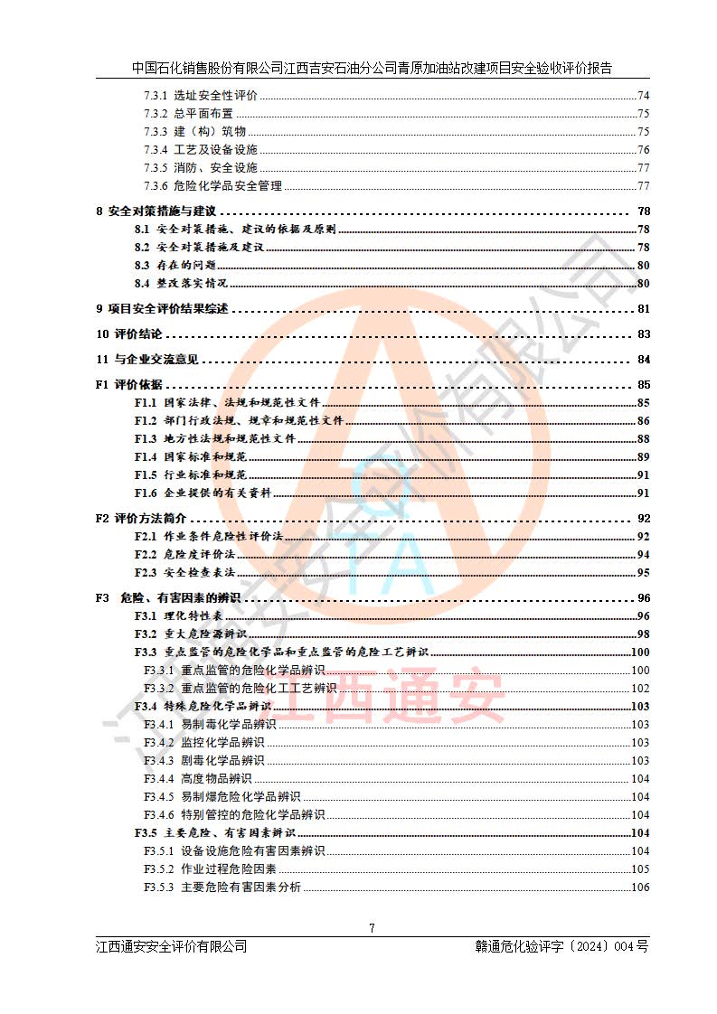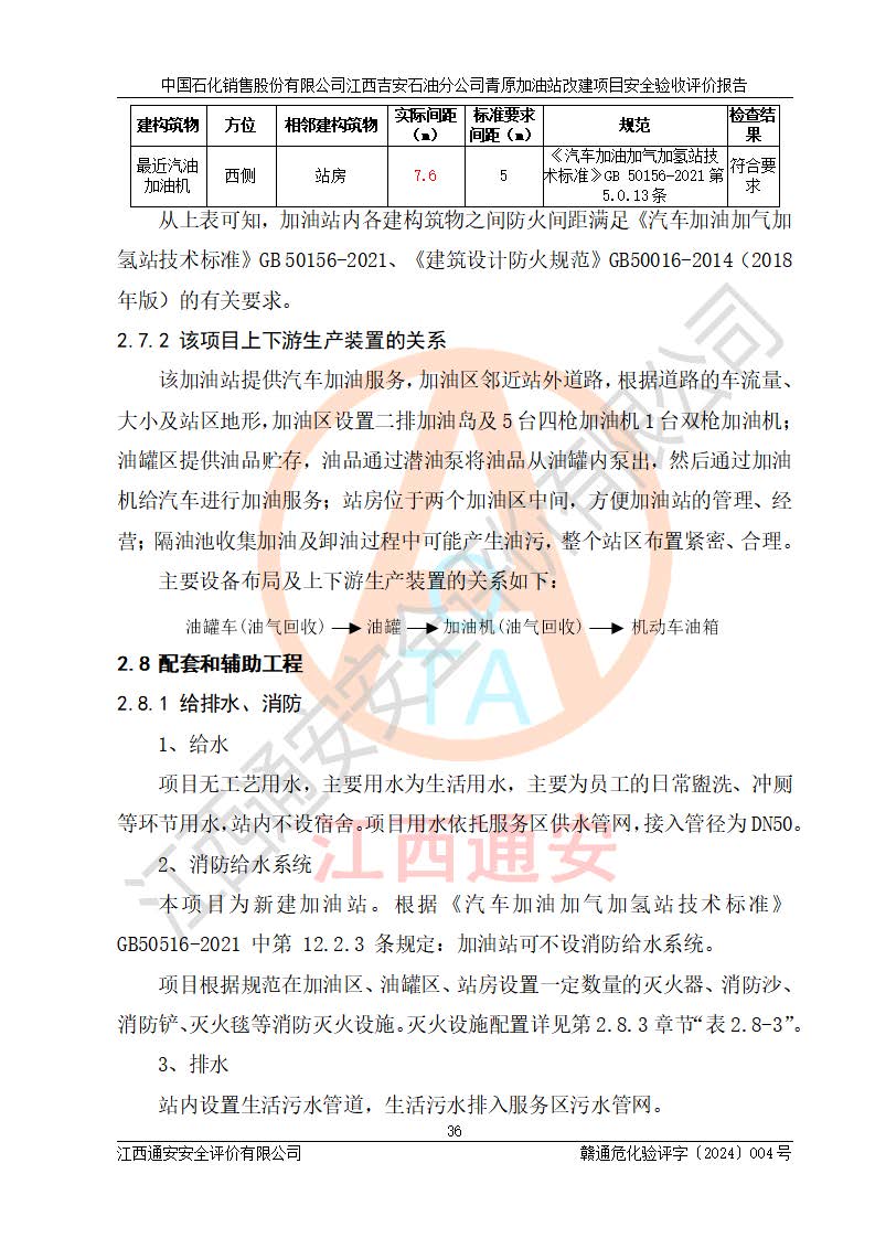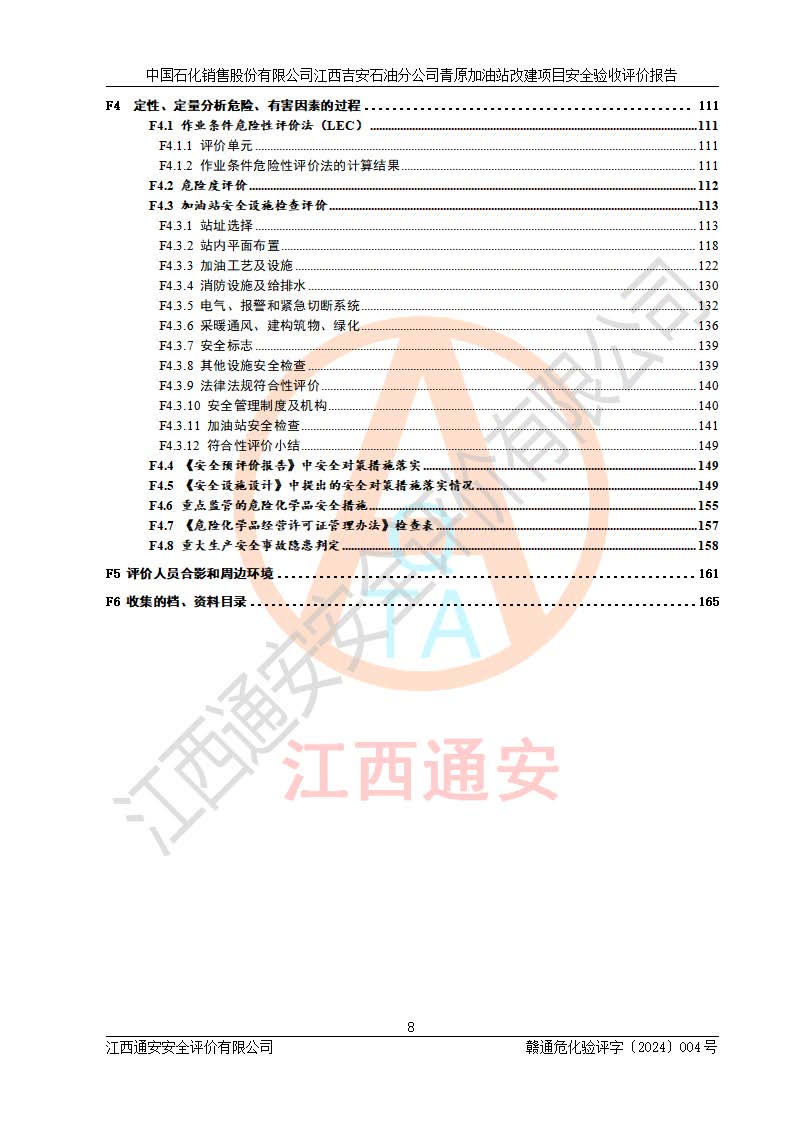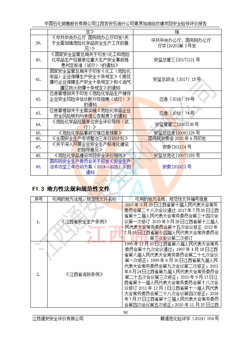 评价结论 | 中国石化销售股份有限公司江西吉安石油分公司青原加油站改建项目具备**有关安全生产法律、法规、部门规章及标准规范要求的安全条件,符合经营和储存危险化学品的安全条件要求,具备安全验收的要求。 | |||
