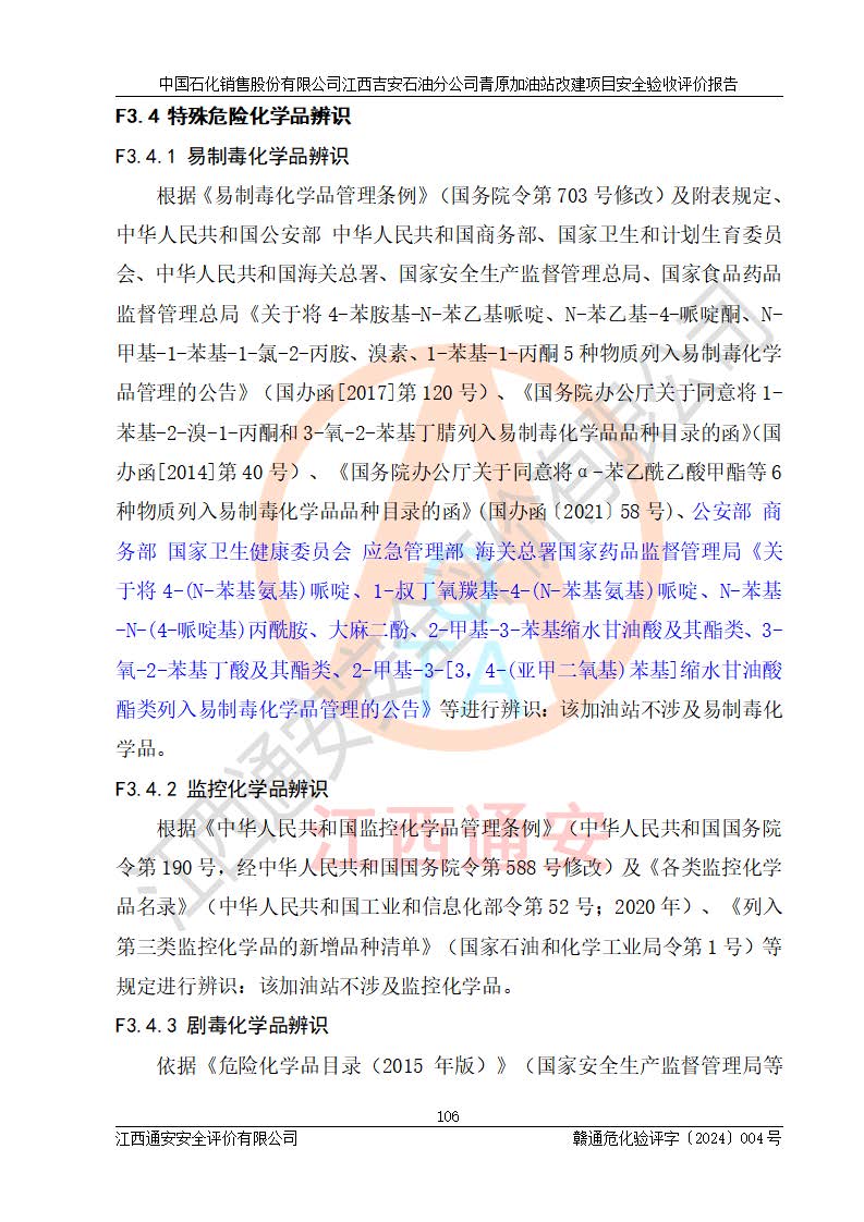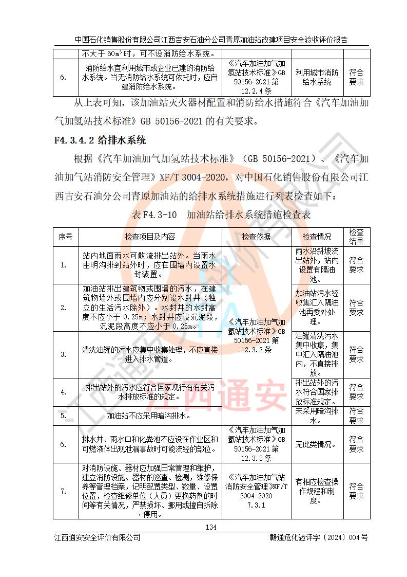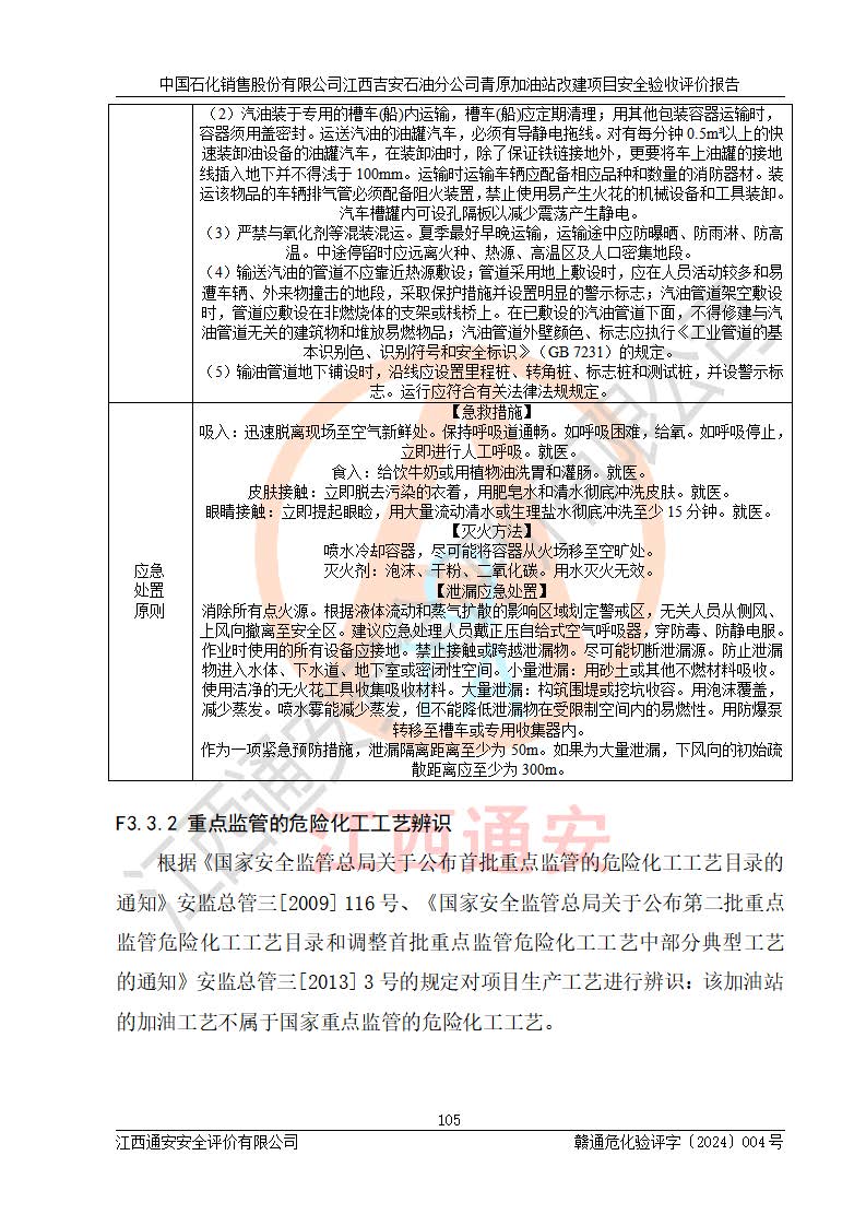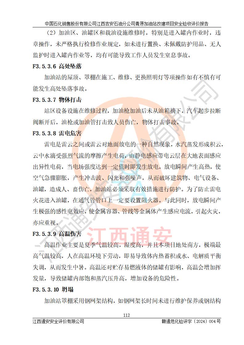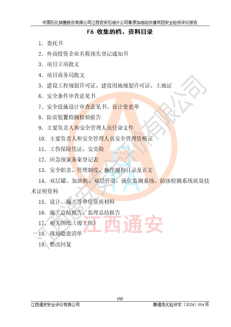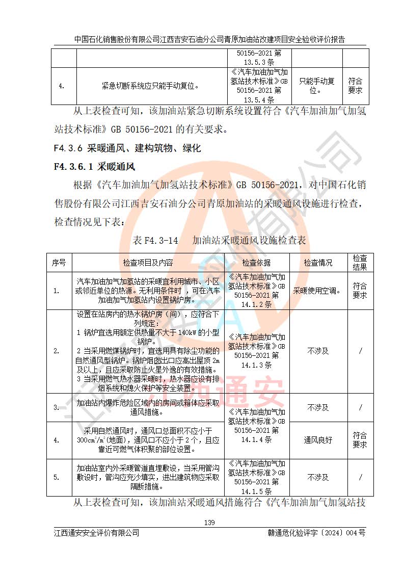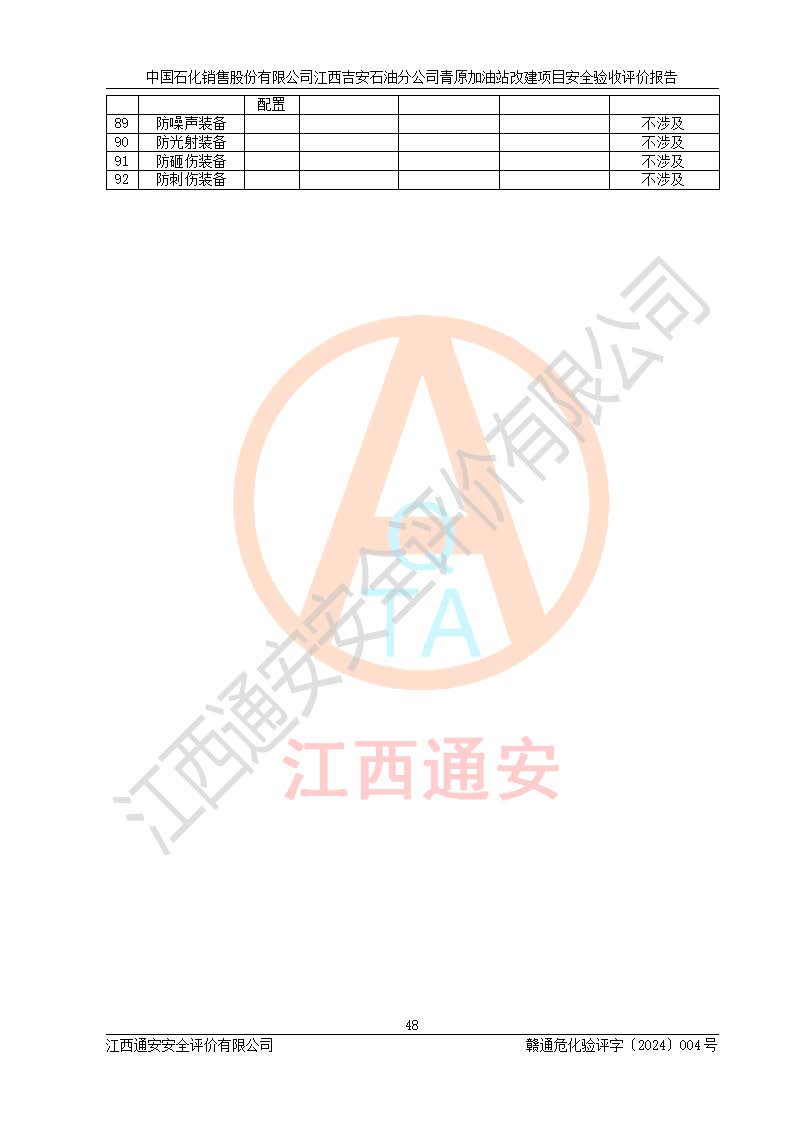评价结论 | 中国石化销售股份有限公司江西吉安石油分公司青原加油站改建项目具备**有关安全生产法律、法规、部门规章及标准规范要求的安全条件,符合经营和储存危险化学品的安全条件要求,具备安全验收的要求。 | |||