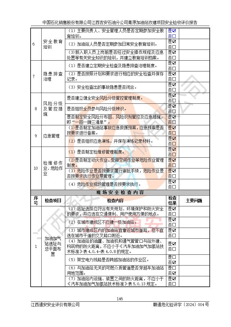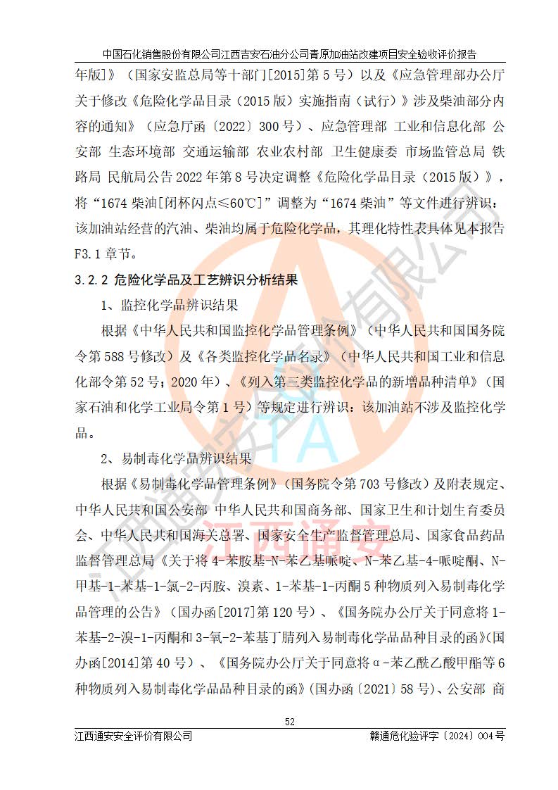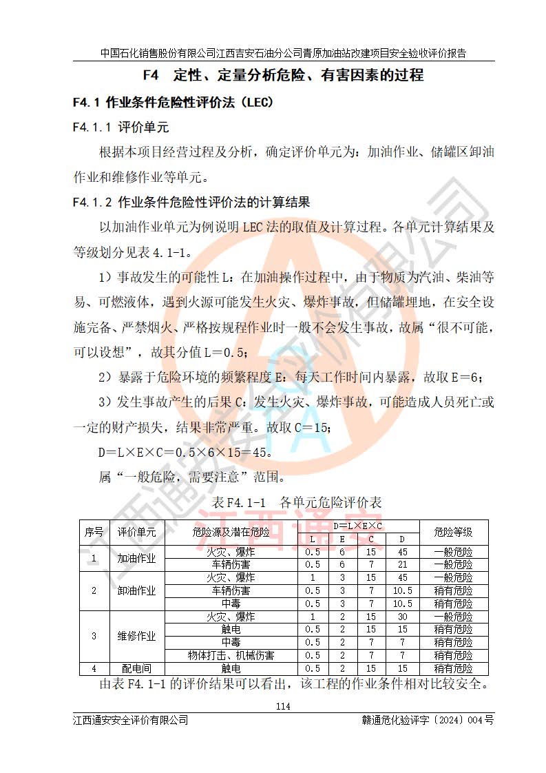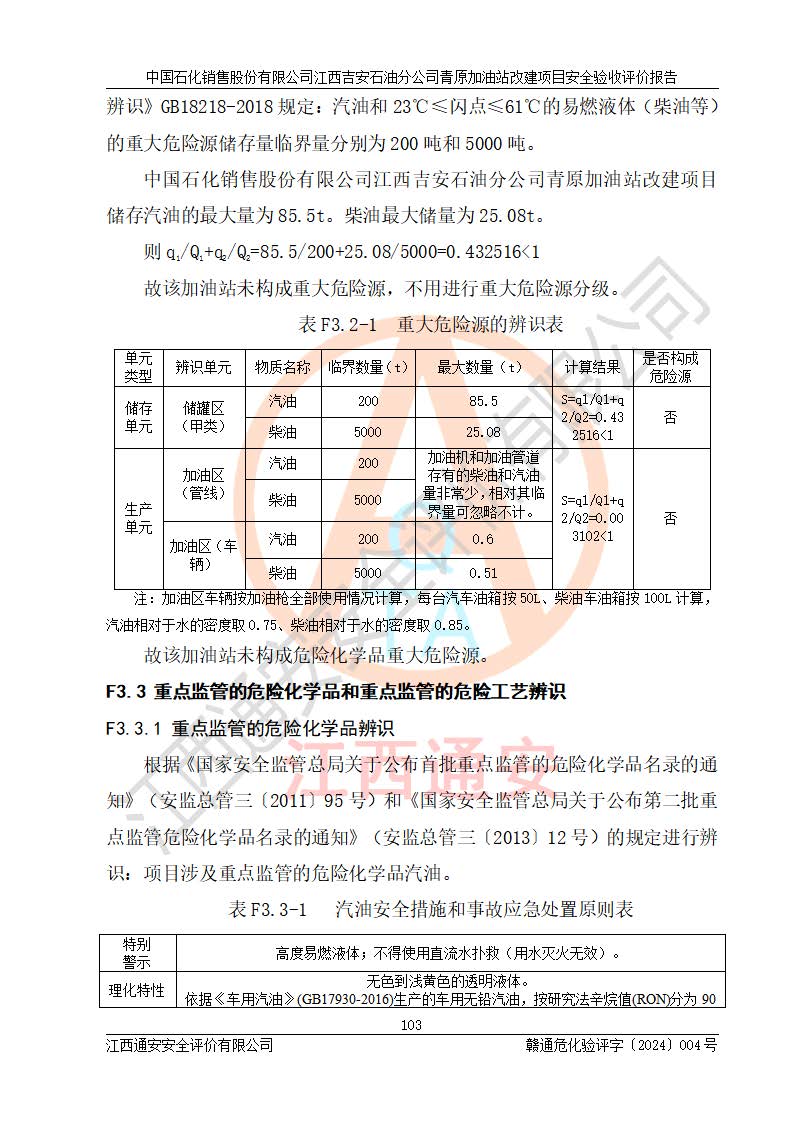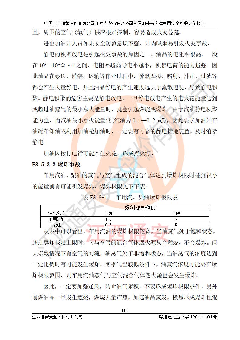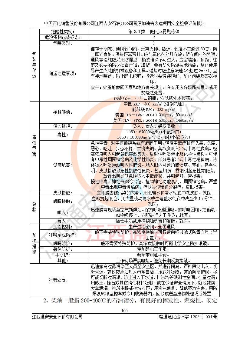 评价结论 | 中国石化销售股份有限公司江西吉安石油分公司青原加油站改建项目具备**有关安全生产法律、法规、部门规章及标准规范要求的安全条件,符合经营和储存危险化学品的安全条件要求,具备安全验收的要求。 | |||