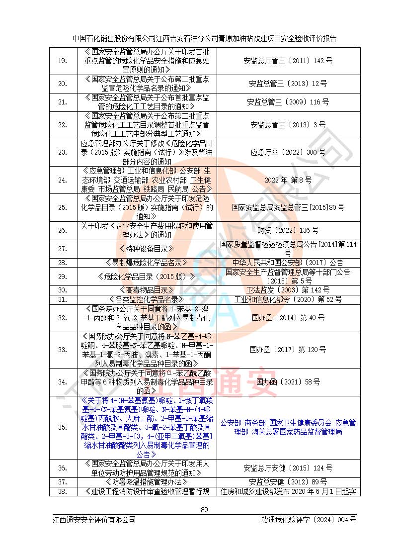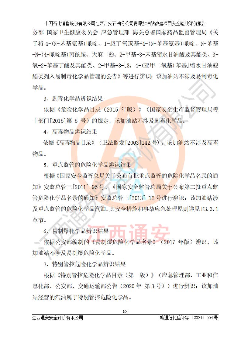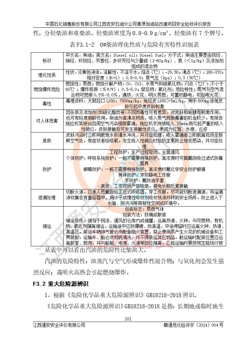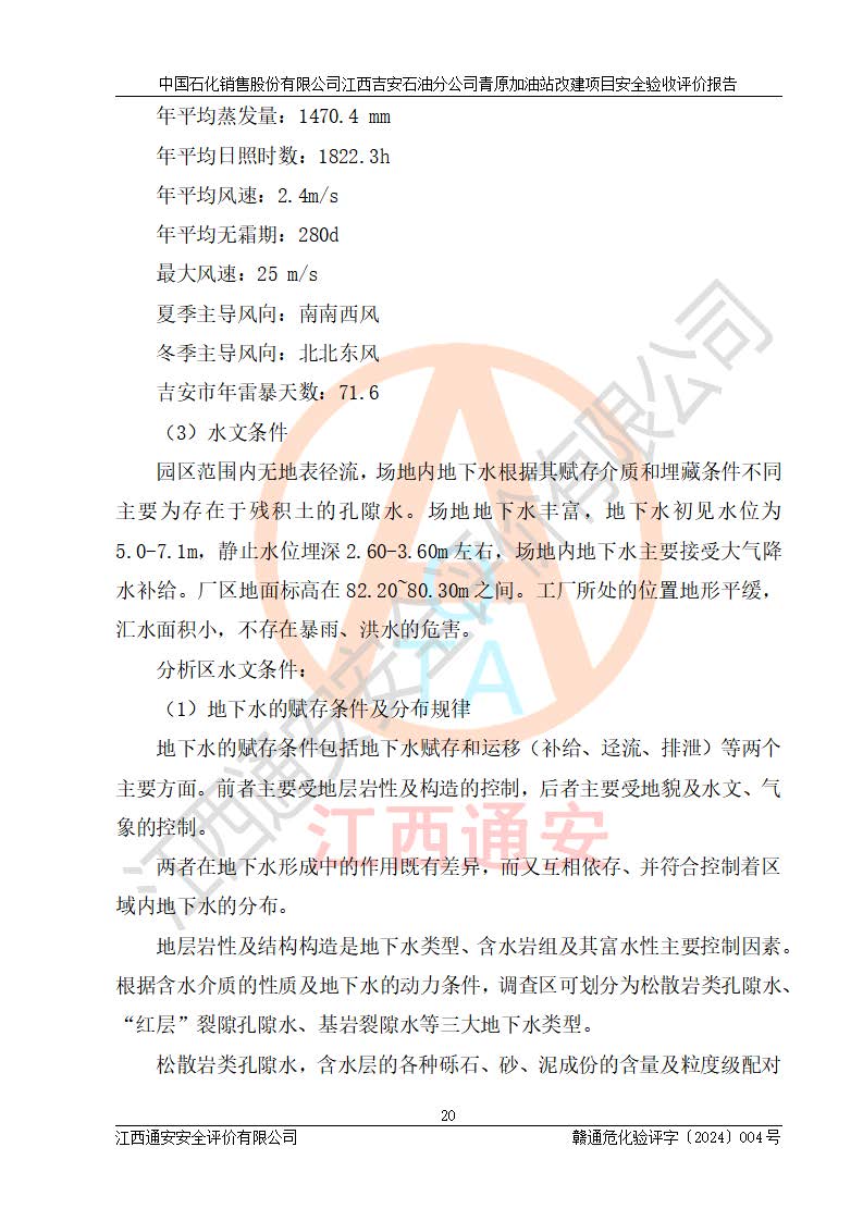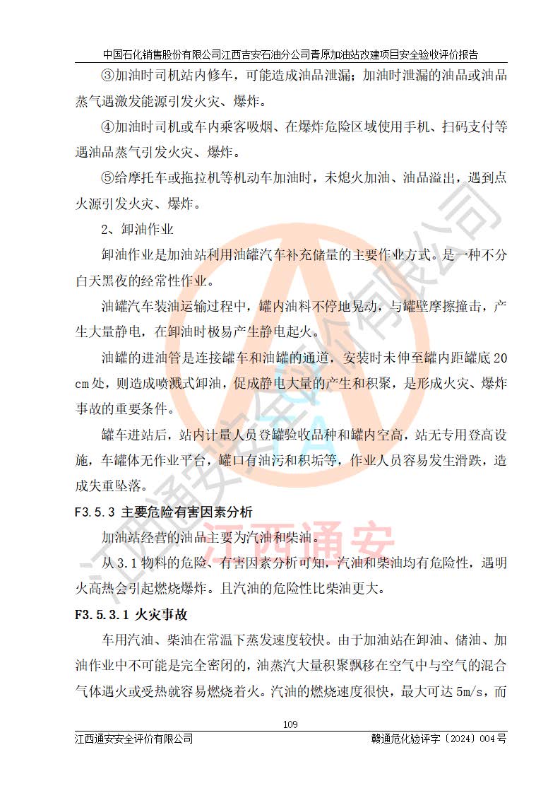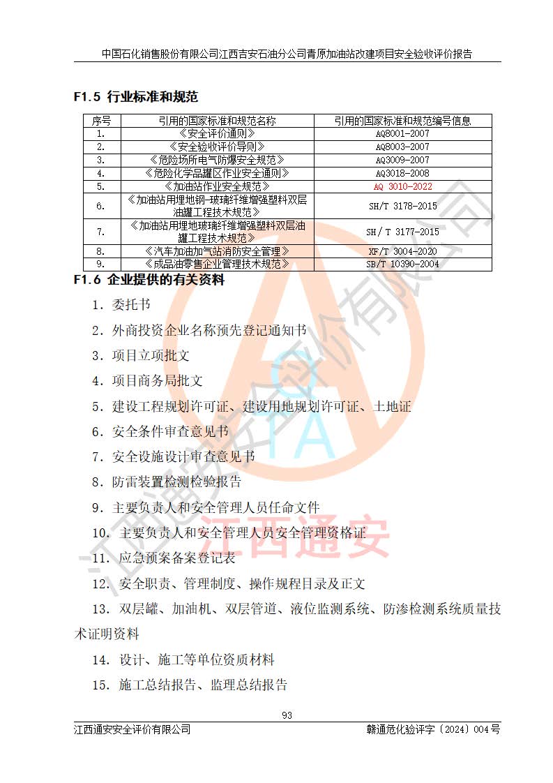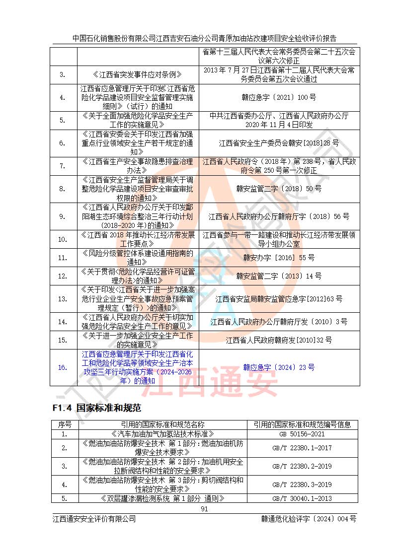 评价结论 | 中国石化销售股份有限公司江西吉安石油分公司青原加油站改建项目具备**有关安全生产法律、法规、部门规章及标准规范要求的安全条件,符合经营和储存危险化学品的安全条件要求,具备安全验收的要求。 | |||
