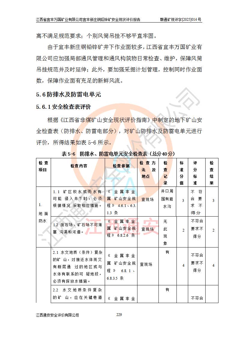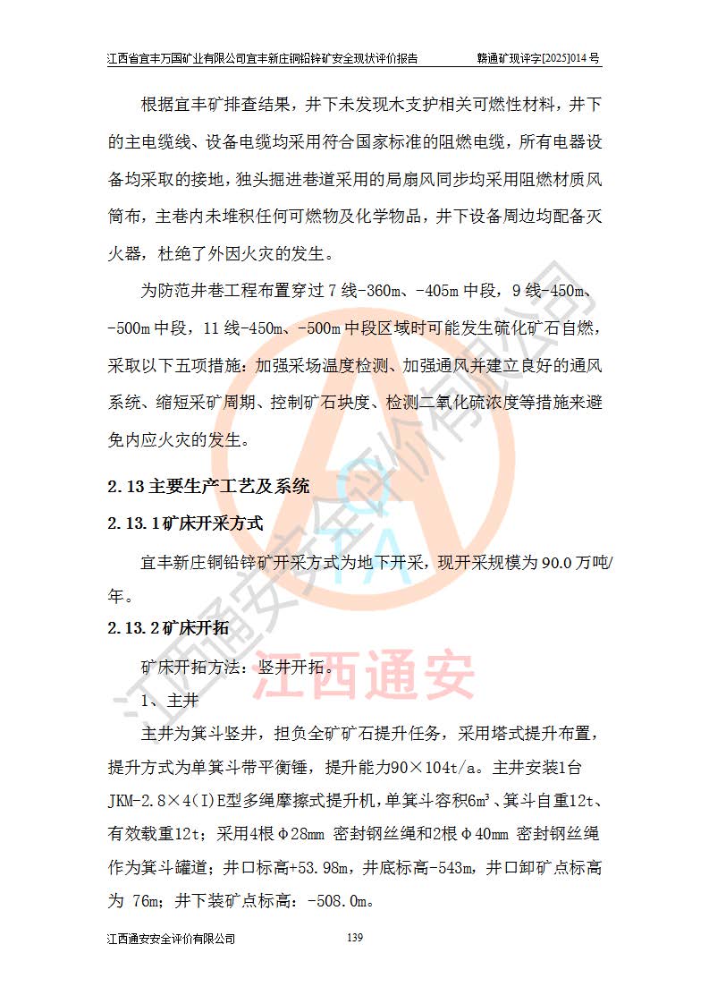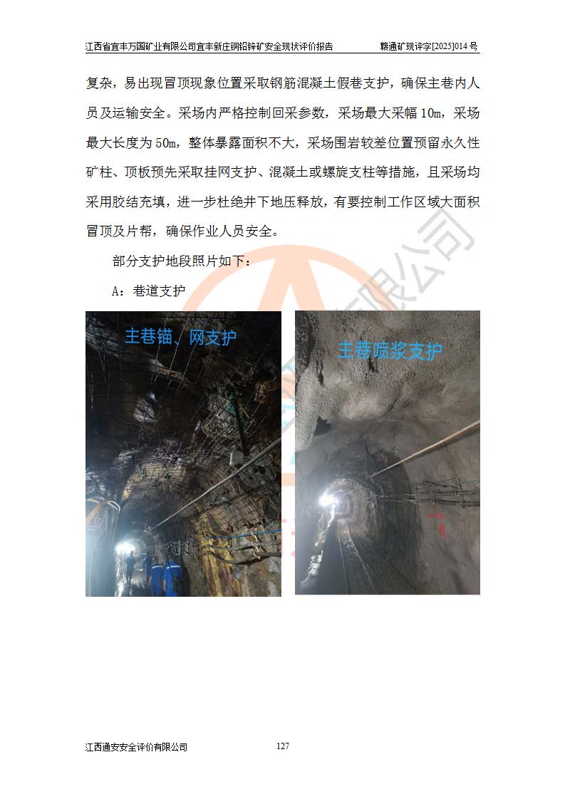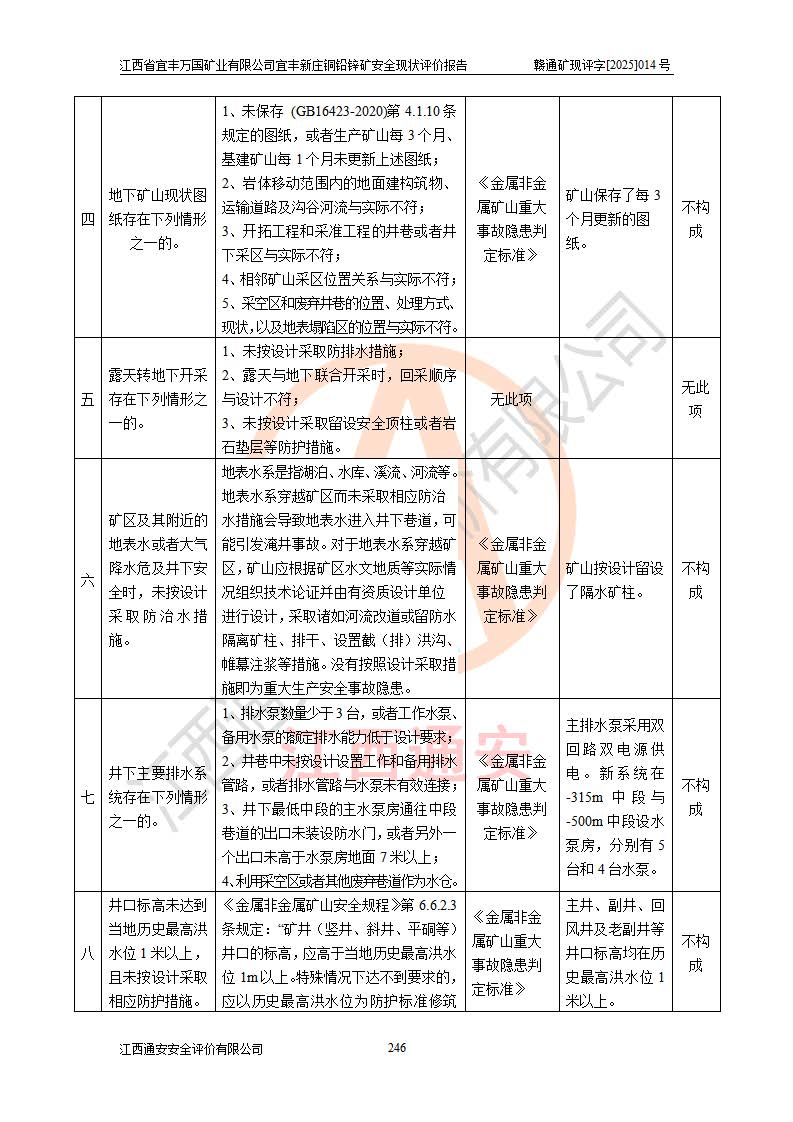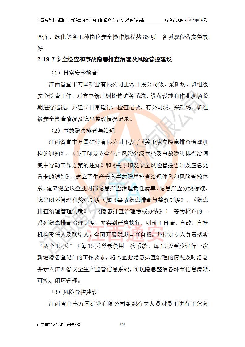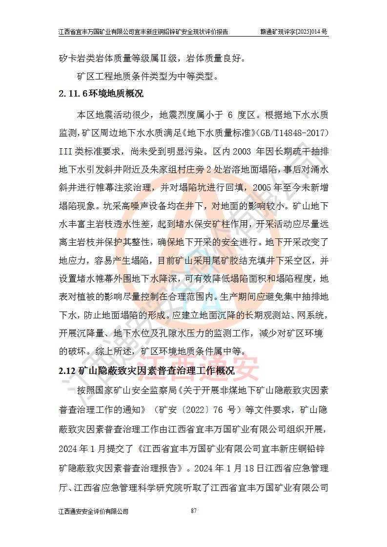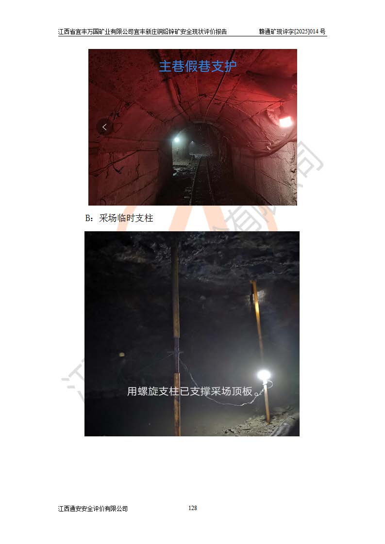 其它 | 江西省宜丰万国矿业有限公司宜丰新庄铜铅锌矿地下开采的主要生产及辅助系统:提升运输、排水、供配电、通风、供风、采掘、安全避险“六大系统”等符合法律法规要求和规程、规范要求;各种危险有害因素及不可接受的风险在运行中认真落实行之**的技术措施或管理措施,严格按规程,按要求加强管理,可以避免和控制各类事故,**安全生产。现阶段矿山设备、设施和场所符合**安全生产有关法律、法规、标准及规范的规定。矿山采用竖井开拓方式,安全生产条件较好;安全管理能满足法规要求,矿山现状与安全设施设计一致,矿山地下开采符合**规定的安全生产条件。 |