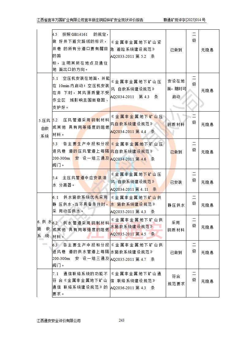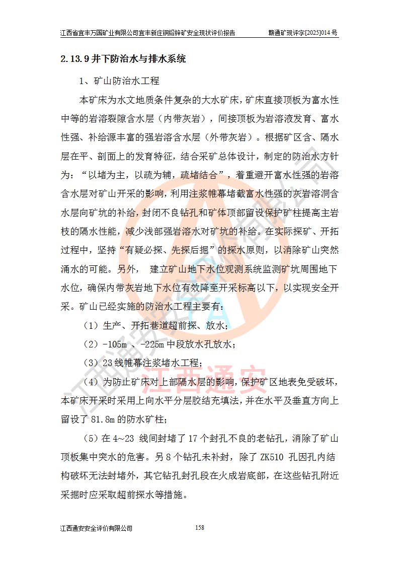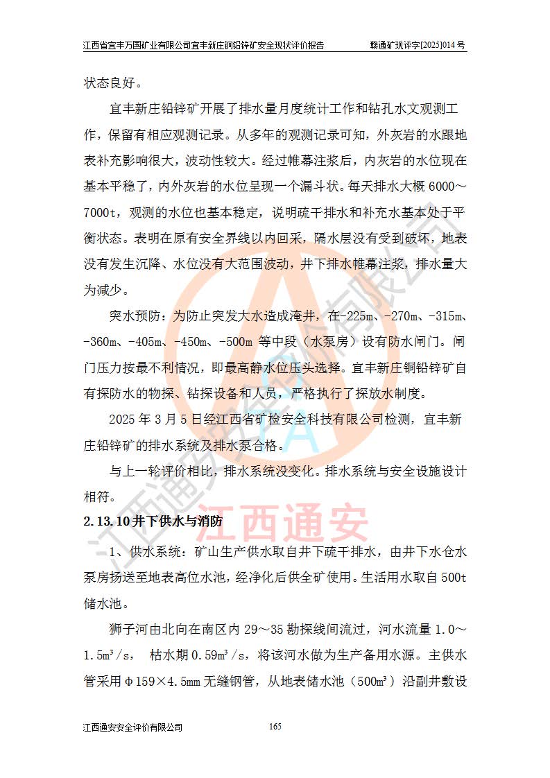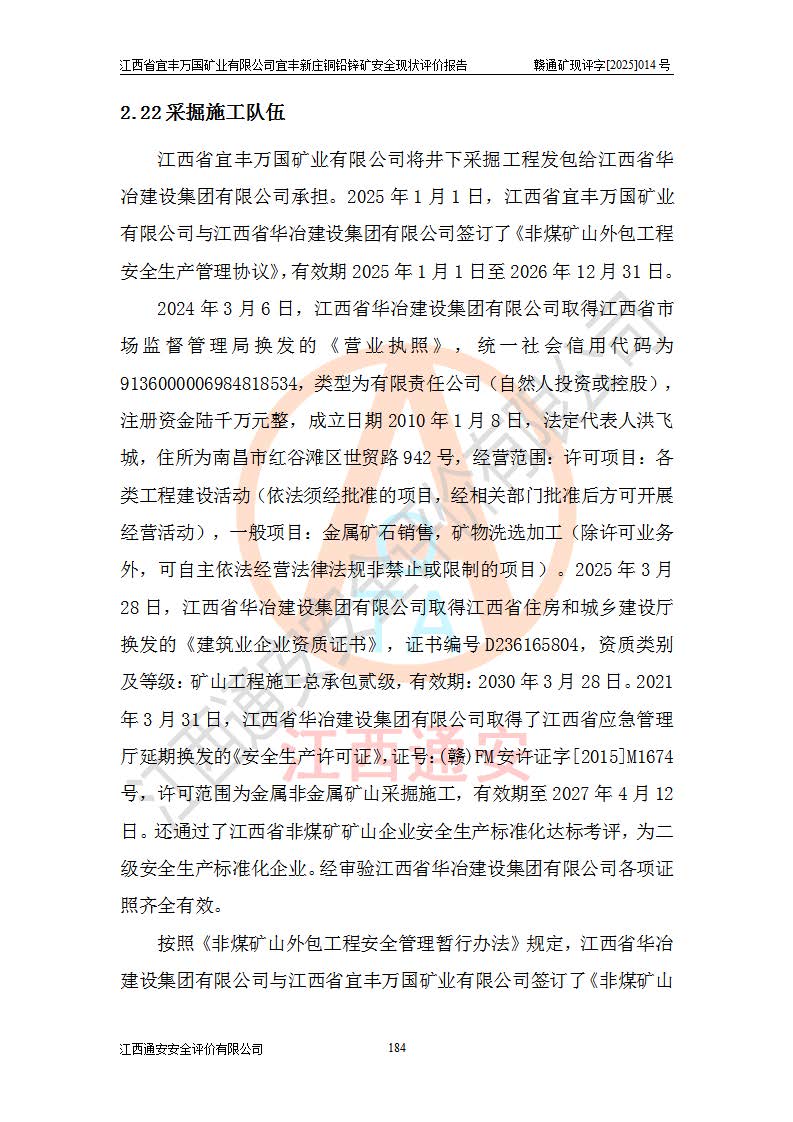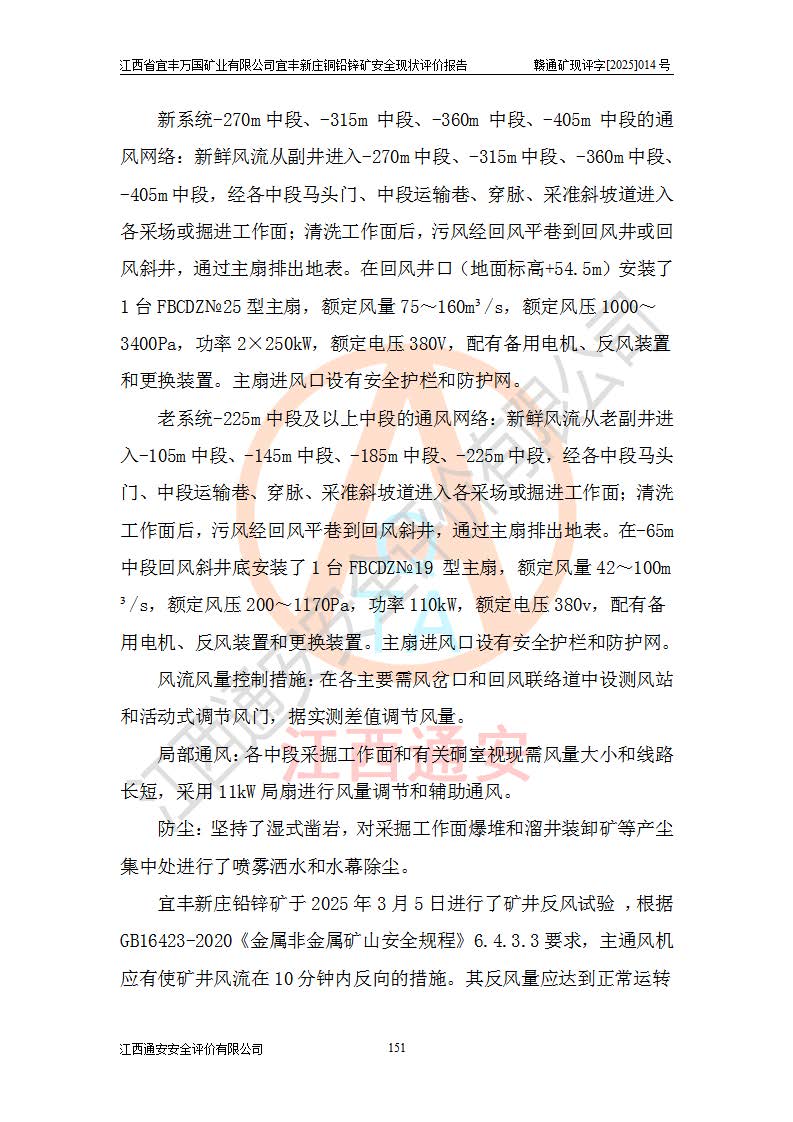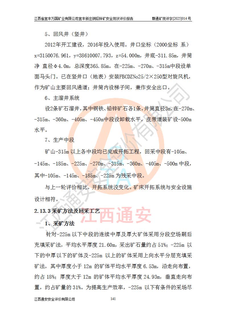 其它 | 江西省宜丰万国矿业有限公司宜丰新庄铜铅锌矿地下开采的主要生产及辅助系统:提升运输、排水、供配电、通风、供风、采掘、安全避险“六大系统”等符合法律法规要求和规程、规范要求;各种危险有害因素及不可接受的风险在运行中认真落实行之**的技术措施或管理措施,严格按规程,按要求加强管理,可以避免和控制各类事故,**安全生产。现阶段矿山设备、设施和场所符合**安全生产有关法律、法规、标准及规范的规定。矿山采用竖井开拓方式,安全生产条件较好;安全管理能满足法规要求,矿山现状与安全设施设计一致,矿山地下开采符合**规定的安全生产条件。 |