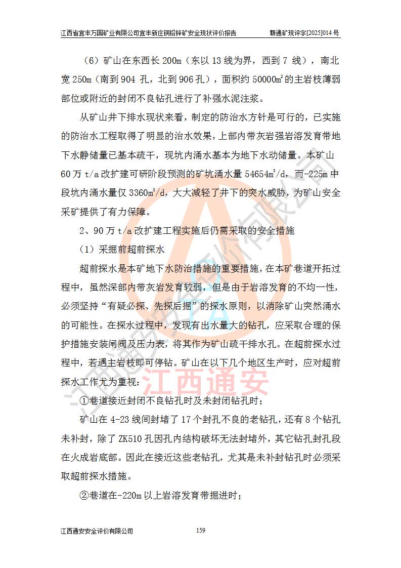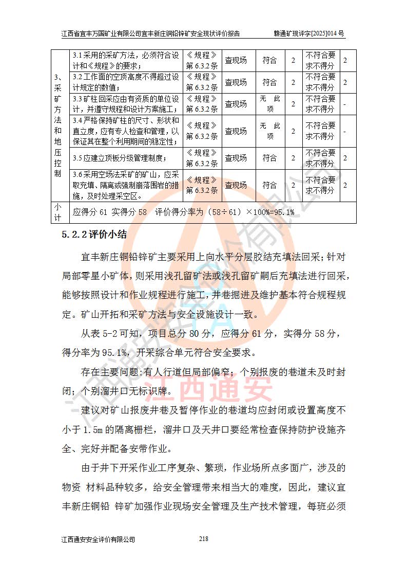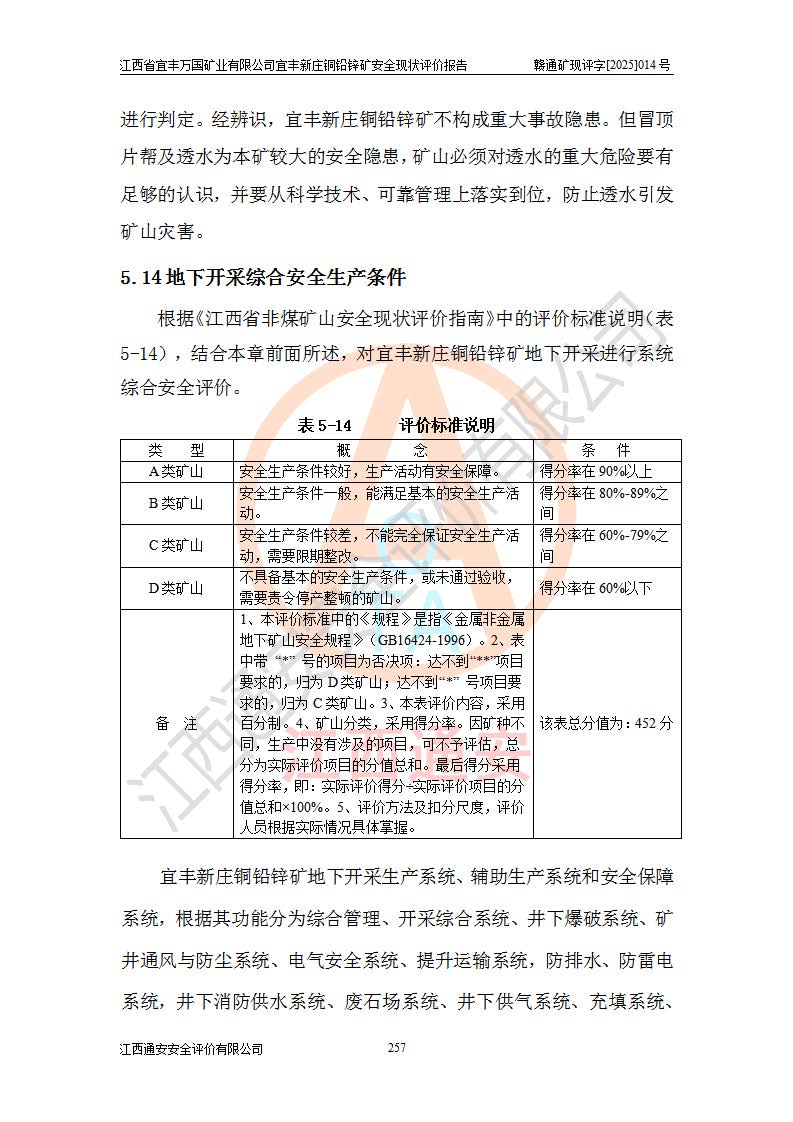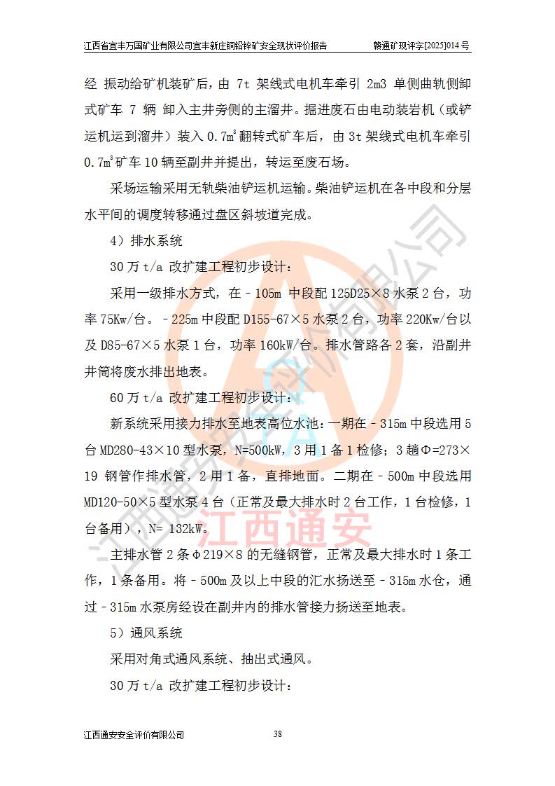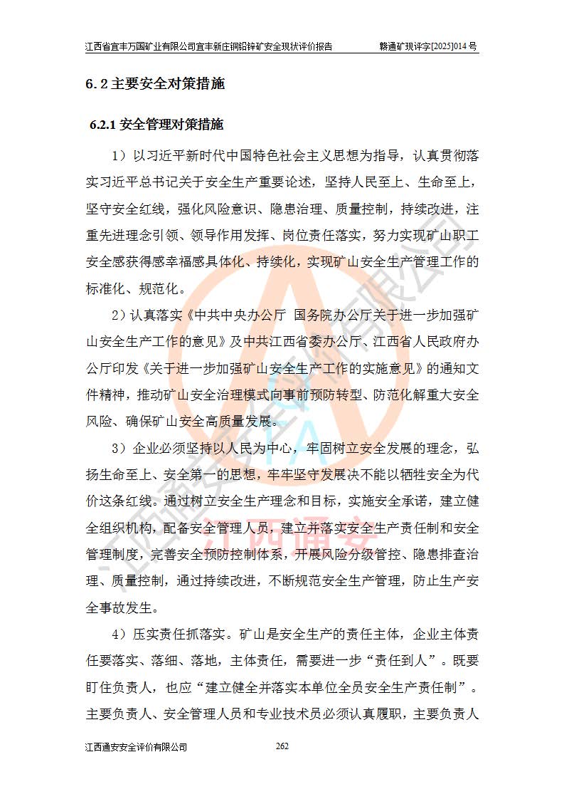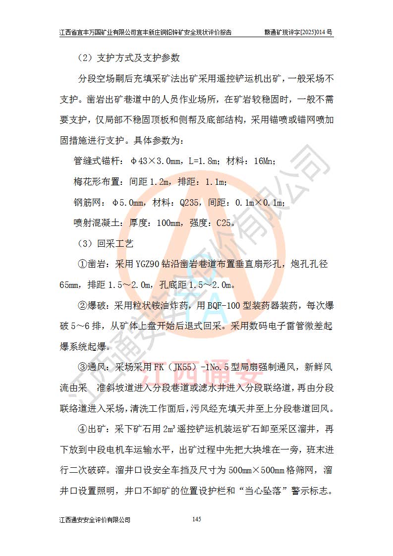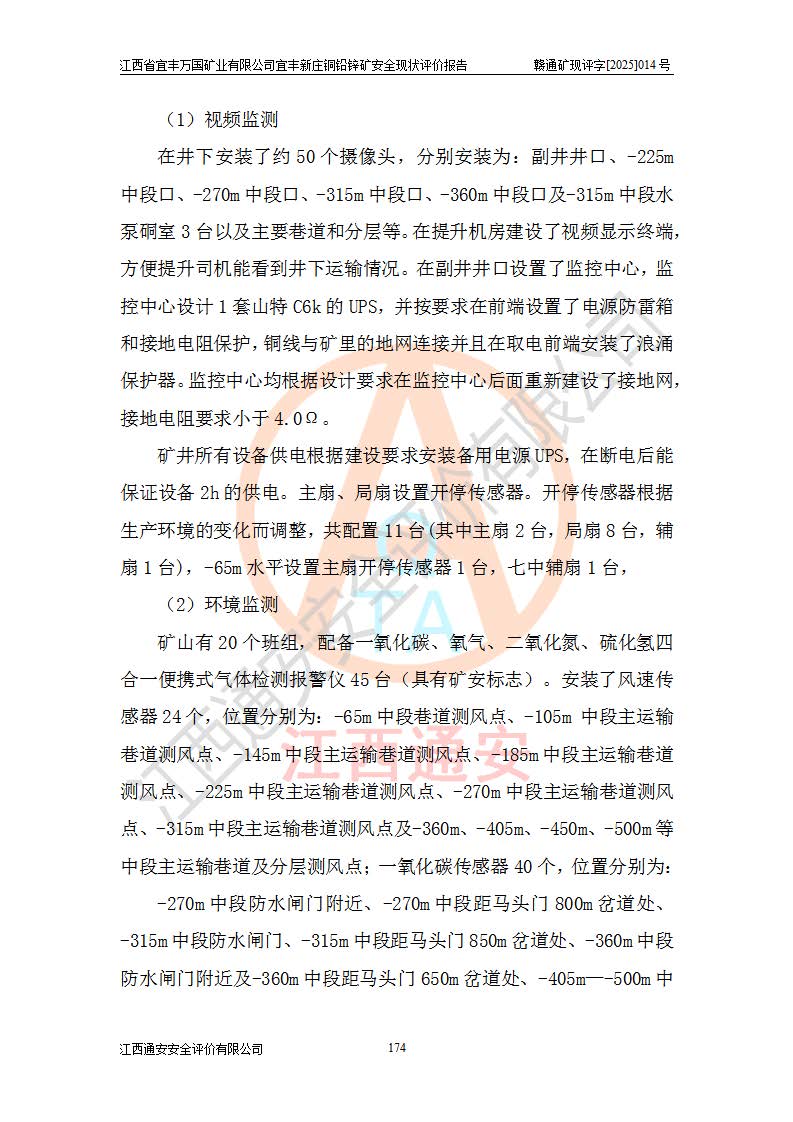 其它 | 江西省宜丰万国矿业有限公司宜丰新庄铜铅锌矿地下开采的主要生产及辅助系统:提升运输、排水、供配电、通风、供风、采掘、安全避险“六大系统”等符合法律法规要求和规程、规范要求;各种危险有害因素及不可接受的风险在运行中认真落实行之**的技术措施或管理措施,严格按规程,按要求加强管理,可以避免和控制各类事故,**安全生产。现阶段矿山设备、设施和场所符合**安全生产有关法律、法规、标准及规范的规定。矿山采用竖井开拓方式,安全生产条件较好;安全管理能满足法规要求,矿山现状与安全设施设计一致,矿山地下开采符合**规定的安全生产条件。 |